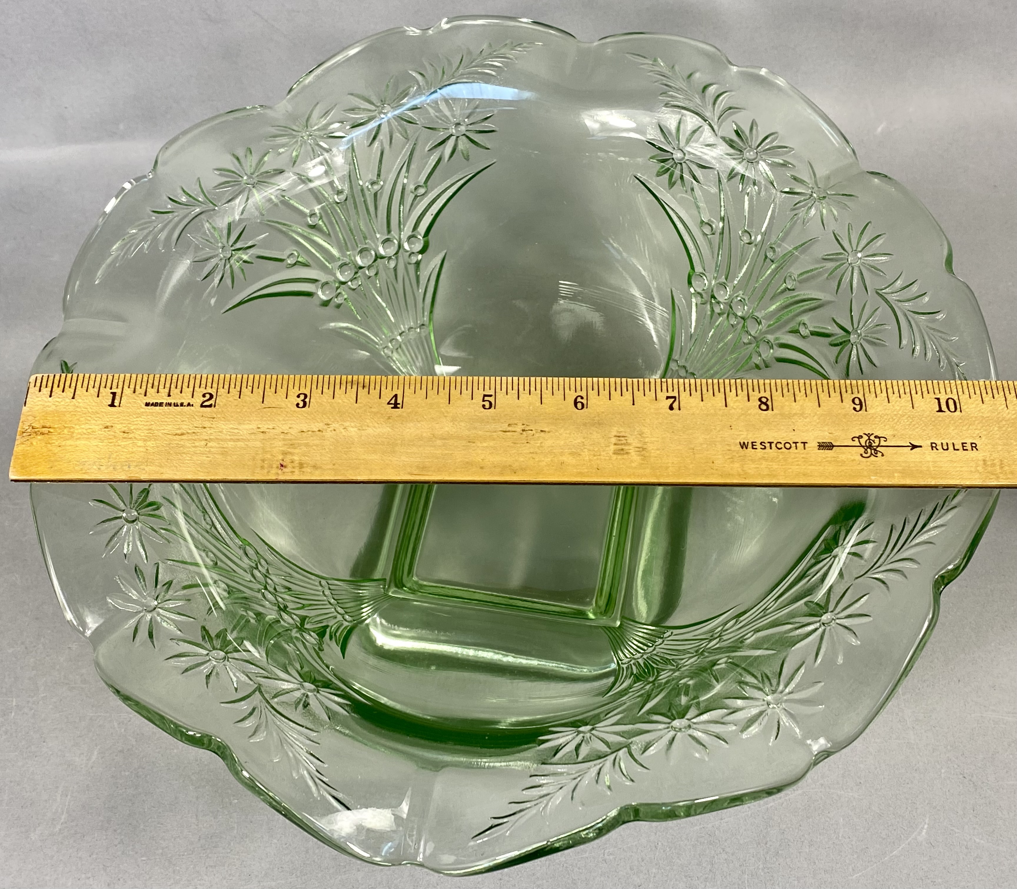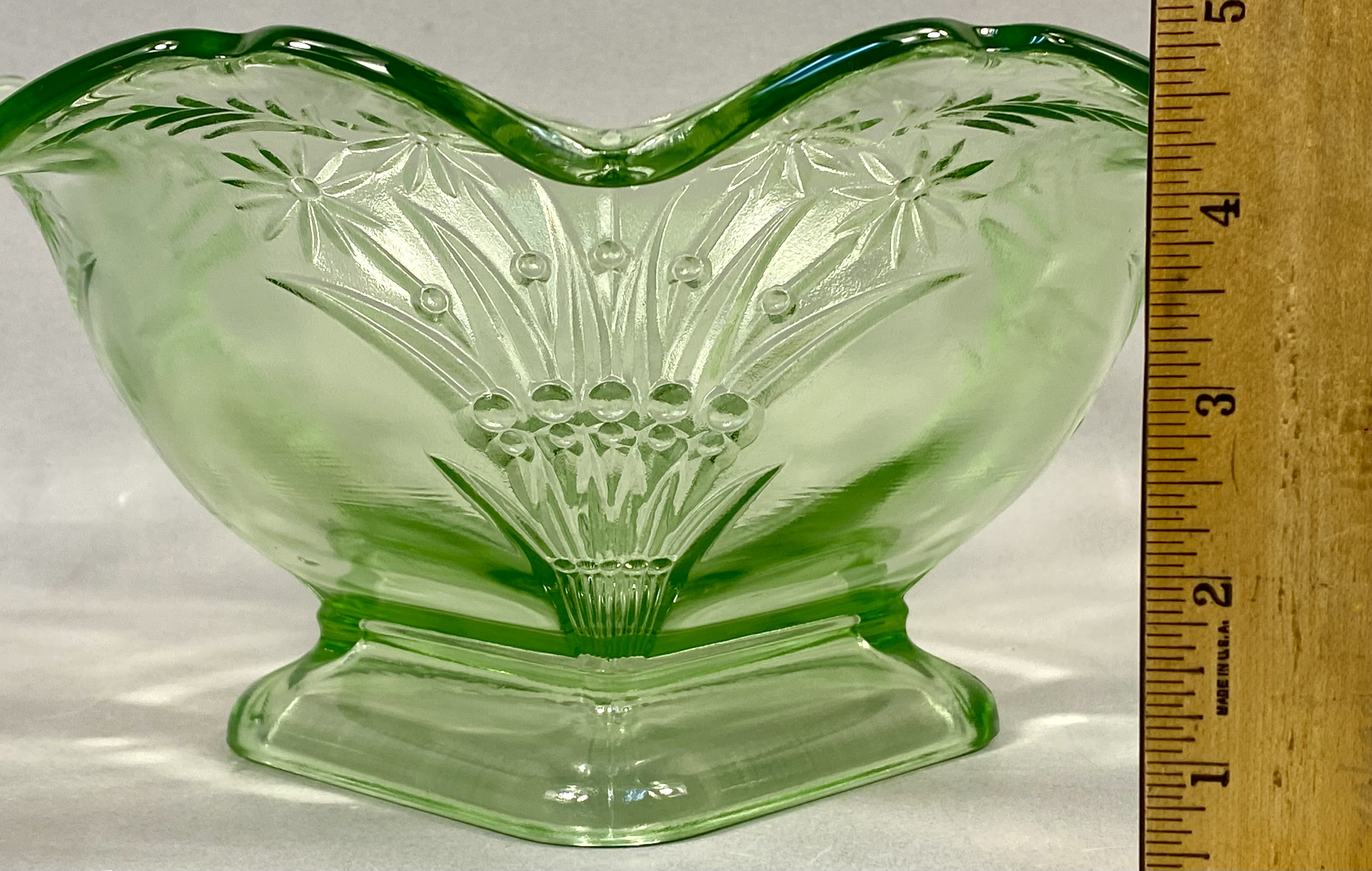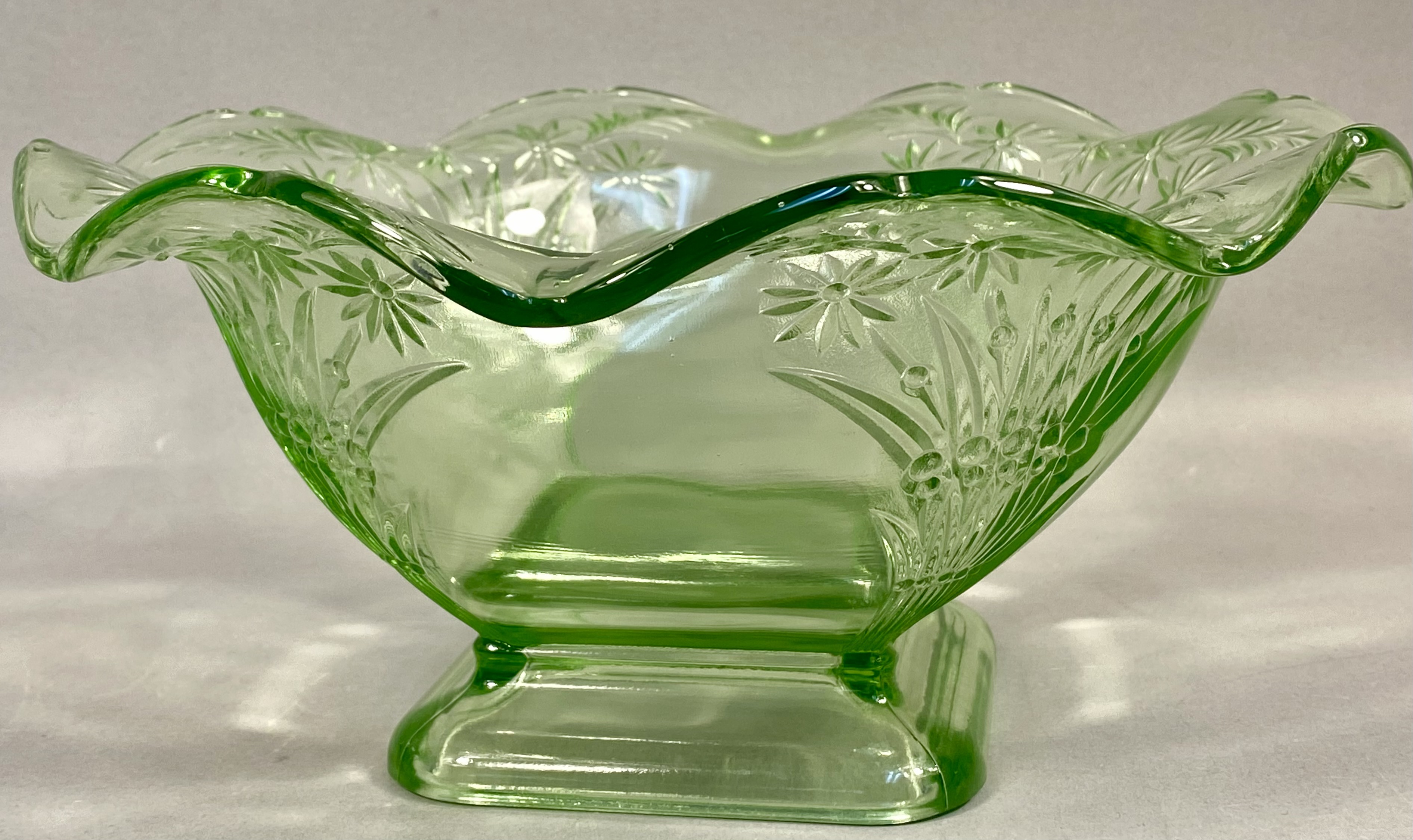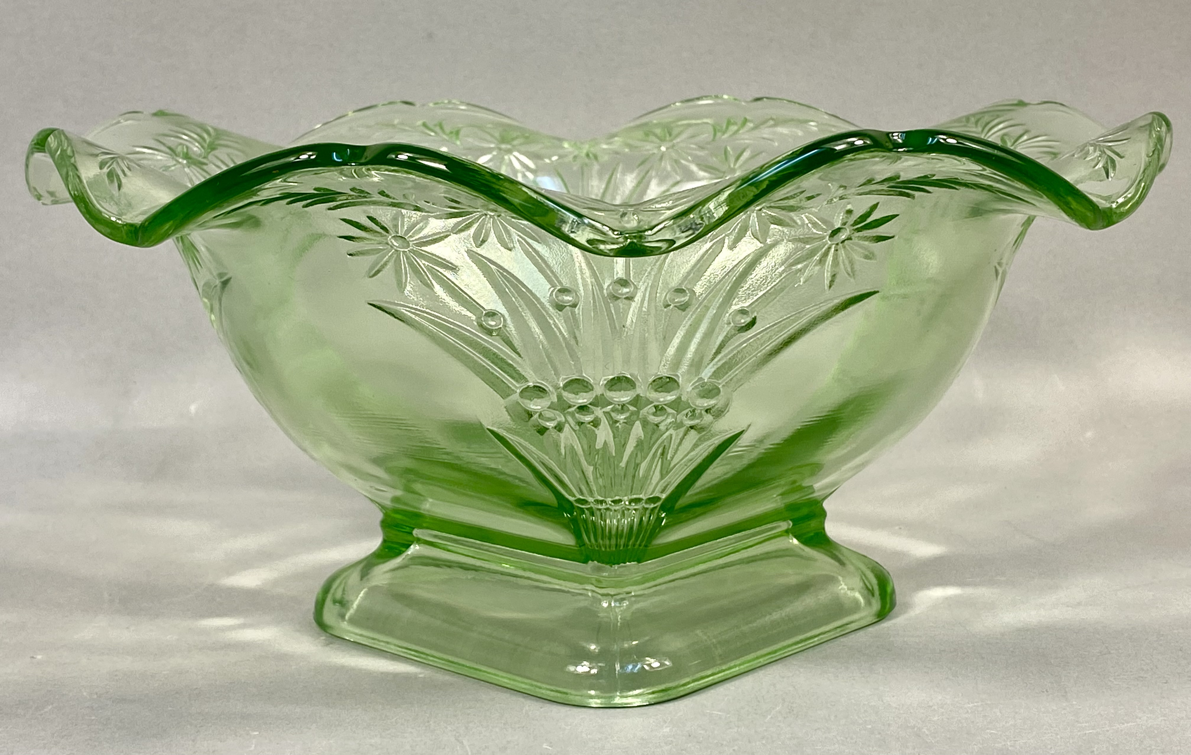 This footed console bowl is attributed to the Jeannette Glass Company and features the Floral pattern, also referred to as Poinsettia, which was manufactured between 1930 and 1935. The item is made of transparent light green pressed soda-lime glass, a color characteristic of the Depression era. The bowl features a wide, ruffled rim and sits upon a square, stepped pedestal base. The decorative motif consists of pressed stylized floral sprays with daisy-like flowers and fanned leaves accented by small beads. No maker marks or signatures are visible on the piece.