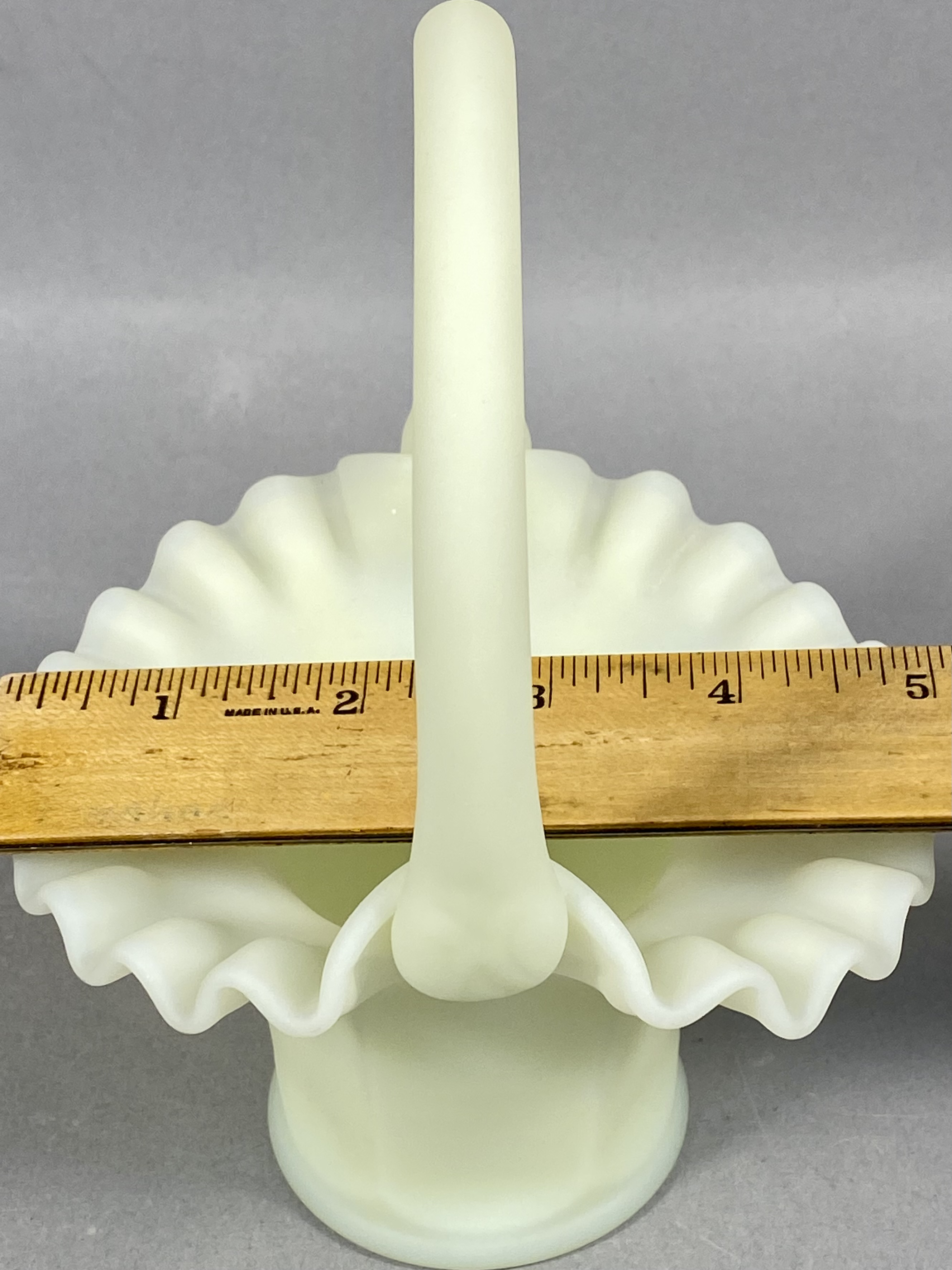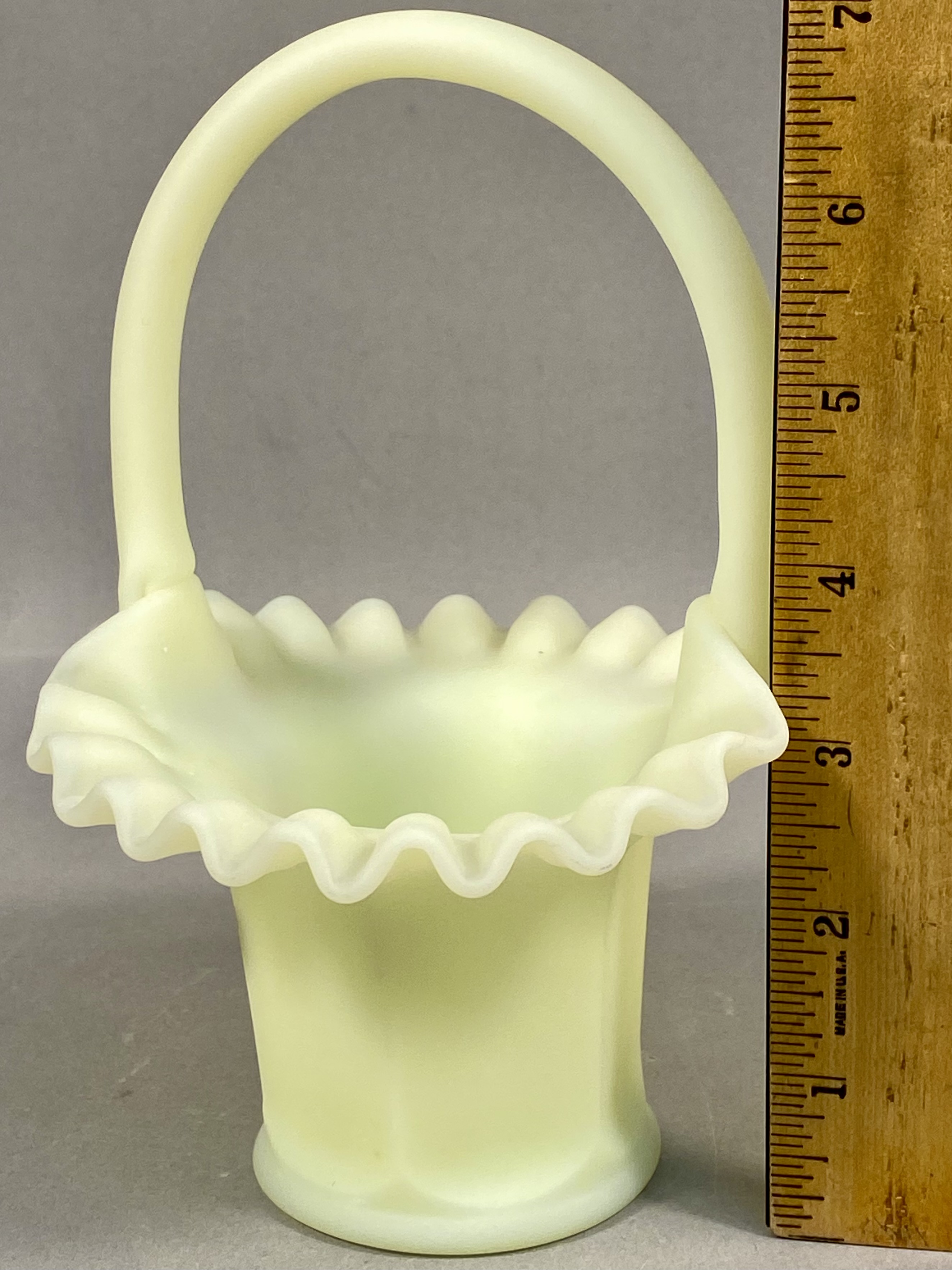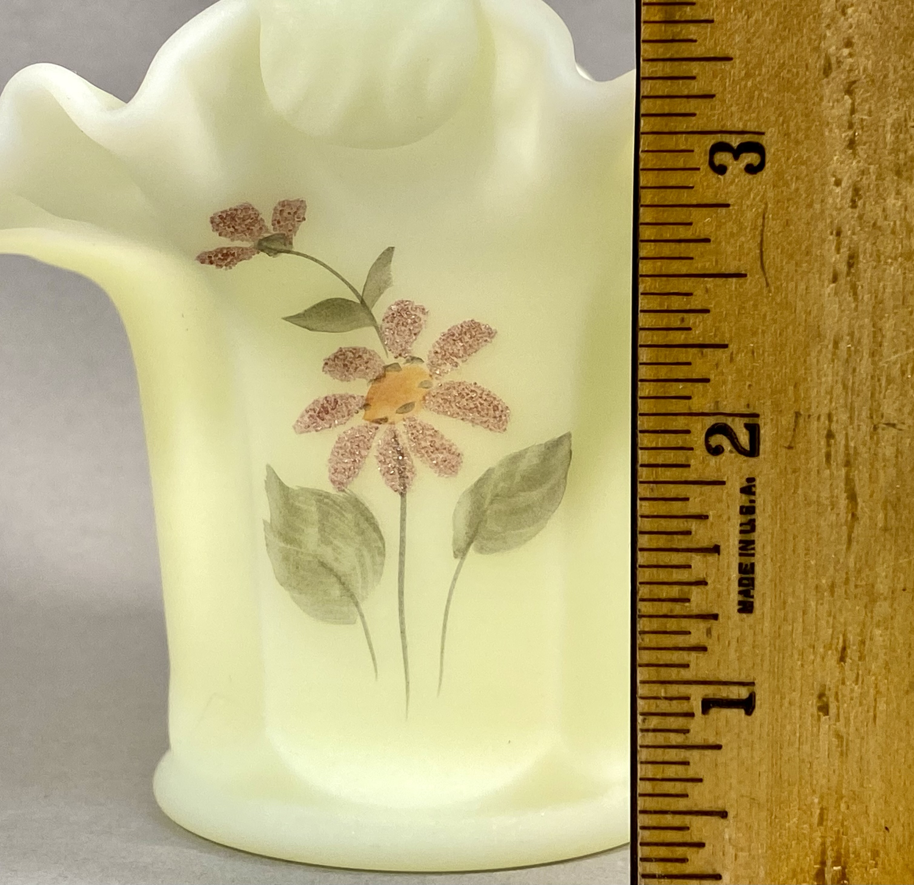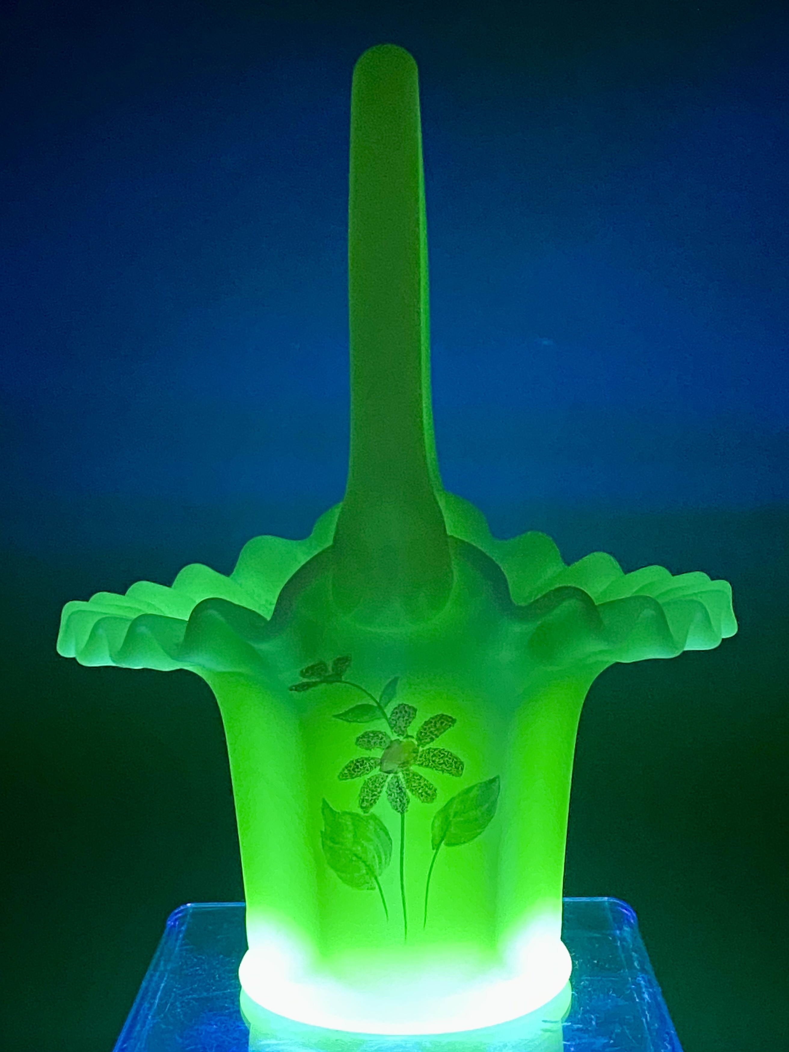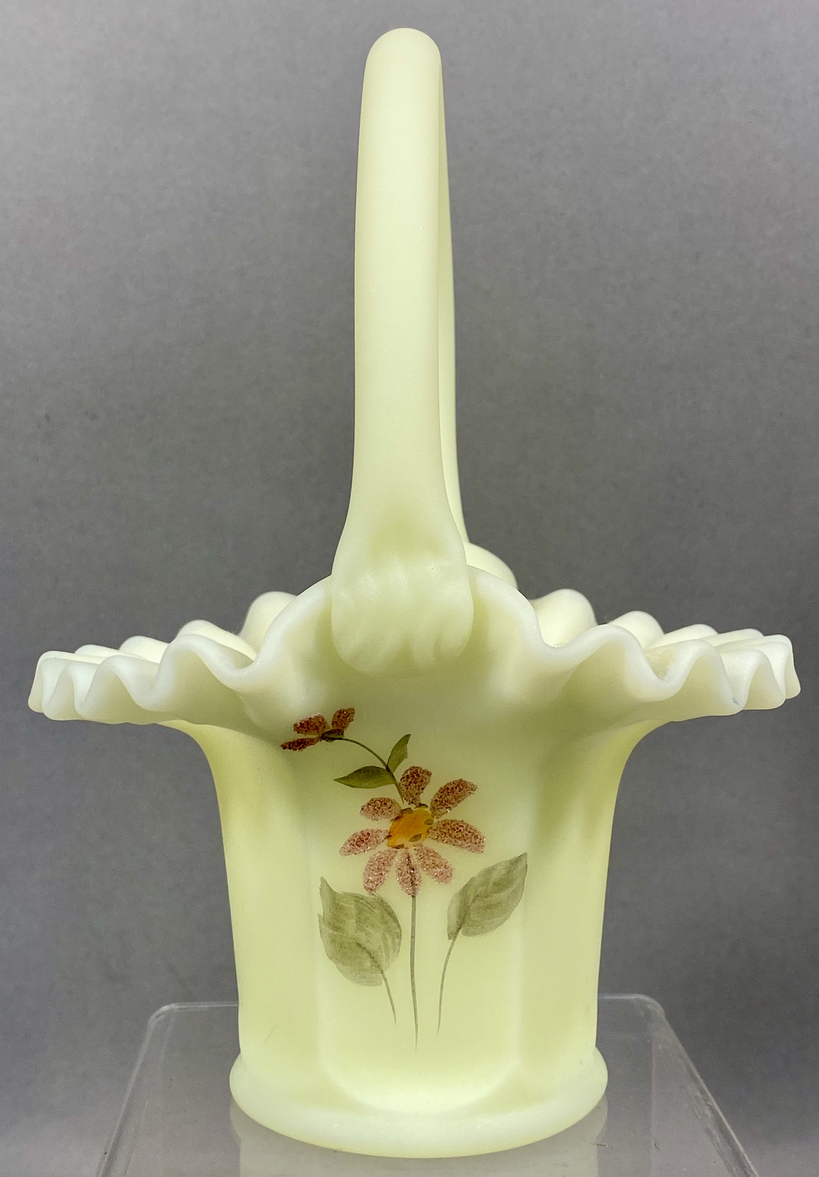 A Fenton Art Glass Company custard glass basket featuring a heavily ruffled rim and an applied handle. The body of the vessel is molded with vertical ribs. The exterior is decorated with a hand-painted floral motif depicting a multi-petaled daisy-like flower in shades of coral and yellow with green leaves and stems. Under ultraviolet light, the glass exhibits a green fluorescence, confirming the presence of uranium. The underside of the base contains an embossed oval Fenton mark with a numeral 8, indicating production in the 1980s. A partial gold foil label is also present on the base, identifying the piece as a Tara Exclusive.