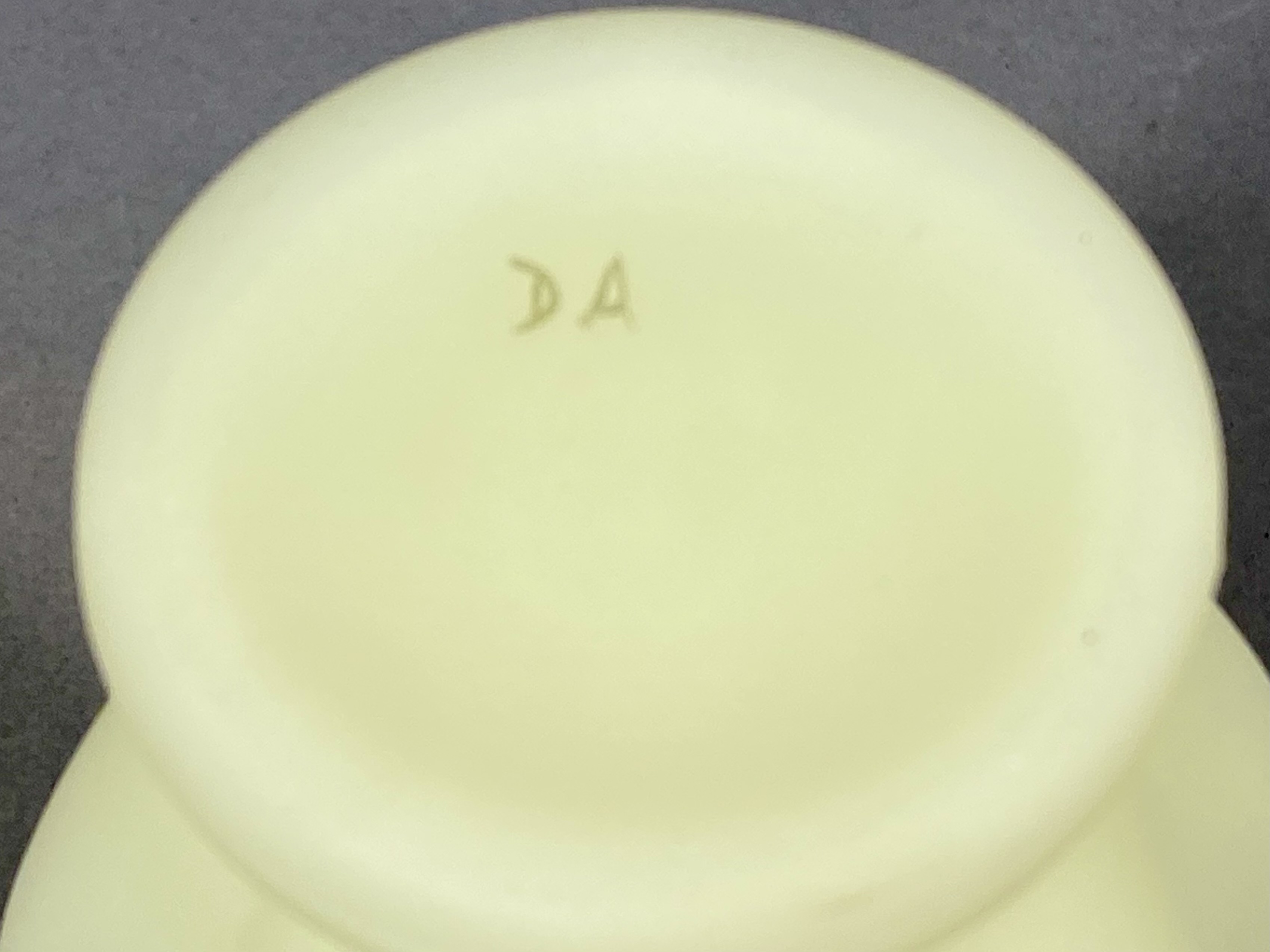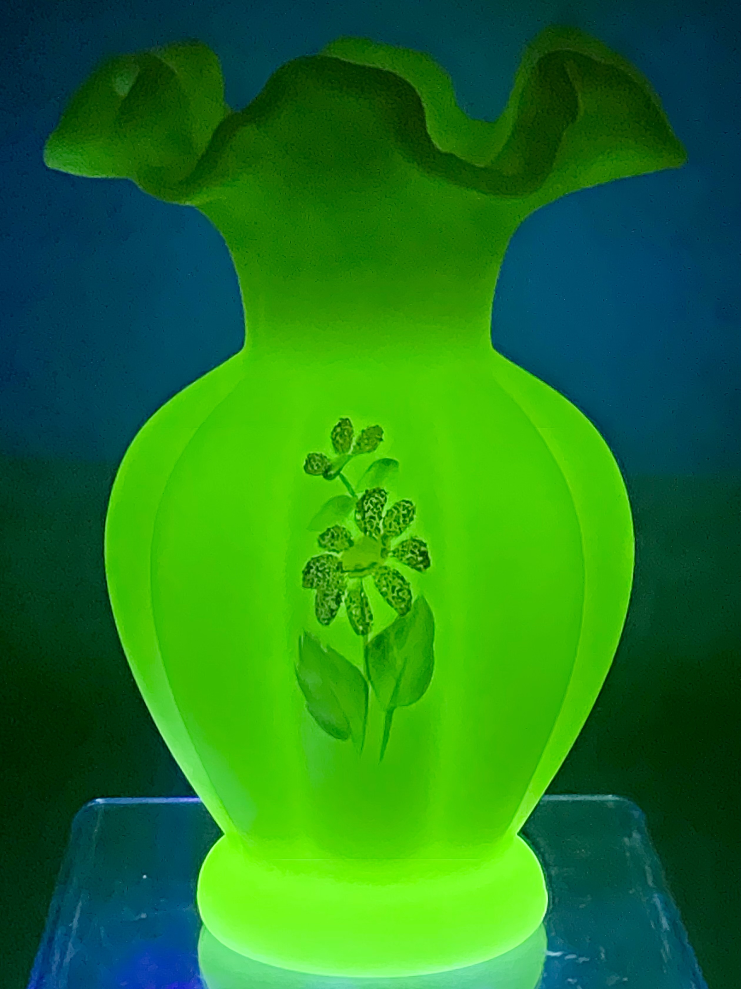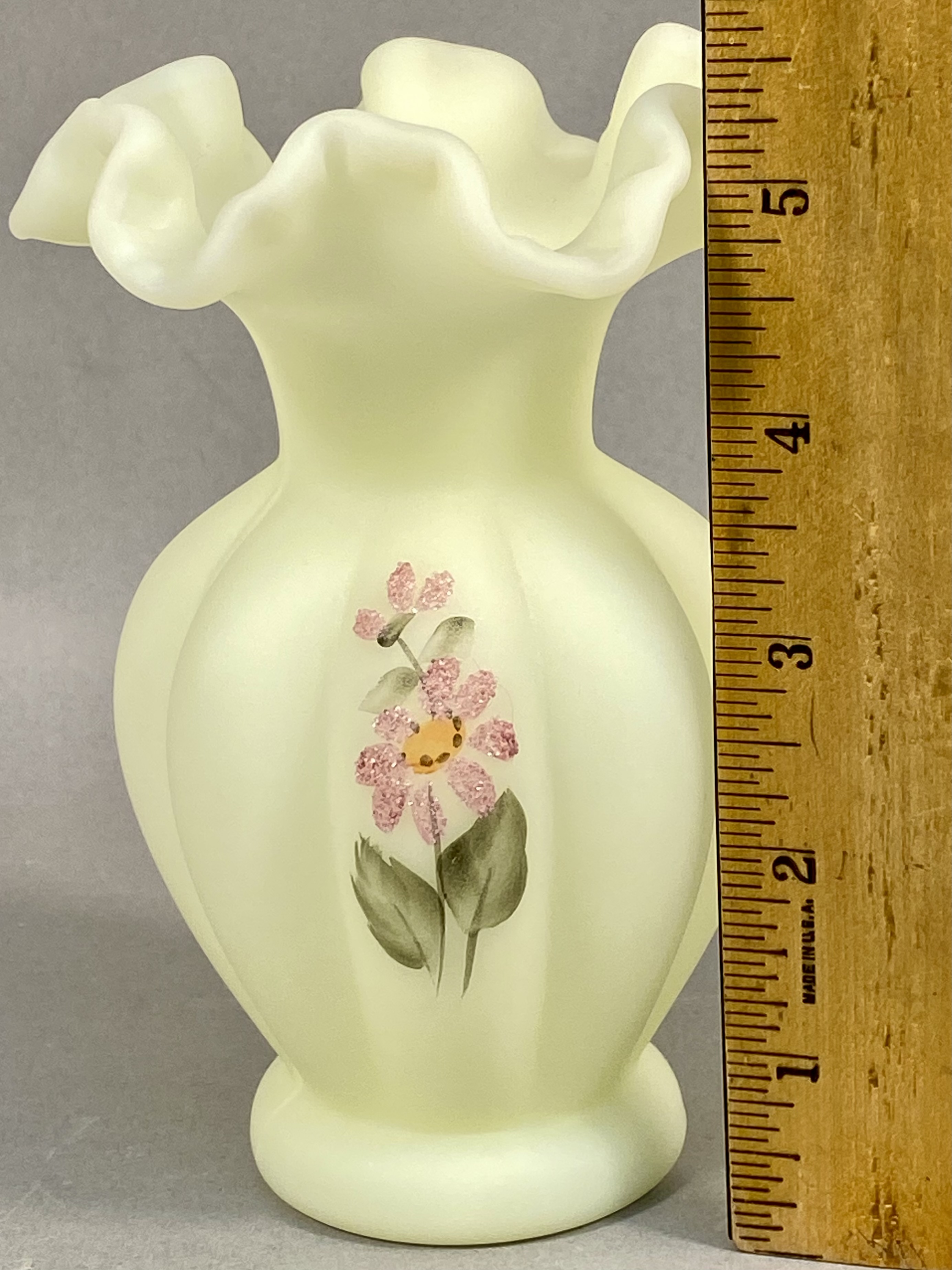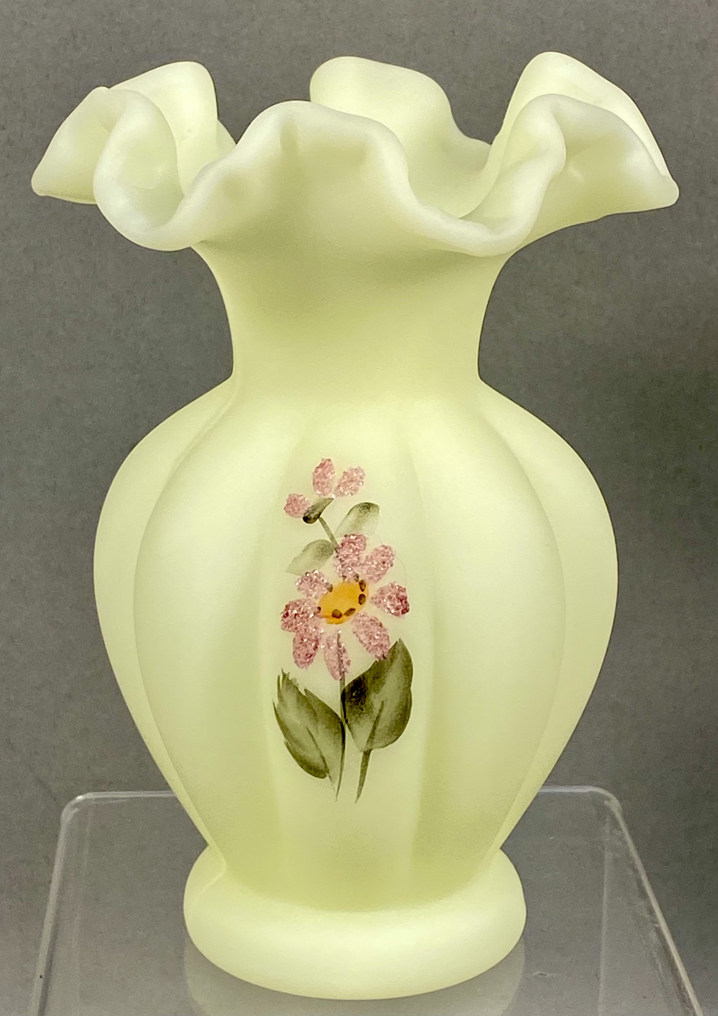 This vase is constructed from custard-colored satin uranium glass, which exhibits a bright green fluorescence when exposed to ultraviolet light. The vessel features a wide, ruffled and crimped rim above a bulbous, vertically paneled body that tapers to a circular footed base. The exterior is decorated with a hand-painted floral motif, identified as the Pink Blossoms pattern, featuring a daisy-style flower with pink beaded or sugared textured petals, a yellow center, and green foliage. The base bears the hand-painted initials DA, an artist signature used by the Fenton Art Glass Company. The material, form, and decoration are consistent with Fenton production.