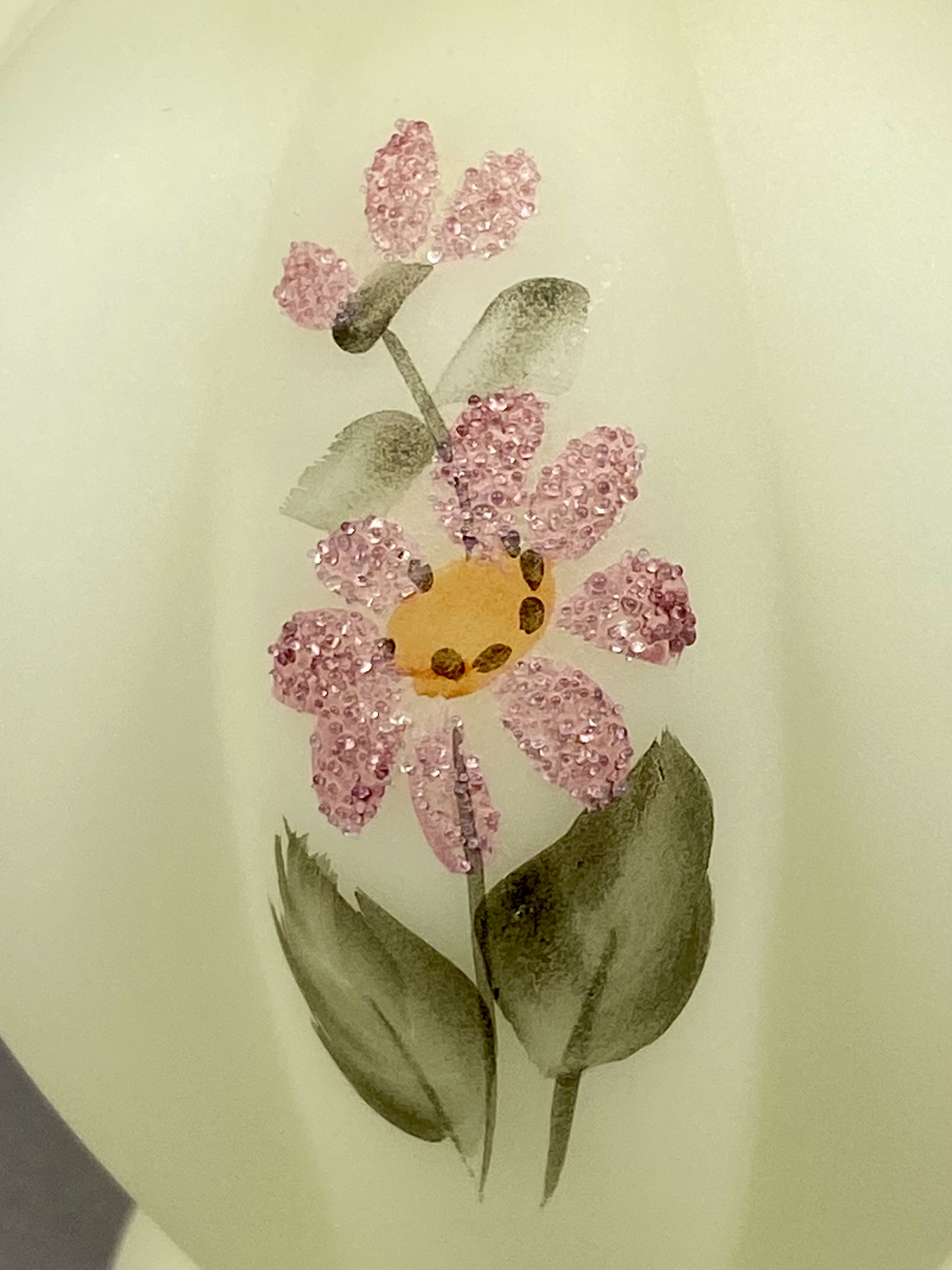 The vase is in excellent condition. There are no visible chips, cracks, or repairs. The hand-painted floral decoration and the sugared texture on the petals remain intact.
