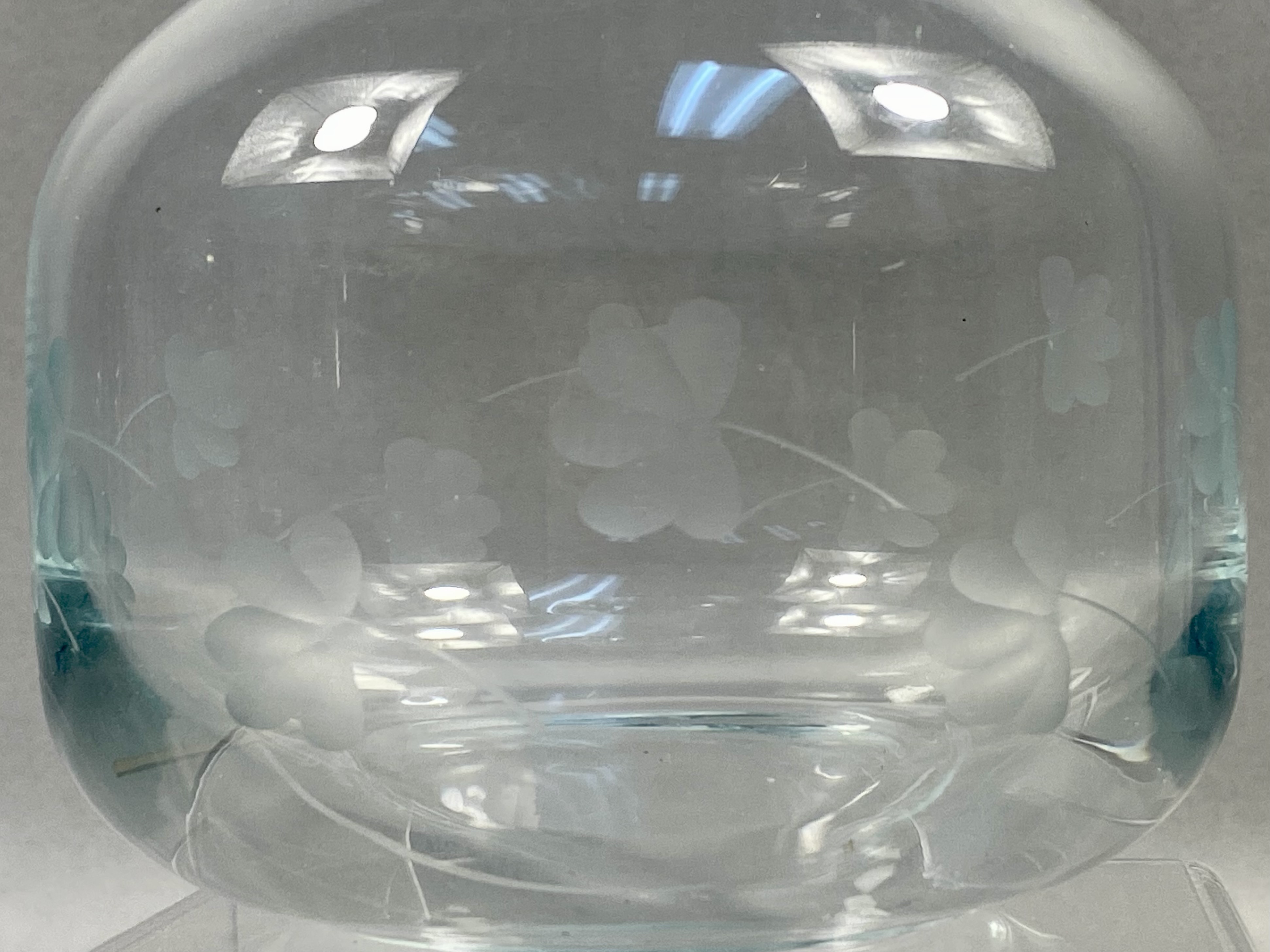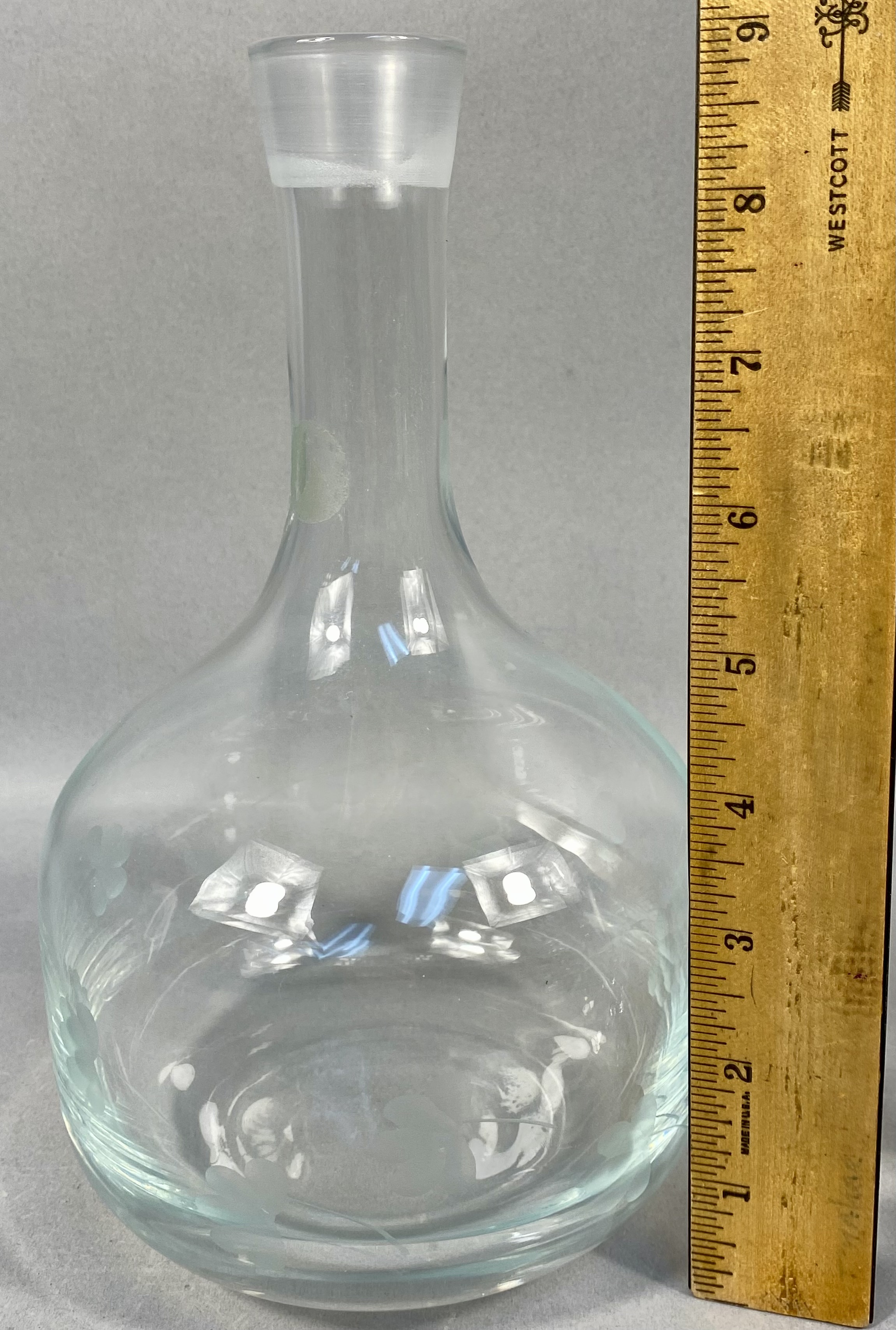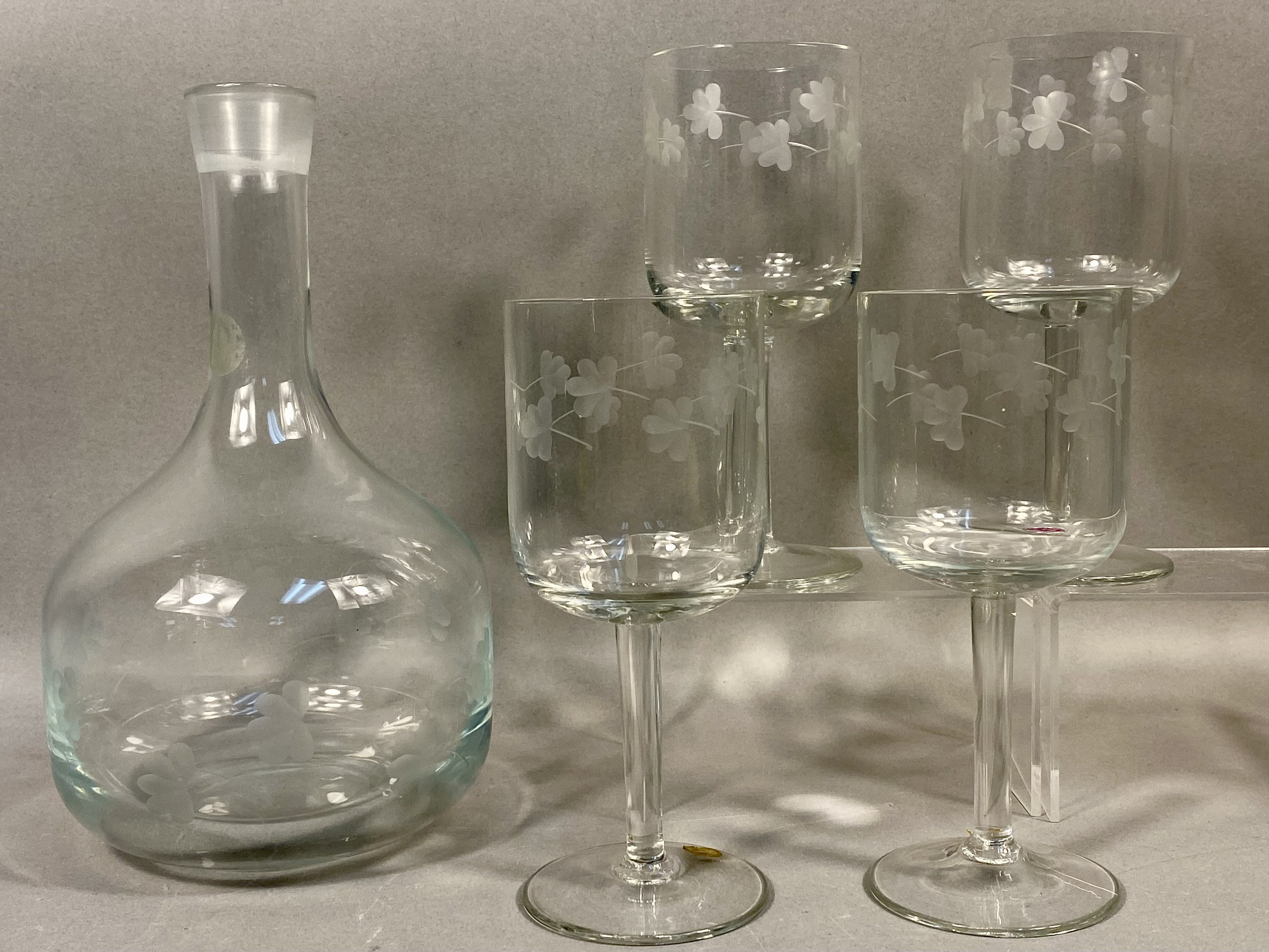 This set of clear glass barware consists of a bulbous decanter and four stemmed wine glasses. Each piece is decorated with a frosted, etched pattern featuring three-leaf shamrocks connected by thin, arcing vines. A circular magenta and silver foil label is present on the base of three glasses, featuring a central goblet icon and the text MADE IN ROMANIA. The pieces are constructed of clear glass typical of mid-20th century commercial production and do not possess the weight or refractive properties of full lead crystal. No stopper for decanter.