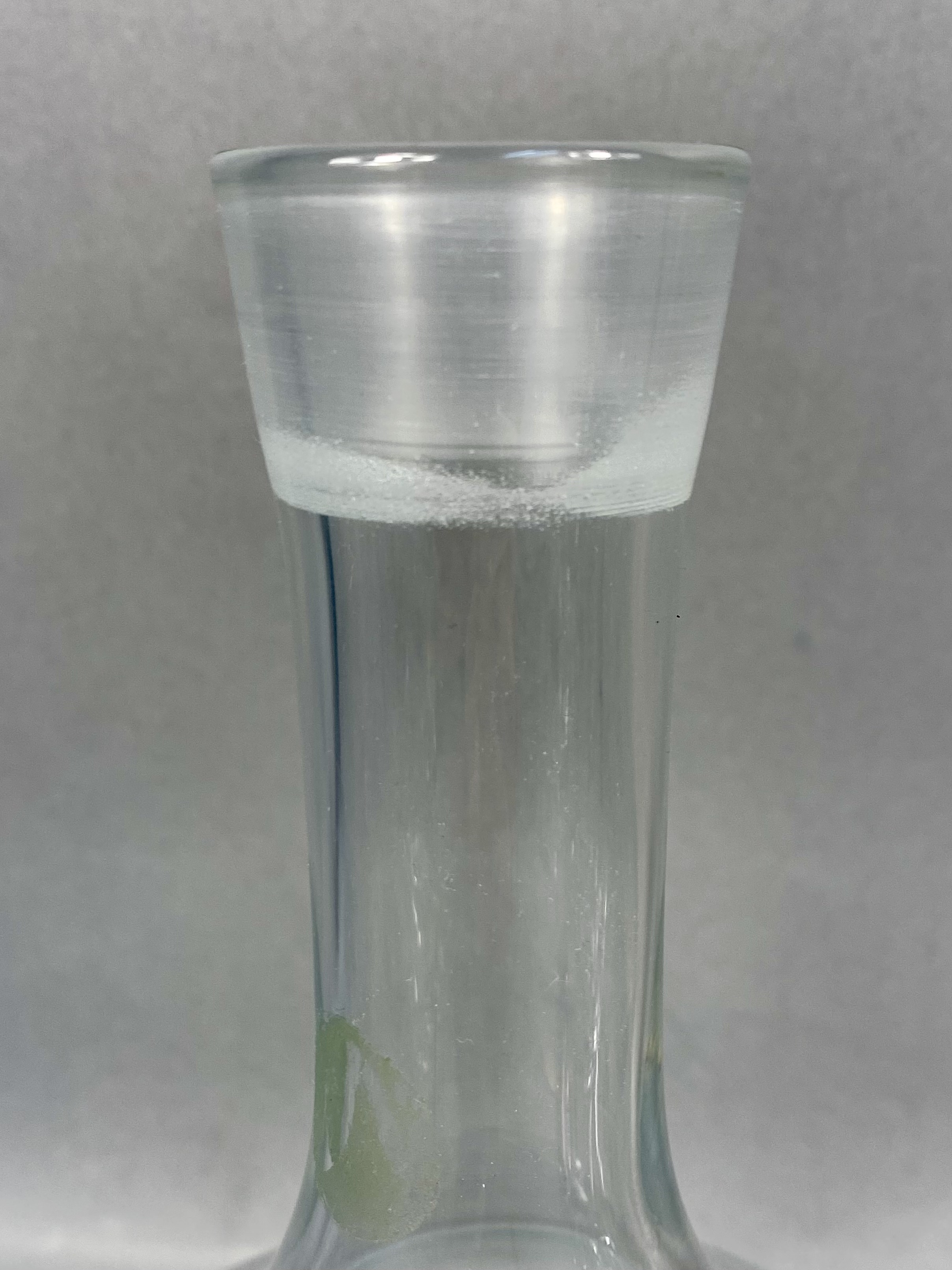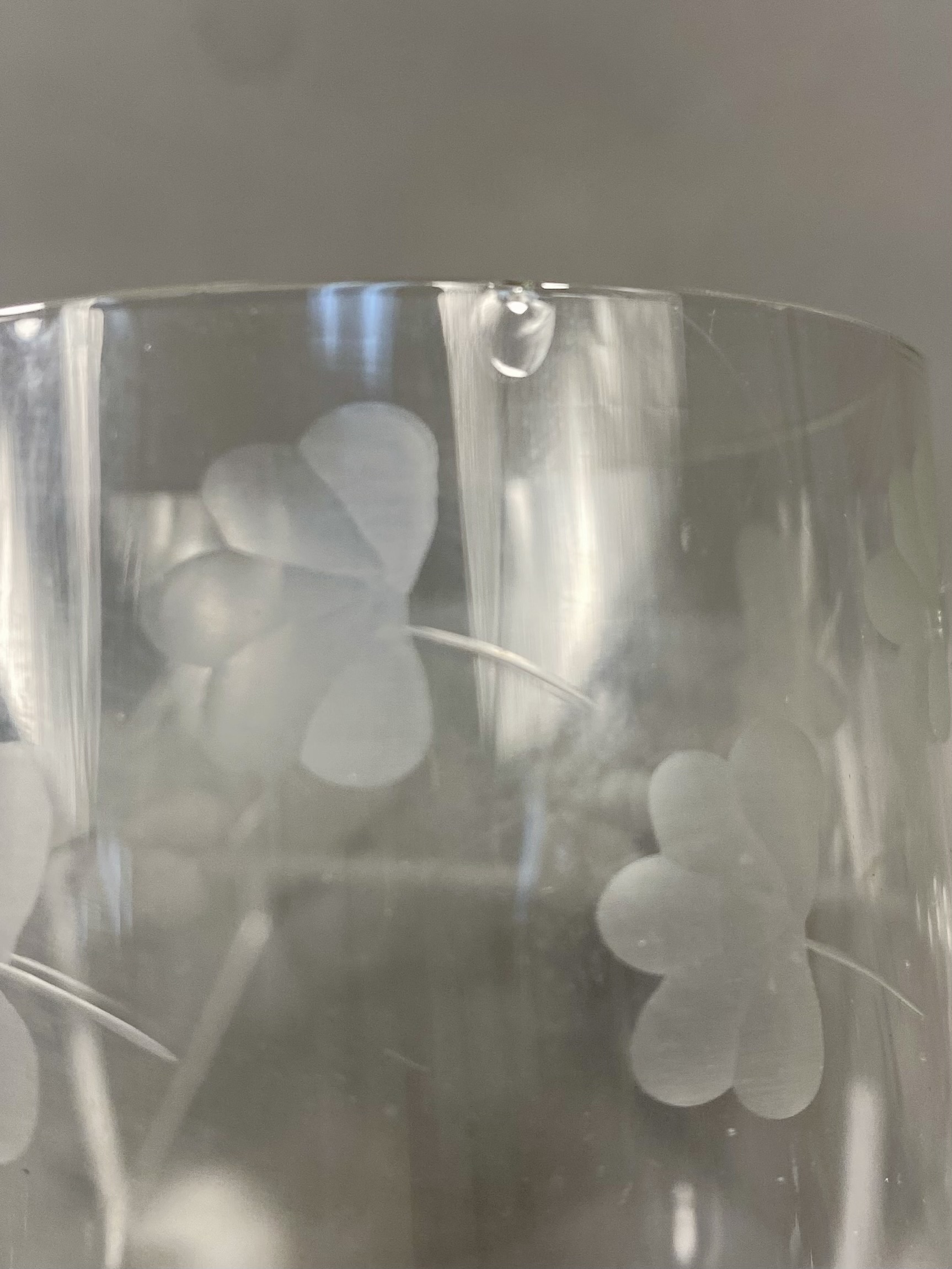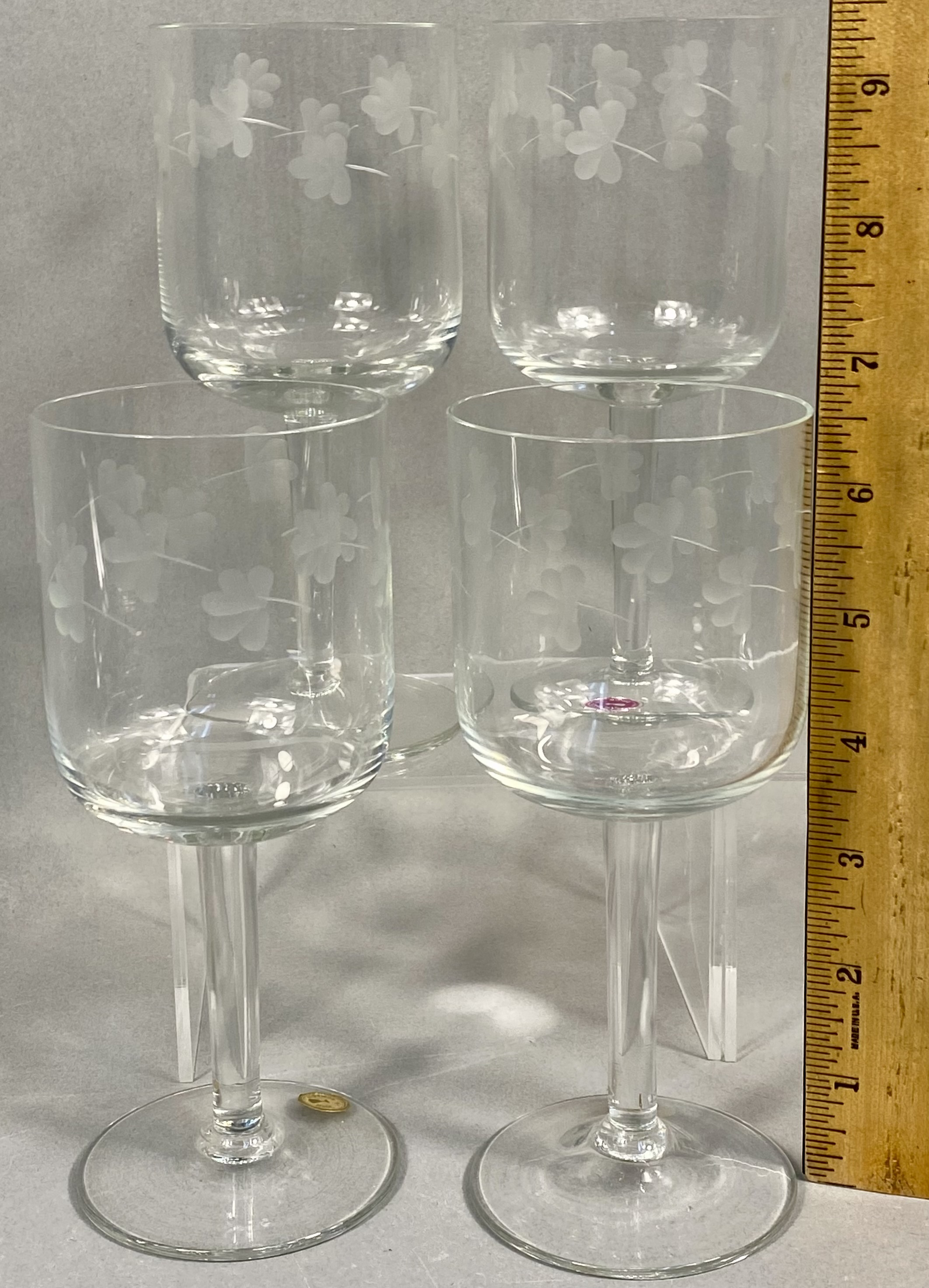 The set is in generally good condition. One wine glass has a small nick on the rim. The glass remains clear with no signs of cloudiness or glass sickness.