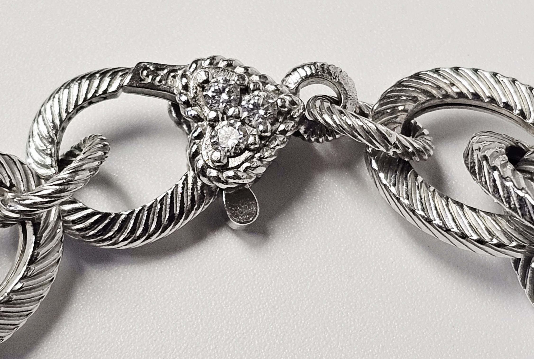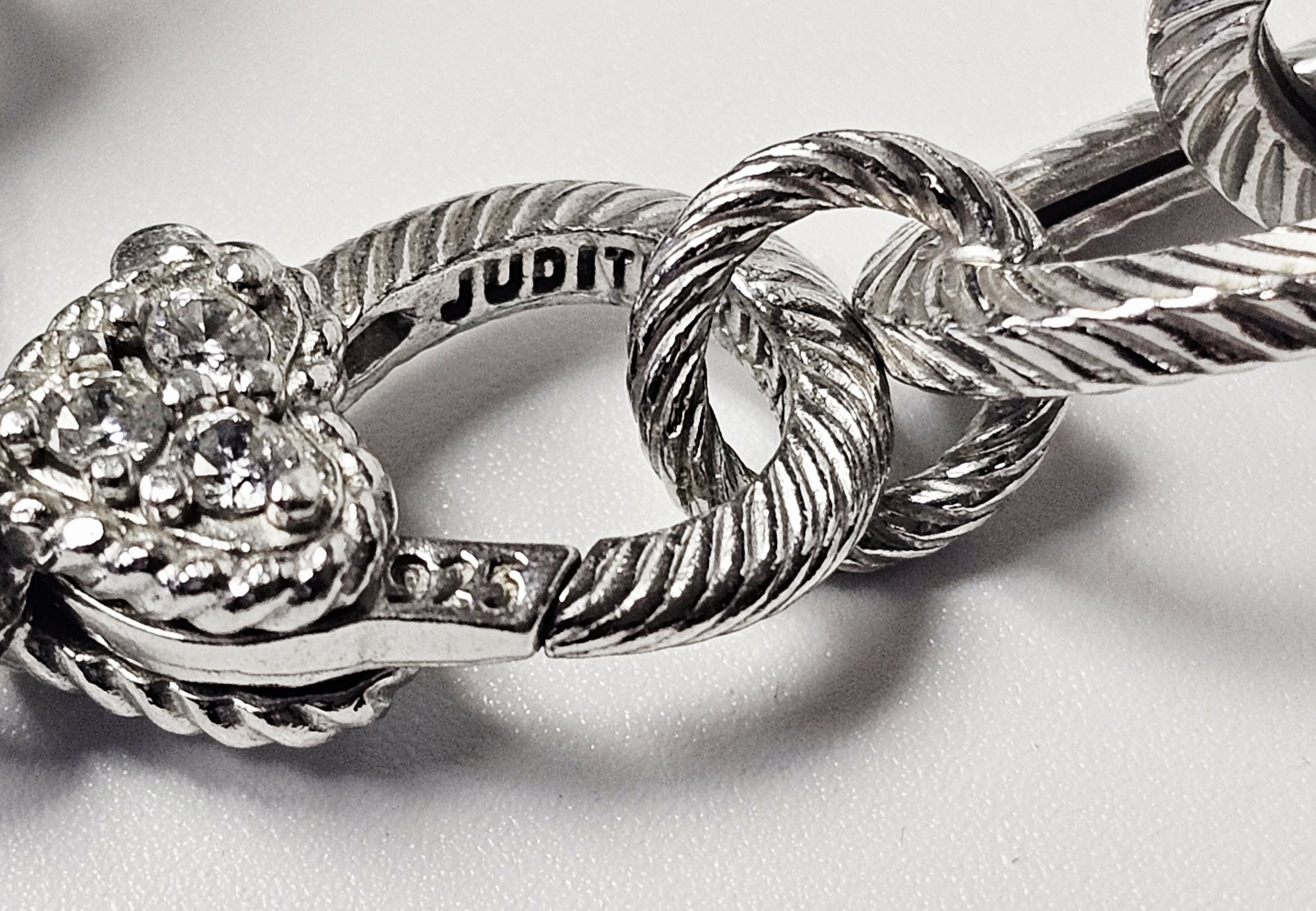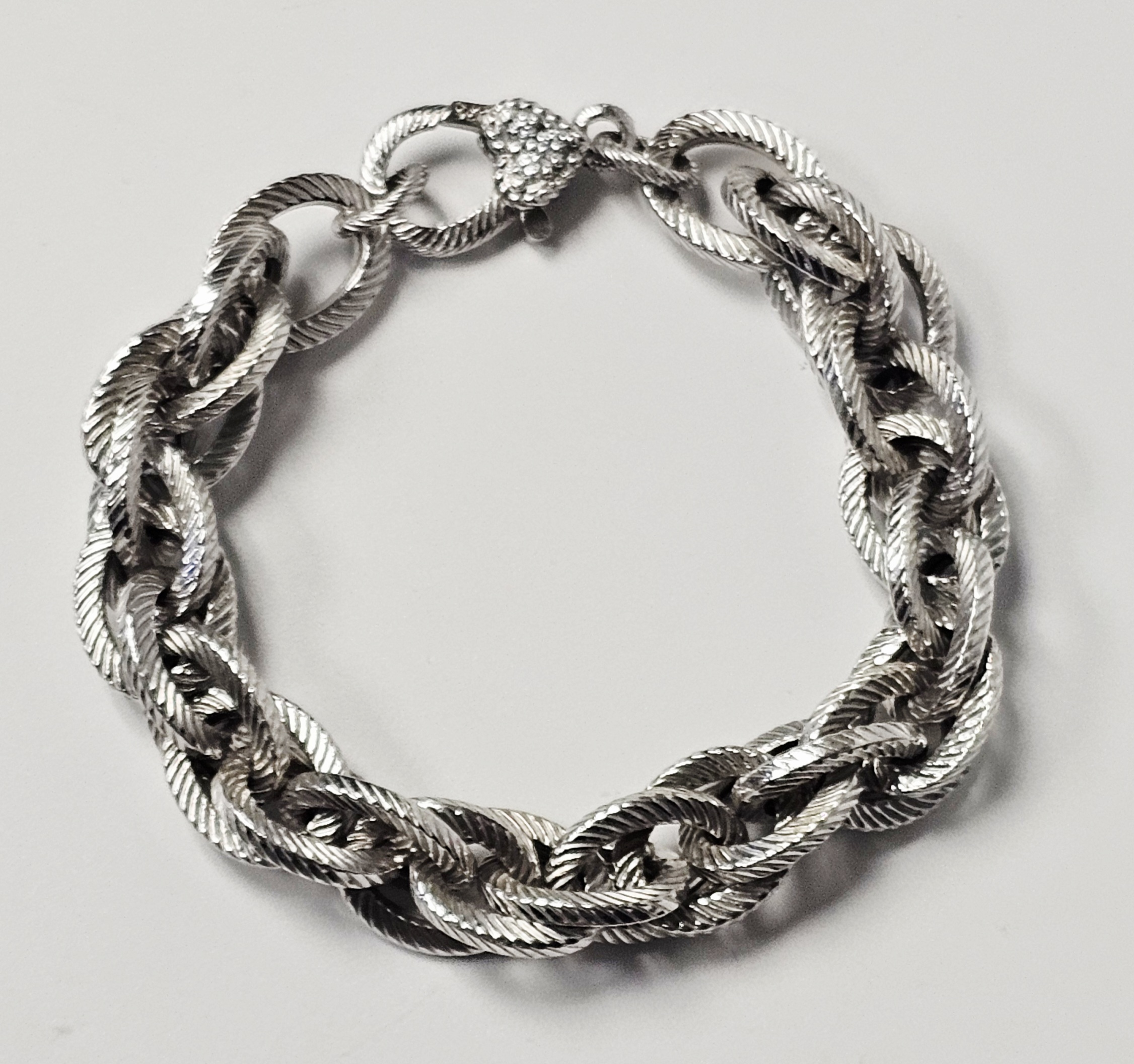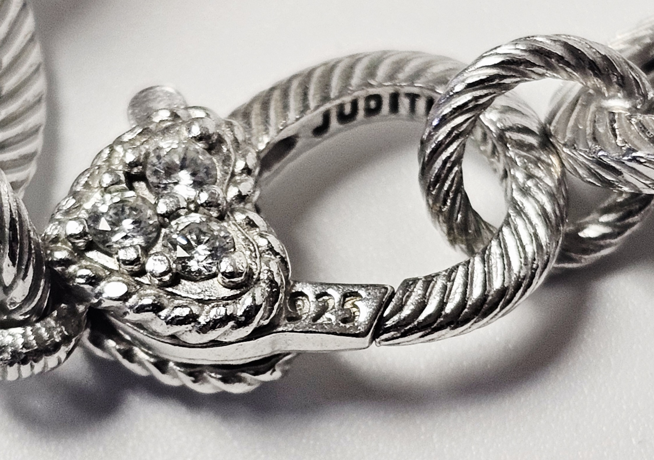 This sterling silver link bracelet by Judith Ripka features a textured triple-row interlocking cable design. The piece is secured with a large integrated clasp that includes a heart-shaped element set with three round-cut colorless gemstones. The gemstones appear to be cubic zirconia or similar colorless stones. The bracelet bears the incised characters JUDITH and 925 on the clasp and interior links. Length: Approximately 8.5 inches Weight: 32.1 grams. The item is in good condition, showing minor surface wear and light tarnishing consistent with previous use.