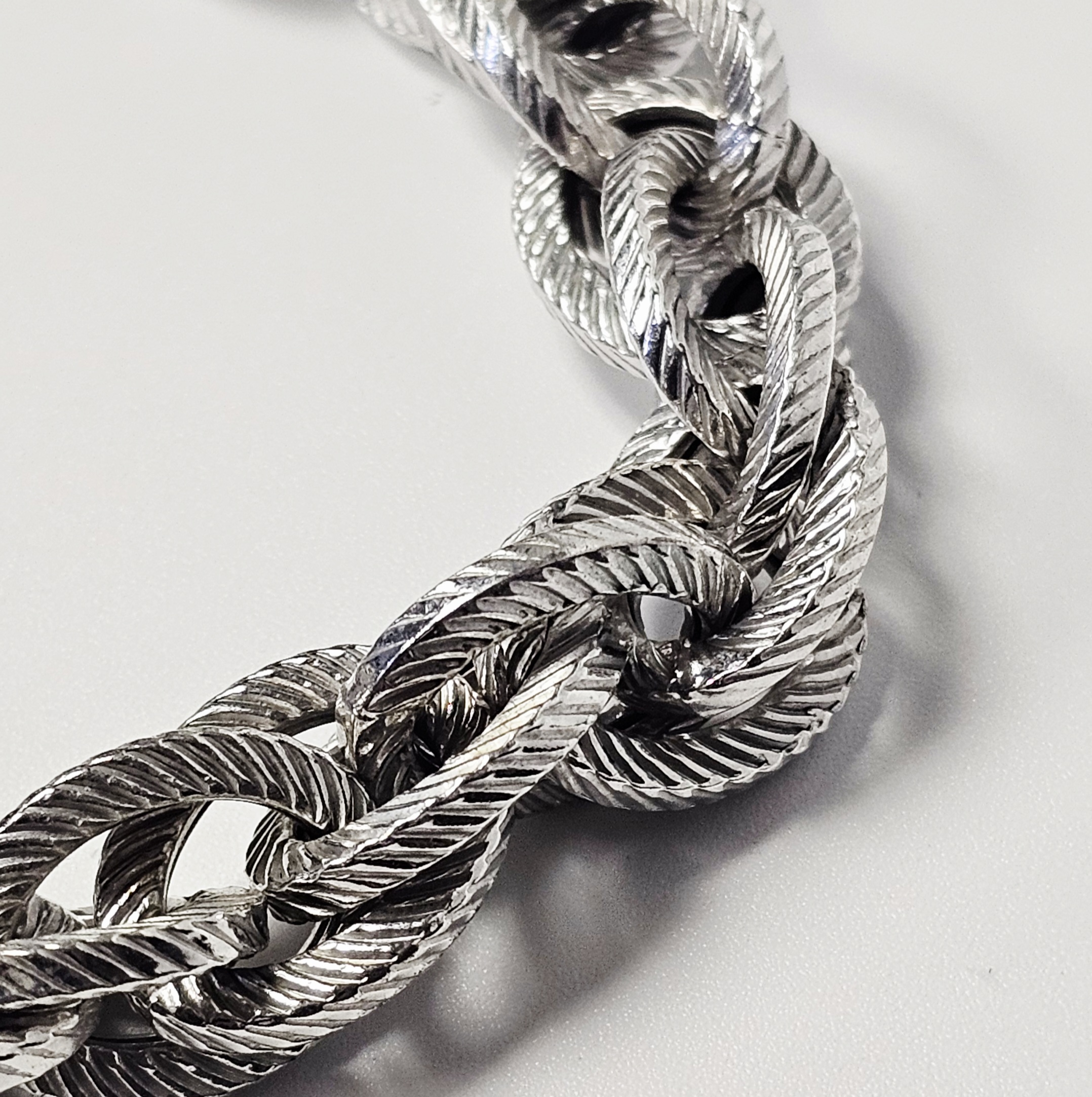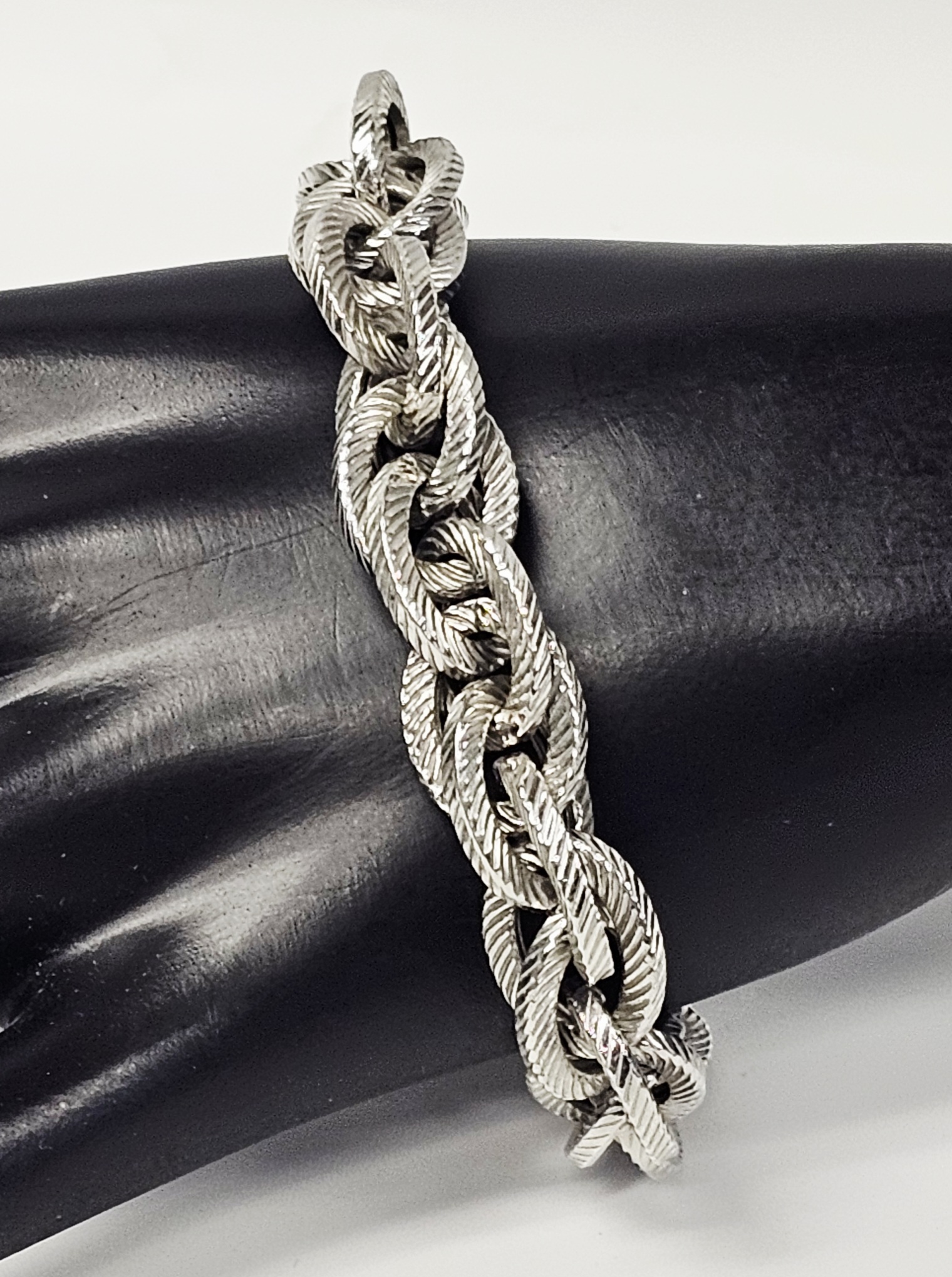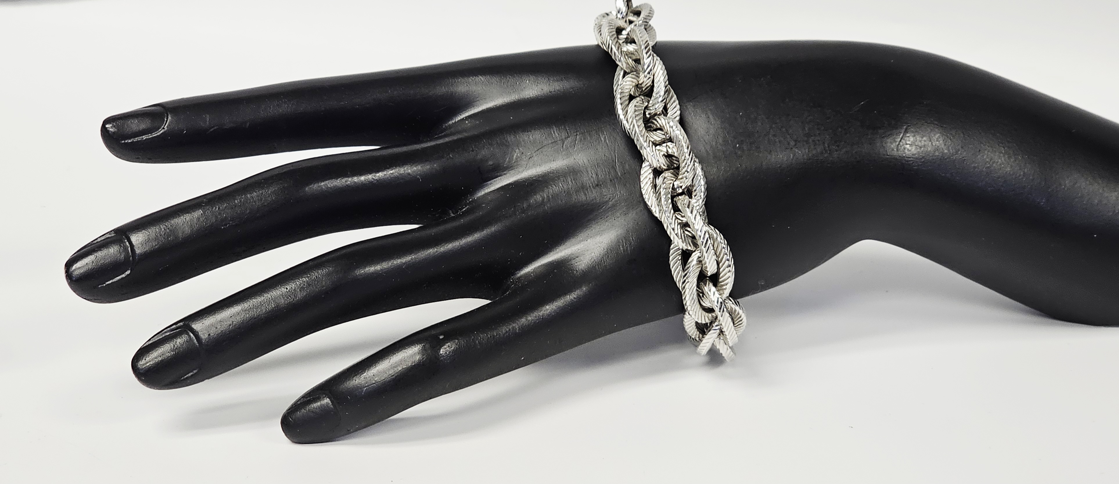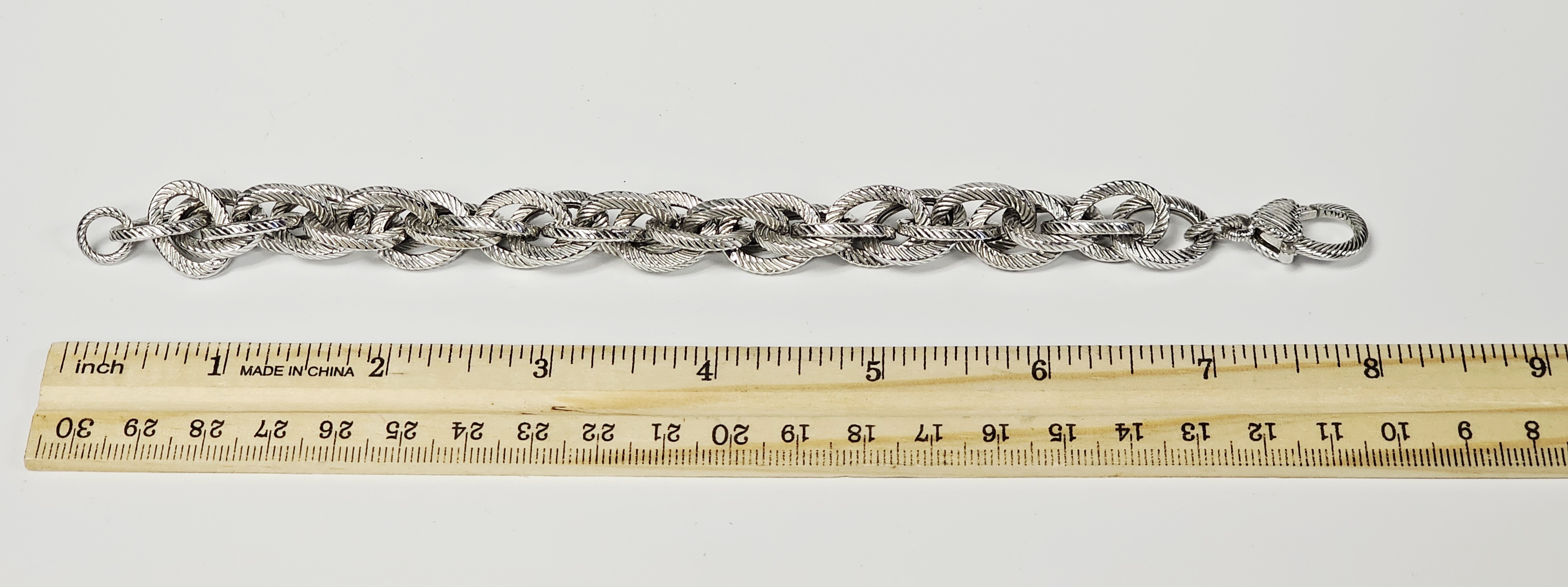This sterling silver link bracelet by Judith Ripka features a textured triple-row interlocking cable design. The piece is secured with a large integrated clasp that includes a heart-shaped element set with three round-cut colorless gemstones. The gemstones appear to be cubic zirconia or similar colorless stones. The bracelet bears the incised characters JUDITH and 925 on the clasp and interior links. Length: Approximately 8.5 inches Weight: 32.1 grams. The item is in good condition, showing minor surface wear and light tarnishing consistent with previous use.