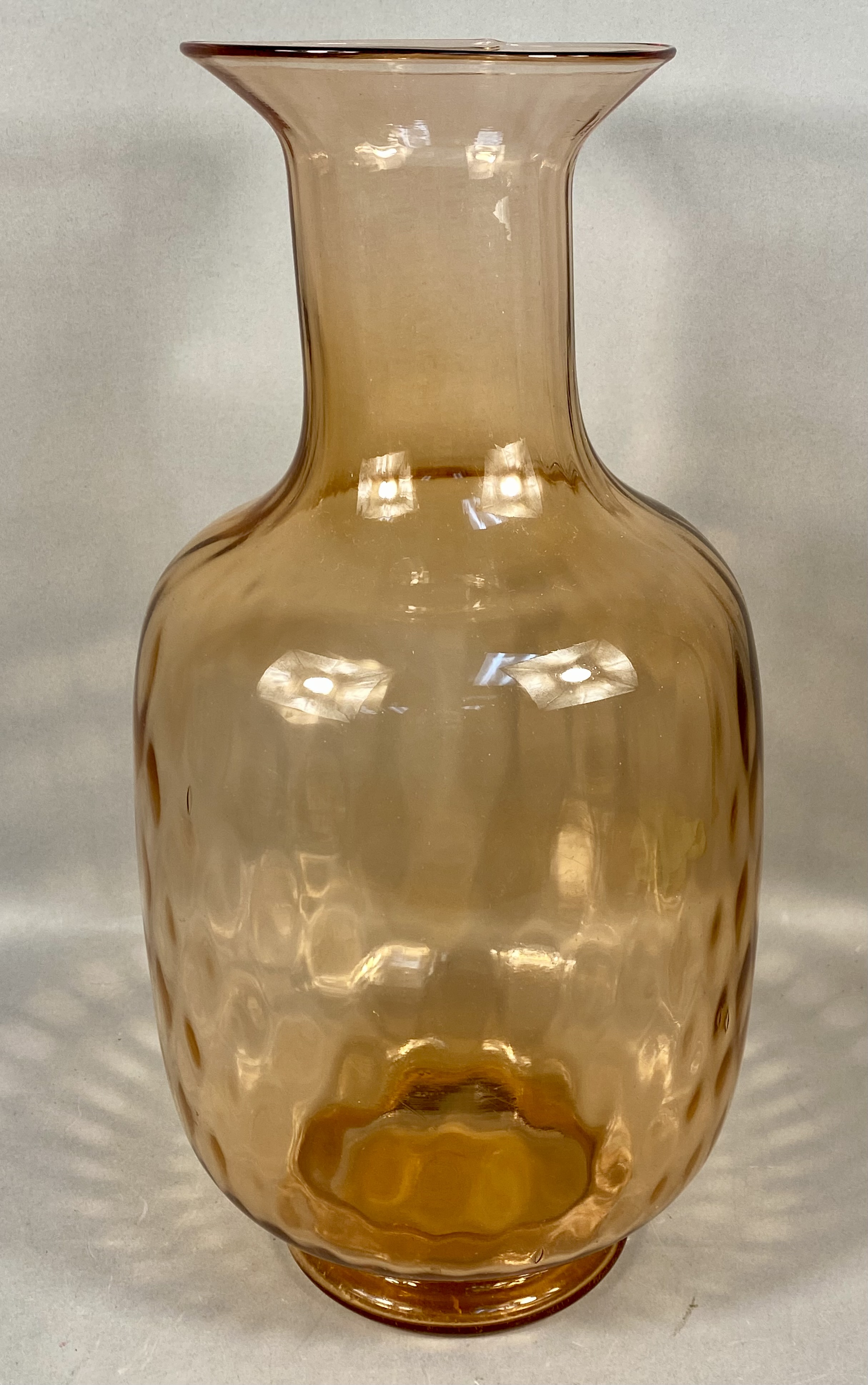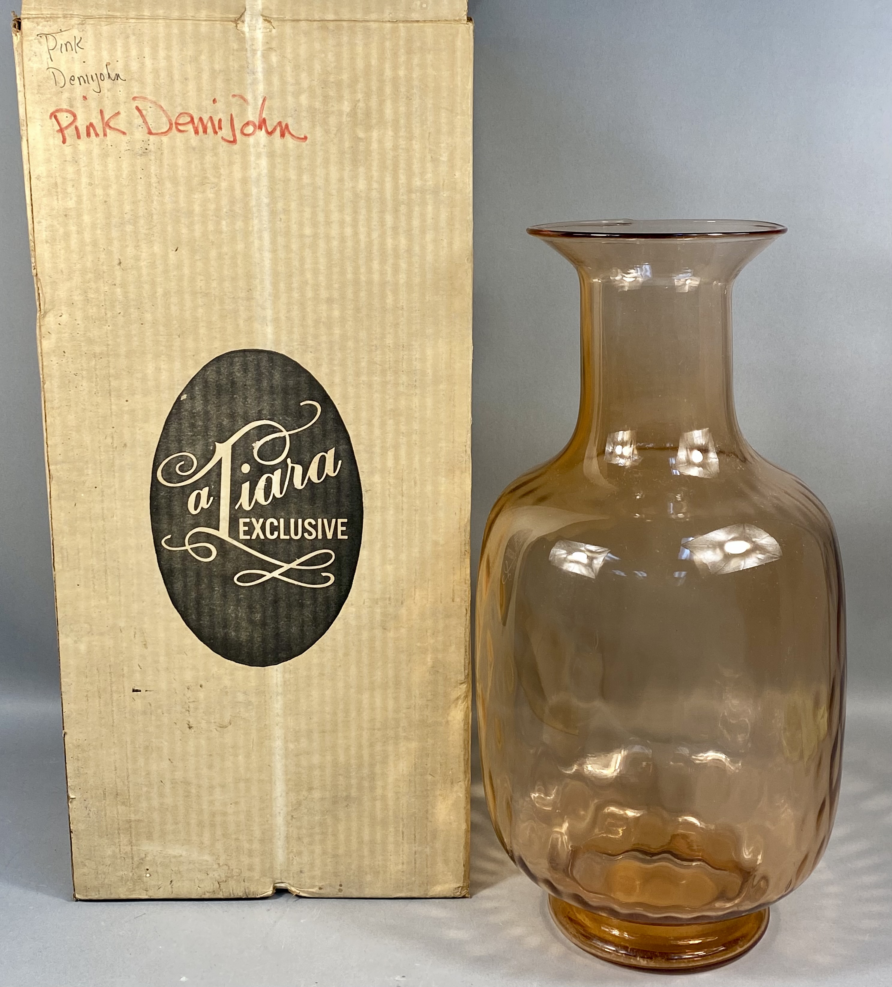 A mold-blown glass demijohn vase produced for Tiara Exclusives. The vessel features a bulbous body with a repetitive optic honeycomb or thumbprint texture, tapering to a long neck with a flared, polished rim. The piece is supported by a short, circular footed base. The glass is a translucent pink hue. The item is accompanied by its original cardboard retail box, which displays the Tiara Exclusives oval logo and handwritten text reading Pink Demijohn.