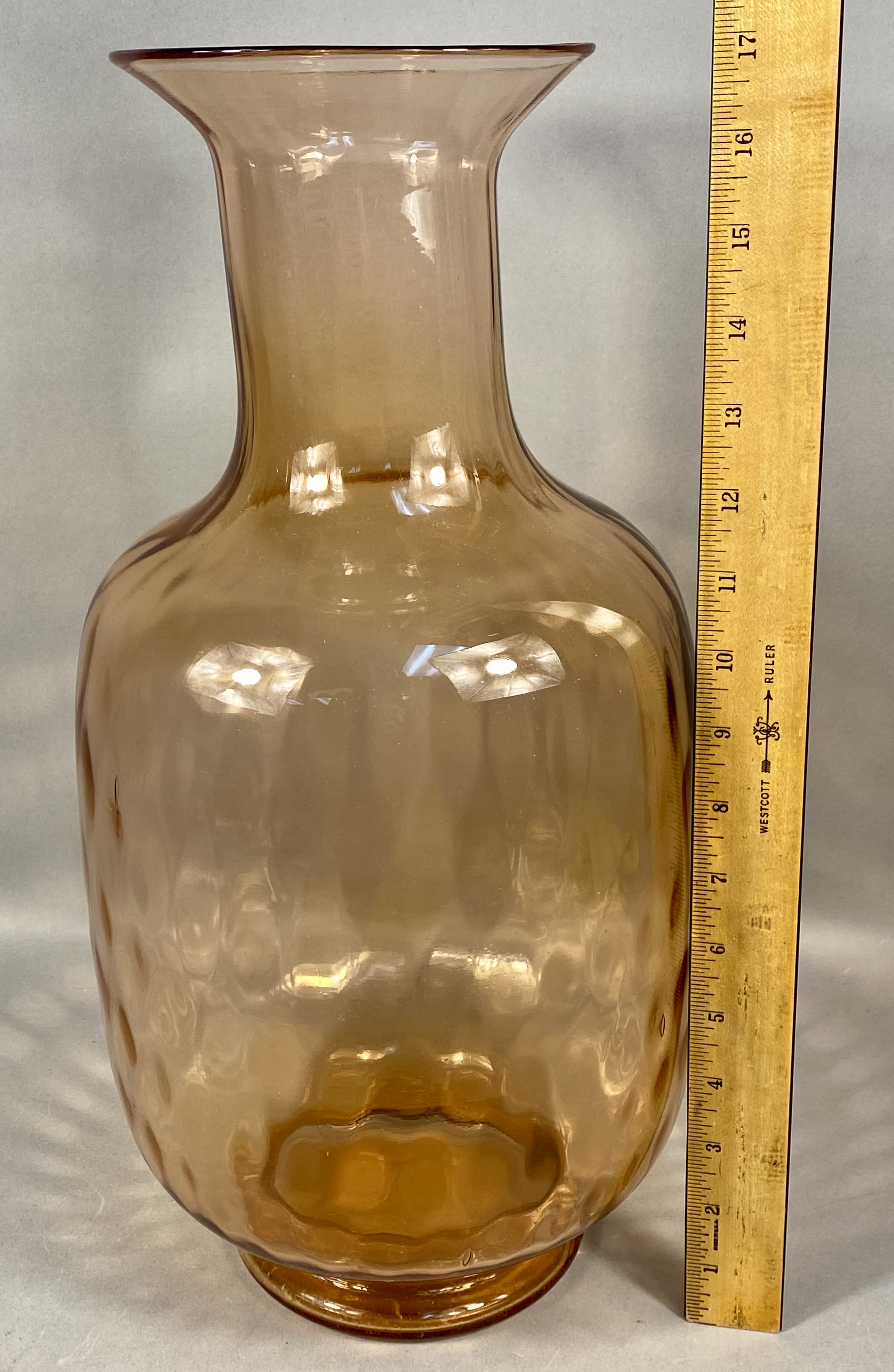 The glass vase is in excellent condition with no visible chips, cracks, or scratches. The original box shows significant age-related wear, including discoloration, structural softening, and handwritten ink markings.