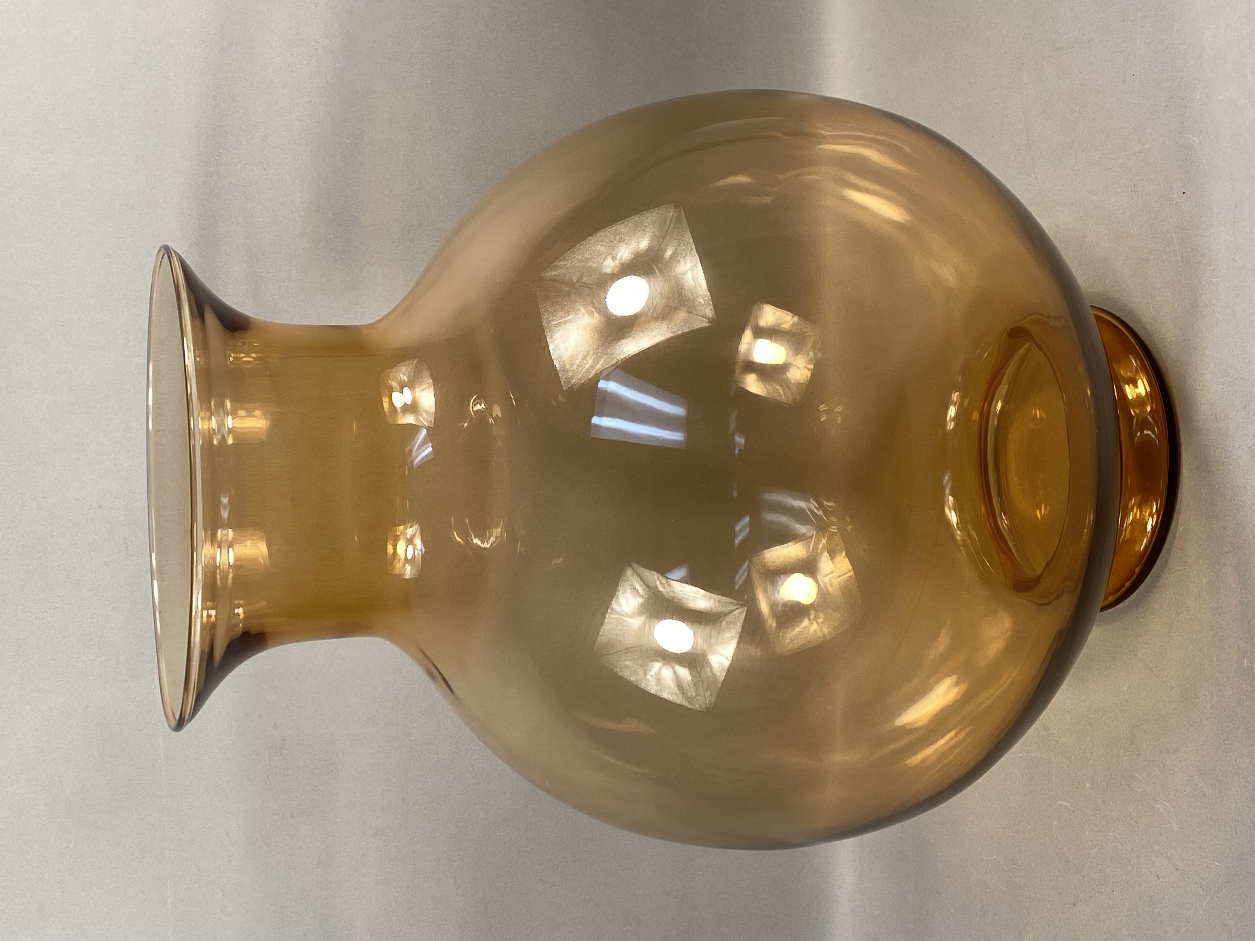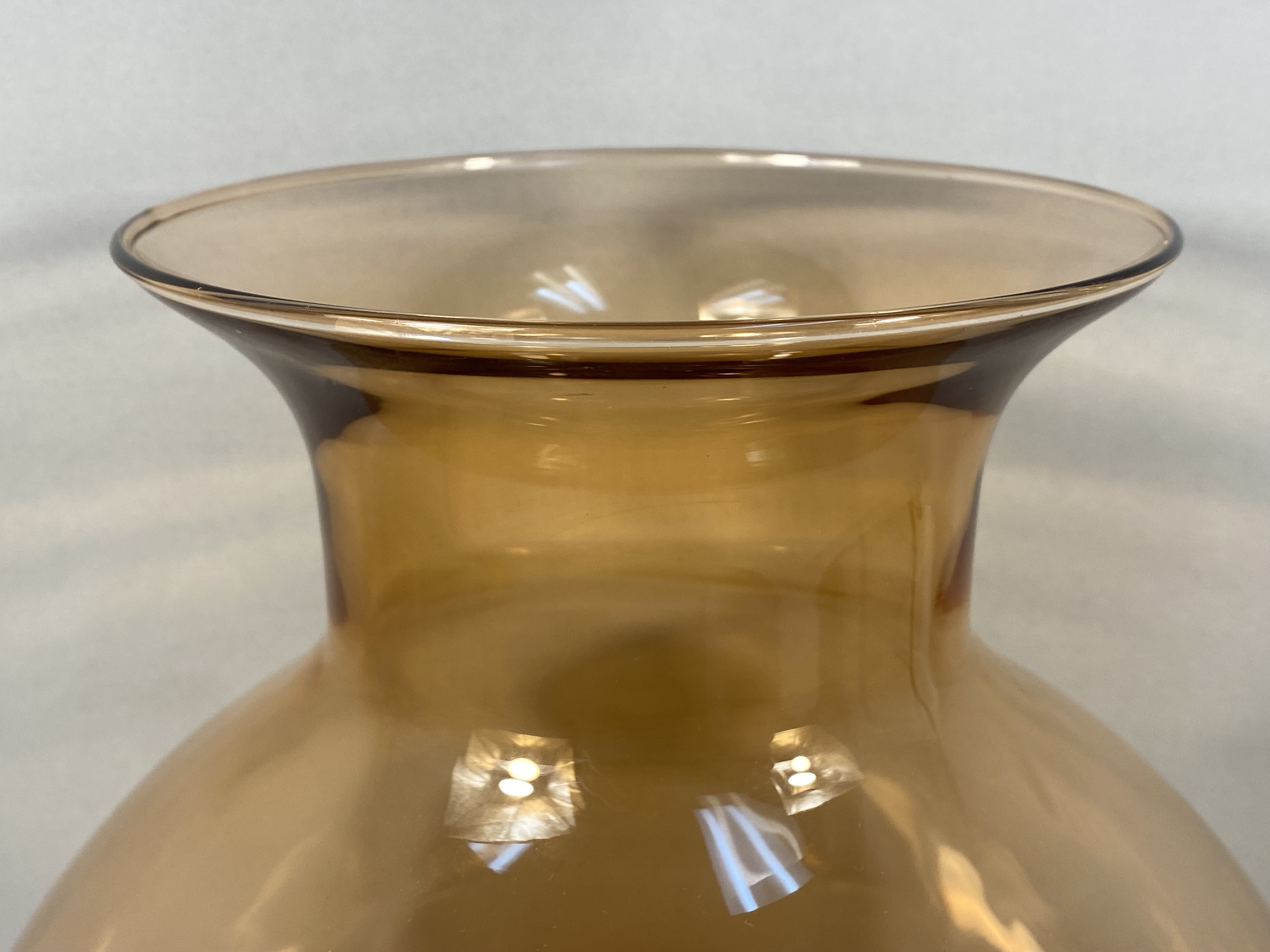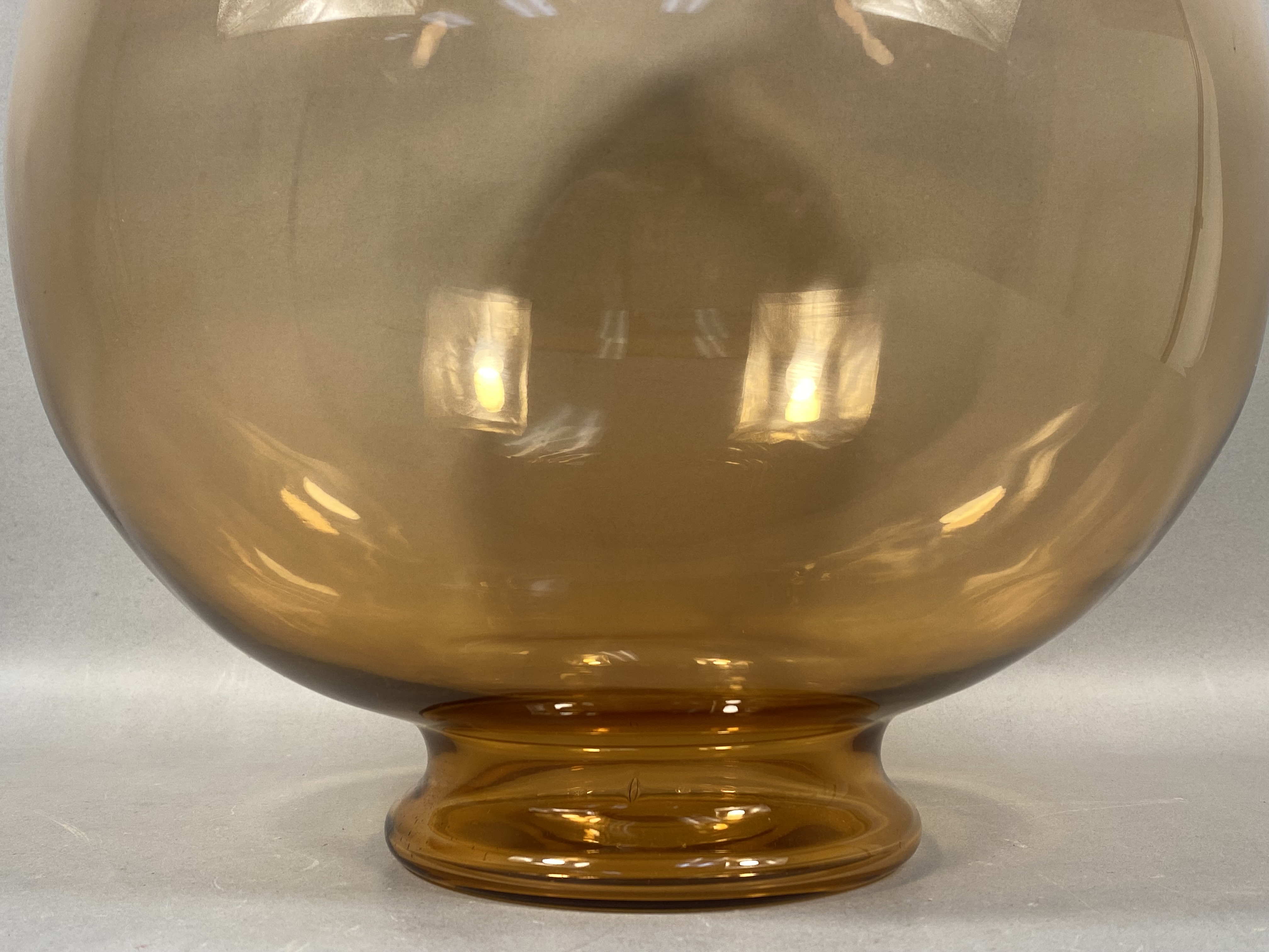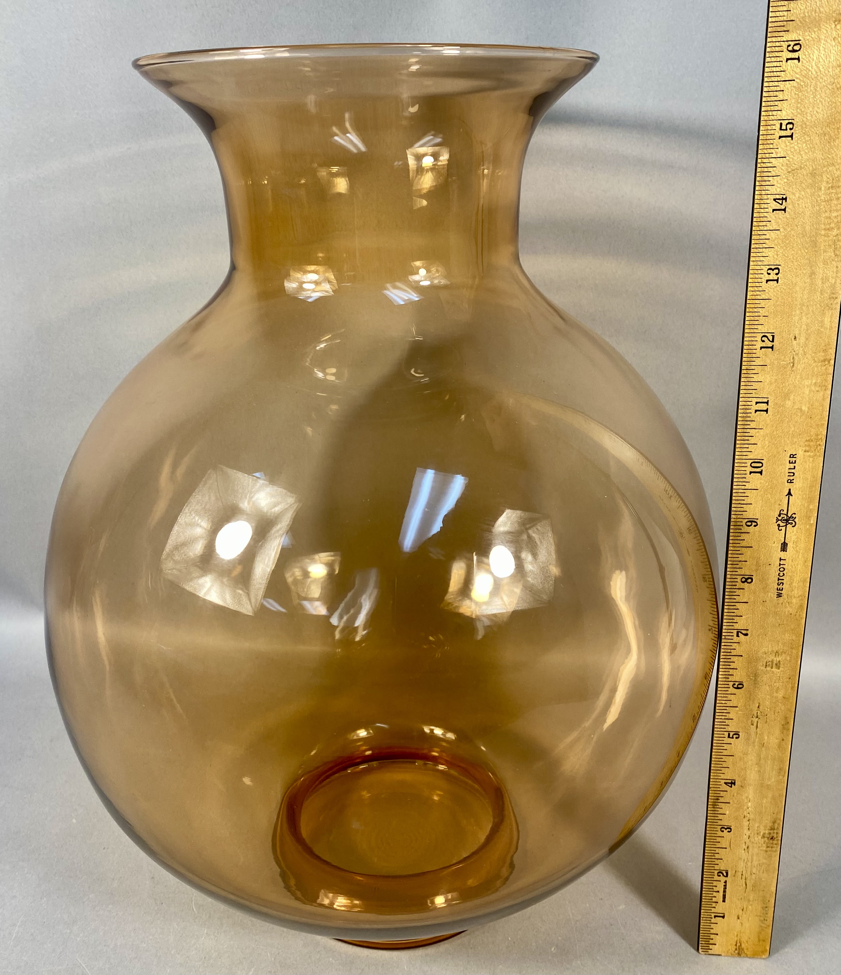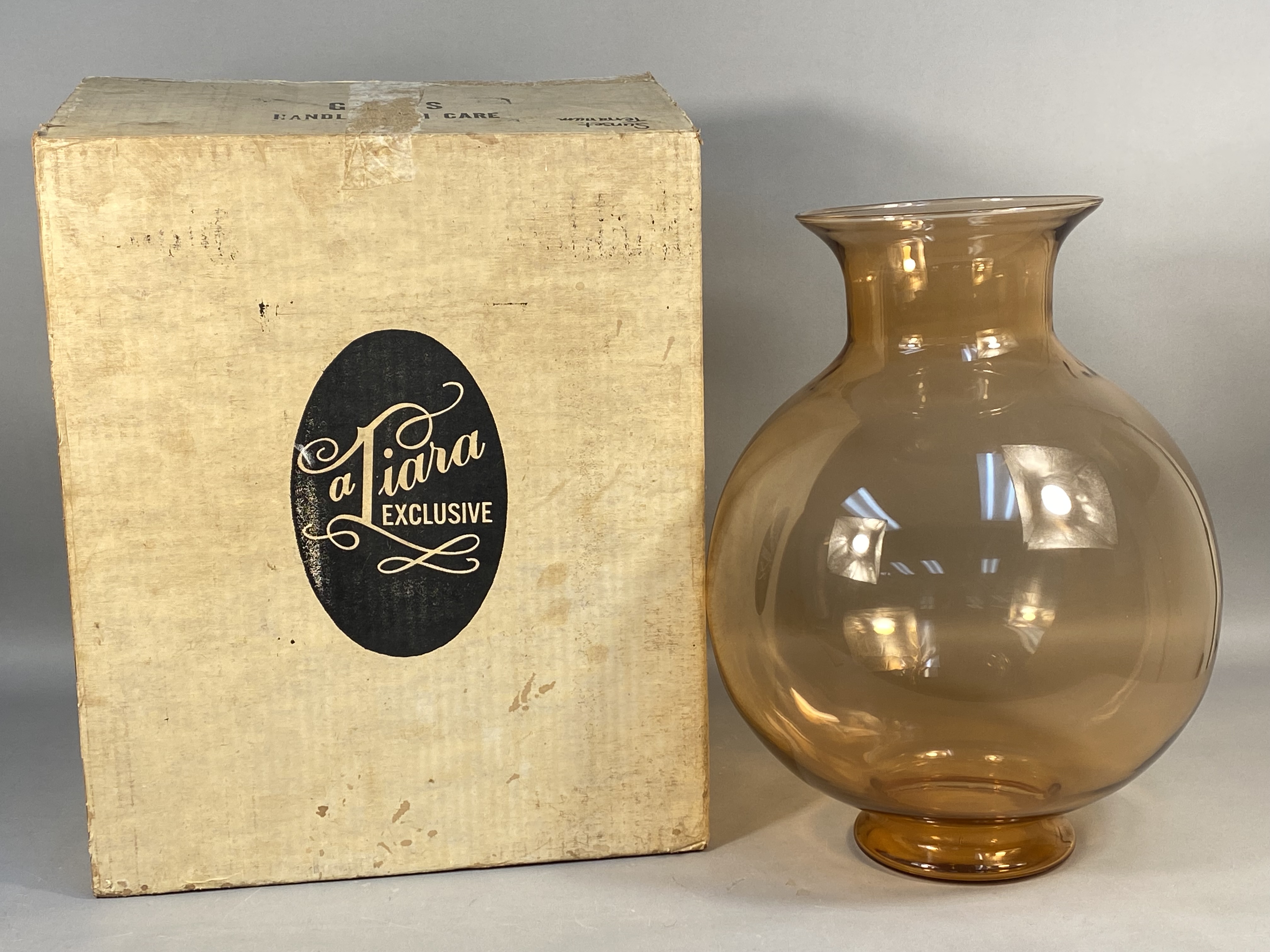A large amber glass vessel manufactured for Tiara Exclusives. The piece is made of transparent honey-amber glass and features a wide flared rim, a short neck, and a large bulbous body tapering to a small circular pedestal base. The base of the glass item shows a circular indentation in the center. The item includes its original cardboard box which features an oval black label with the script letters a Tiara and the block capital letters EXCLUSIVE. The top flap of the box contains text identifying the item as a Sunset Terrarium. Tiara Exclusives was a glassware distributor located in Dunkirk, Indiana, operating between the 1970s and 1990s. Height: Approximately 15.75 inches. The glass item is in good condition with no observed chips, cracks, or significant scratches. The original cardboard box exhibits significant age-related wear, including staining, scuffing, and residue from old adhesive tape.