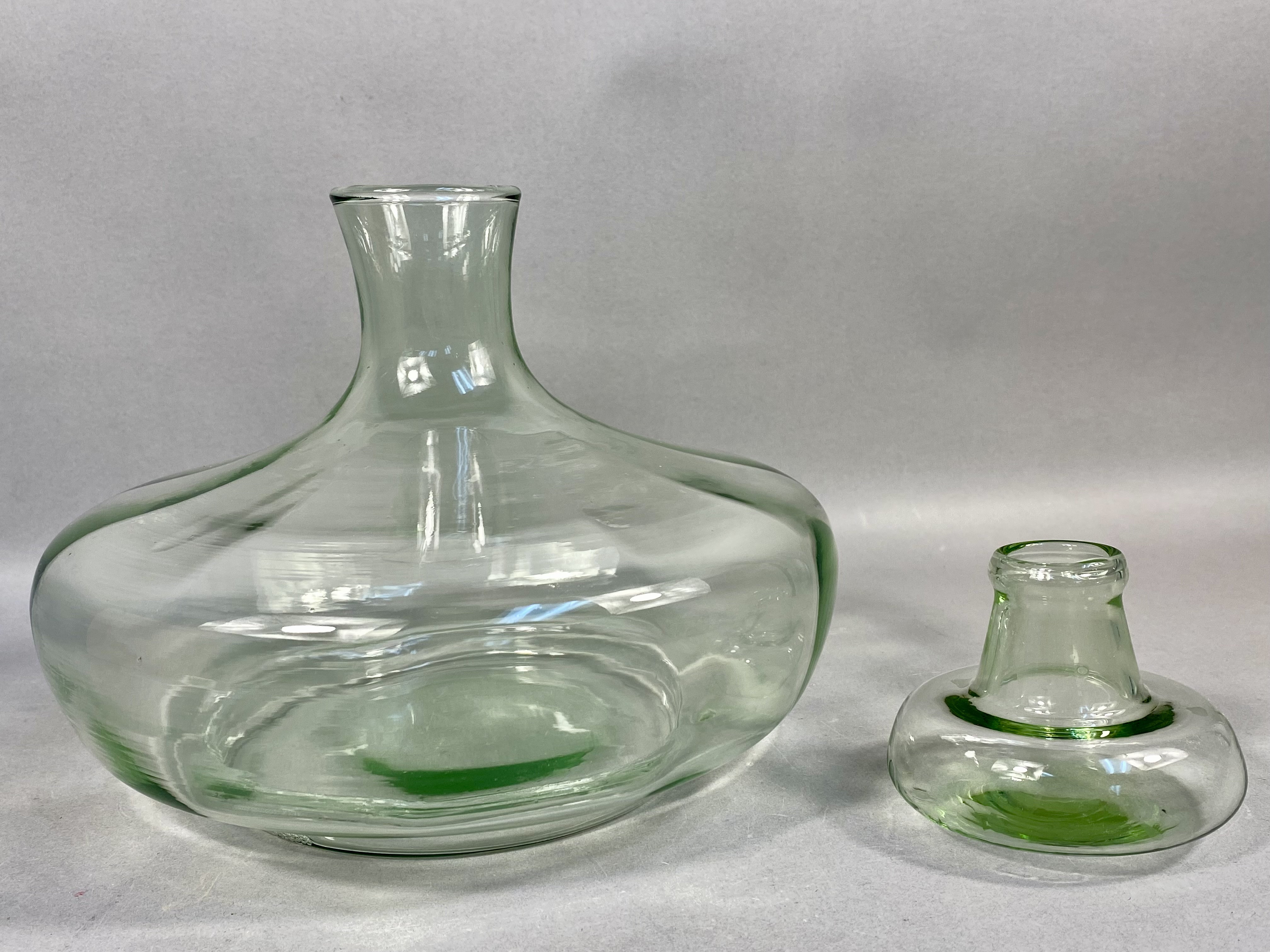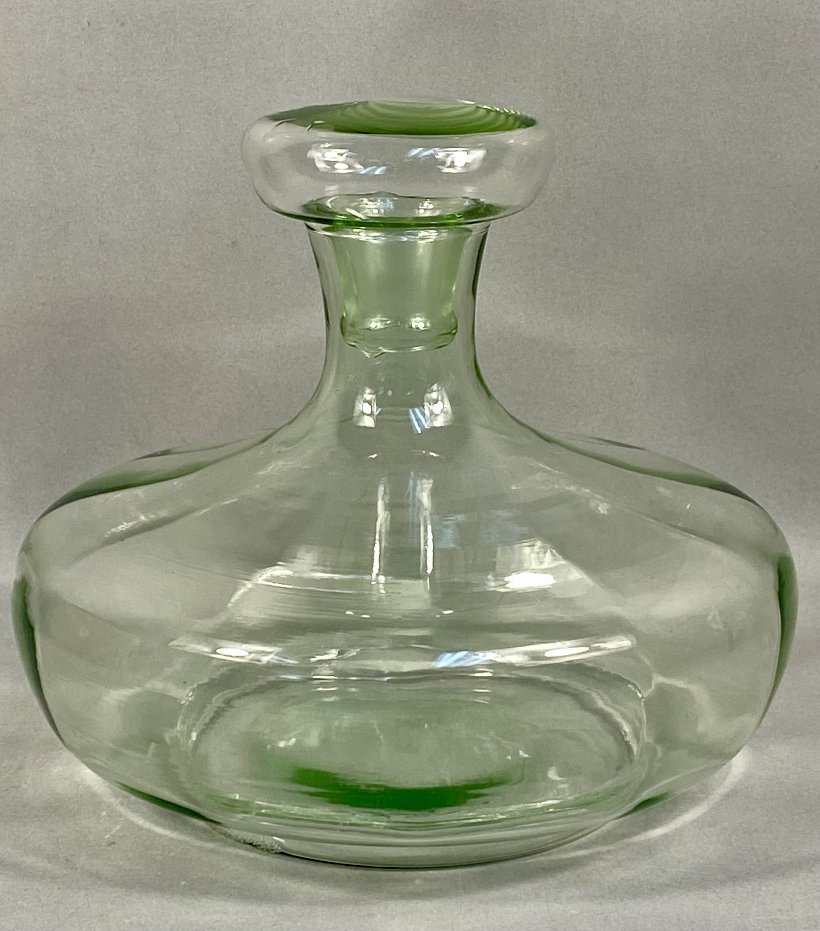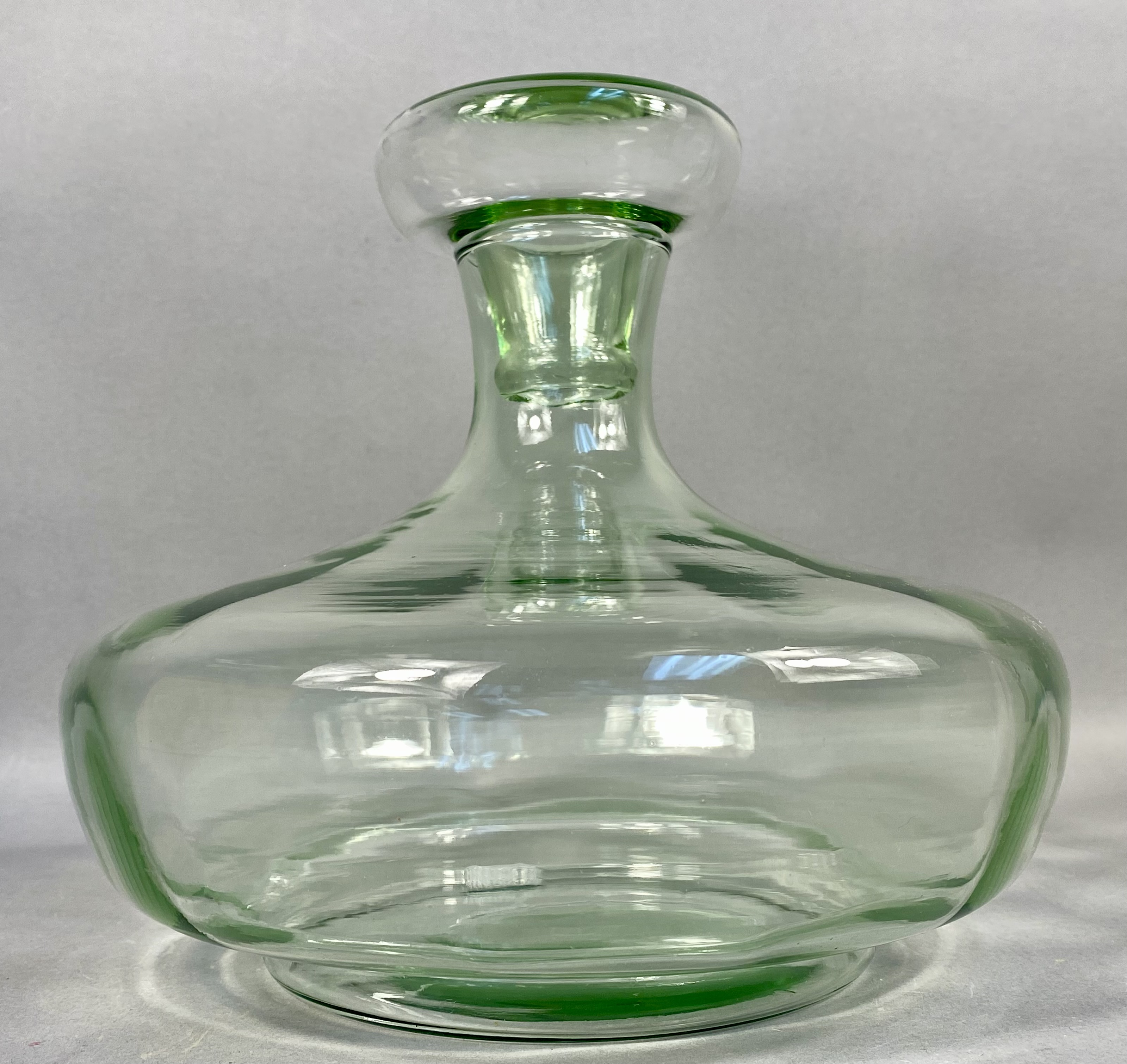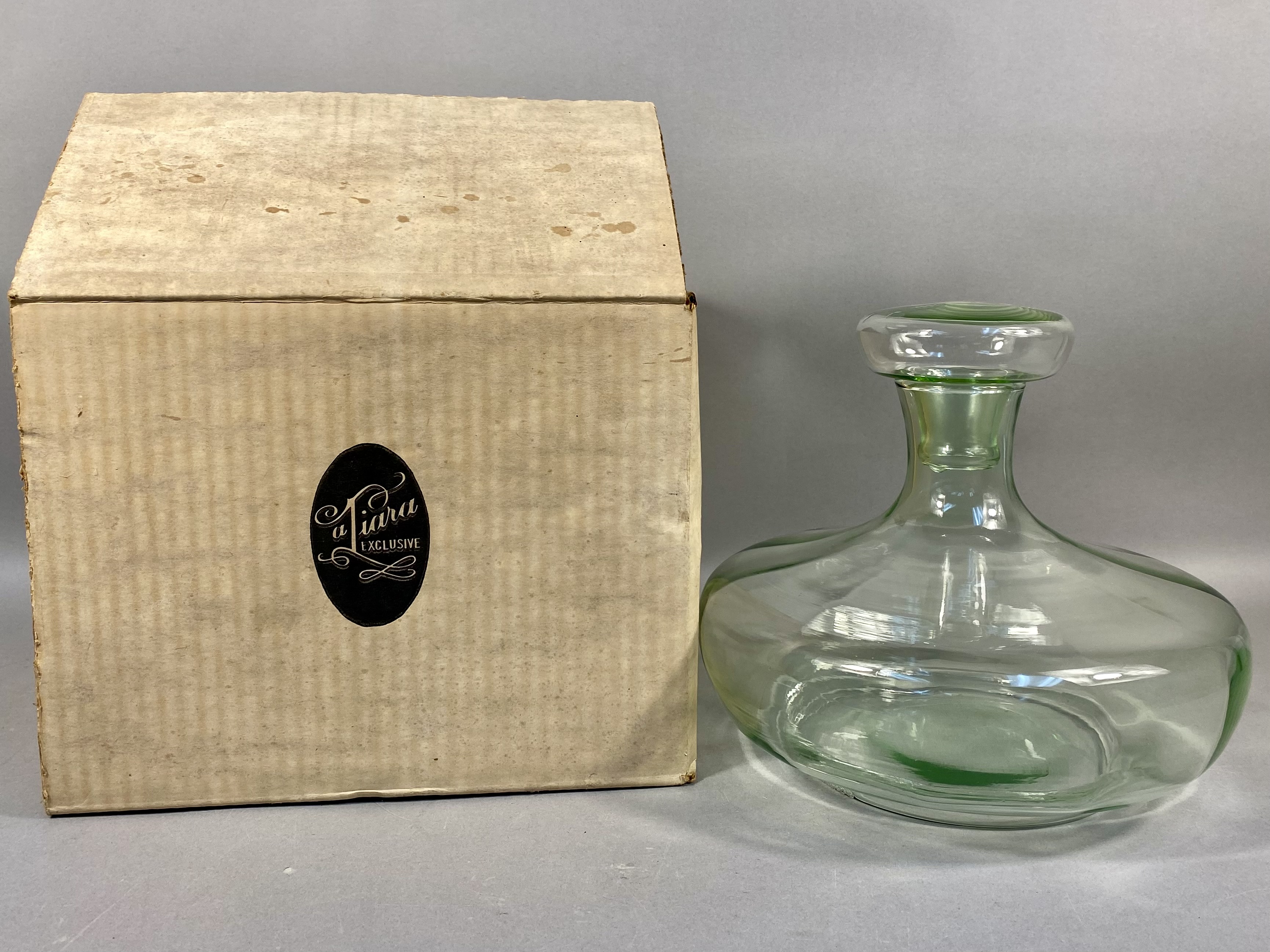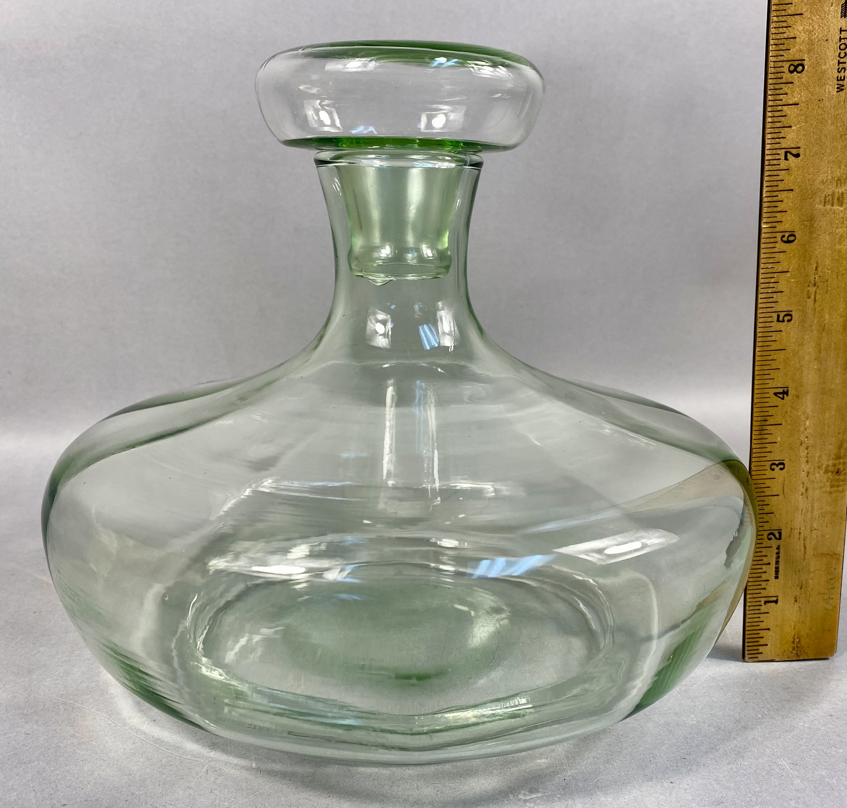 This hand-blown glass ship’s decanter is attributed to Tiara Exclusives, as evidenced by the original retail box. The vessel is crafted from apple green glass and features a characteristic ship’s decanter form with a wide, flared base designed for stability and a short, tapered neck. The piece includes a matching glass stopper. The interior of the neck and the base of the stopper are ground and polished to ensure a secure fit. The underside of the decanter exhibits a polished pontil mark, indicating hand-blown construction. The accompanying original cardboard box features a black oval adhesive label with a stylized script letter T followed by the letters iara and the word EXCLUSIVE in block font. Tiara Exclusives was an American marketing company based in Dunkirk, Indiana, that distributed glassware produced by various American manufacturers between 1970 and 1998. Height: Approximately 7.75 inches (including stopper). The glass decanter and stopper are in good vintage condition with no visible chips, cracks, or repairs. The original cardboard box shows moderate staining, age-related discoloration, and shelf wear.