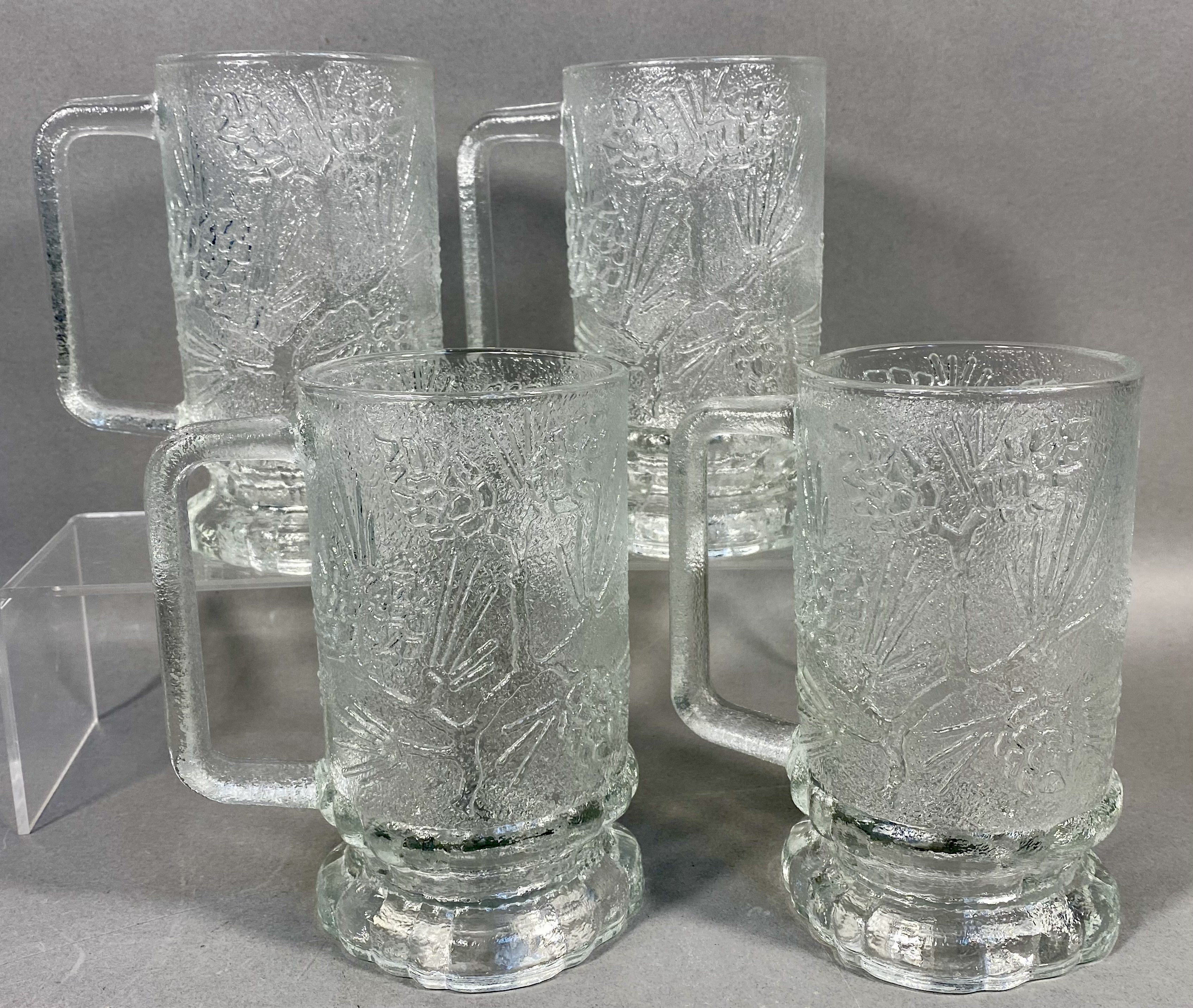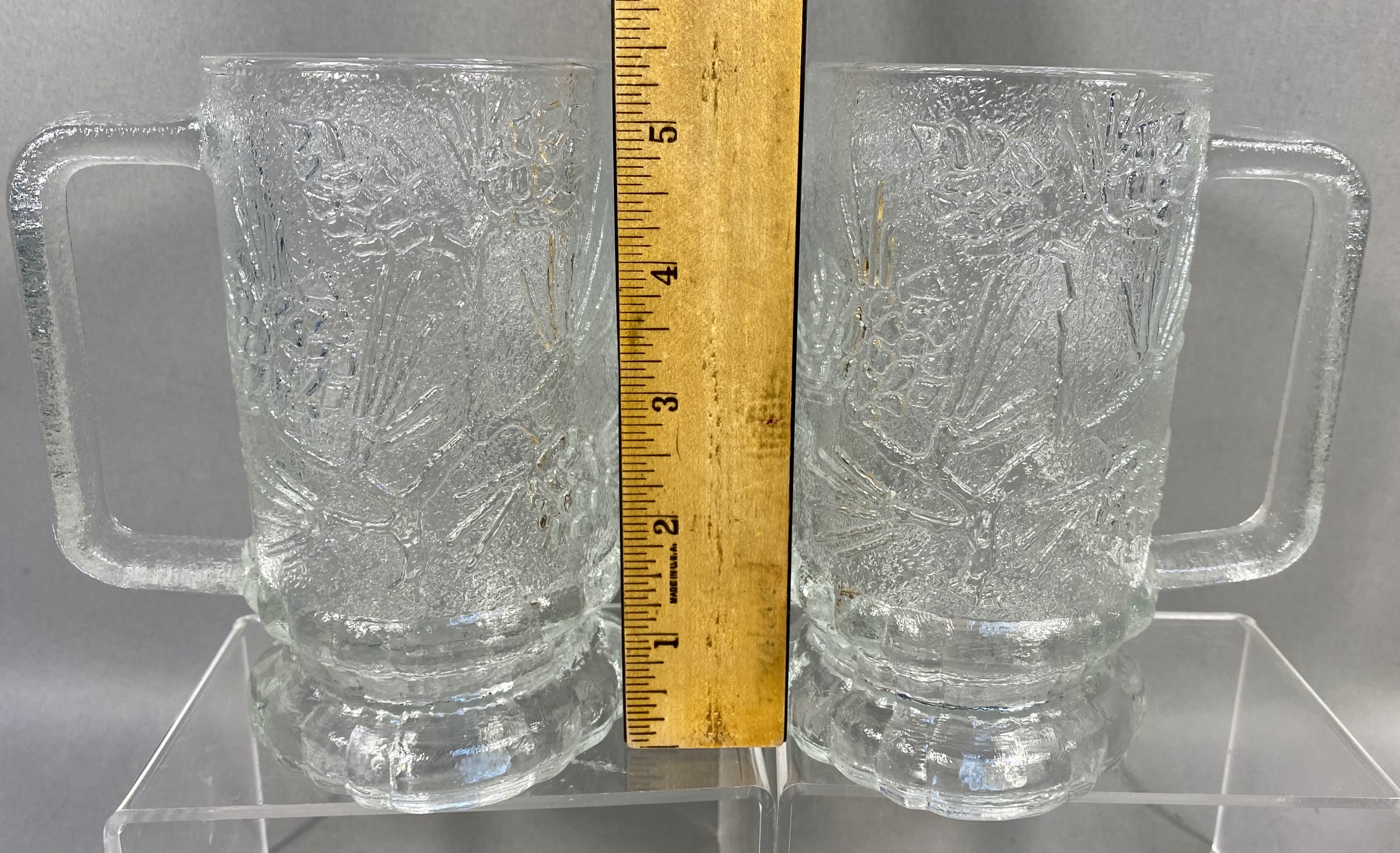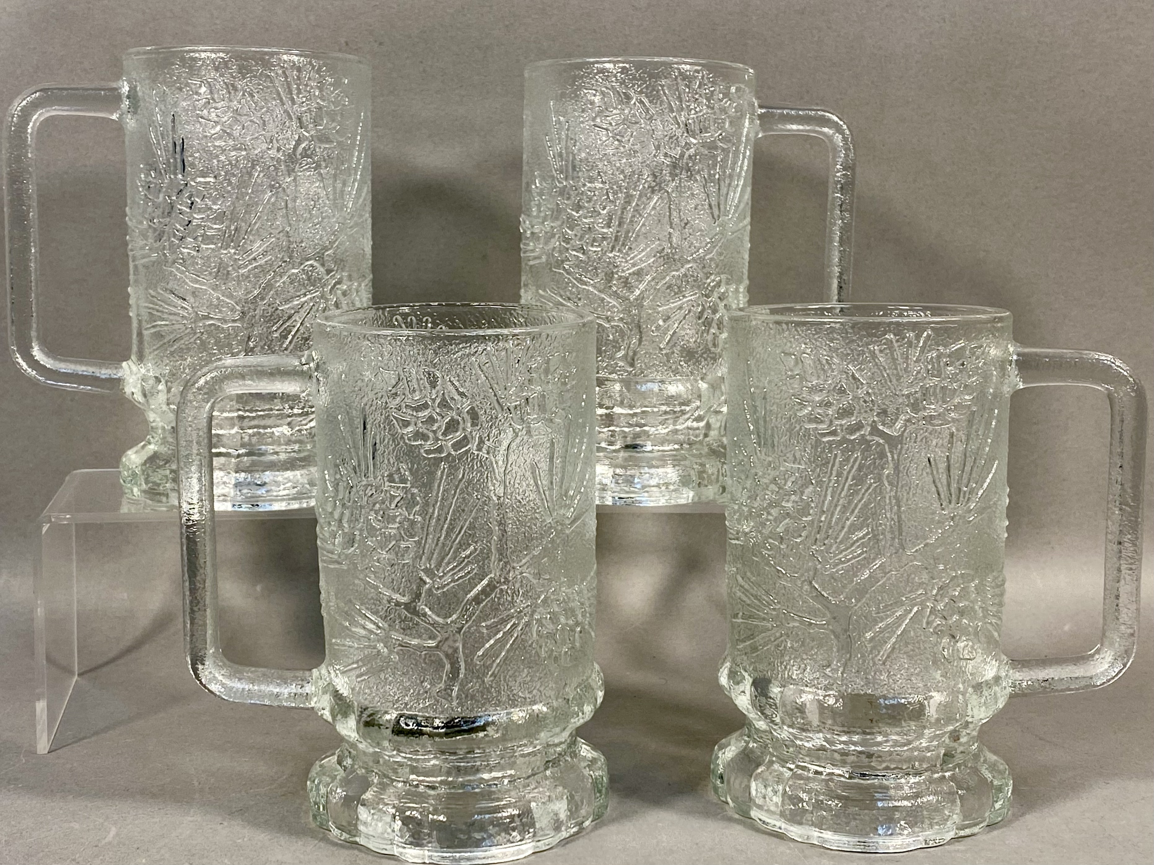 A collection of four clear glass mugs from Tiara in the Ponderosa Pine motif. Each mug features pine boughs and cones. Measurement: 5.5 inches tall Very good condition.