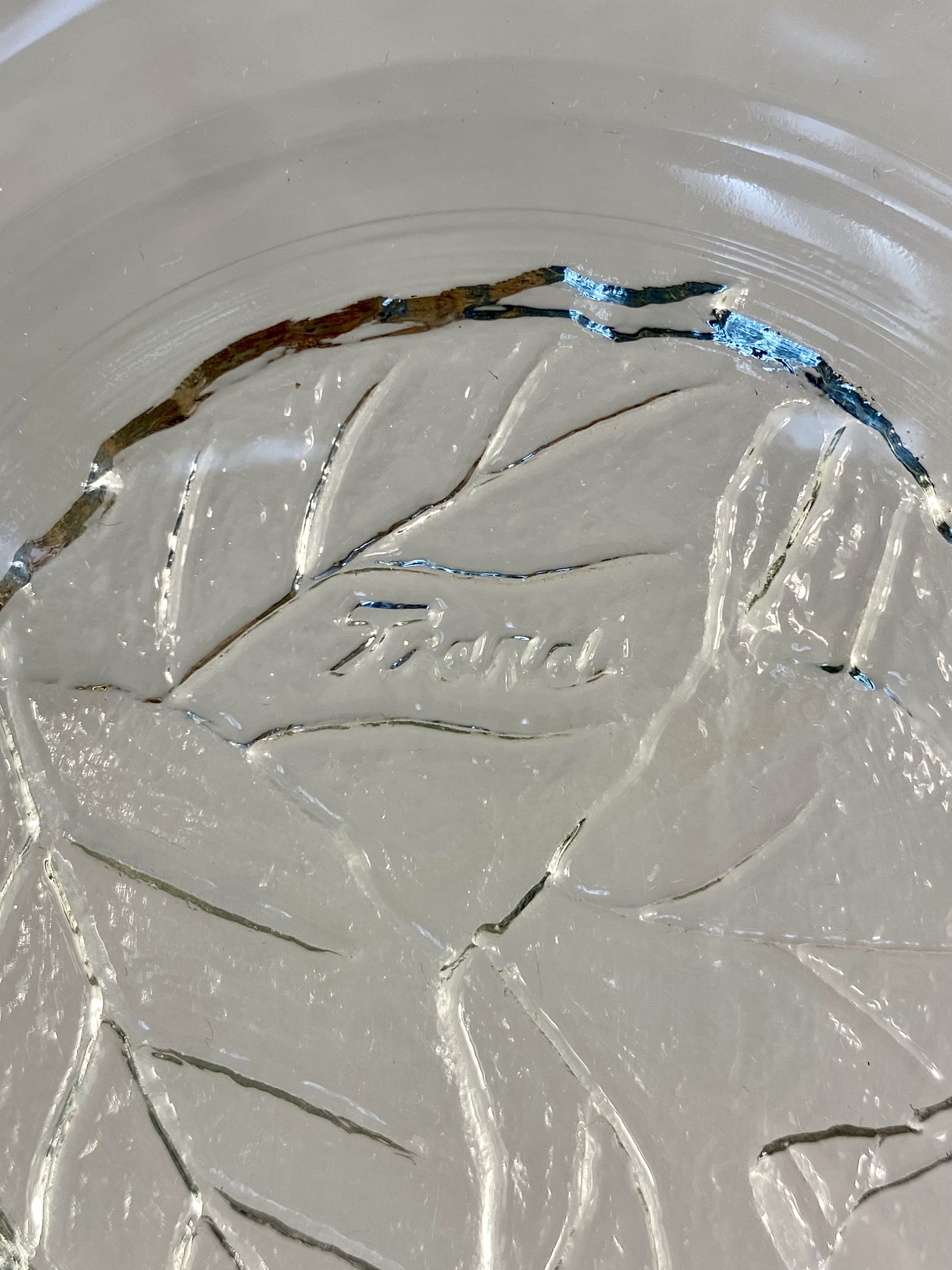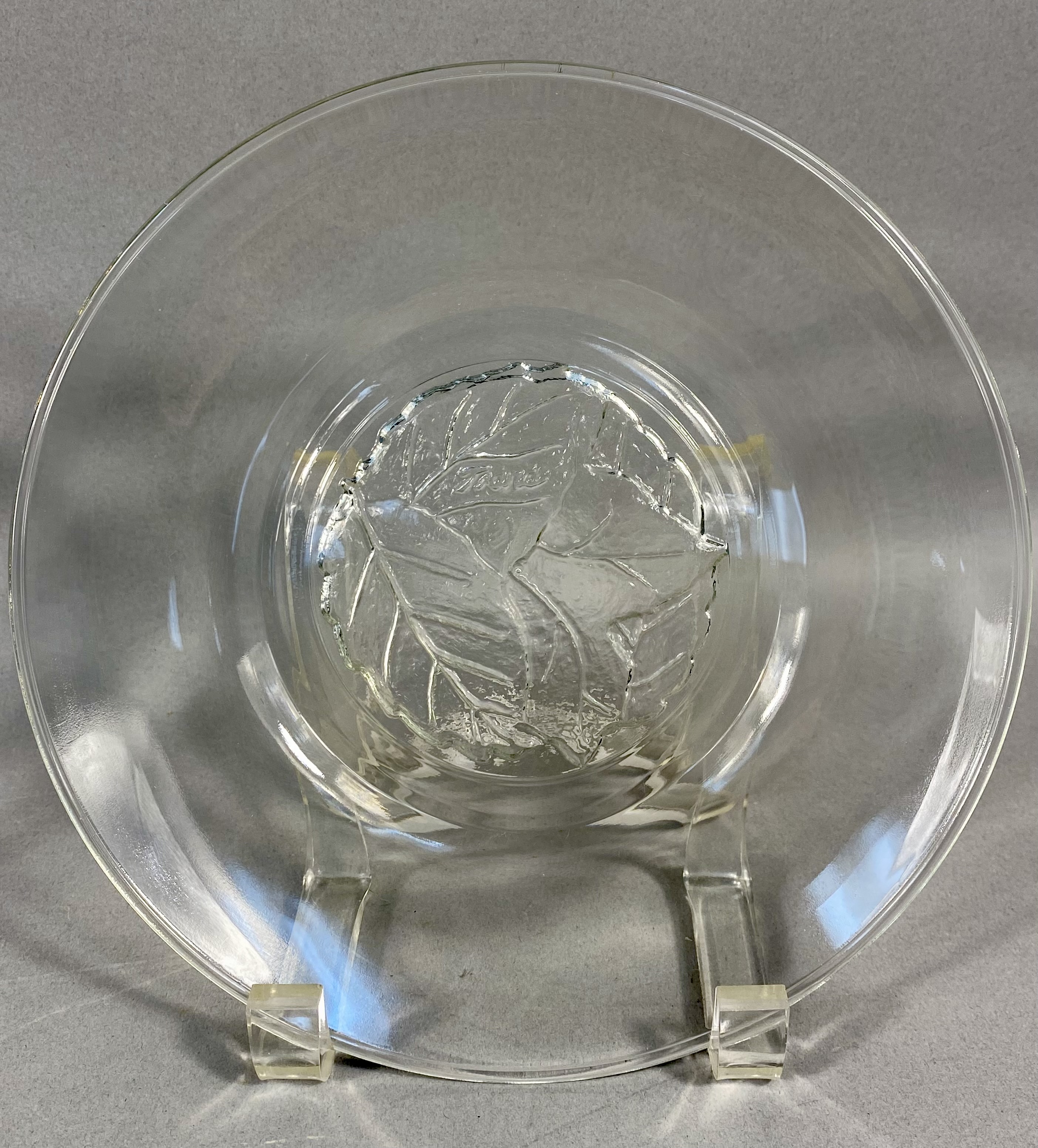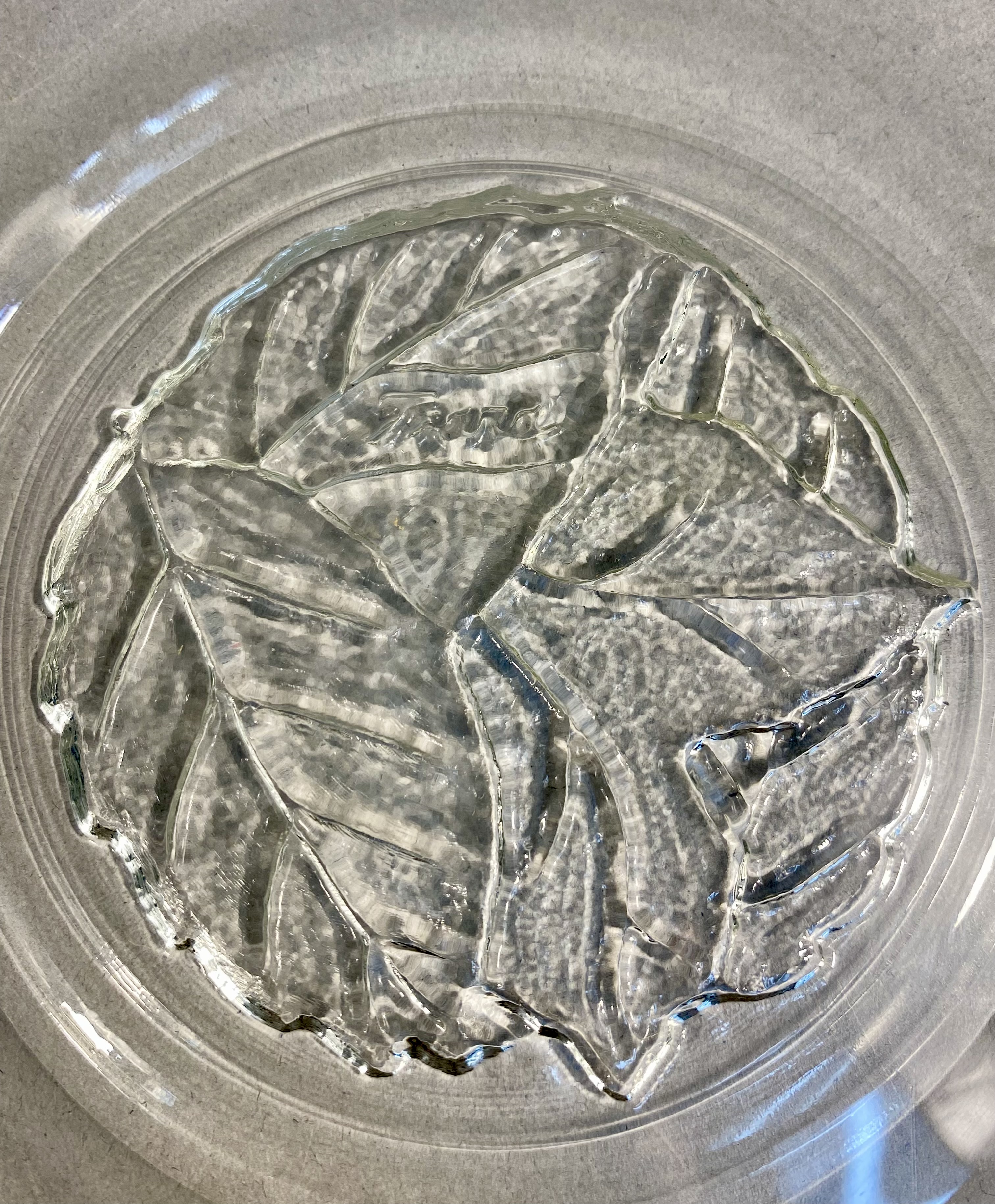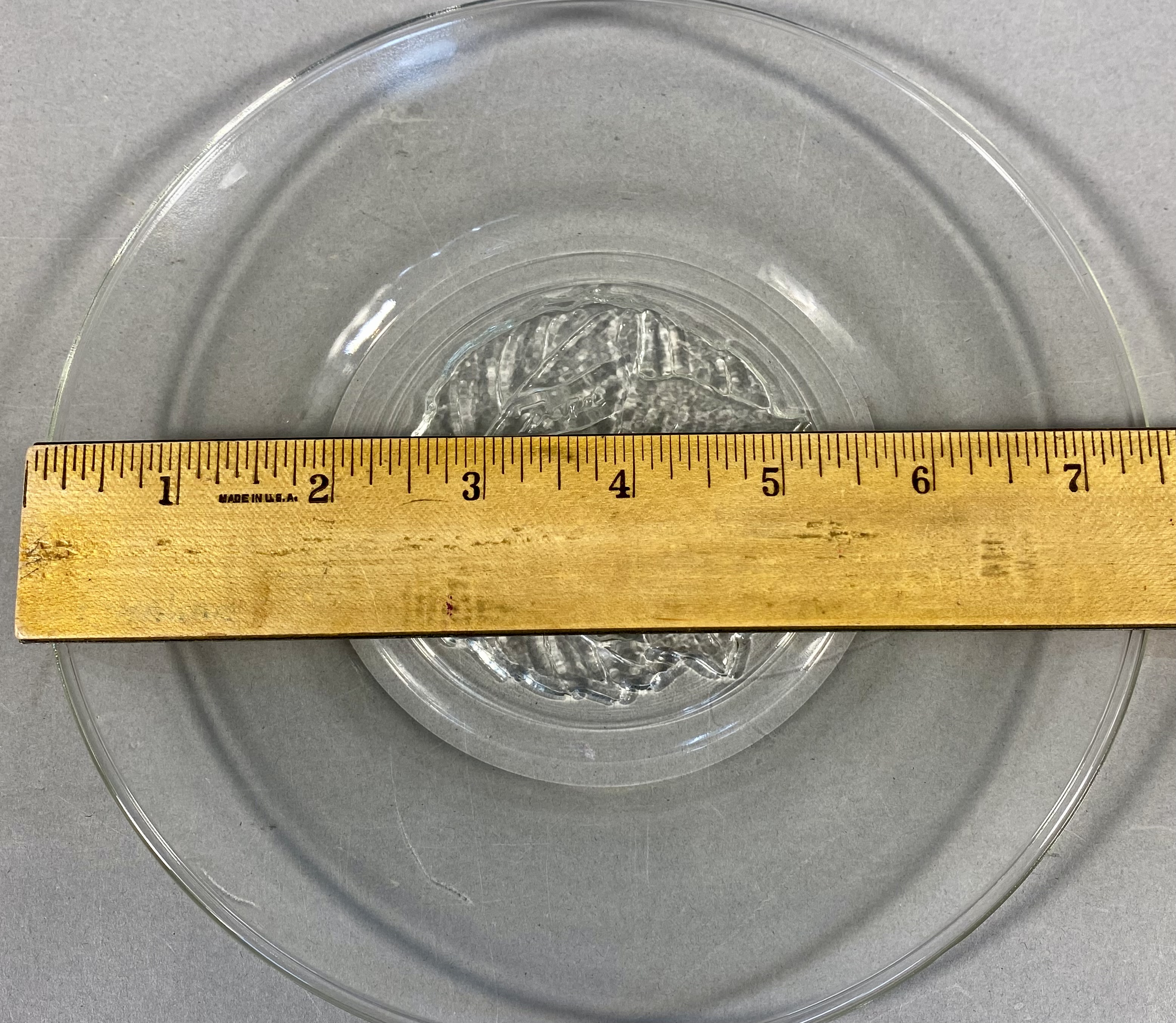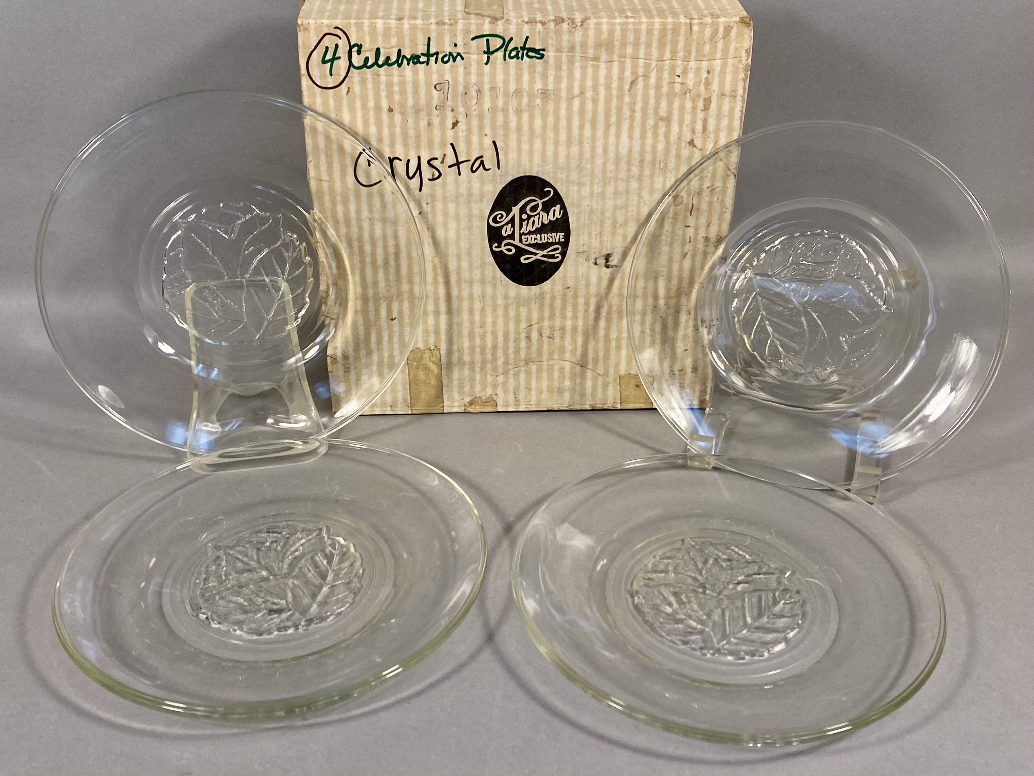 A set of four clear pressed glass plates in the Celebration pattern, distributed by Tiara Exclusives. Each plate features a wide, plain rim and a recessed central medallion decorated with a textured, embossed multi-leaf motif. The material is clear pressed glass, designated as crystal on the packaging. Each plate bears a small embossed script mark reading Tiara within the central leaf design. The items are housed in the original corrugated cardboard box, which displays a black oval logo for a Tiara EXCLUSIVE and handwritten notations. Tiara Exclusives was a home-party plan company based in Dunkirk, Indiana, that operated between the 1970s and 1990s, with production handled by the Indiana Glass Company. Diameter: 8 inches. The plates are in good vintage condition with no visible chips, cracks, or significant scratching. The original box shows significant shelf wear, including surface staining, edge wear, and handwritten ink markings.
