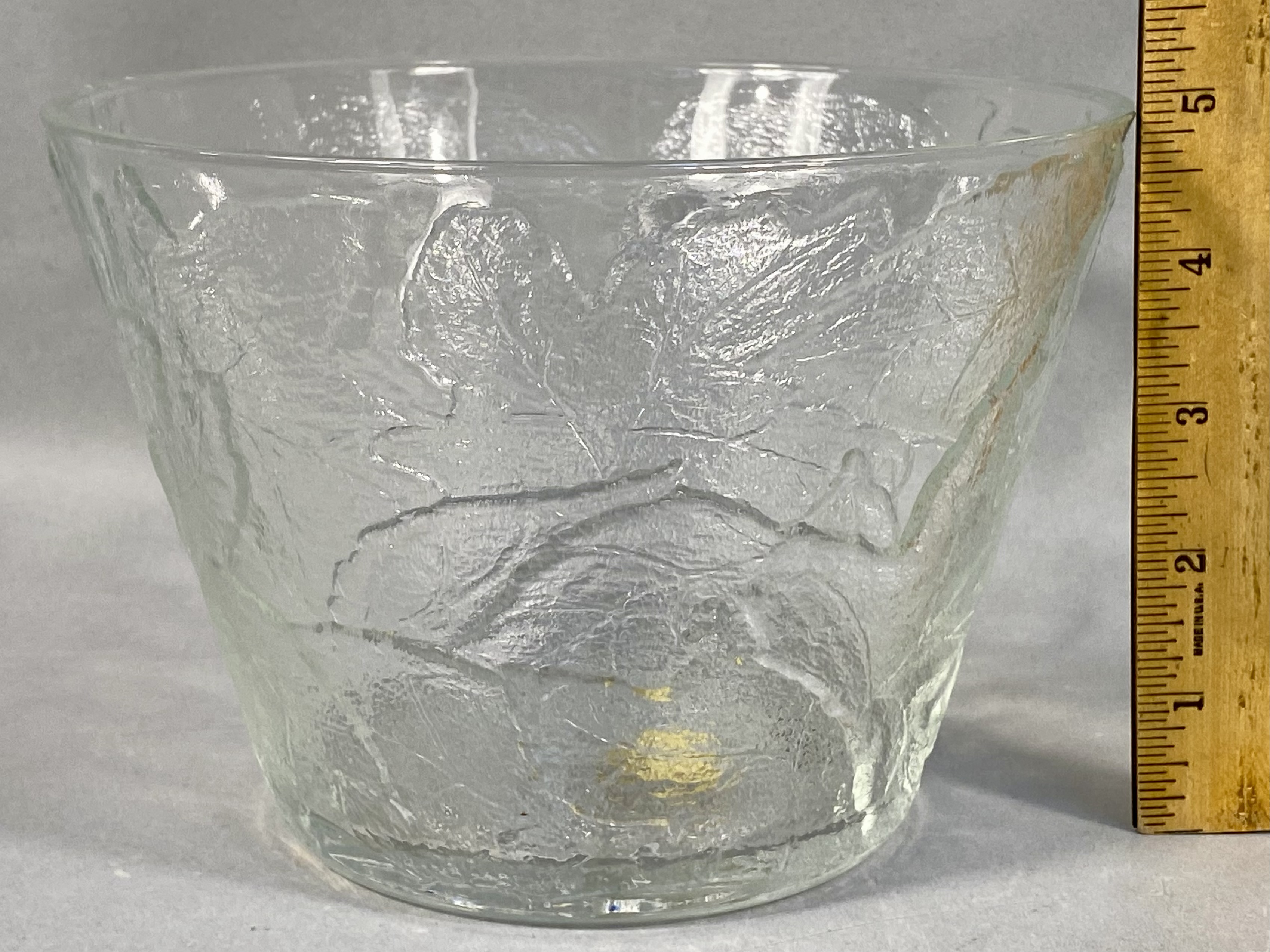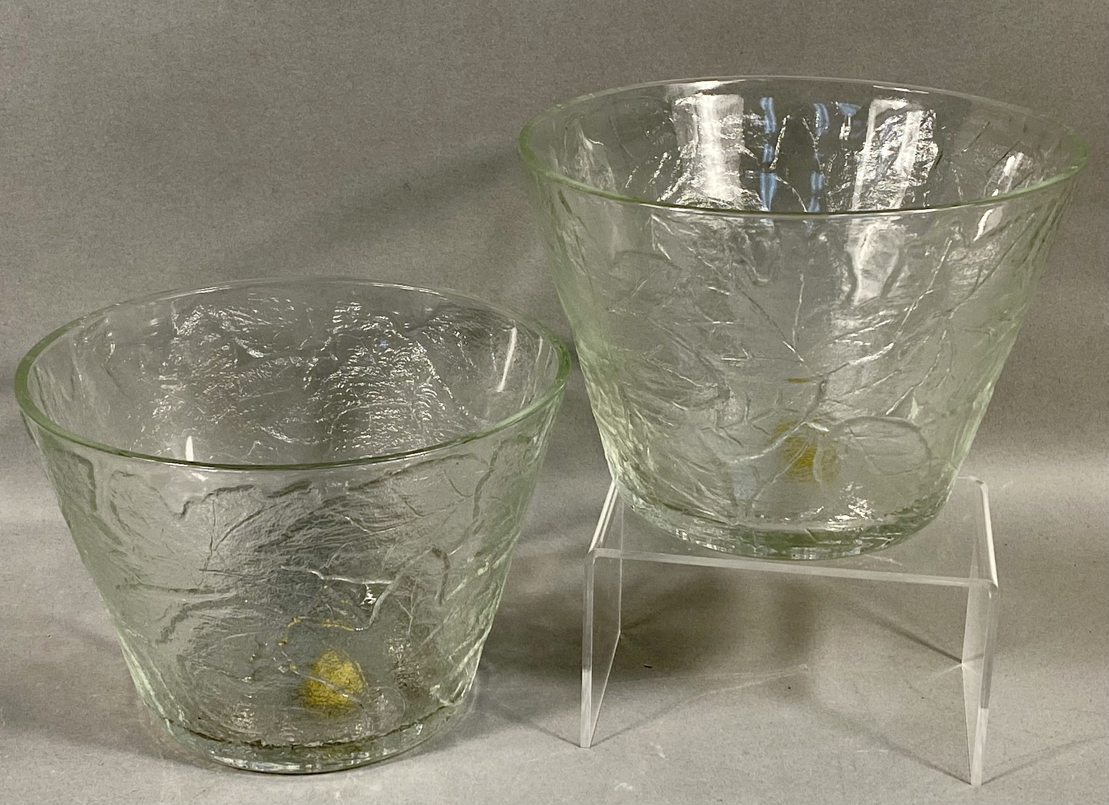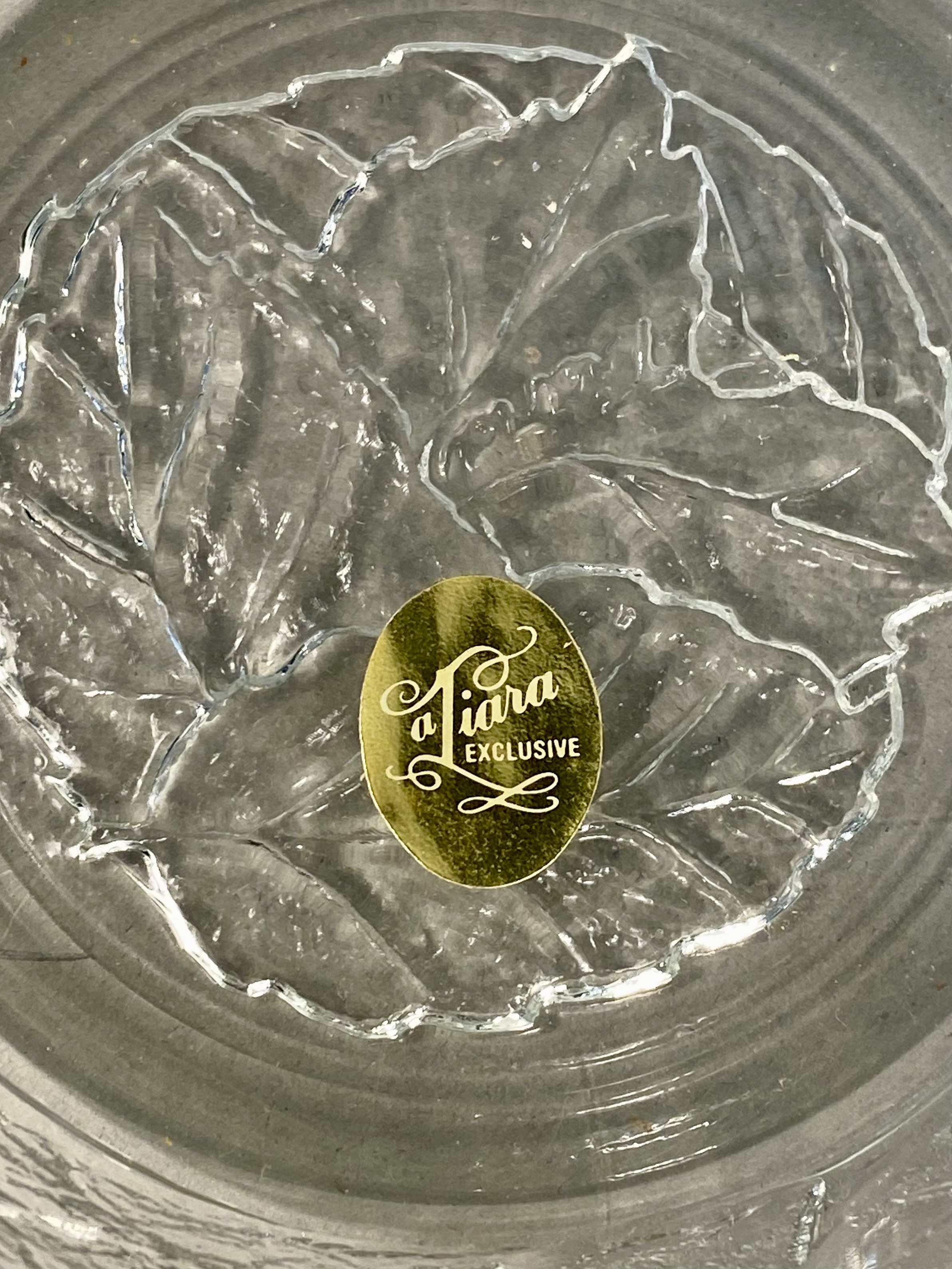 This pair of matching bowls was produced for Tiara Exclusives, an American distributor active between 1970 and 1998. The pieces are constructed of clear pressed glass in the Chestnut Leaf pattern. The exterior of each bowl features an overall embossed foliage design with prominent raised veins set against a textured, frosted-style background intended to resemble natural bark or stone. The forms are round and tapered with flat bases. Each bowl is marked on the interior base with a raised cursive script reading Tiara. One bowl retains its original gold oval foil manufacturer label which reads a Tiara EXCLUSIVE. Measurements: Height: 4.5 inches Diameter: 6.5 inches. The items are in good vintage condition. No chips, cracks, or significant surface wear are visible upon inspection. One bowl retains its original foil retail label.