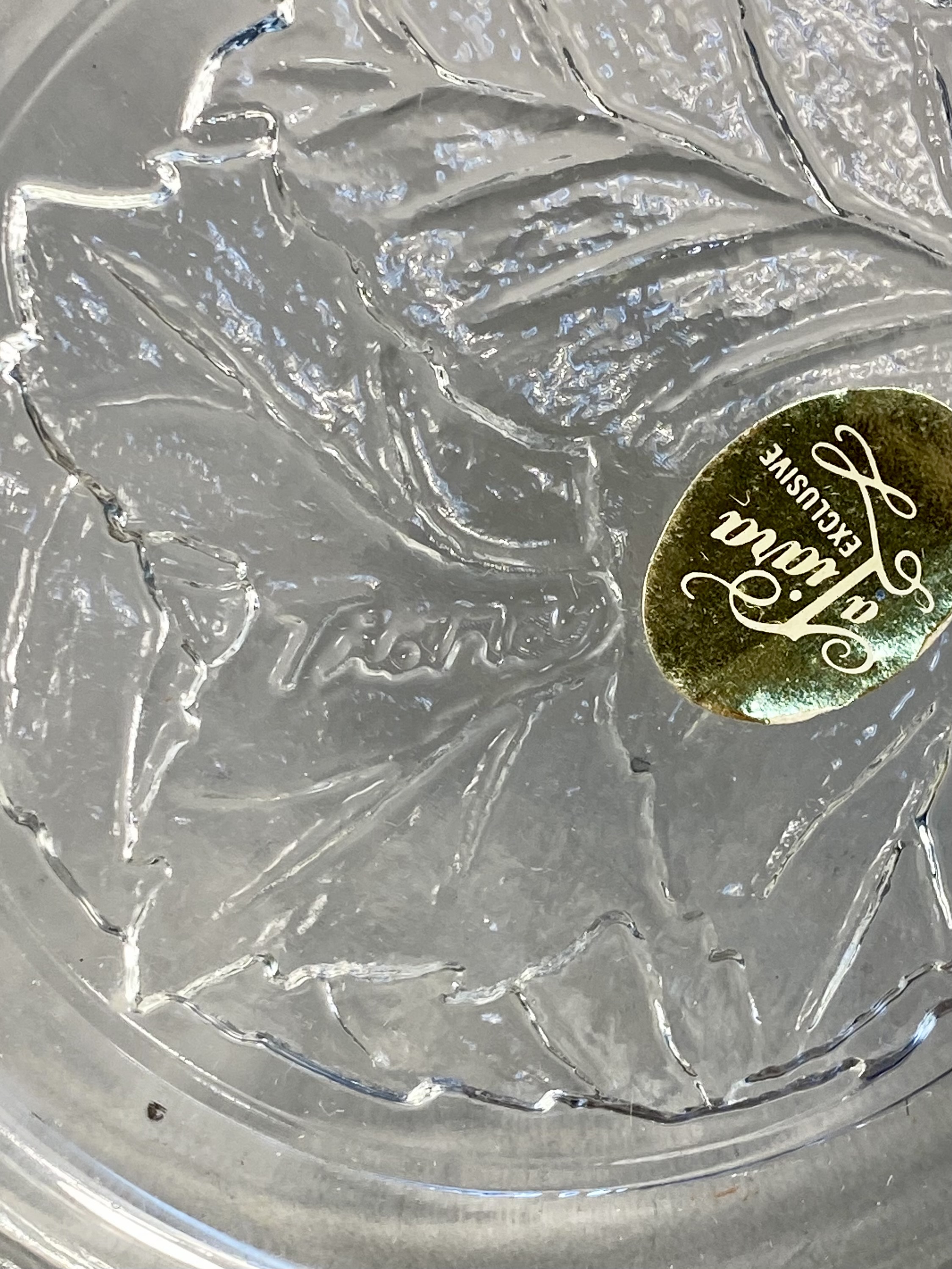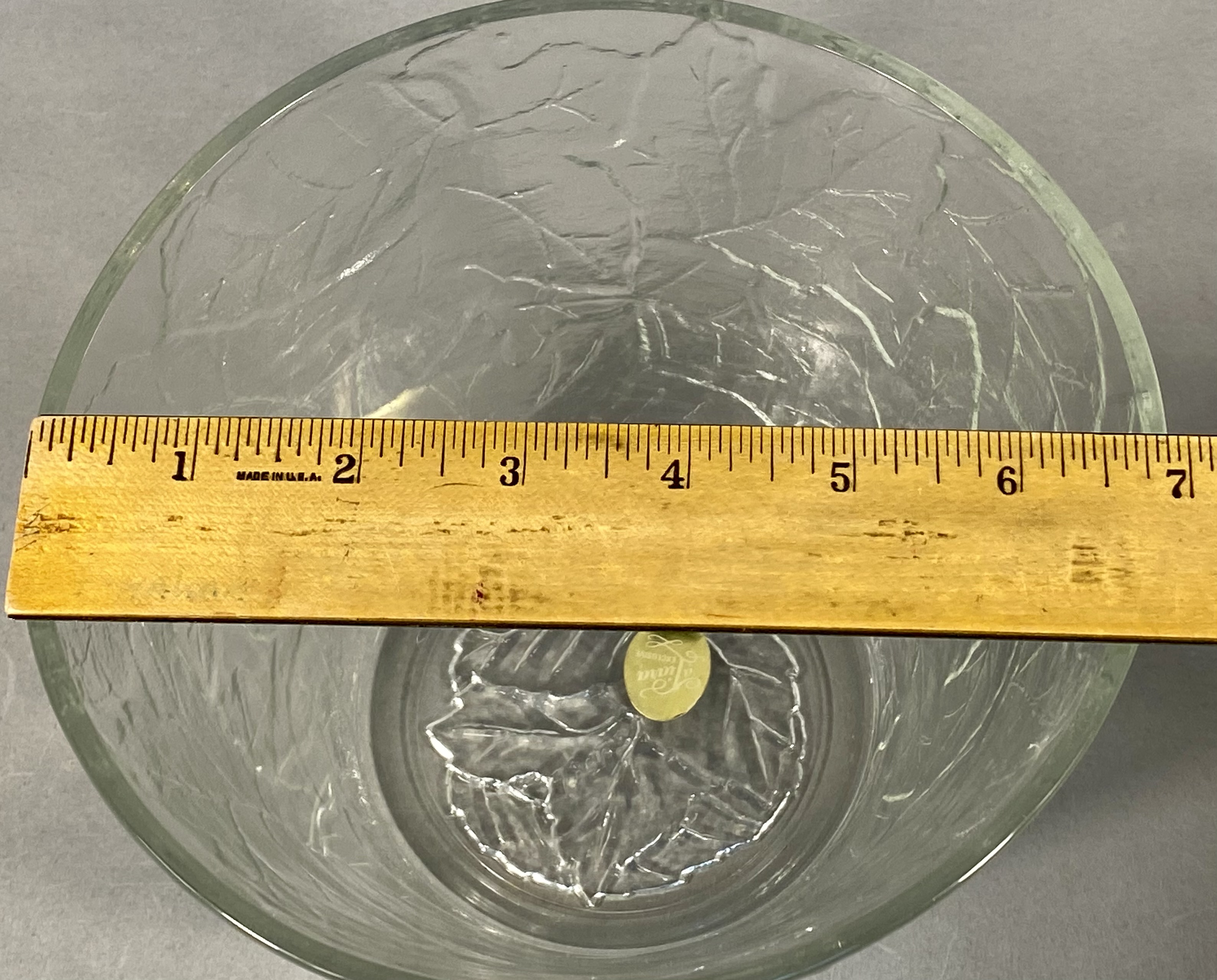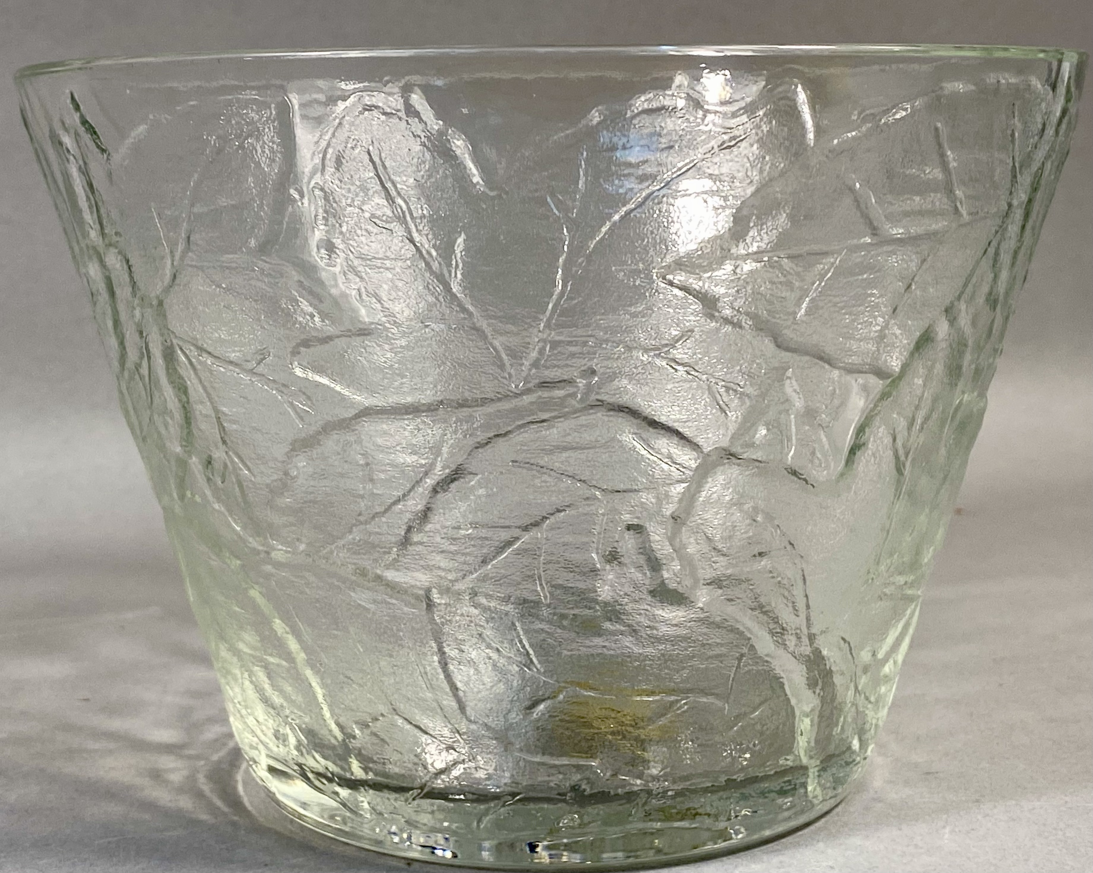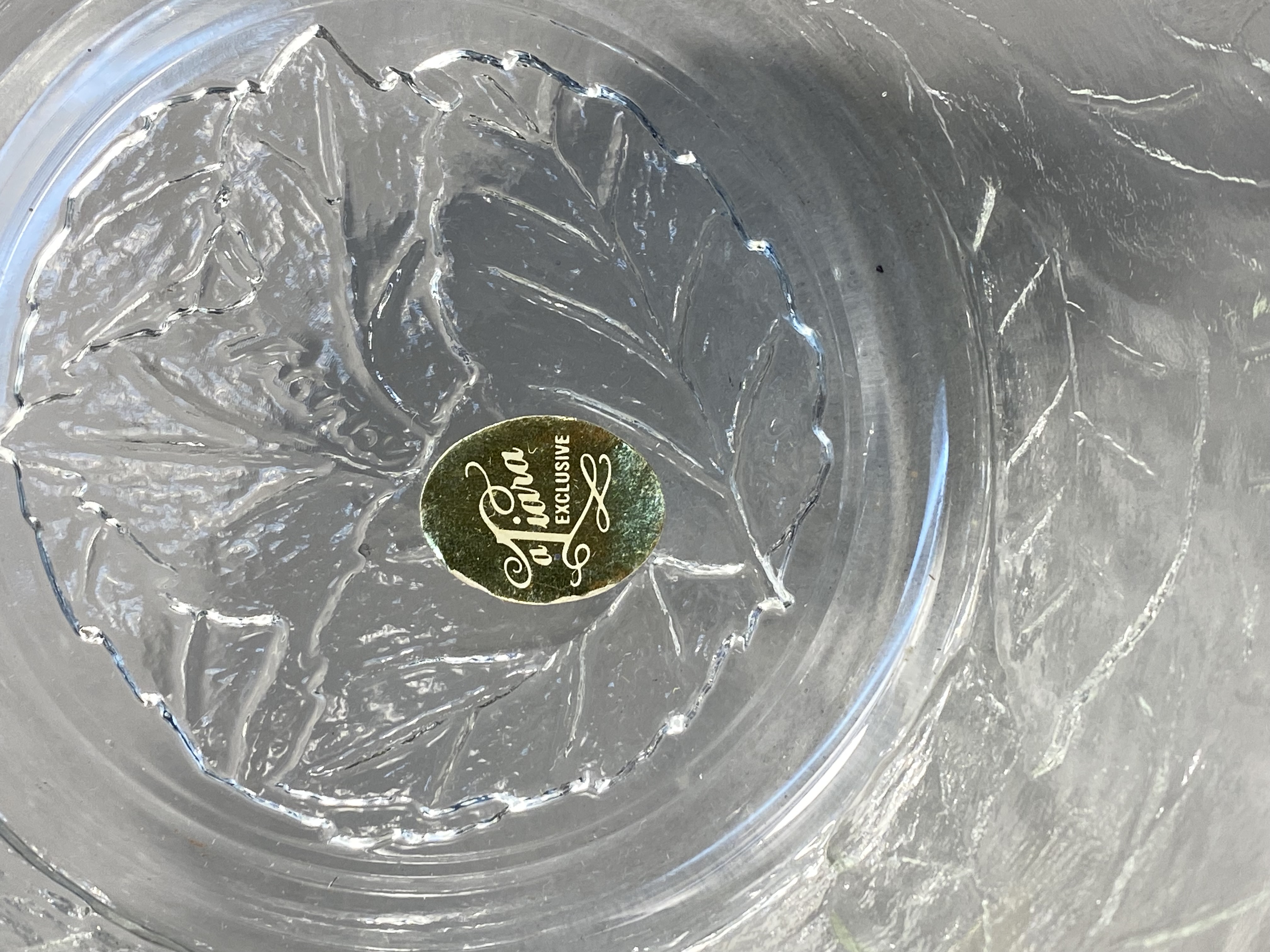 This pair of matching bowls was produced for Tiara Exclusives, an American distributor active between 1970 and 1998. The pieces are constructed of clear pressed glass in the Chestnut Leaf pattern. The exterior of each bowl features an overall embossed foliage design with prominent raised veins set against a textured, frosted-style background intended to resemble natural bark or stone. The forms are round and tapered with flat bases. Each bowl is marked on the interior base with a raised cursive script reading Tiara. One bowl retains its original gold oval foil manufacturer label which reads a Tiara EXCLUSIVE. Measurements: Height: 4.5 inches Diameter: 6.5 inches. The items are in good vintage condition. No chips, cracks, or significant surface wear are visible upon inspection. One bowl retains its original foil retail label.