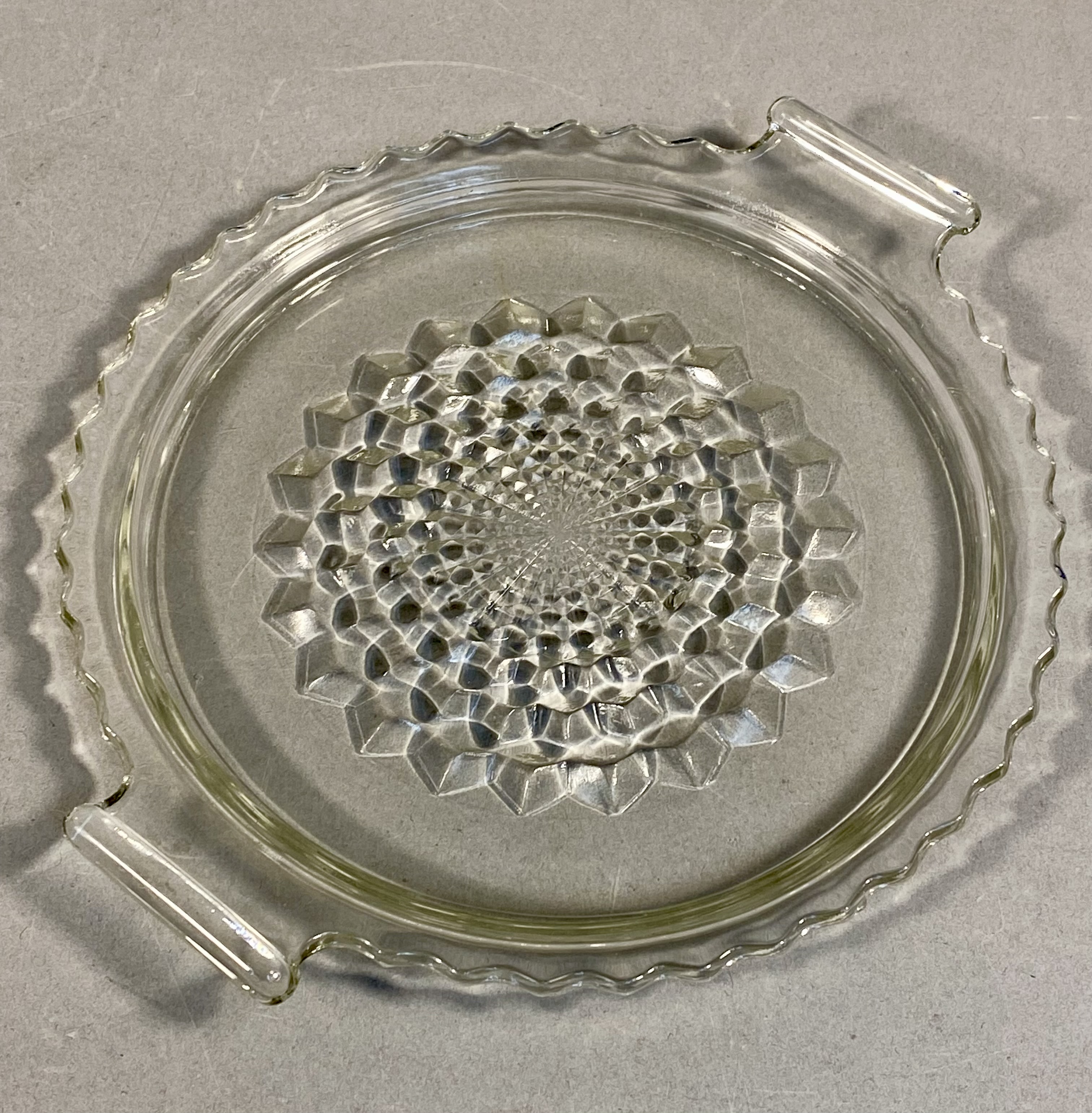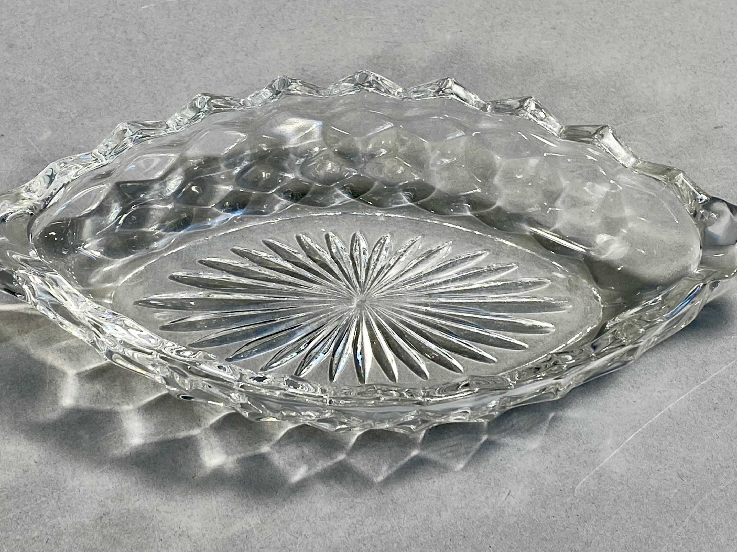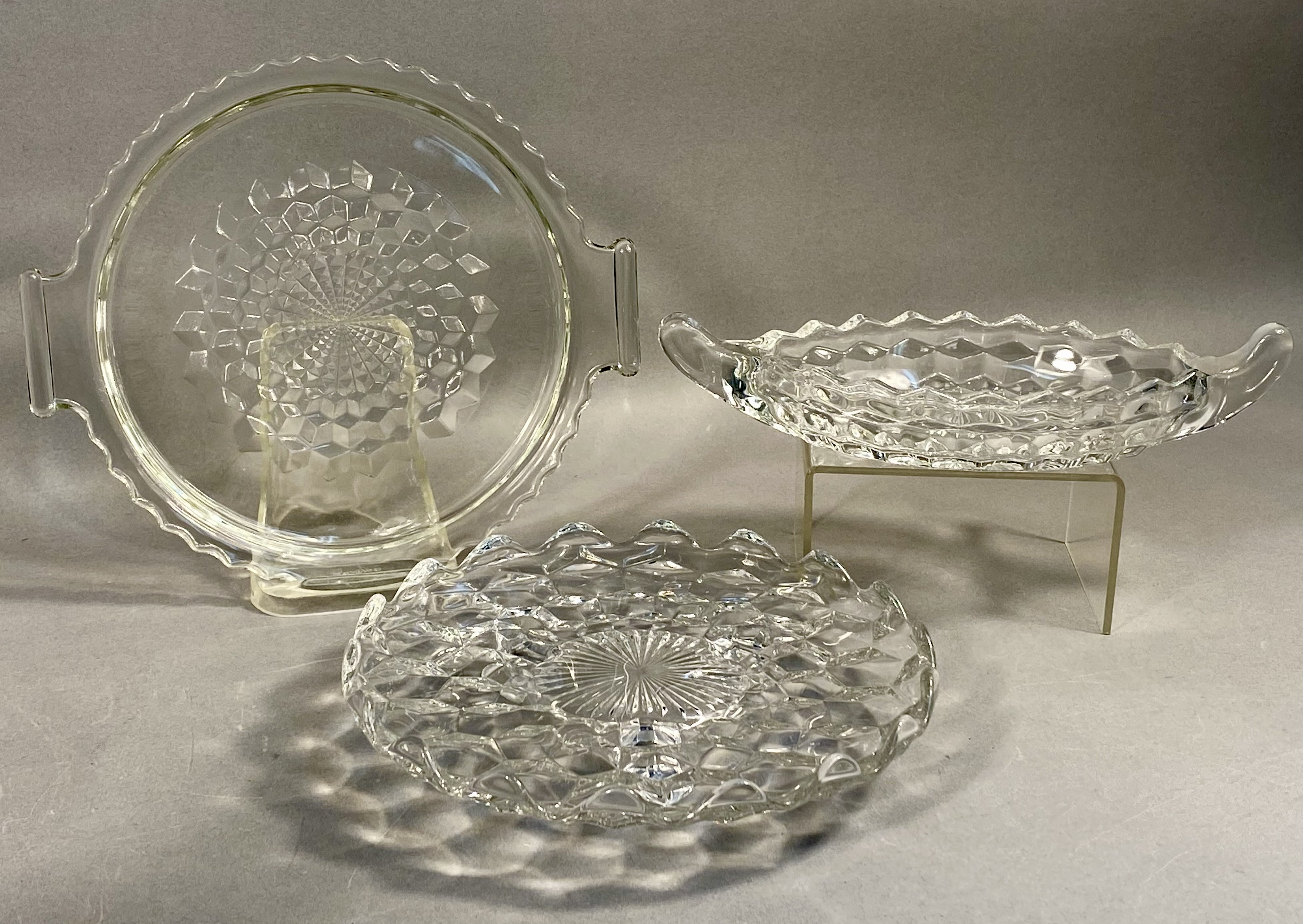 This collection consists of three pieces of clear pressed glass in the American pattern, Line 2056, produced by the Fostoria Glass Company. The set includes a circular handled serving tray, a shallow footed bowl, and an oval handled dish. Each piece is made of heavy, thick-walled soda-lime glass featuring a repeating cubist geometric pattern of multi-faceted diamonds. The circular tray is designed with two integral tab handles and a scalloped rim with a central radiating diamond design. The shallow bowl, often referred to as a lily pond bowl, rests on three molded feet and features a central sunburst motif and a toothed rim. The oval dish, or nappy, features two swept-up handles and an elongated sunburst center. No maker marks are present on the glass. Handled Tray: 8.5 inches diameter Footed Bowl: 7 inches diameter Oval Dish: 8.5 inches length. The items are in good condition with bright clarity and no signs of dishwasher clouding. Minor surface scratches are visible upon close inspection. Small nicks or flea bites are present along the sharp points of the molded diamond pattern and the toothed rims, consistent with age and handling.