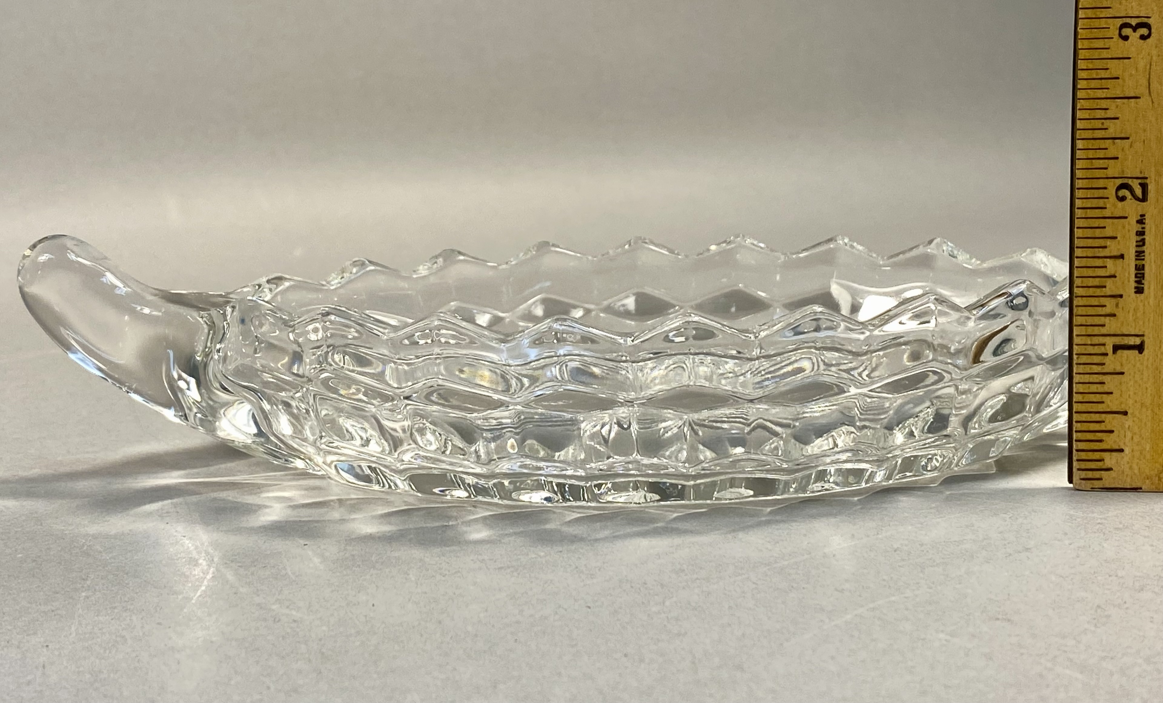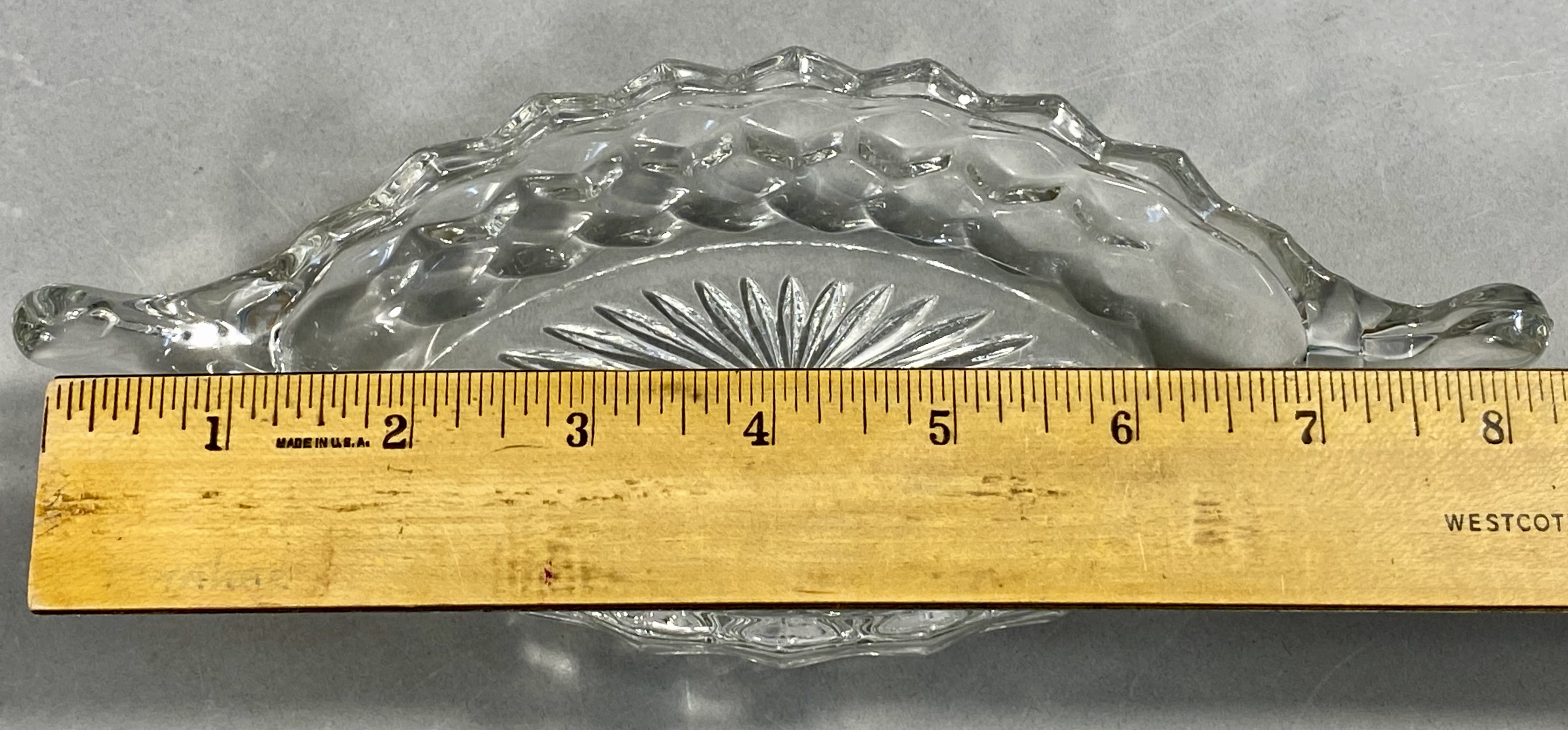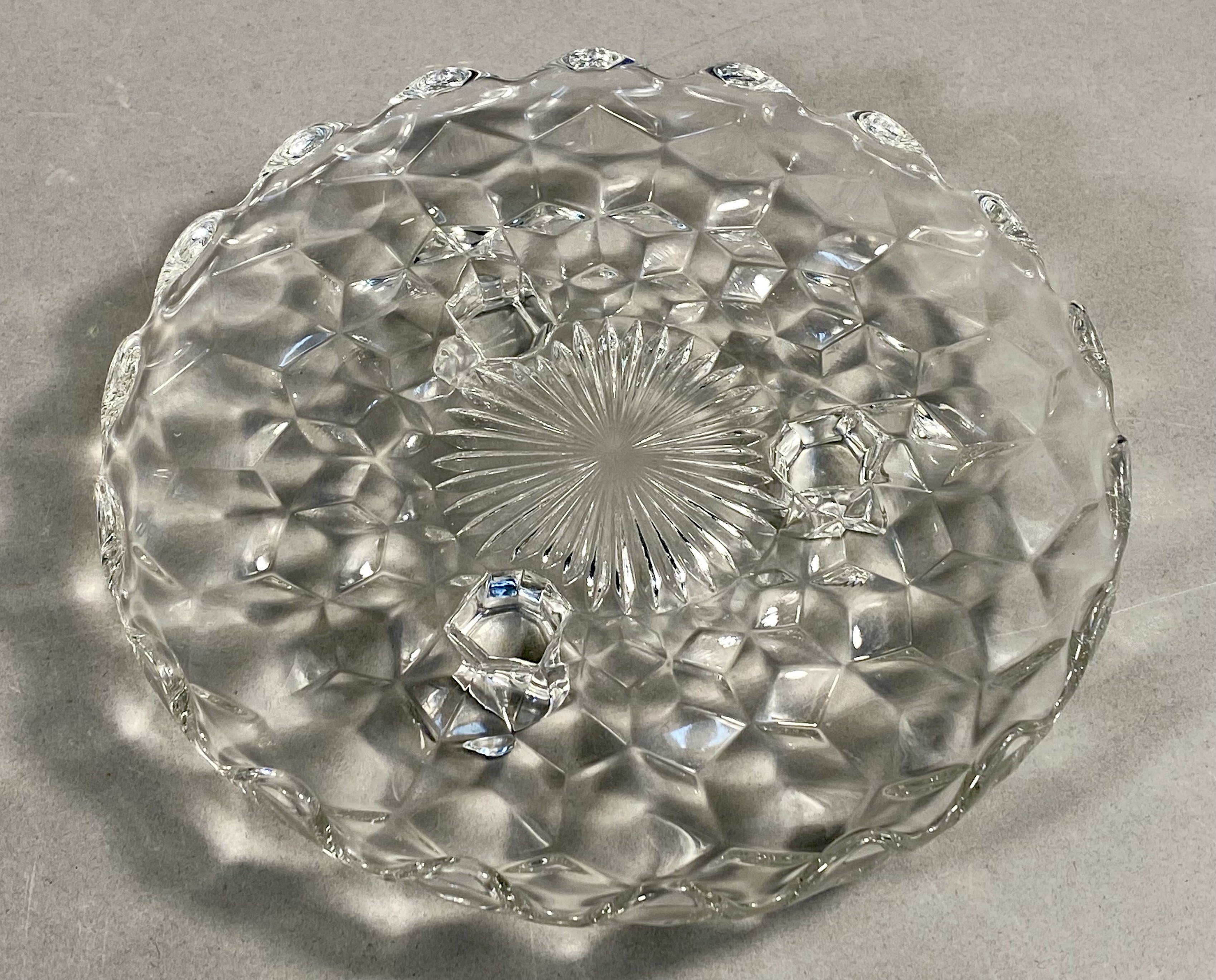 This collection consists of three pieces of clear pressed glass in the American pattern, Line 2056, produced by the Fostoria Glass Company. The set includes a circular handled serving tray, a shallow footed bowl, and an oval handled dish. Each piece is made of heavy, thick-walled soda-lime glass featuring a repeating cubist geometric pattern of multi-faceted diamonds. The circular tray is designed with two integral tab handles and a scalloped rim with a central radiating diamond design. The shallow bowl, often referred to as a lily pond bowl, rests on three molded feet and features a central sunburst motif and a toothed rim. The oval dish, or nappy, features two swept-up handles and an elongated sunburst center. No maker marks are present on the glass. Handled Tray: 8.5 inches diameter Footed Bowl: 7 inches diameter Oval Dish: 8.5 inches length. The items are in good condition with bright clarity and no signs of dishwasher clouding. Minor surface scratches are visible upon close inspection. Small nicks or flea bites are present along the sharp points of the molded diamond pattern and the toothed rims, consistent with age and handling.