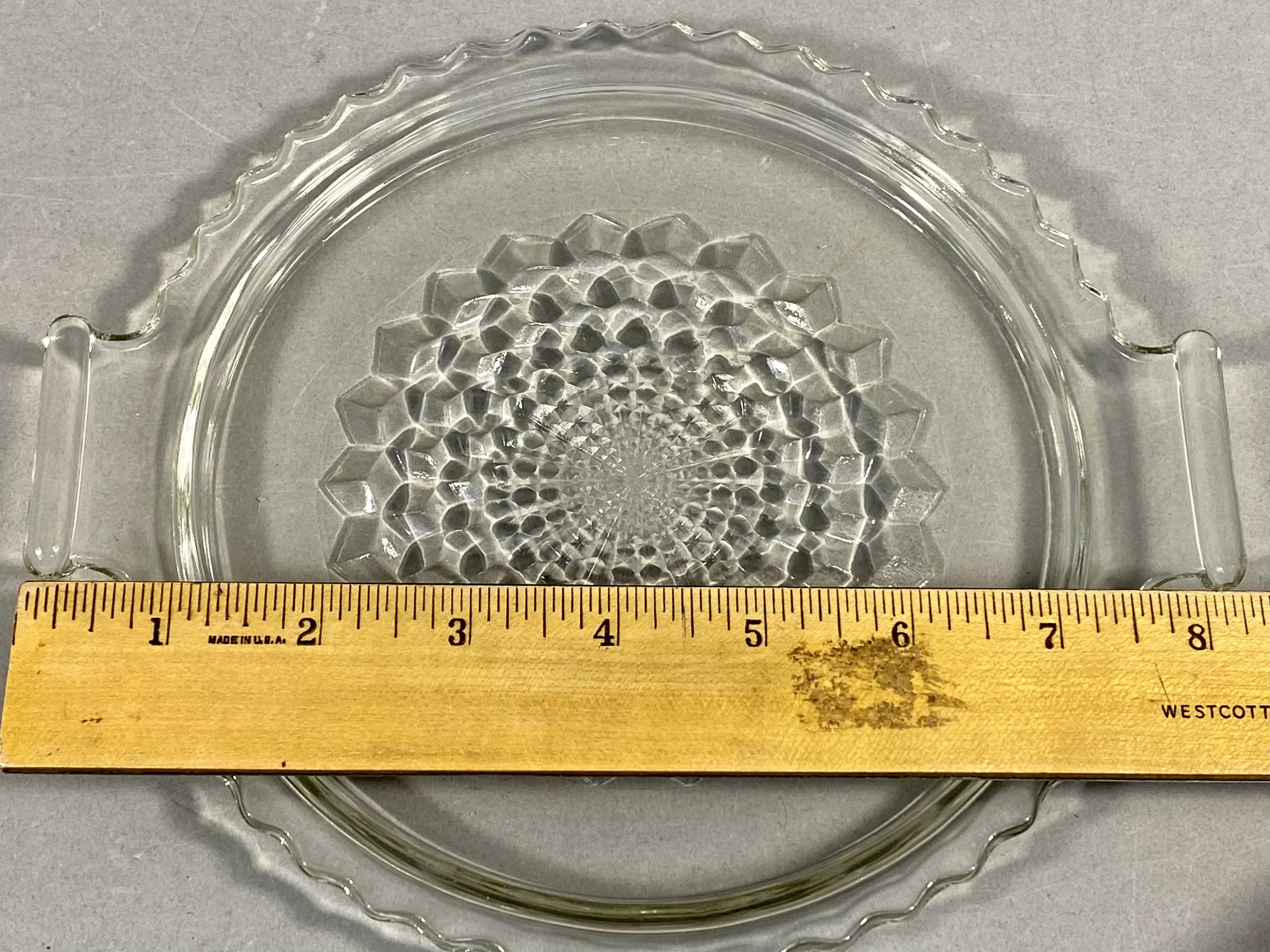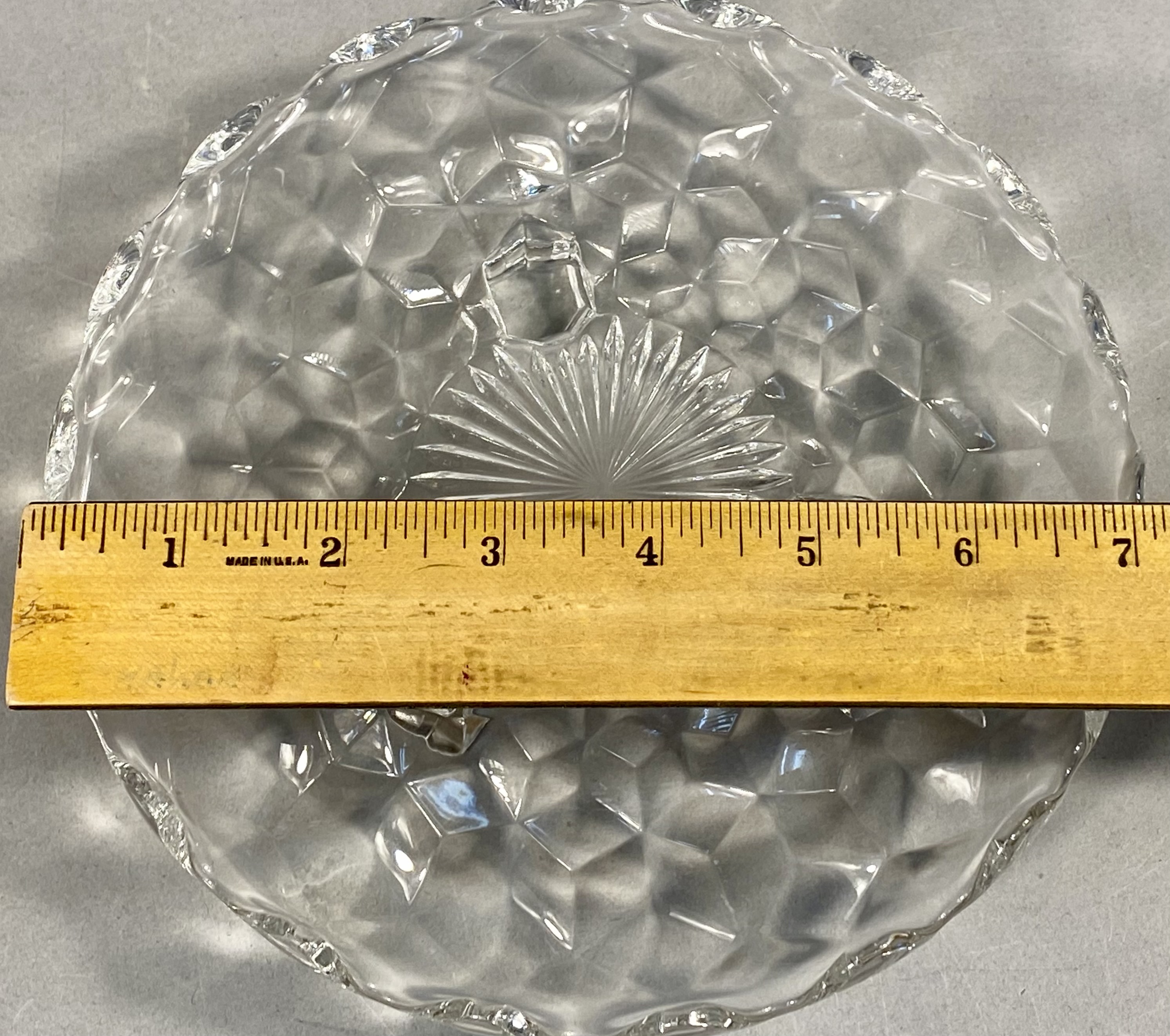 The items are in good condition with bright clarity and no signs of dishwasher clouding. Minor surface scratches are visible upon close inspection. Small nicks or flea bites are present along the sharp points of the molded diamond pattern and the toothed rims, consistent with age and handling.