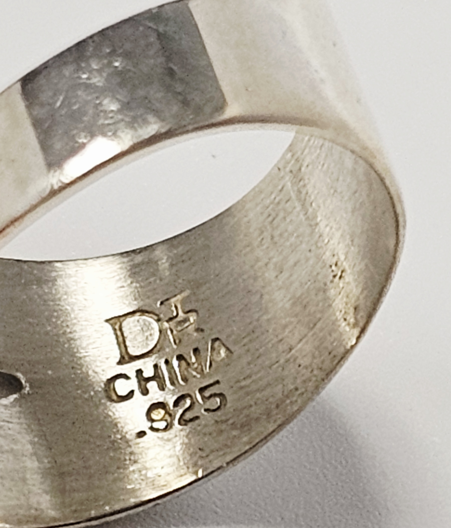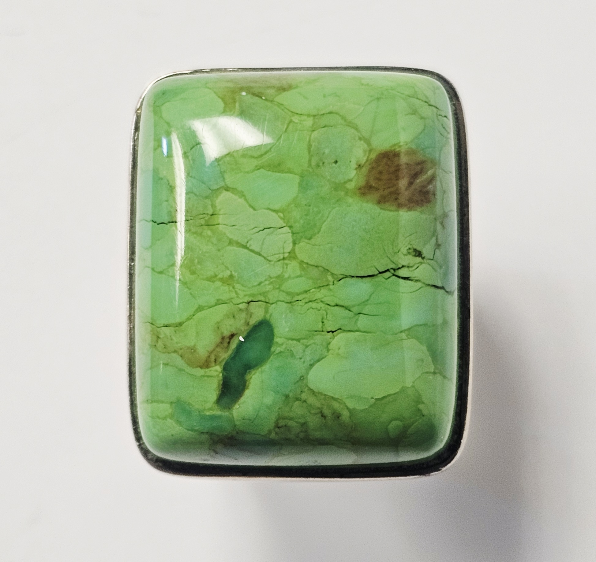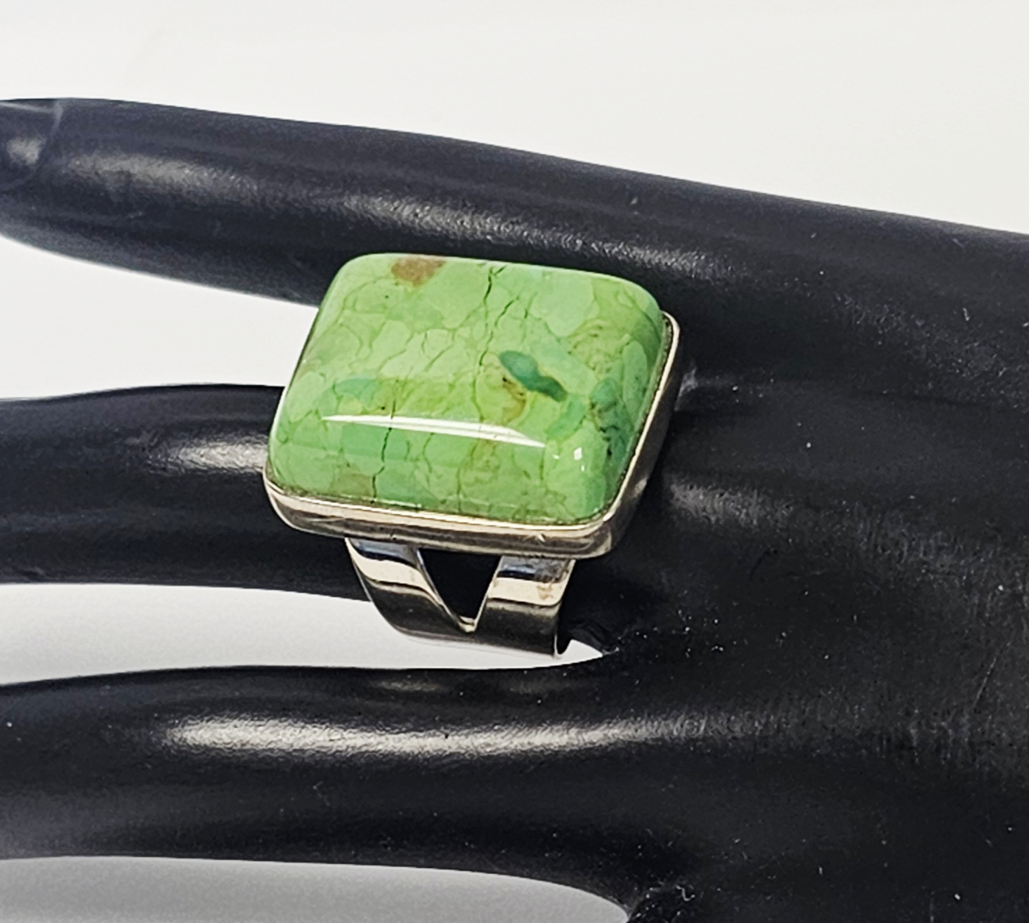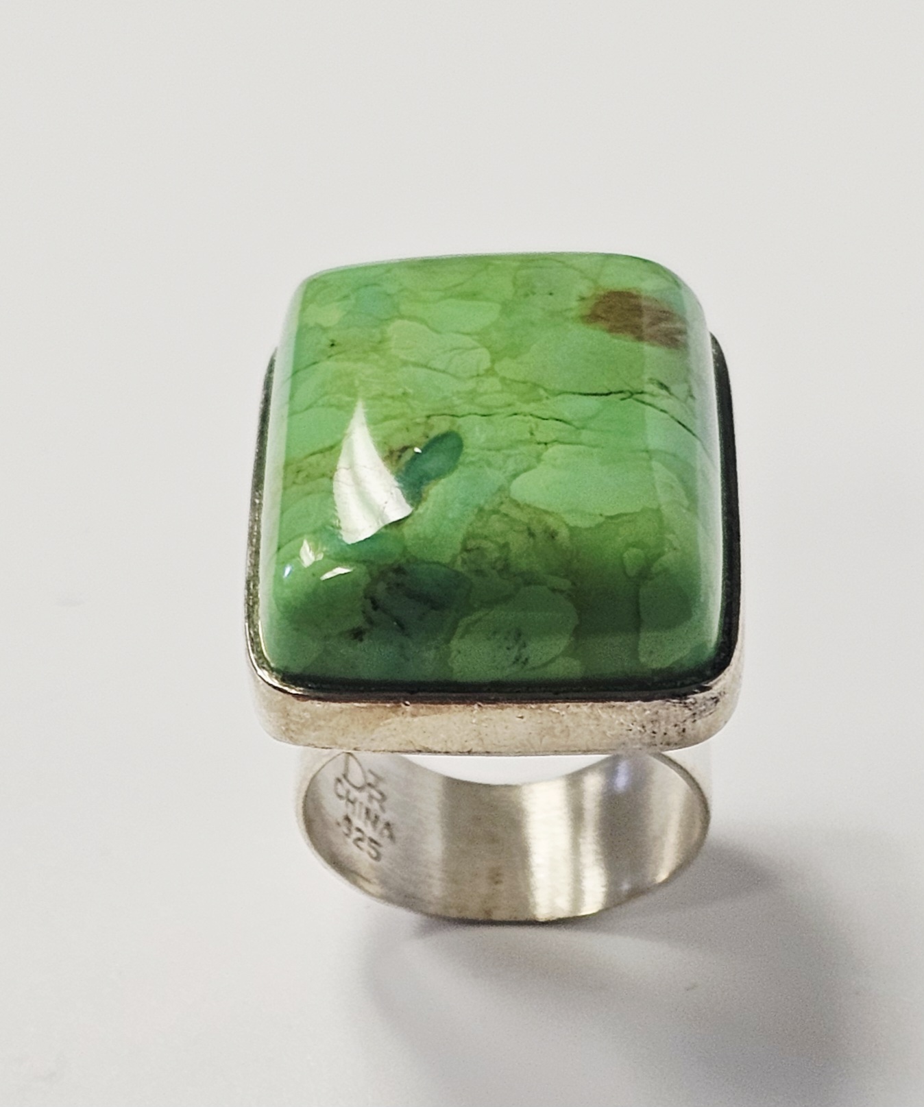 A sterling silver cocktail ring featuring a large rectangular cabochon-cut stone. The stone is a variegated light green color with natural darker green and brownish-red matrix-like inclusions and visible natural fissures. The stone is secured in a bezel setting. The ring is constructed with a wide, flat shank that splits into two branches where it joins the head of the ring. The interior of the band is stamped with the maker mark DT, CHINA, and .925. Ring Size: 7.5 Weight: 18.6 grams Stone Dimensions: 25mm x 20mm. The ring is in good overall condition. The silver shows minor surface scratches and light tarnish consistent with previous use. The stone is secure in its setting and exhibits natural surface variations and internal inclusions characteristic of the material.