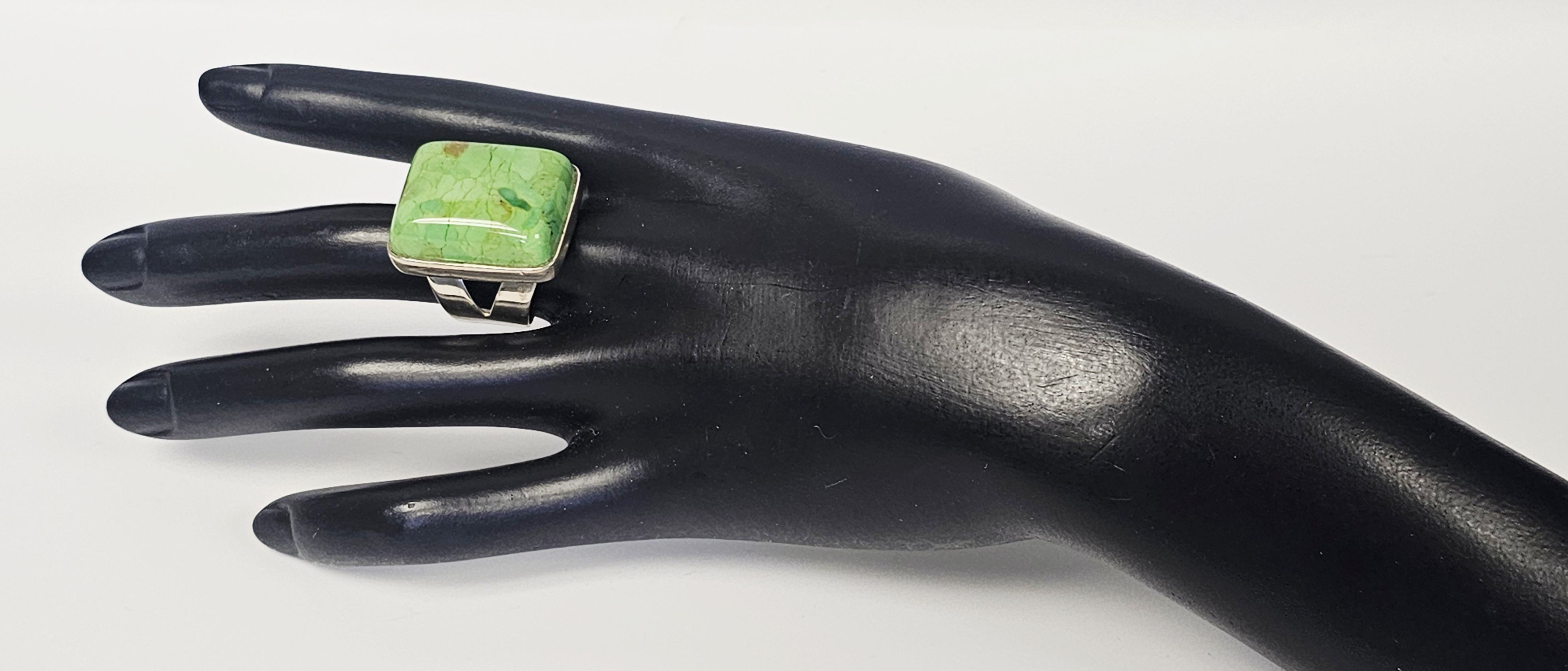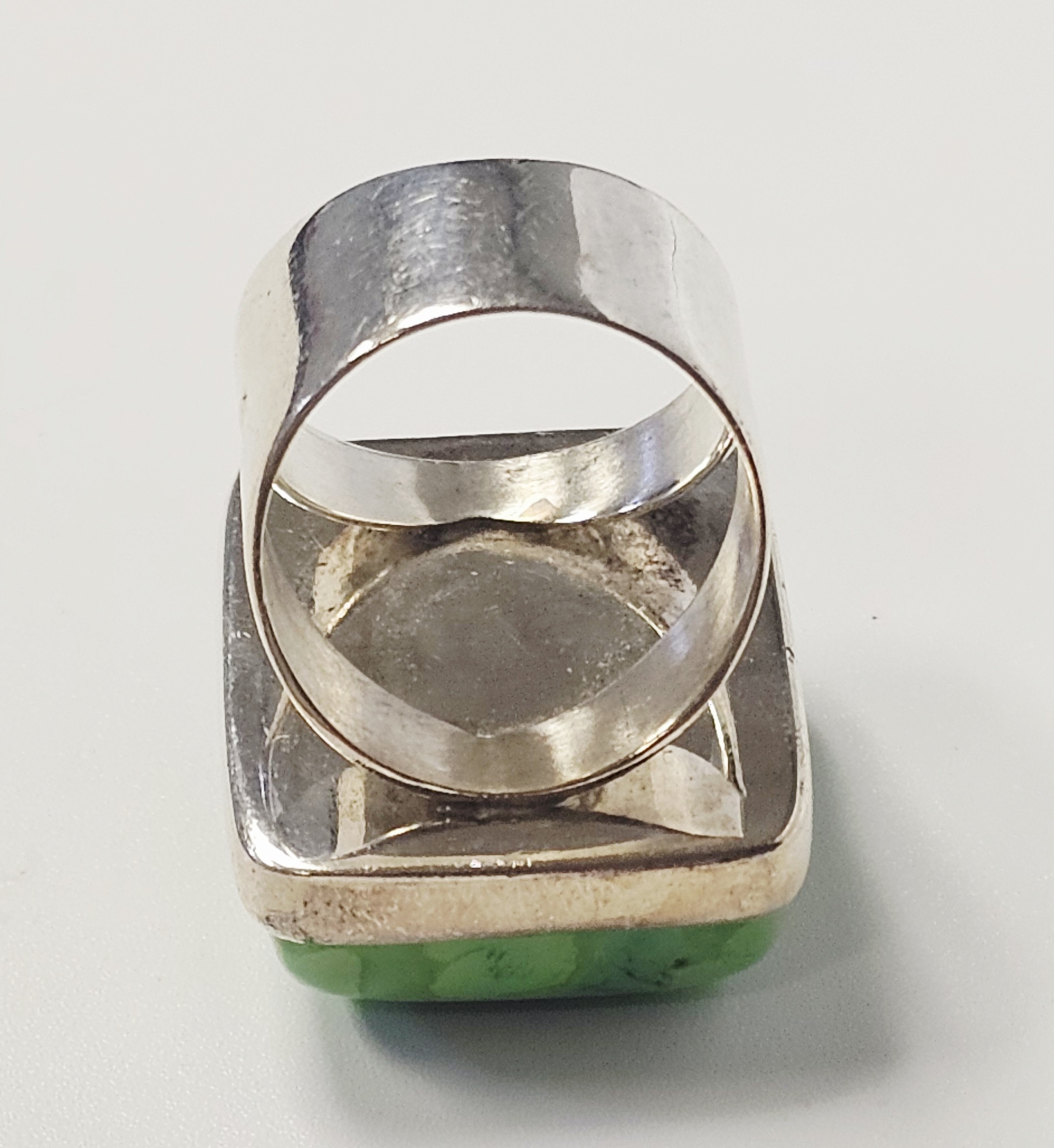 The ring is in good overall condition. The silver shows minor surface scratches and light tarnish consistent with previous use. The stone is secure in its setting and exhibits natural surface variations and internal inclusions characteristic of the material.