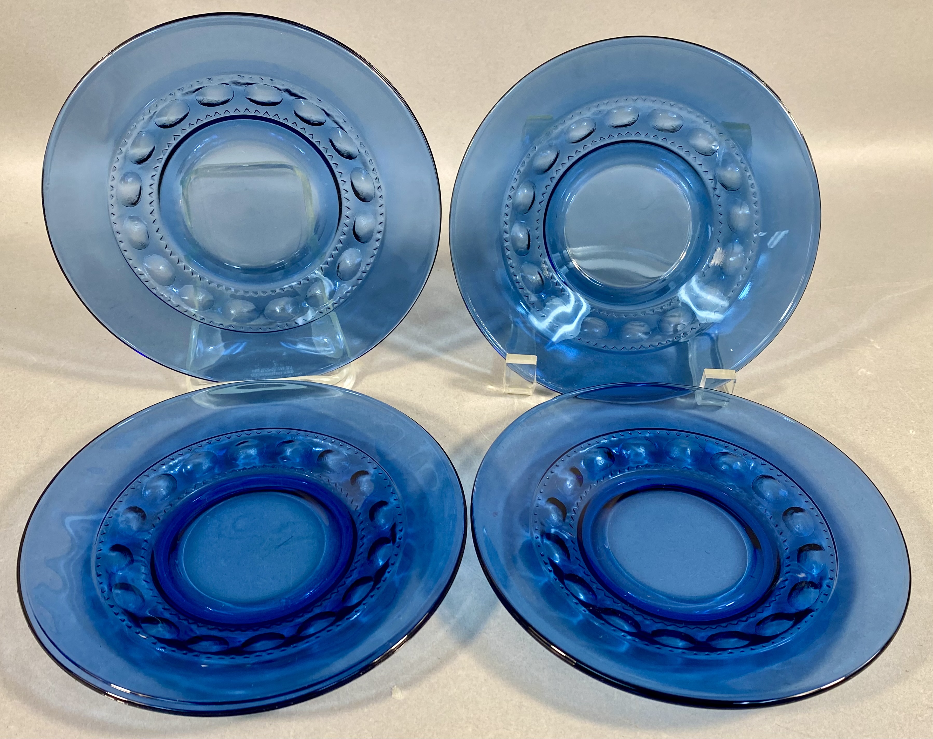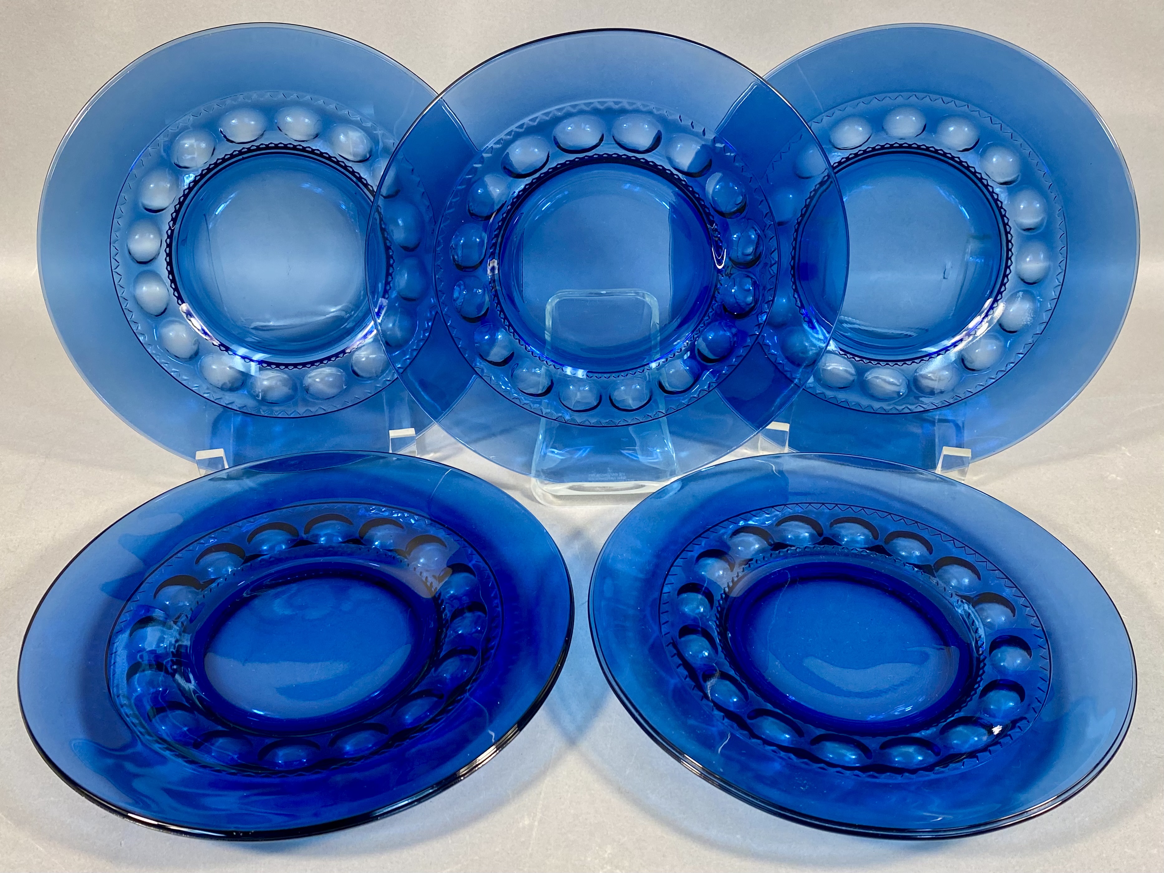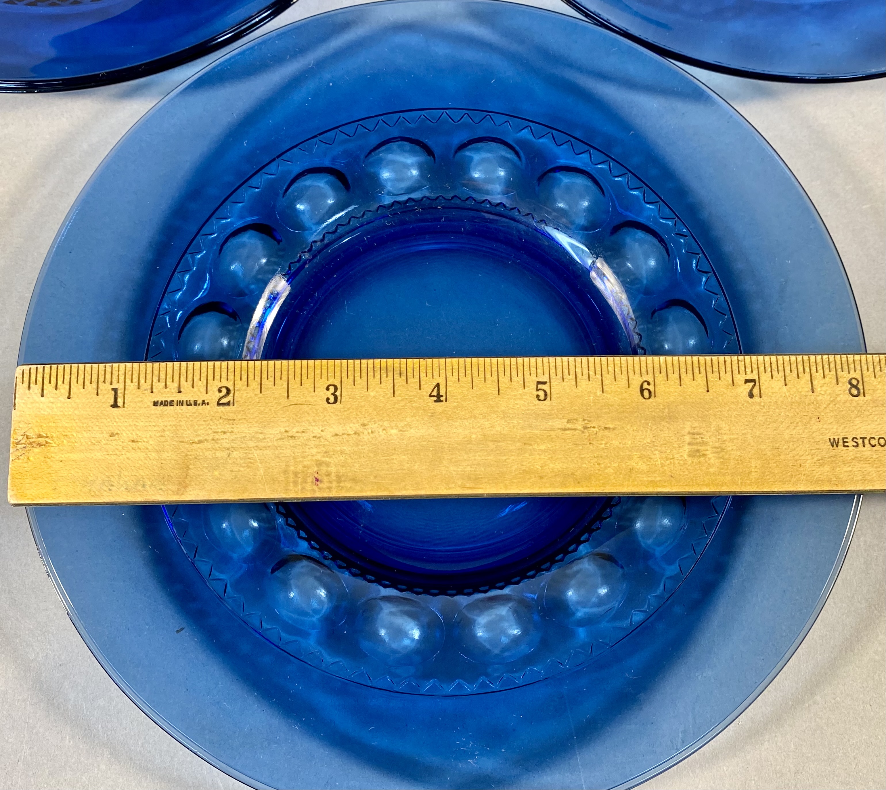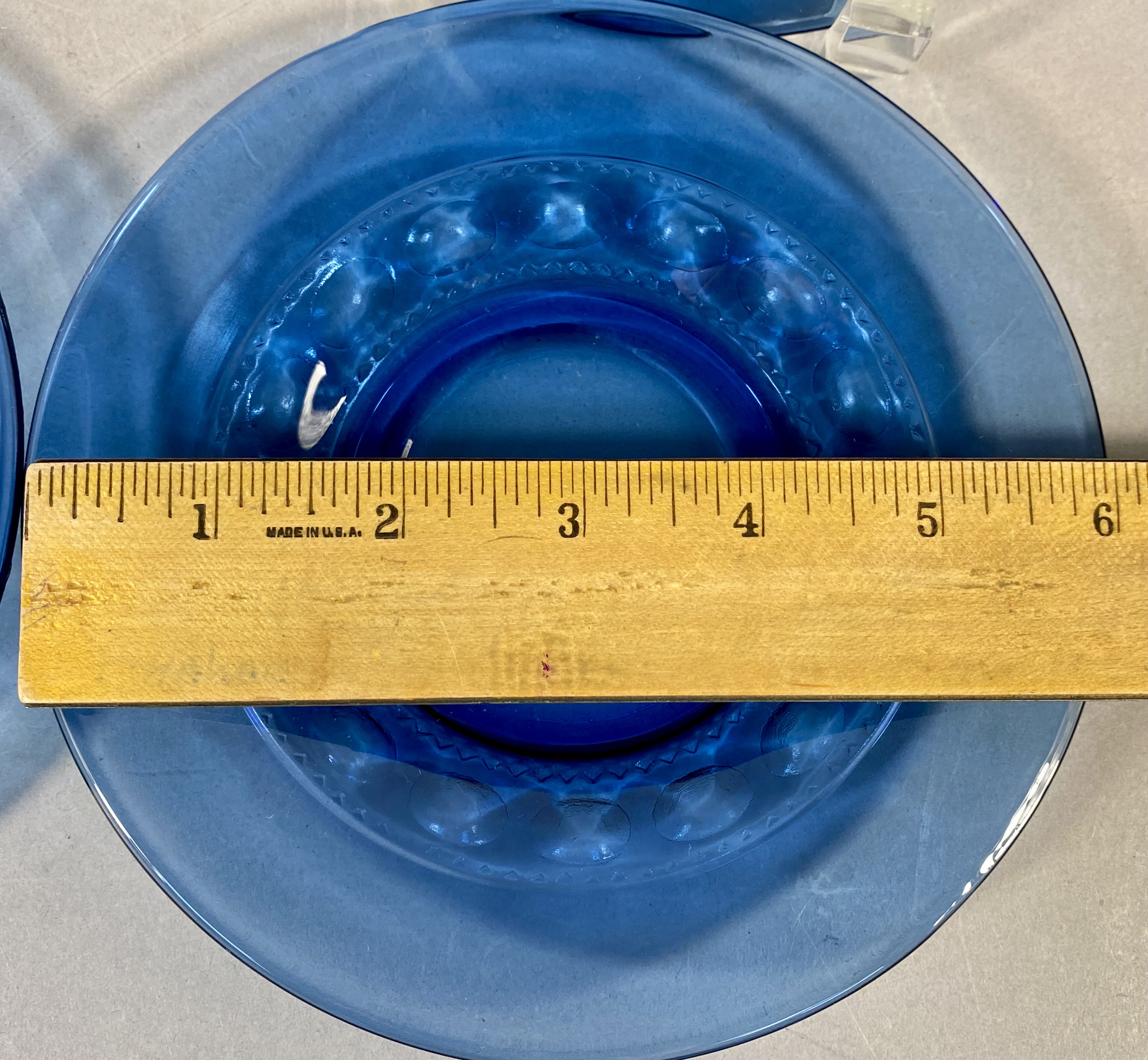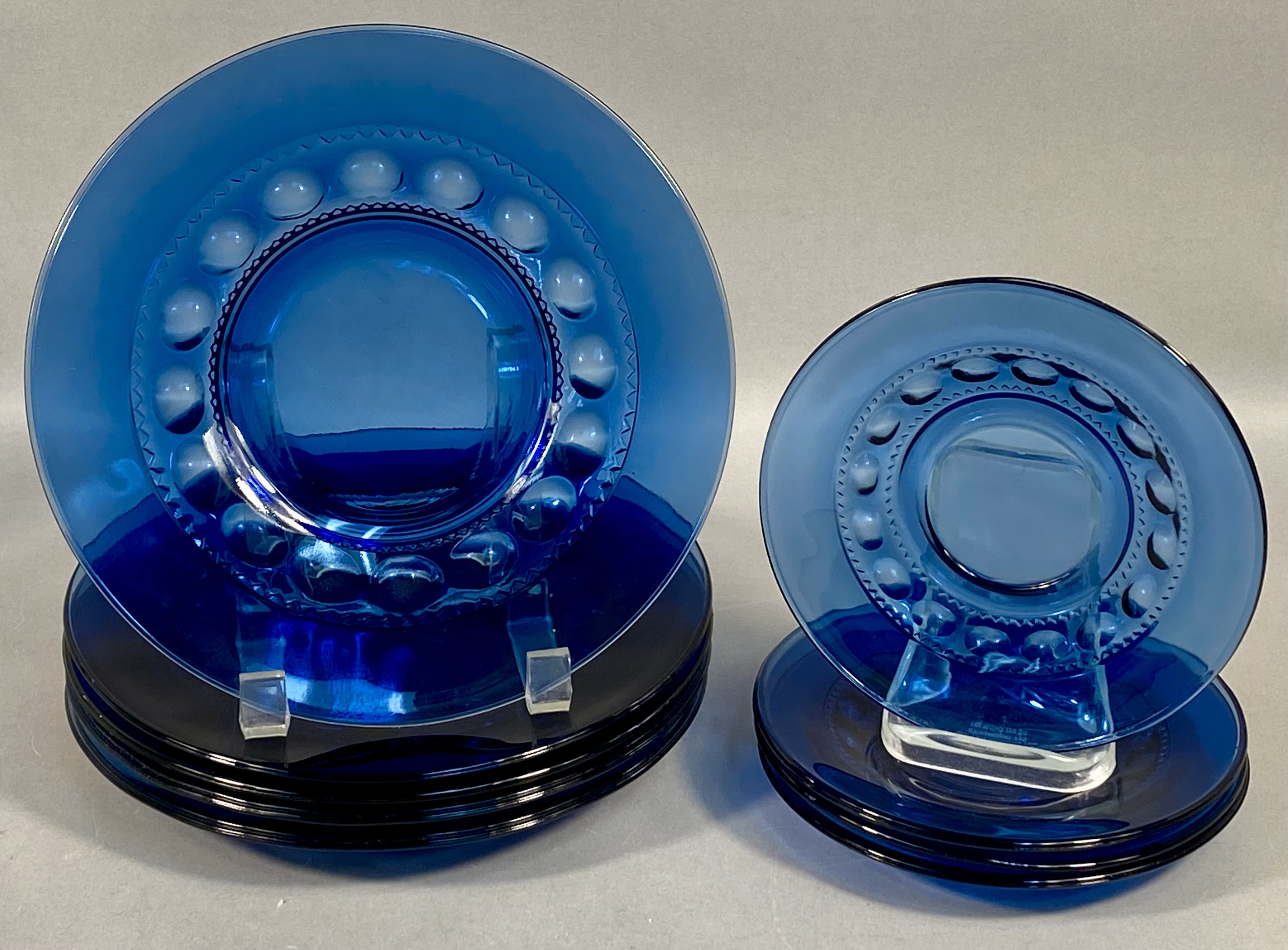 This set of ten cobalt blue pressed glass plates is in the Crown Imperial pattern, attributed to Tiara Exclusives. The design features a recessed central well surrounded by a band of circular thumbprint indentations, which is enclosed by two concentric borders of fine sawtooth or zigzag line work. The rims of the plates are smooth and plain. The collection consists of six luncheon plates and four bread and butter plates. No maker marks or embossed symbols are visible on the base or body of the pieces. Six luncheon plates: 8 1/4 inches diameter Four bread and butter plates: 6 inches diameter. The items are in good overall condition with no visible chips, cracks, or significant surface scratching.