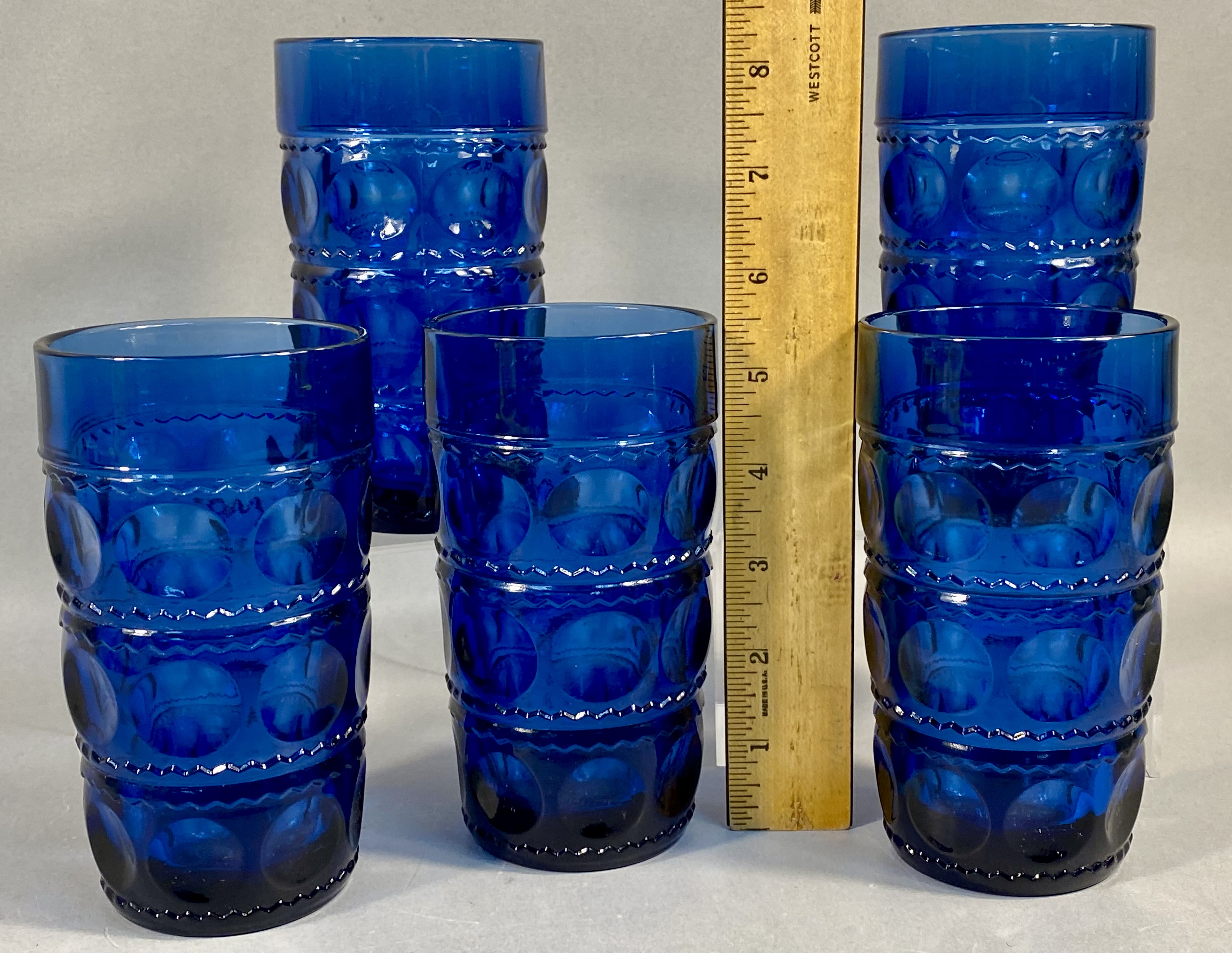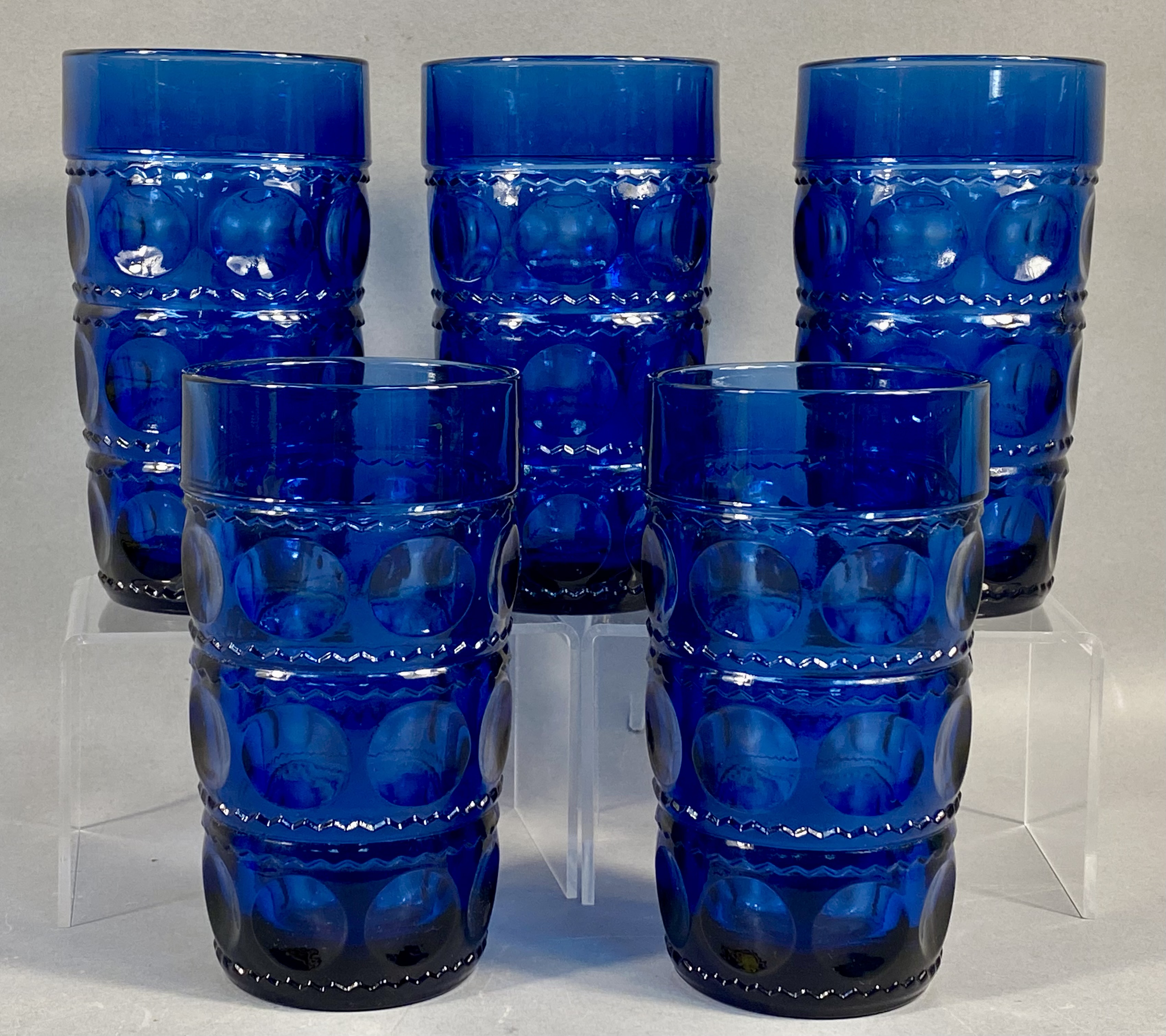 A set of five pressed glass tumblers in the Crown Imperial pattern, attributed to Tiara Exclusives. The vessels are constructed from deep cobalt blue glass. The decorative scheme features three horizontal tiers of large circular thumbprint indentations, separated by textured sawtooth or zigzag bands. Each tumbler has a cylindrical, straight-sided form with a slightly weighted base. This pattern was manufactured by Indiana Glass for Tiara Exclusives. No maker marks or signatures are visible on the items. Each tumbler measures approximately 5.5 inches in height. The items are in good vintage condition. No chips, cracks, or significant surface wear are visible.