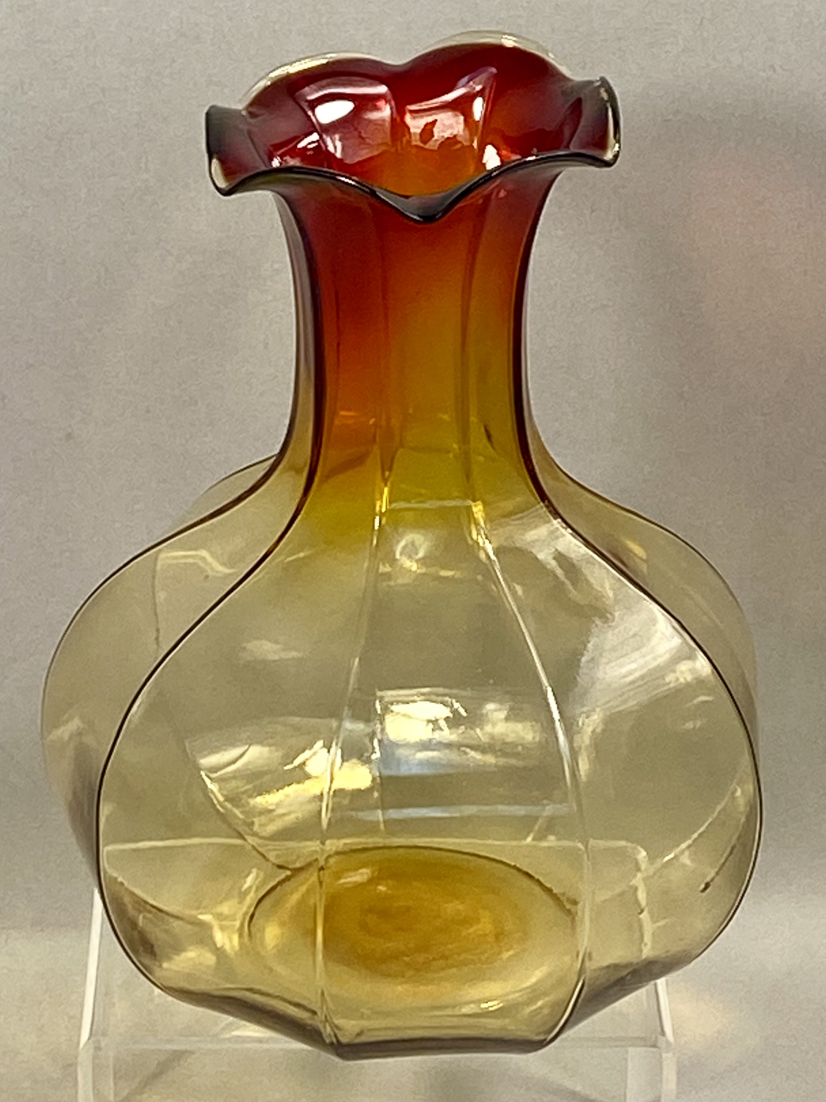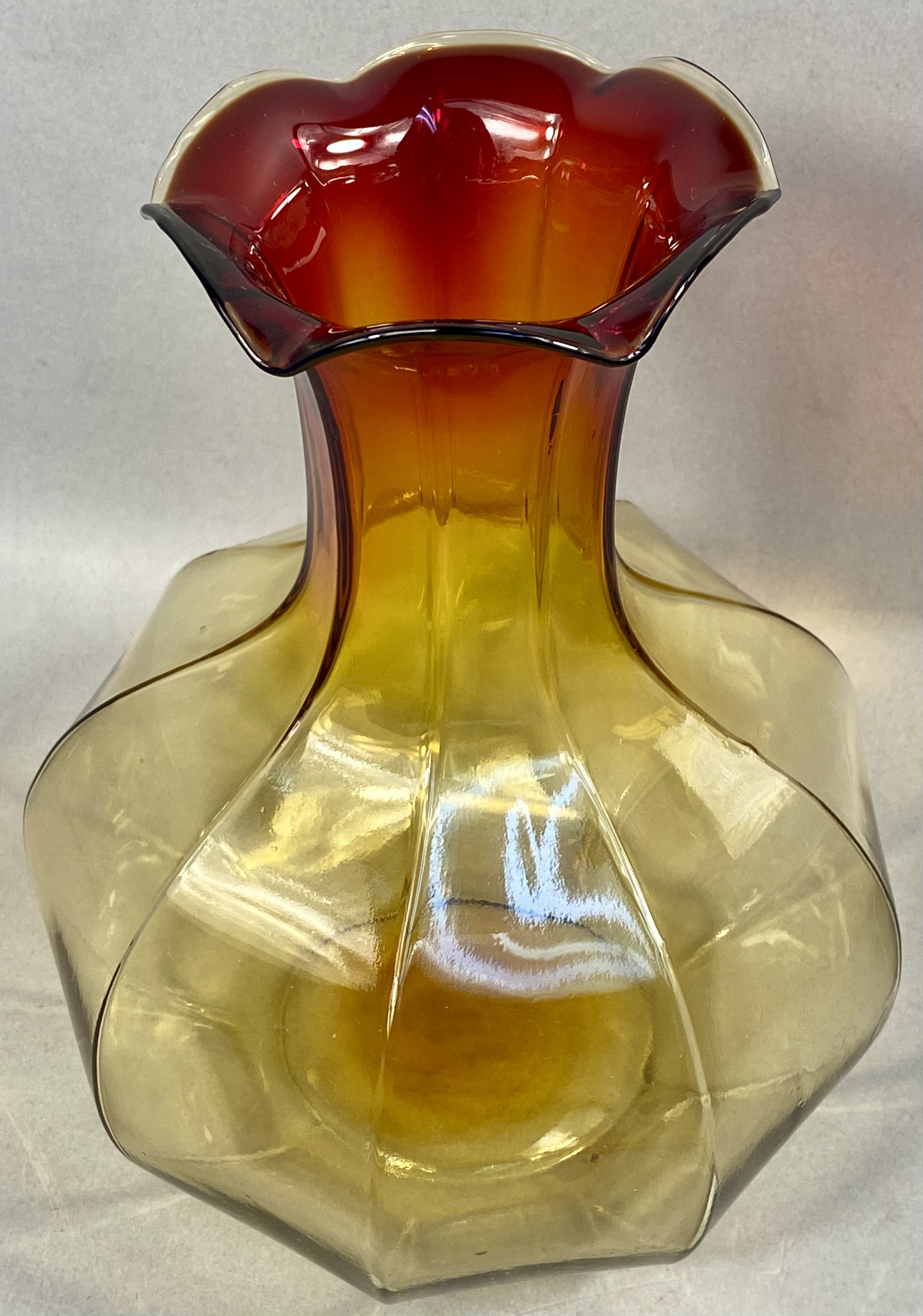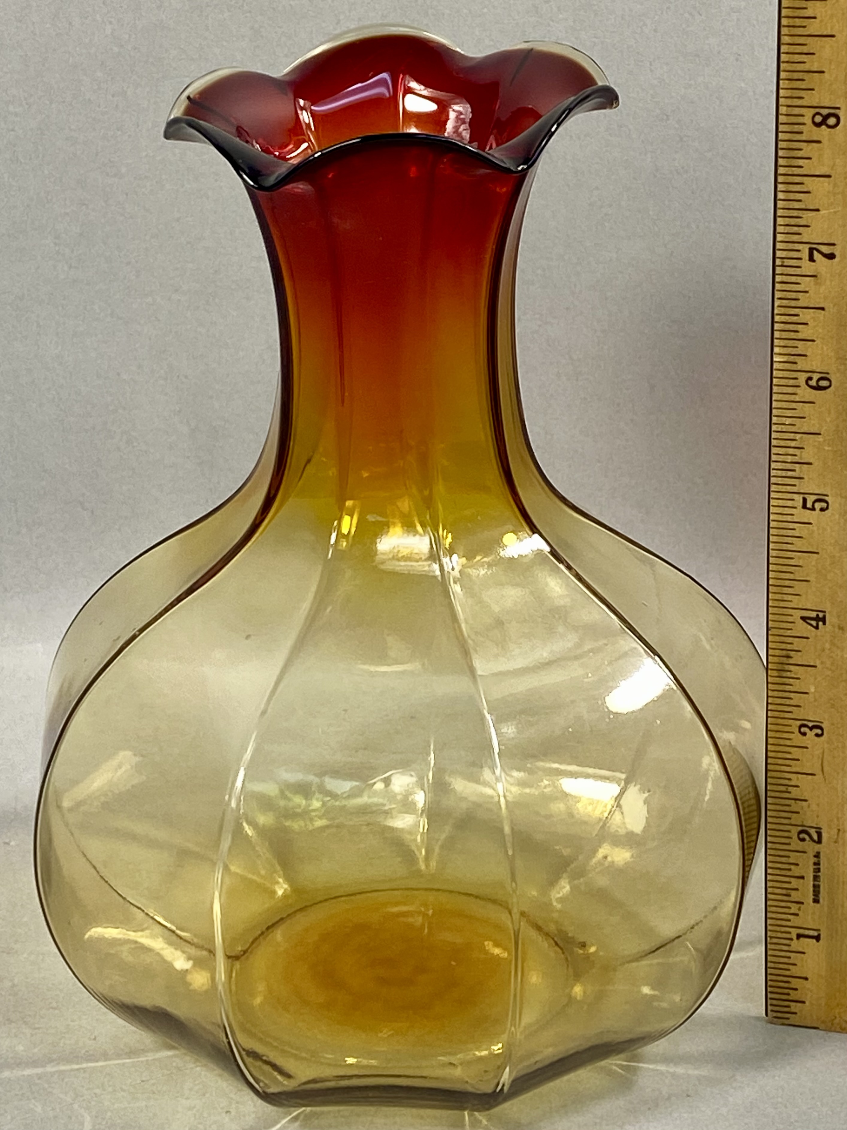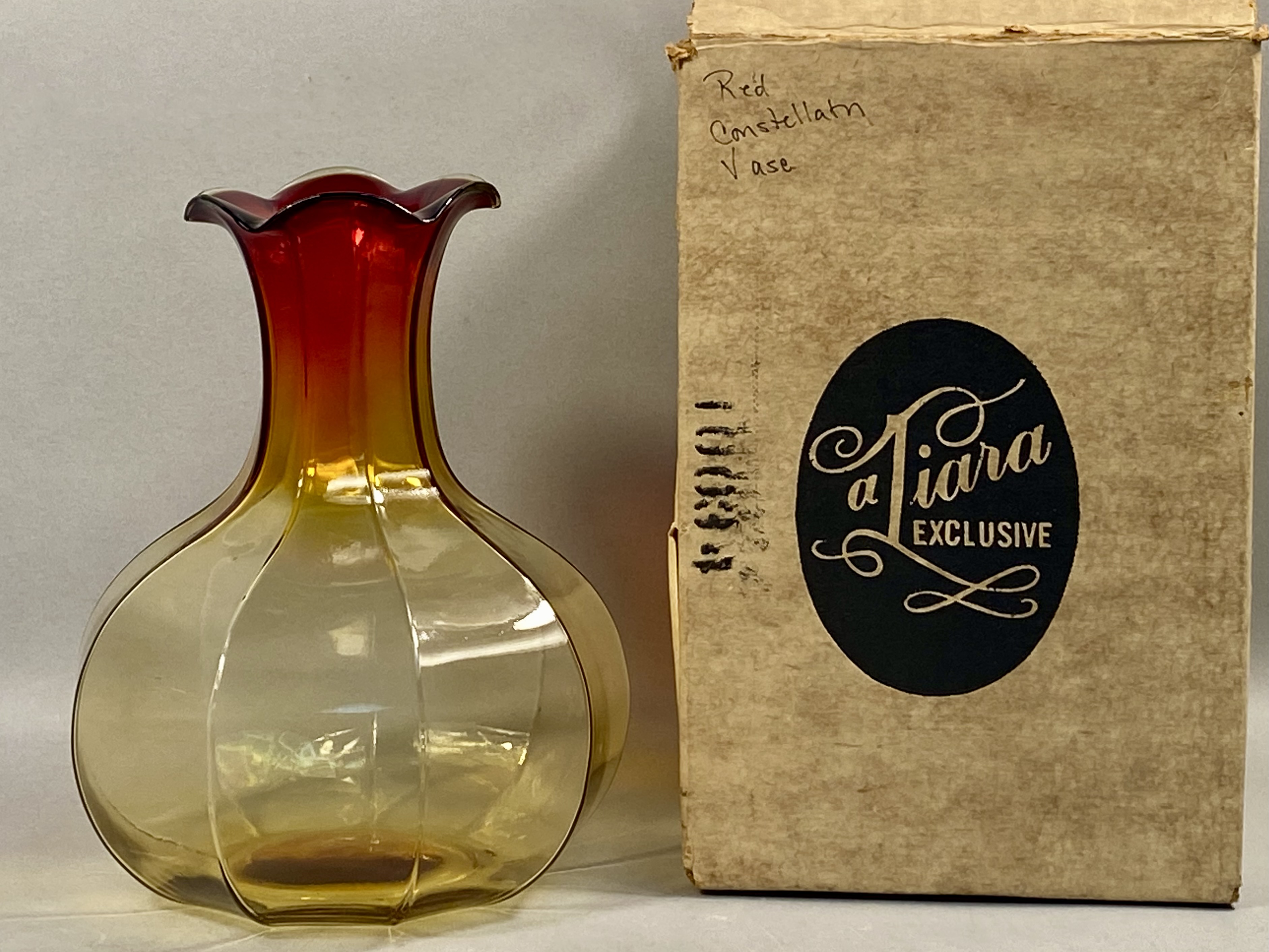A vintage glass vase in the Constellation pattern produced for Tiara Exclusives. The vessel is composed of Amberina glass, characterized by a heat-sensitive color gradient transitioning from a honey-amber base to a deep ruby-red at the rim. The form features a bulbous body with molded vertical ribbed fins and a hand-finished ruffled rim. The item is accompanied by its original cardboard box, which displays the Tiara Exclusive logo within a black oval and includes handwritten script identifying the contents as a Red Constellatn Vase. This pattern was manufactured by the Indiana Glass Company for Tiara Exclusives during the late 20th century. Height: 8 inches. The vase is in excellent vintage condition with no observed chips, cracks, or repairs. The glass retains high clarity and vibrant color saturation. The original box is included and exhibits moderate age-related wear, including scuffing, minor tearing at the edges, and handwritten notations.