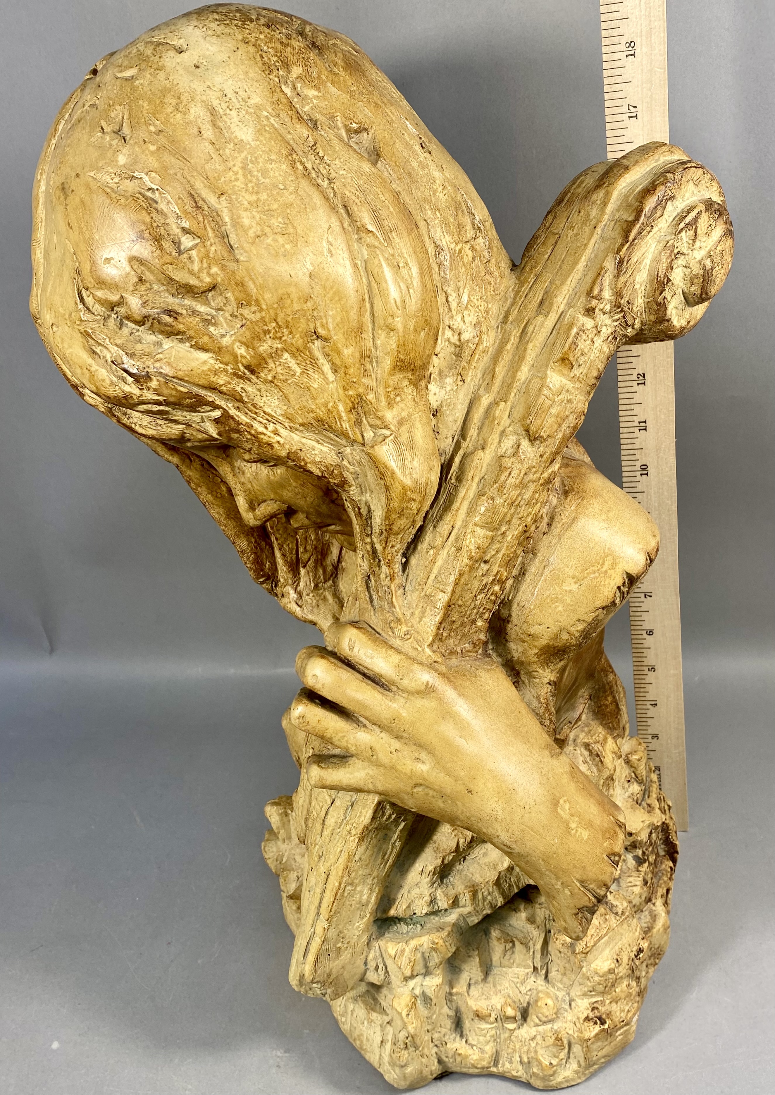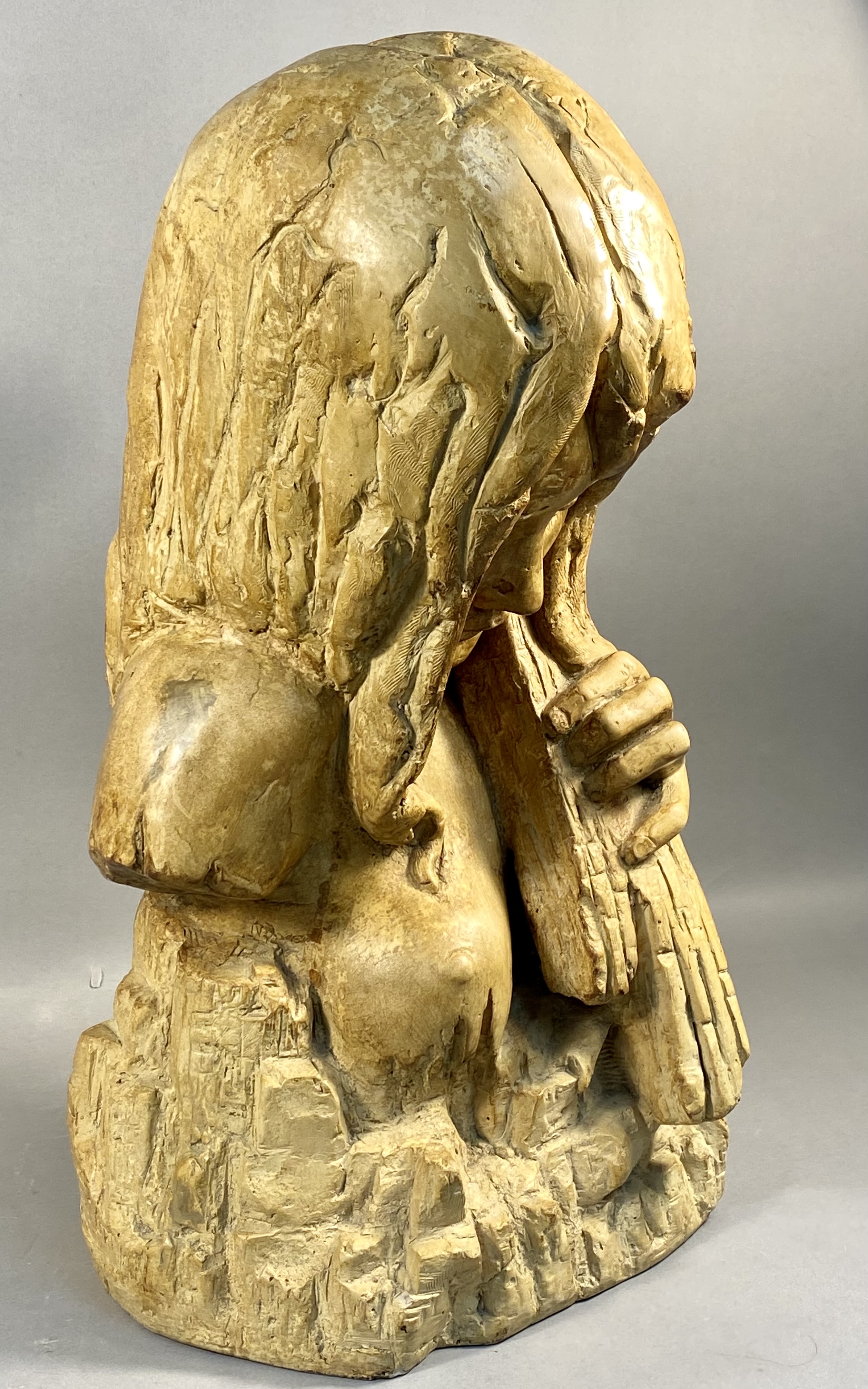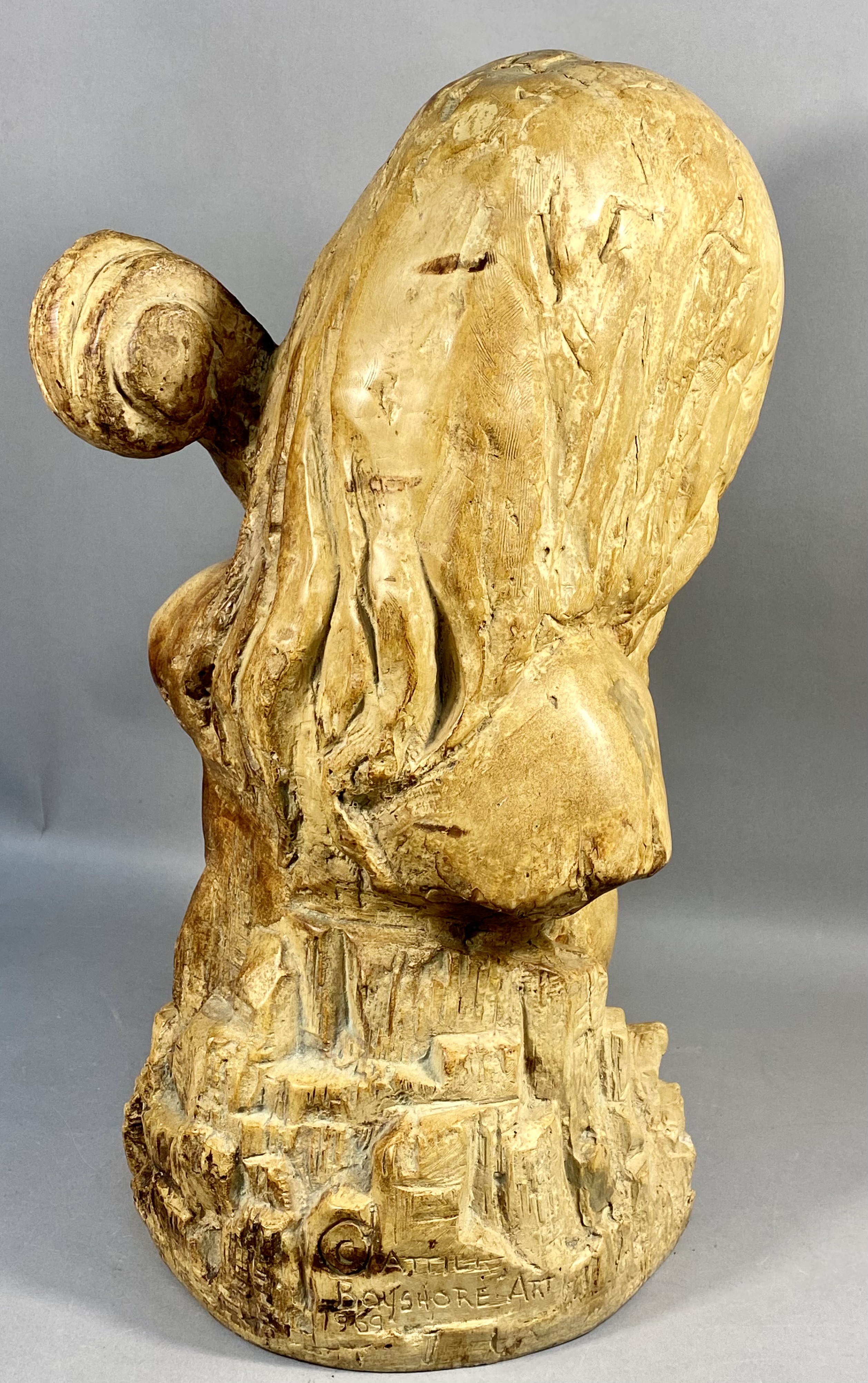 This mid-20th-century cast plaster or composite sculpture depicts a pensive young woman with long, textured hair, her gaze cast downward as she grasps the scroll and neck of a stringed instrument. The work is executed in an expressive modernist style with a heavily worked surface, finished in a warm, yellowish-tan stain that mimics the appearance of aged wood or stone. The piece is hollow cast and stands on an integral, ruggedly modeled base. The lower reverse of the base features incised marks reading C ATTILI, BAYSHORE ART, and 1969. The underside is hollowed and fitted with several circular felt pads. Measurements: Approximately 10.5 inches X 18.5 inches tall. The sculpture is in good overall condition, exhibiting a consistent patina throughout. There are scattered minor surface scuffs and small chips along the base edges that reveal the lighter white material of the cast.