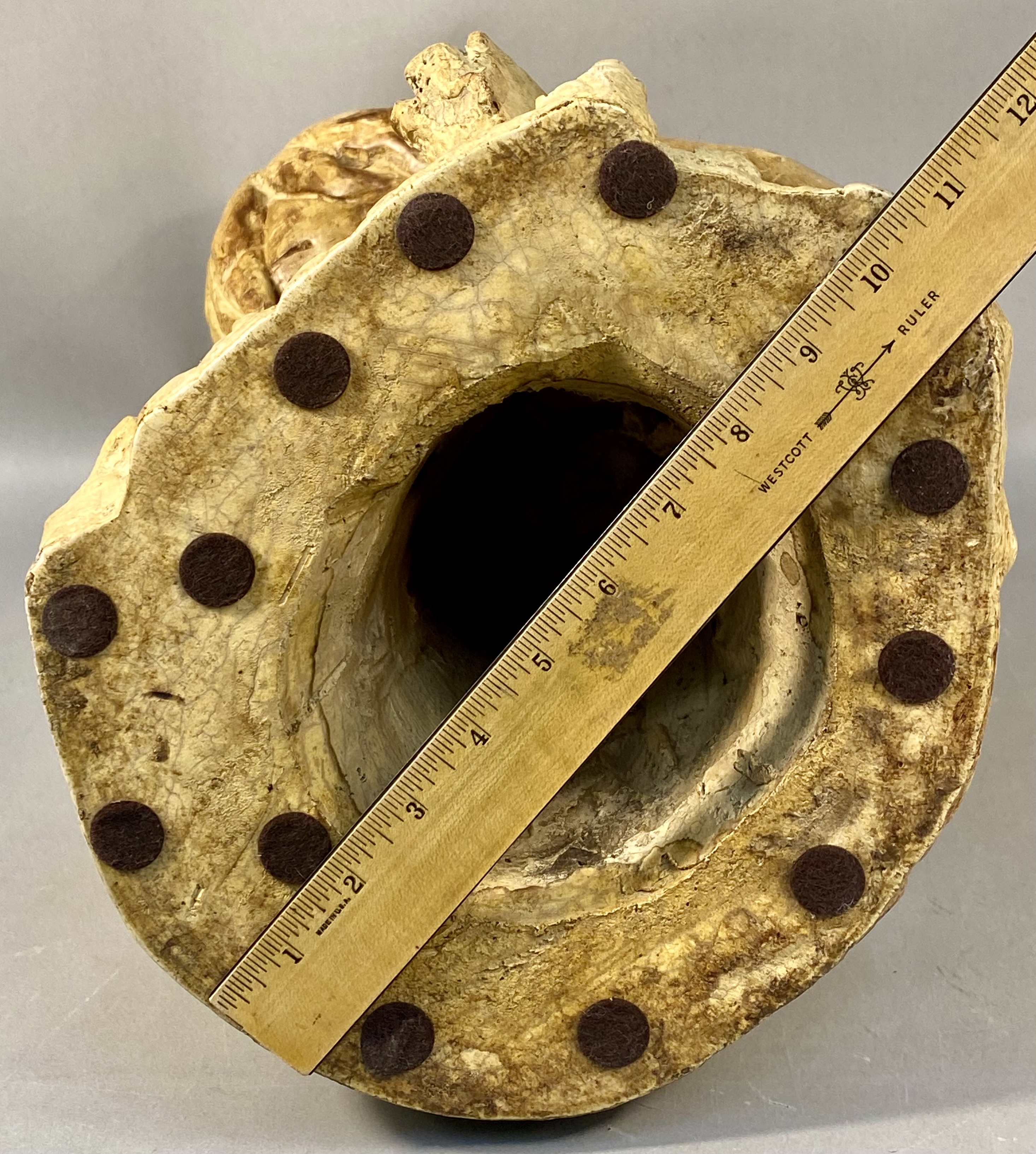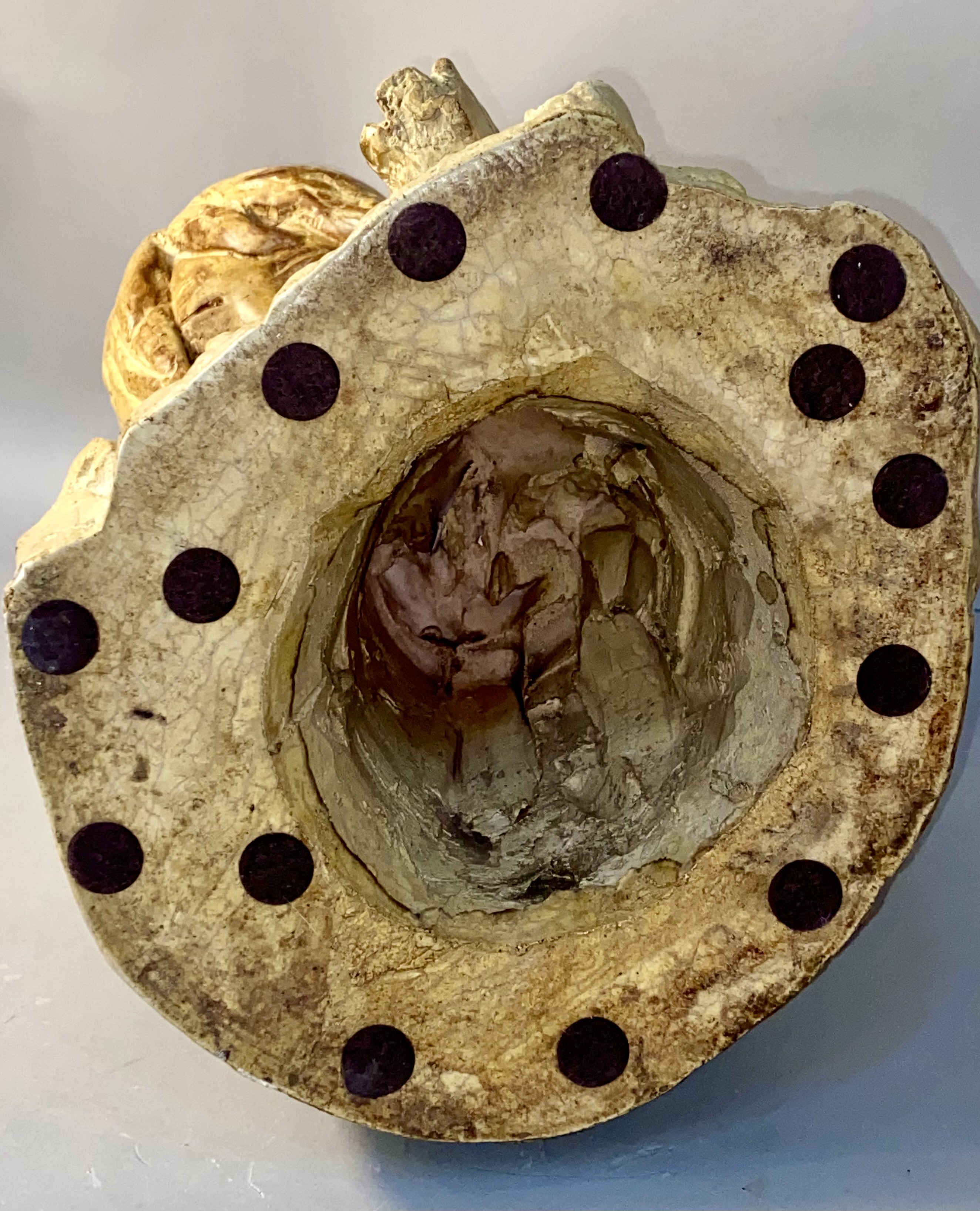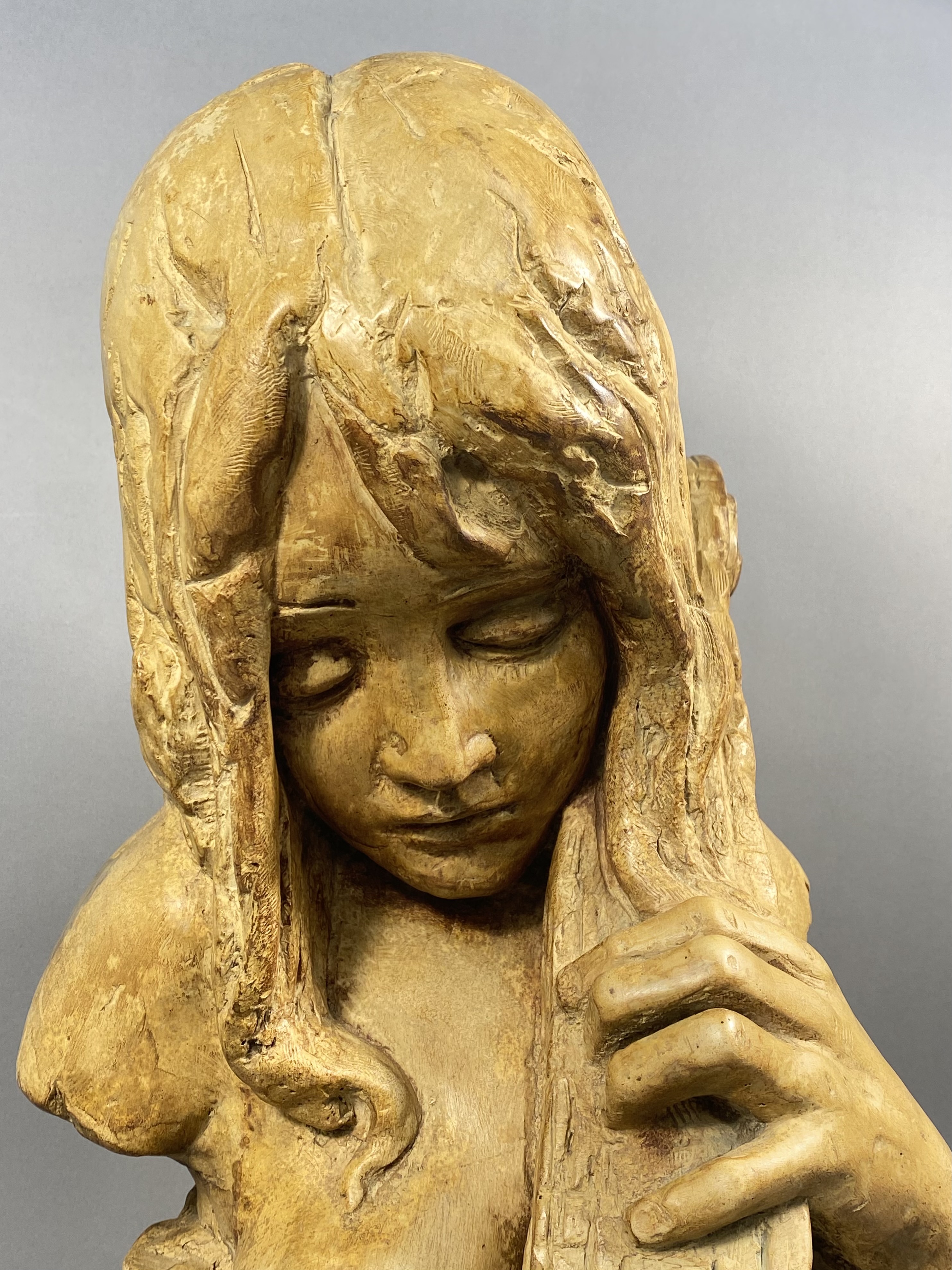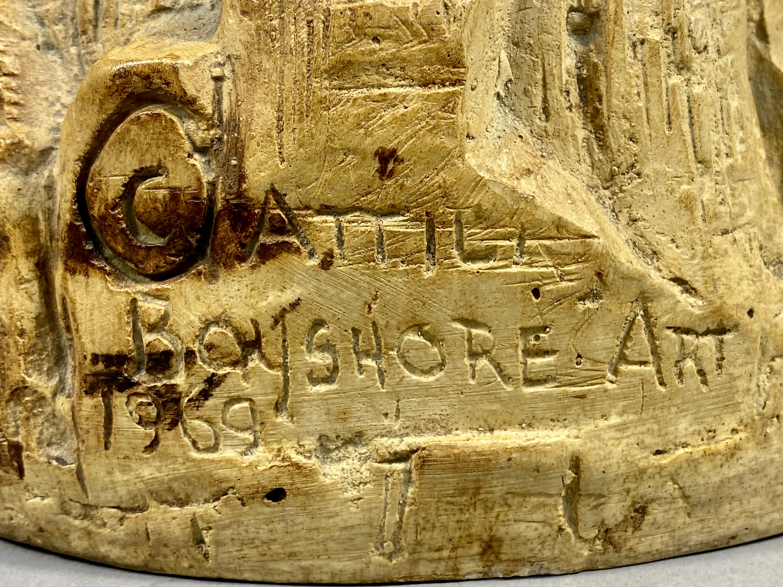 This mid-20th-century cast plaster or composite sculpture depicts a pensive young woman with long, textured hair, her gaze cast downward as she grasps the scroll and neck of a stringed instrument. The work is executed in an expressive modernist style with a heavily worked surface, finished in a warm, yellowish-tan stain that mimics the appearance of aged wood or stone. The piece is hollow cast and stands on an integral, ruggedly modeled base. The lower reverse of the base features incised marks reading C ATTILI, BAYSHORE ART, and 1969. The underside is hollowed and fitted with several circular felt pads. Measurements: Approximately 10.5 inches X 18.5 inches tall. The sculpture is in good overall condition, exhibiting a consistent patina throughout. There are scattered minor surface scuffs and small chips along the base edges that reveal the lighter white material of the cast.