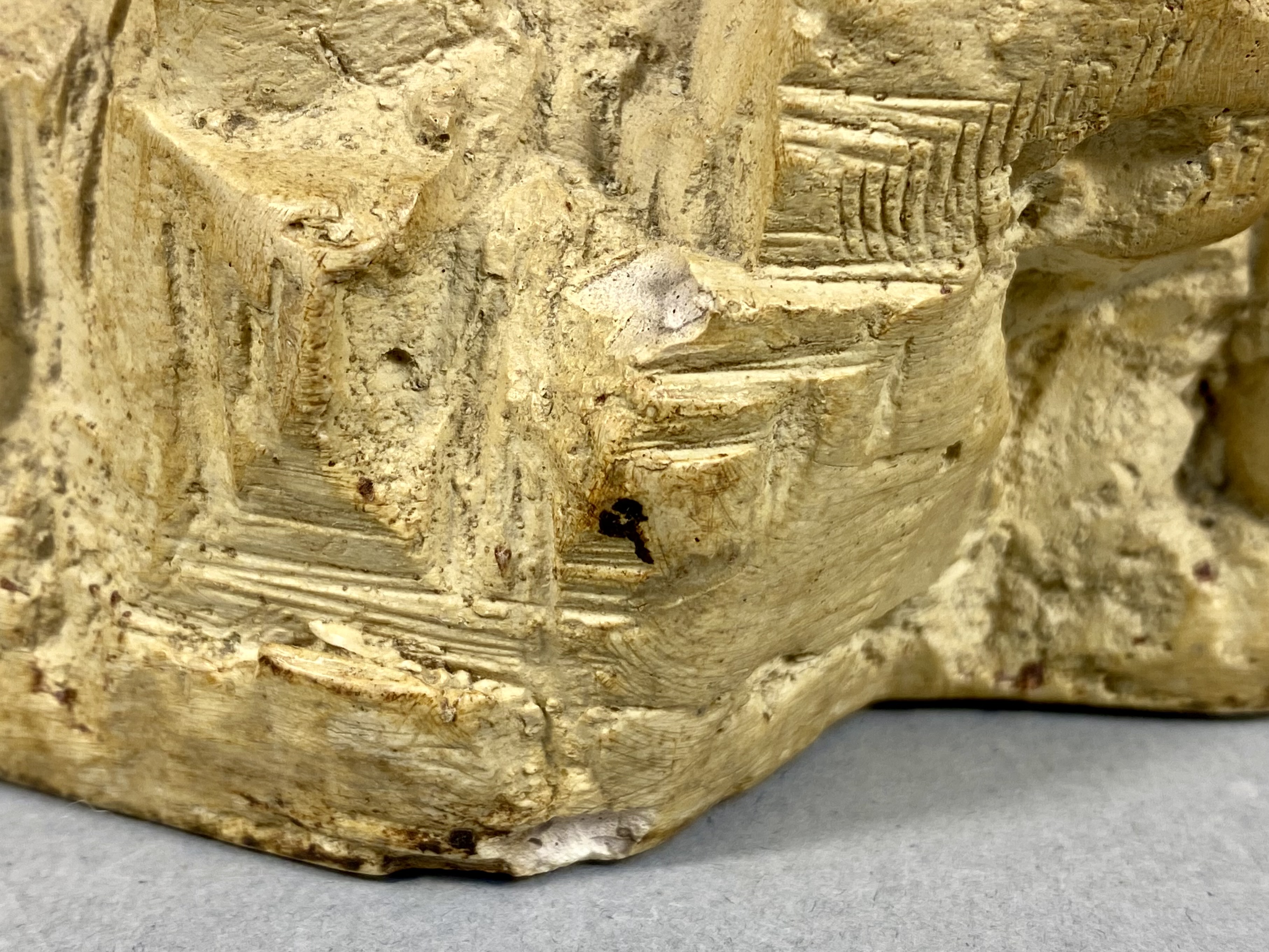 The sculpture is in good overall condition, exhibiting a consistent patina throughout. There are scattered minor surface scuffs and small chips along the base edges that reveal the lighter white material of the cast.