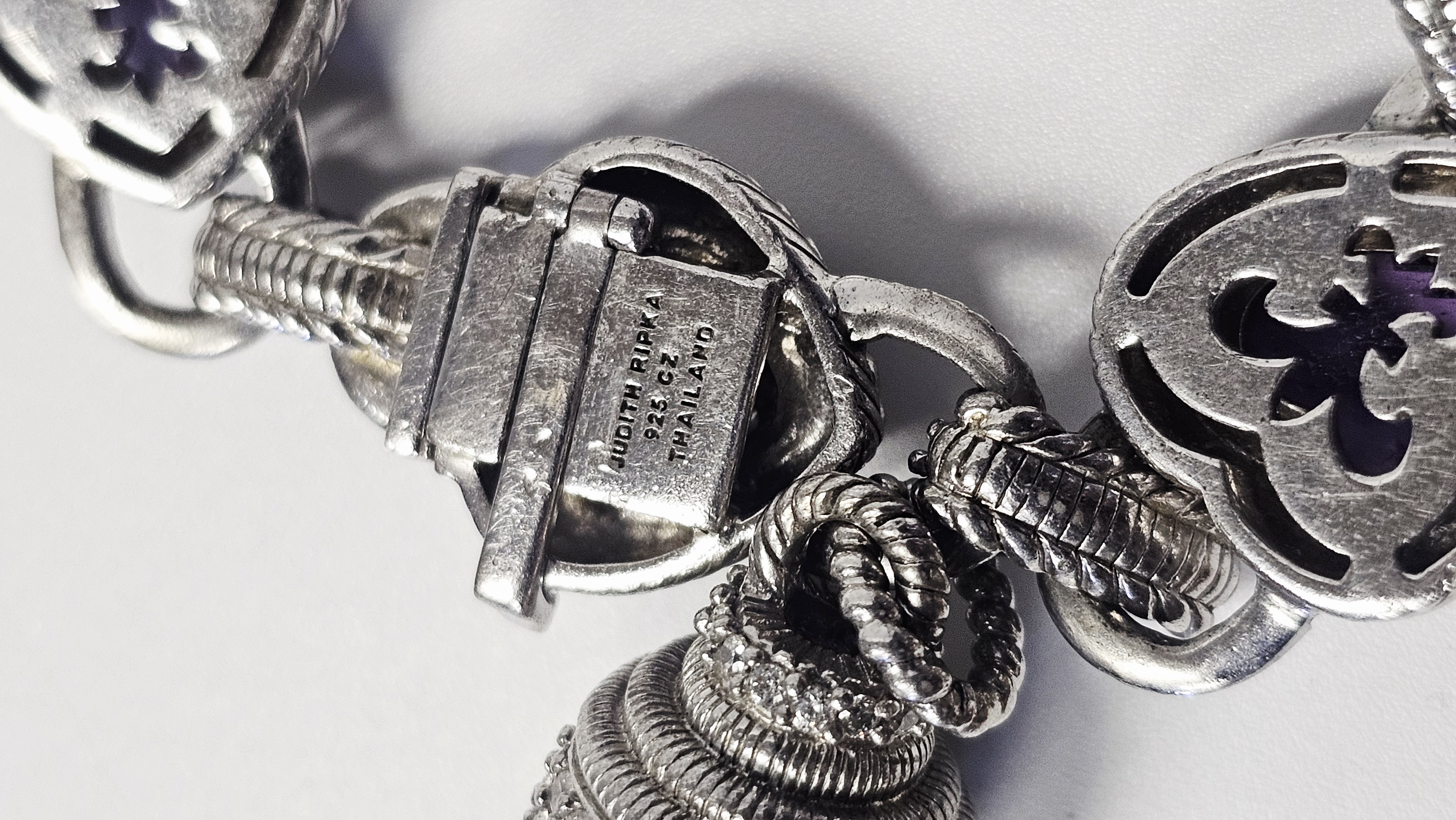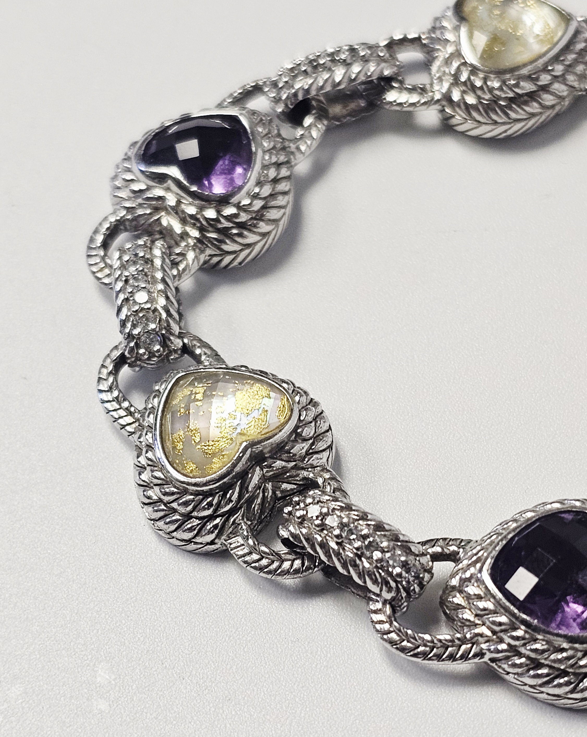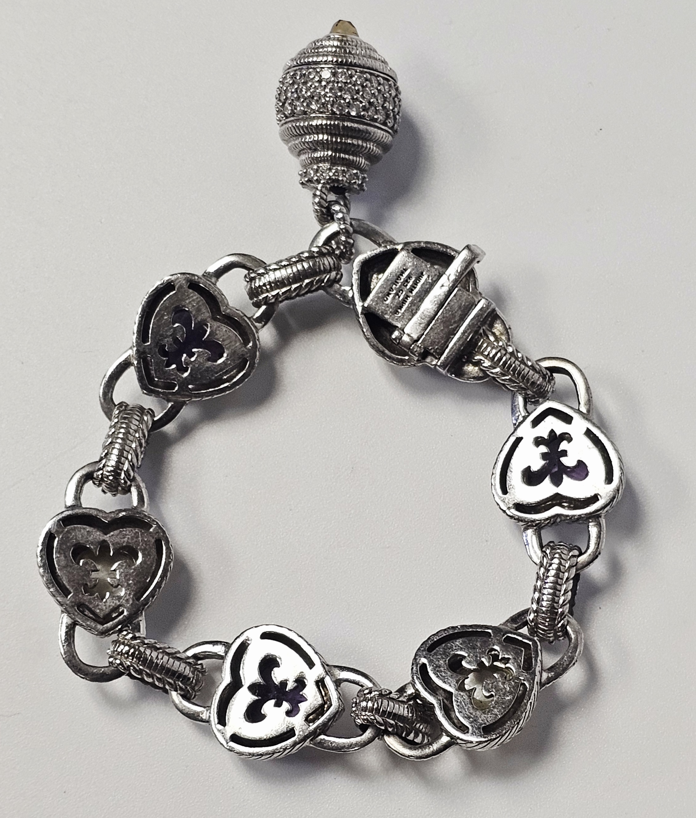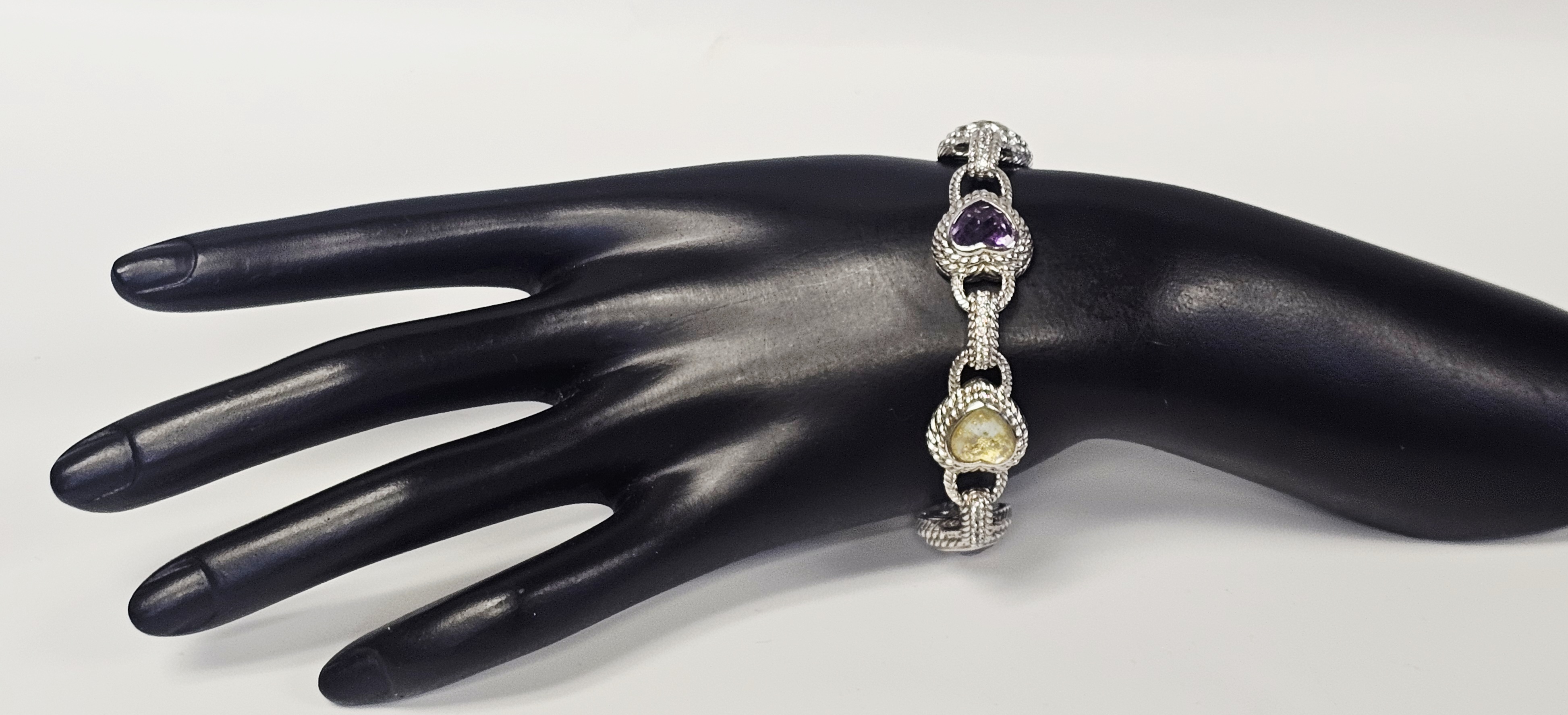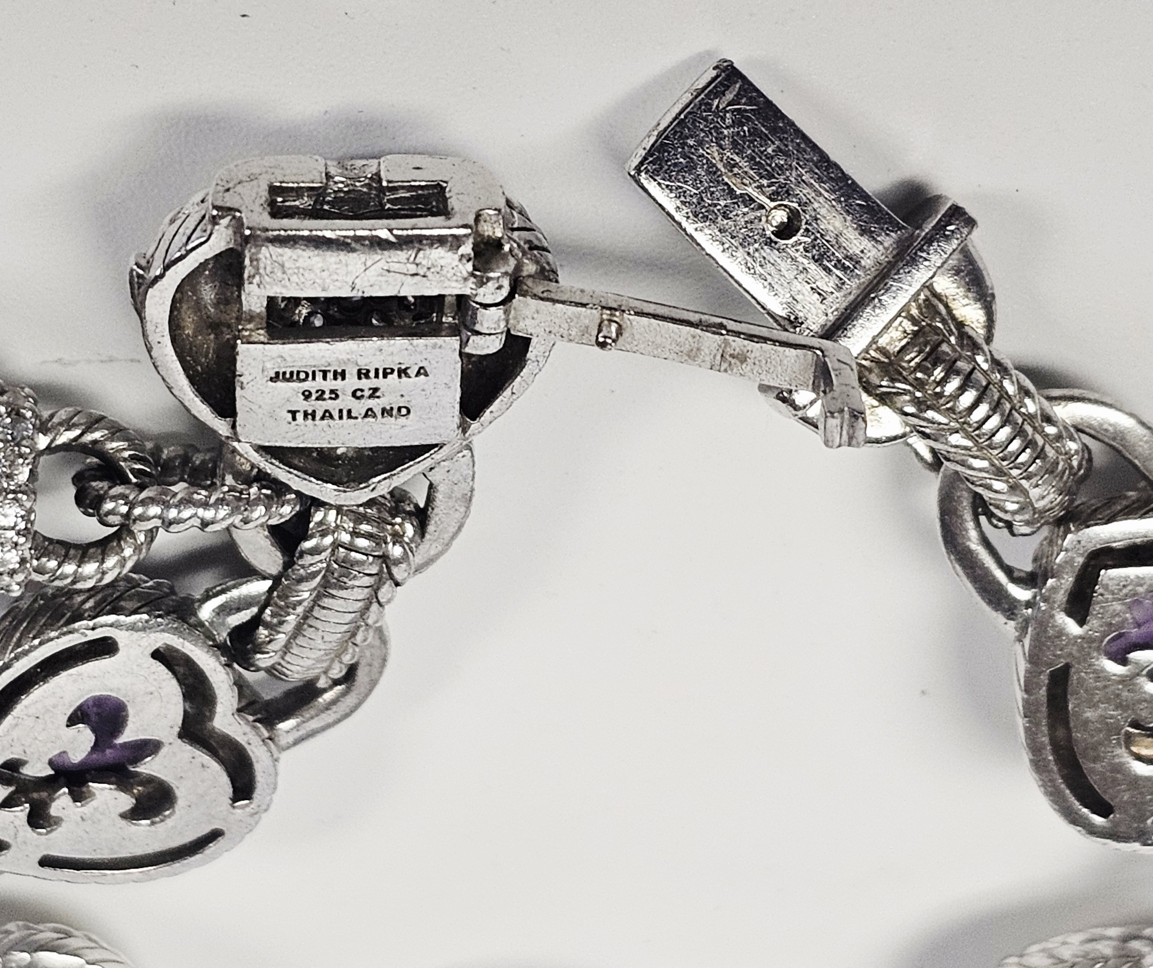 A sterling silver heart-link bracelet by Judith Ripka featuring five heart-shaped stations. Three stations are set with faceted purple stones, and two are set with yellow stones containing gold-colored flecks. Each station is surrounded by a textured rope-motif border. The stations are connected by links, several of which are accented with pavé-set clear cubic zirconia. The bracelet secures with a heart-shaped box clasp decorated with pavé-set clear cubic zirconia. Attached to the bracelet is a large, ribbed decorative charm featuring pavé-set clear stones and a dark-colored cabochon terminal. The reverse of the heart stations features openwork fleur-de-lis designs. The interior of the clasp is stamped JUDITH RIPKA, 925 CZ, and THAILAND. The lot includes the original branded green presentation box and a grey suede-like storage pouch. Length: Approximately 8 inches Weight: 54.7 grams.