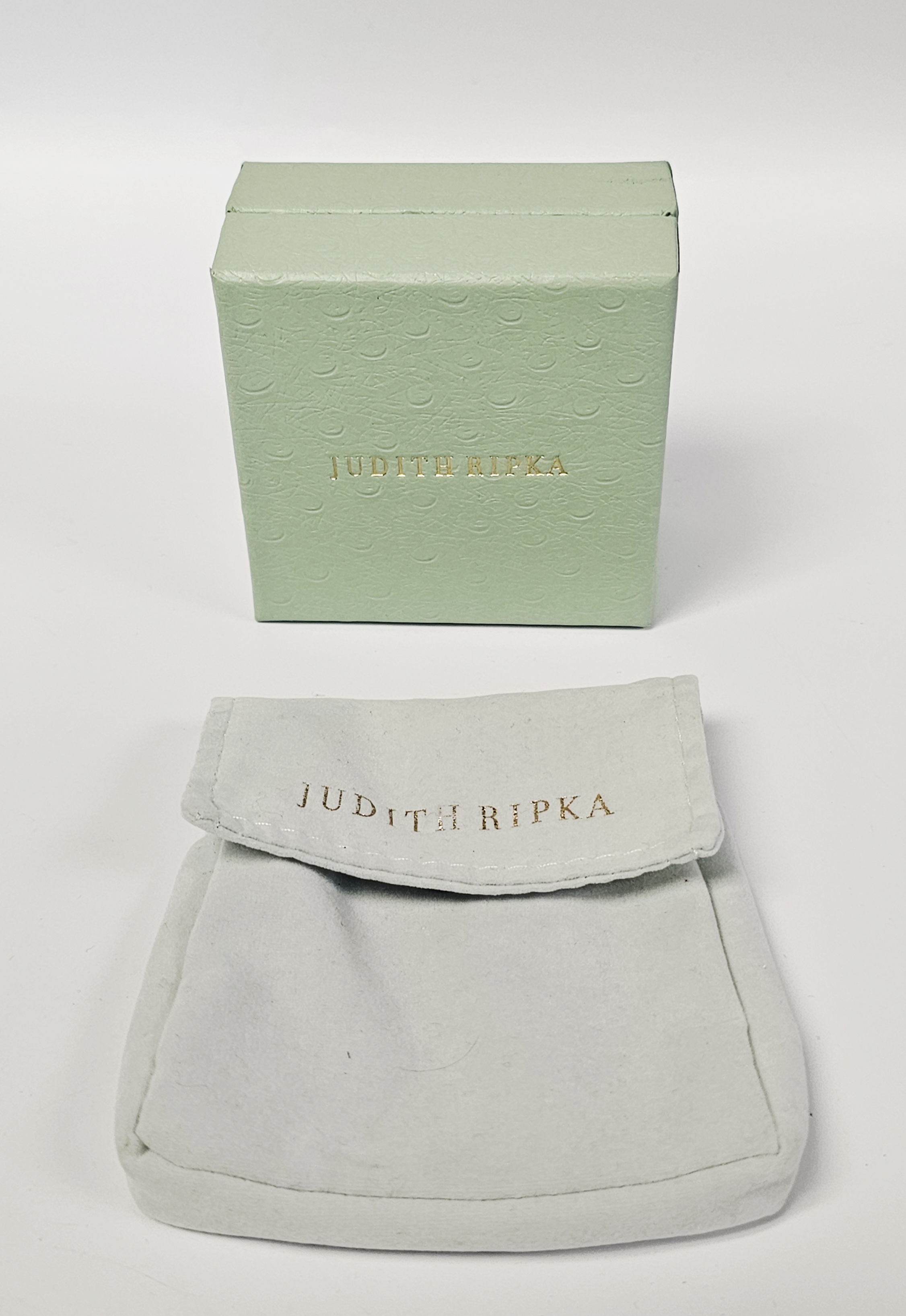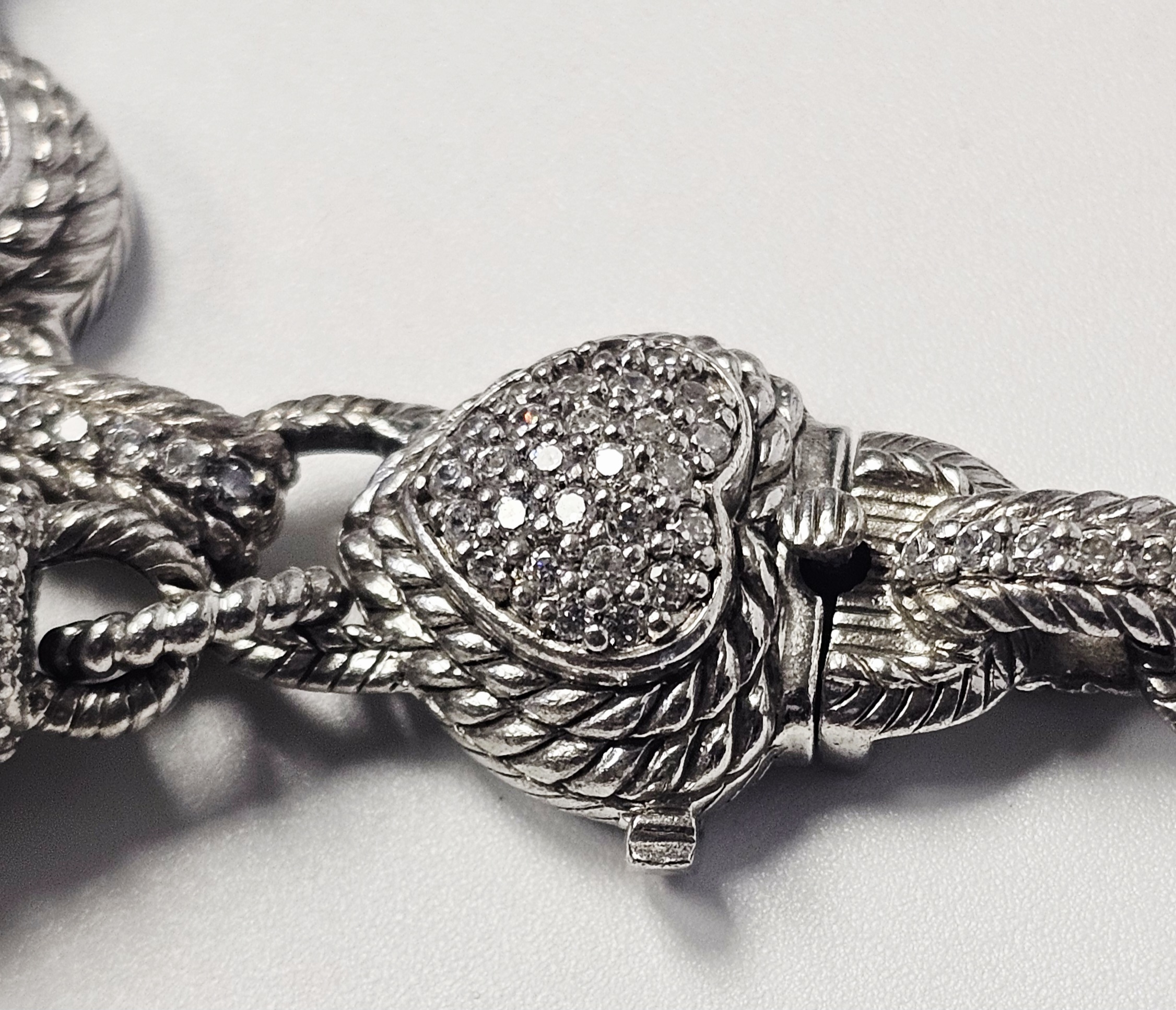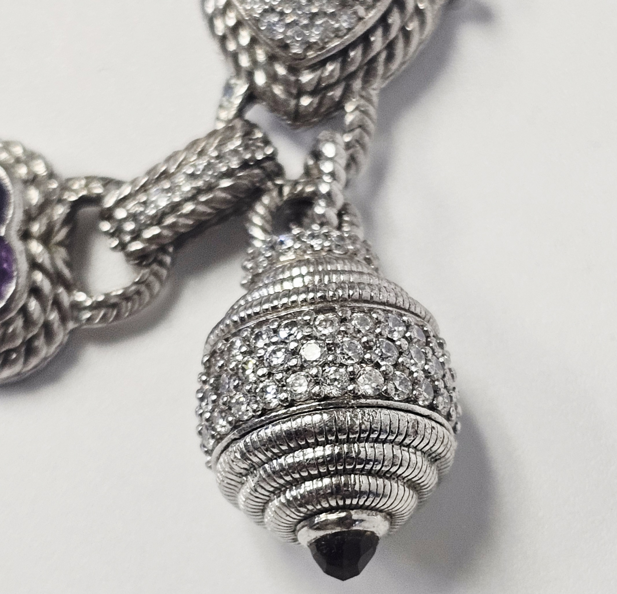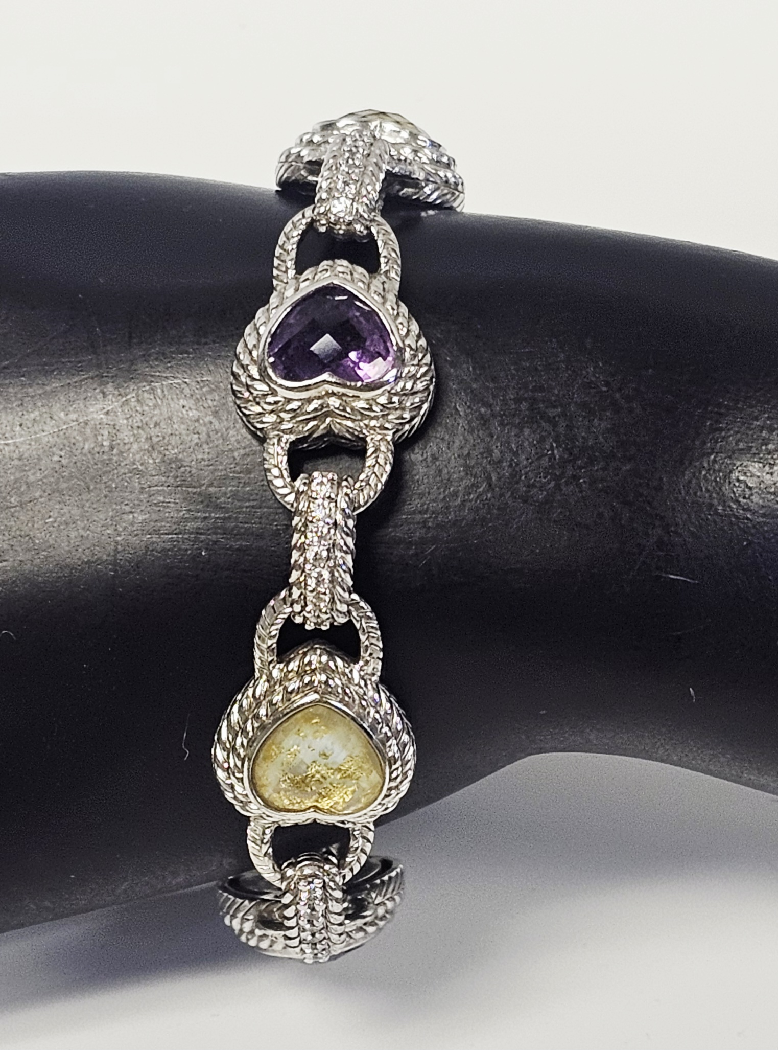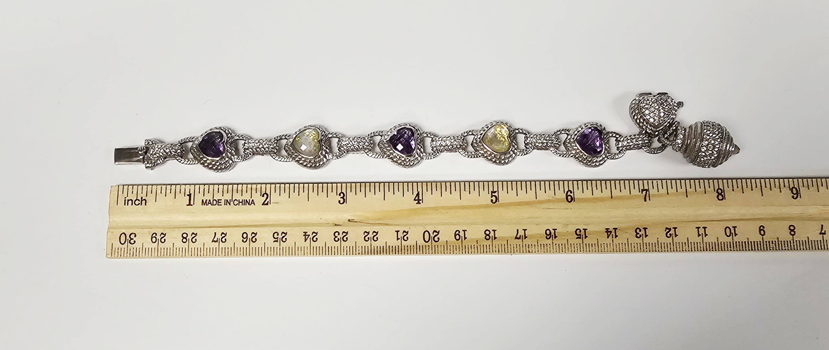 A sterling silver heart-link bracelet by Judith Ripka featuring five heart-shaped stations. Three stations are set with faceted purple stones, and two are set with yellow stones containing gold-colored flecks. Each station is surrounded by a textured rope-motif border. The stations are connected by links, several of which are accented with pavé-set clear cubic zirconia. The bracelet secures with a heart-shaped box clasp decorated with pavé-set clear cubic zirconia. Attached to the bracelet is a large, ribbed decorative charm featuring pavé-set clear stones and a dark-colored cabochon terminal. The reverse of the heart stations features openwork fleur-de-lis designs. The interior of the clasp is stamped JUDITH RIPKA, 925 CZ, and THAILAND. The lot includes the original branded green presentation box and a grey suede-like storage pouch. Length: Approximately 8 inches Weight: 54.7 grams.