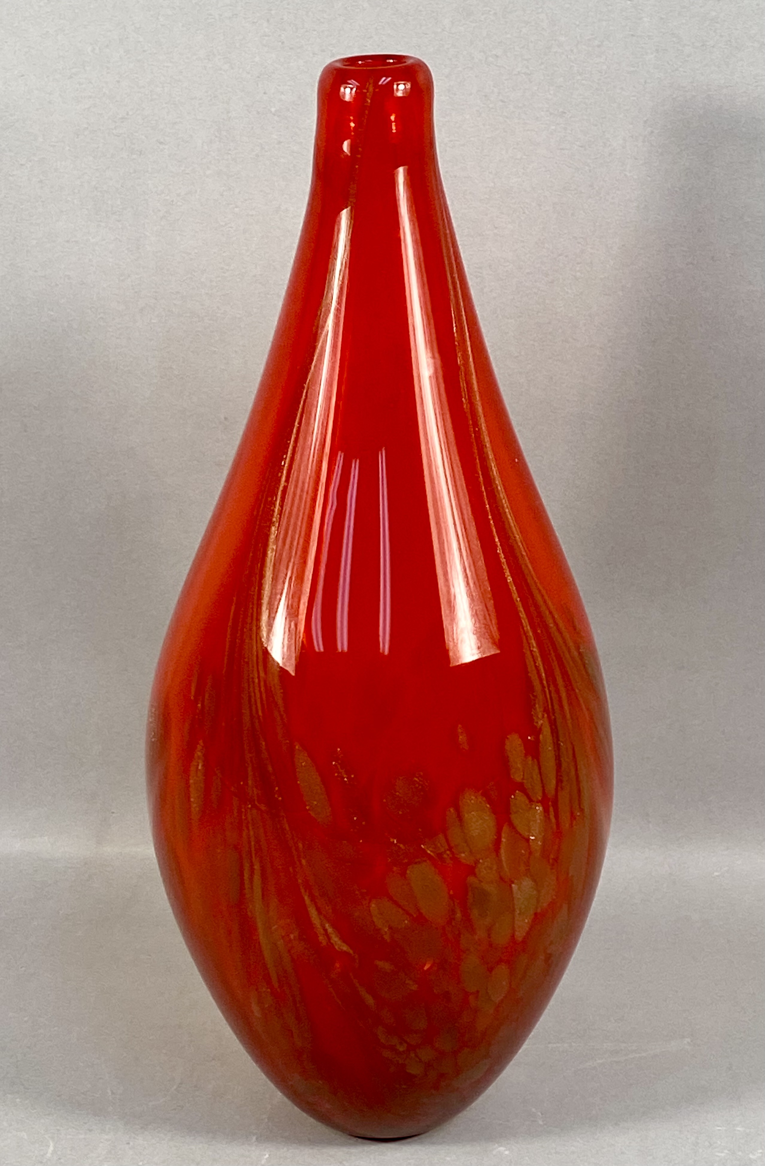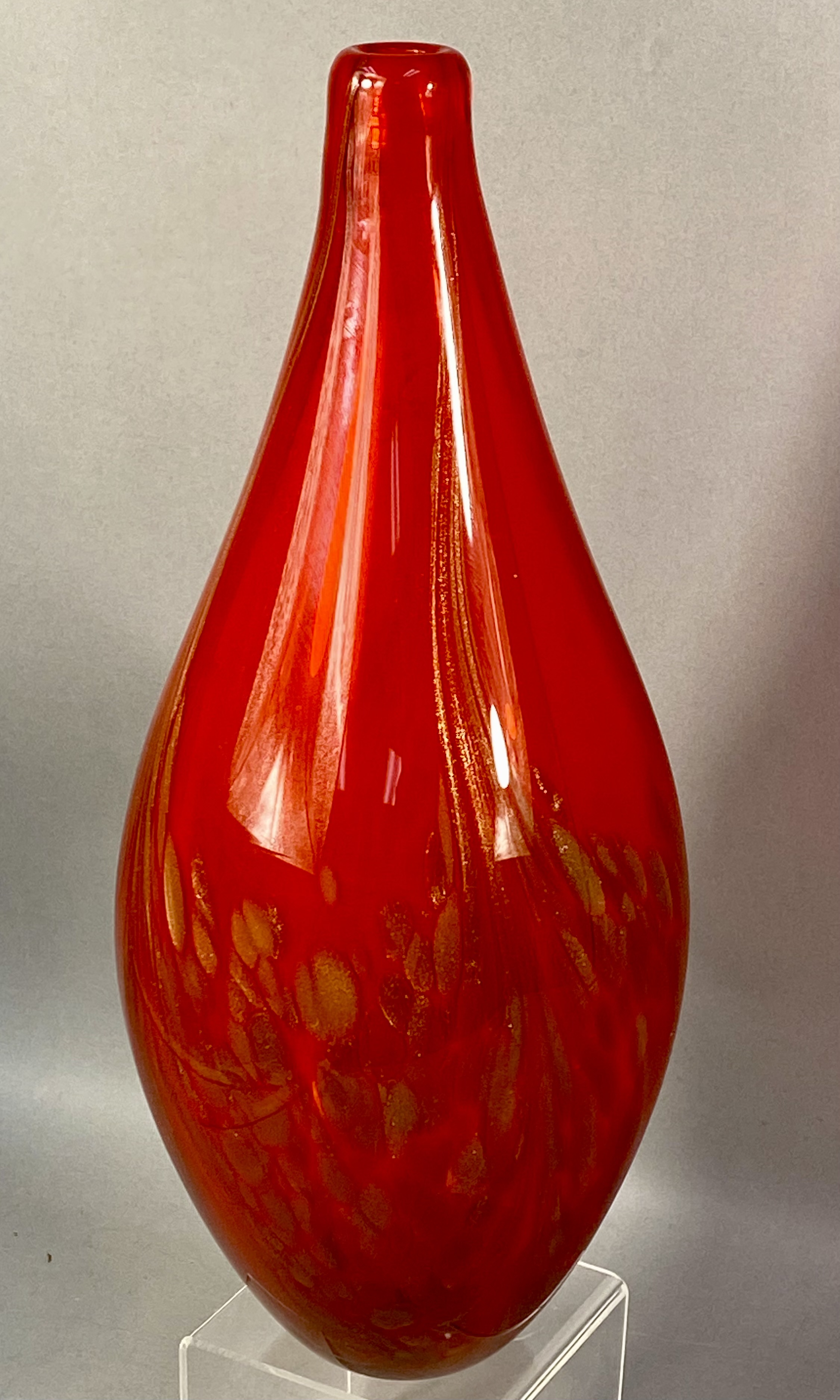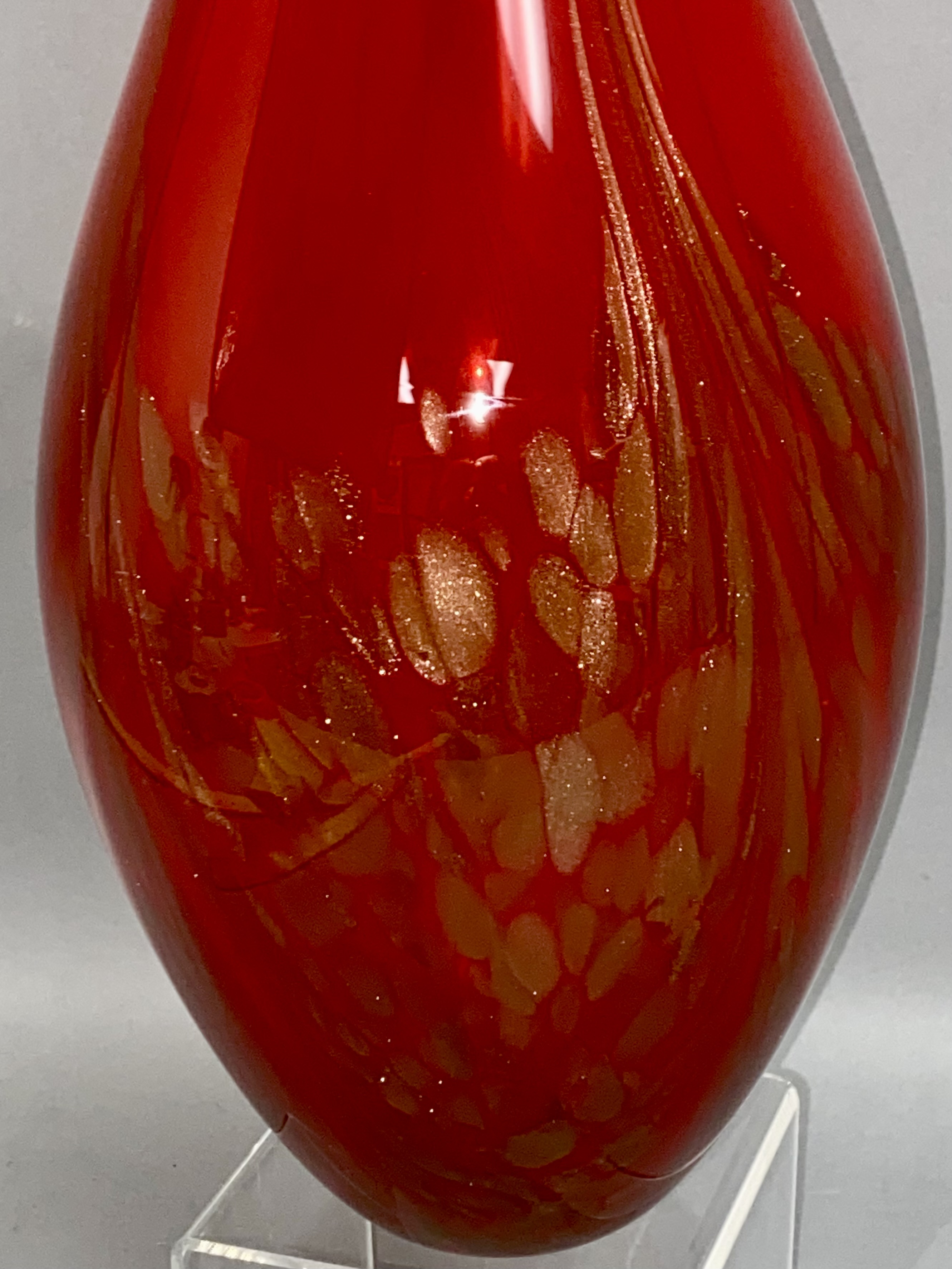 A large studio art glass vase featuring an elongated teardrop form. The vessel is composed of translucent ruby red glass. The lower half of the body contains internal gold-tone aventurine flecks and mottled amber-colored inclusions. Fine, vertical streaks of a lighter metallic or amber tone extend from the narrow, polished rim toward the center of the body. The piece is hand-blown with a smooth, polished finish. No maker marks are present. Measurement: 16 inches tall. Good overall condition. No visible chips, cracks, or repairs. Minor internal bubbles and variations consistent with hand-blown glass production.