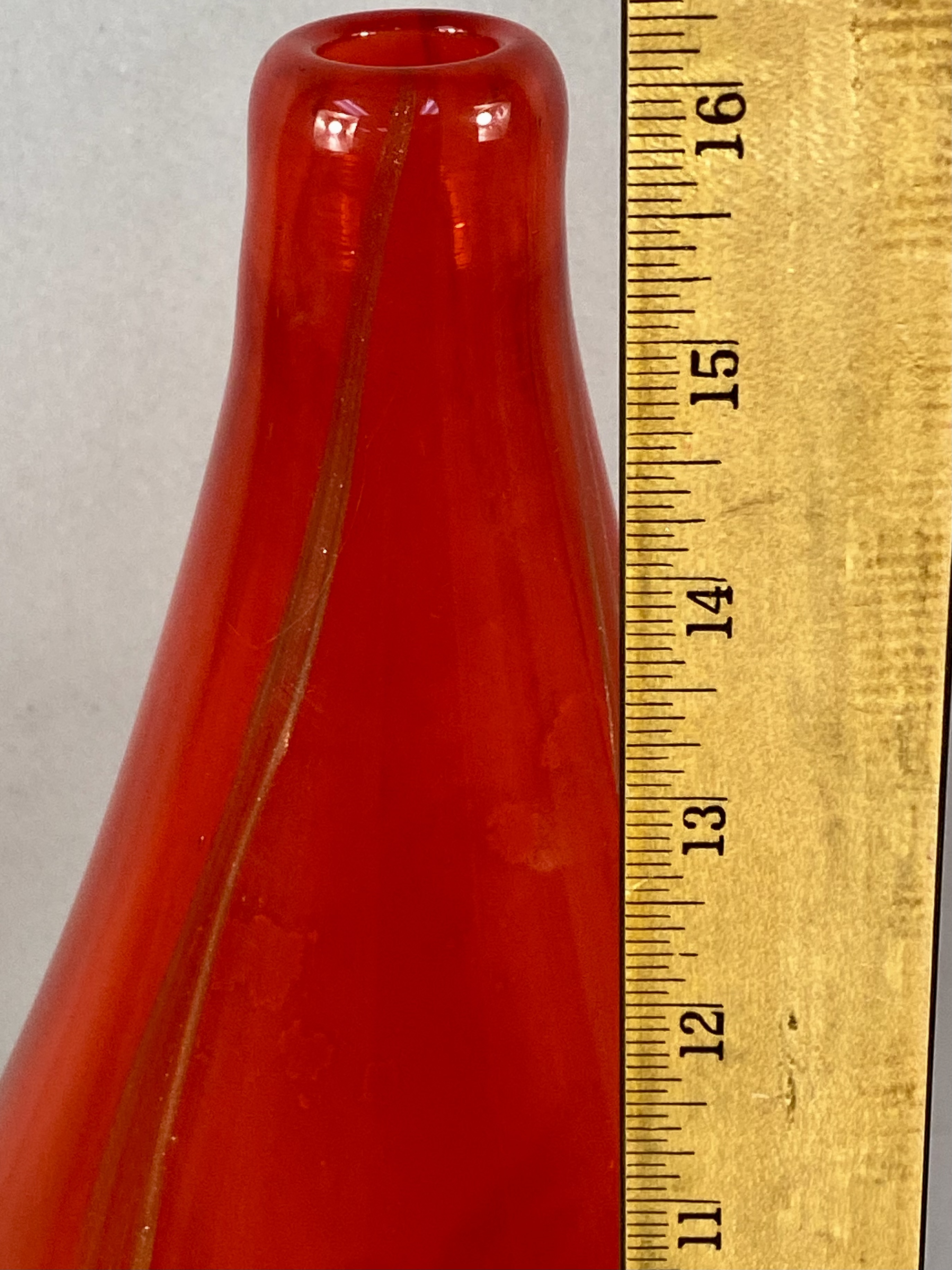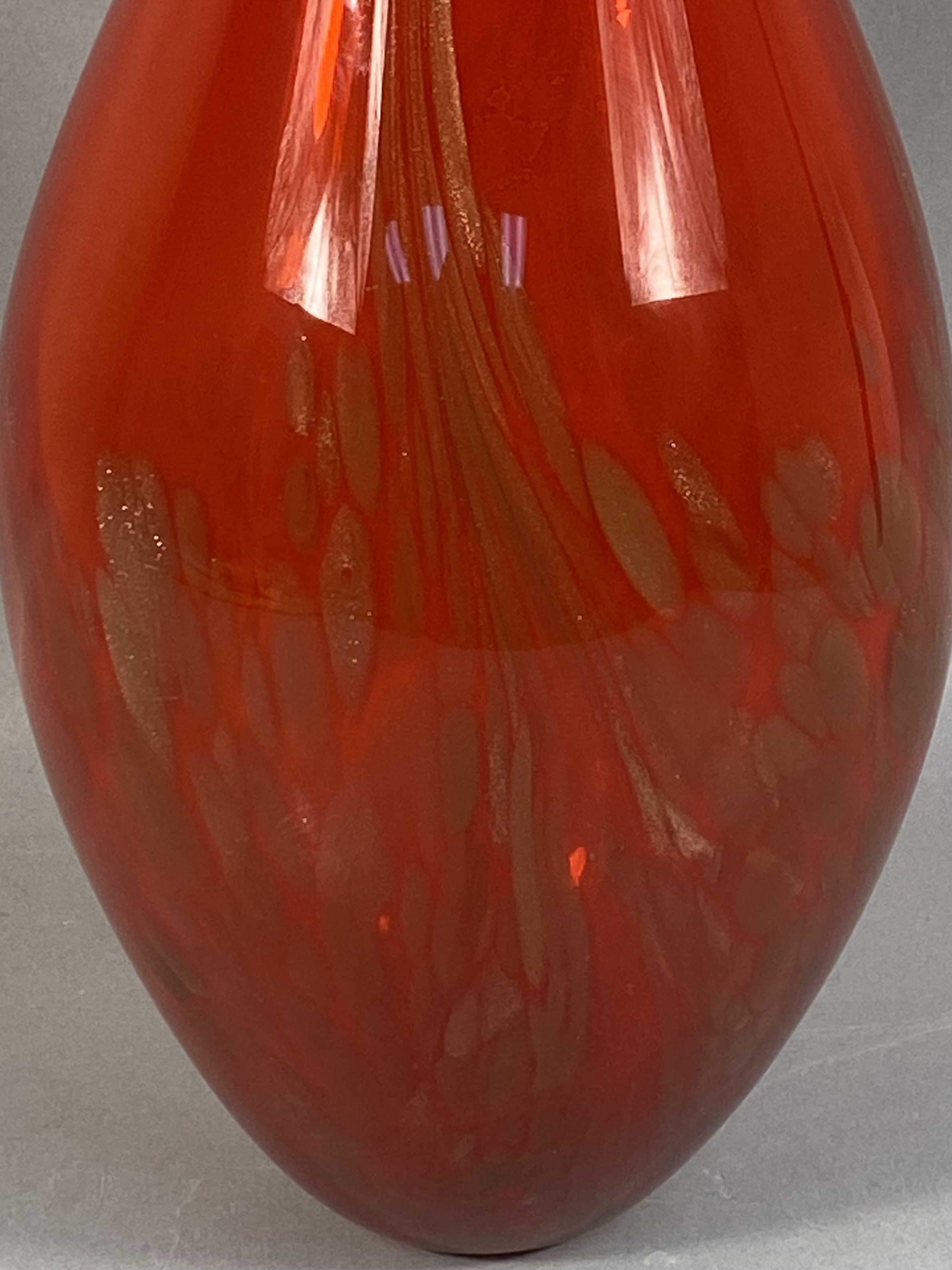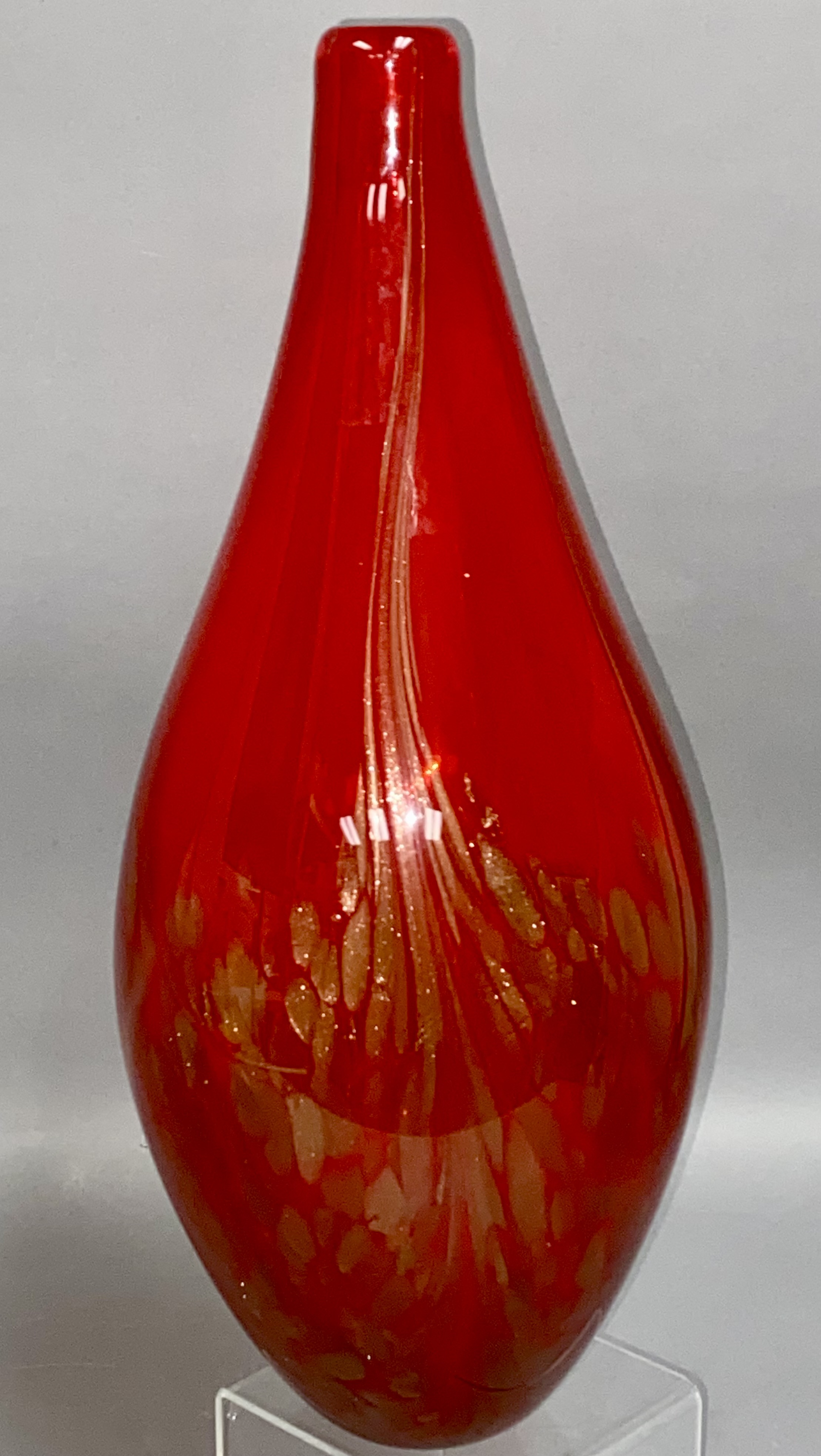 A large studio art glass vase featuring an elongated teardrop form. The vessel is composed of translucent ruby red glass. The lower half of the body contains internal gold-tone aventurine flecks and mottled amber-colored inclusions. Fine, vertical streaks of a lighter metallic or amber tone extend from the narrow, polished rim toward the center of the body. The piece is hand-blown with a smooth, polished finish. No maker marks are present. Measurement: 16 inches tall. Good overall condition. No visible chips, cracks, or repairs. Minor internal bubbles and variations consistent with hand-blown glass production.