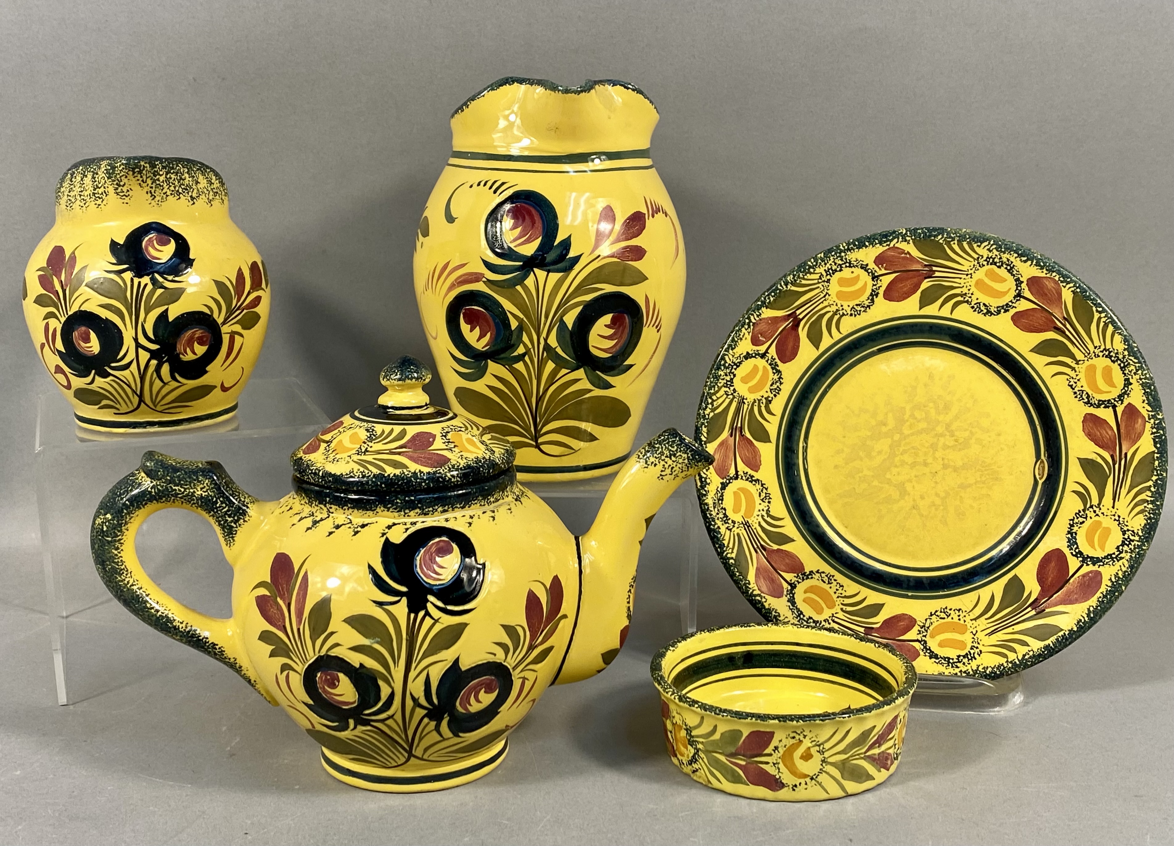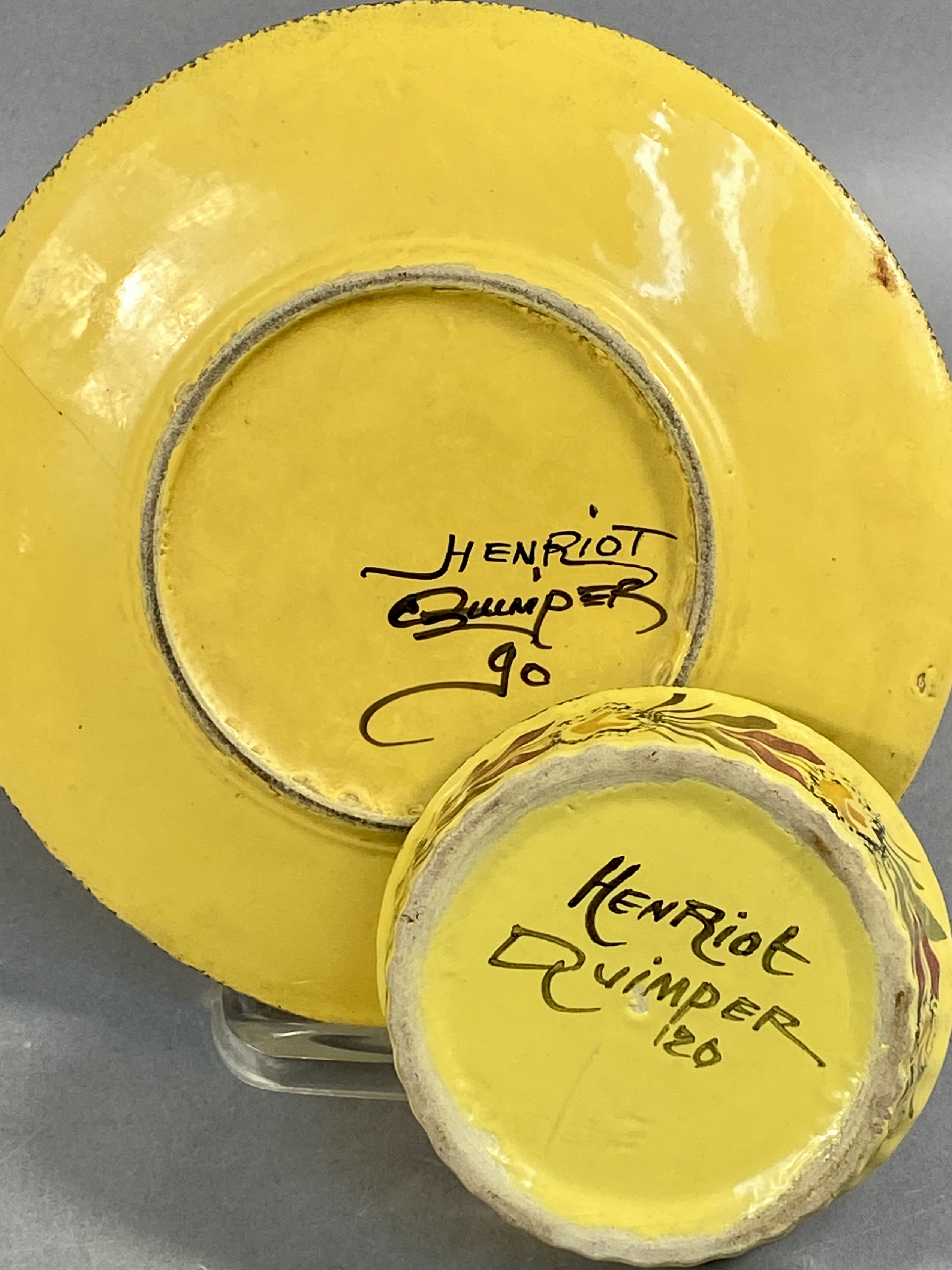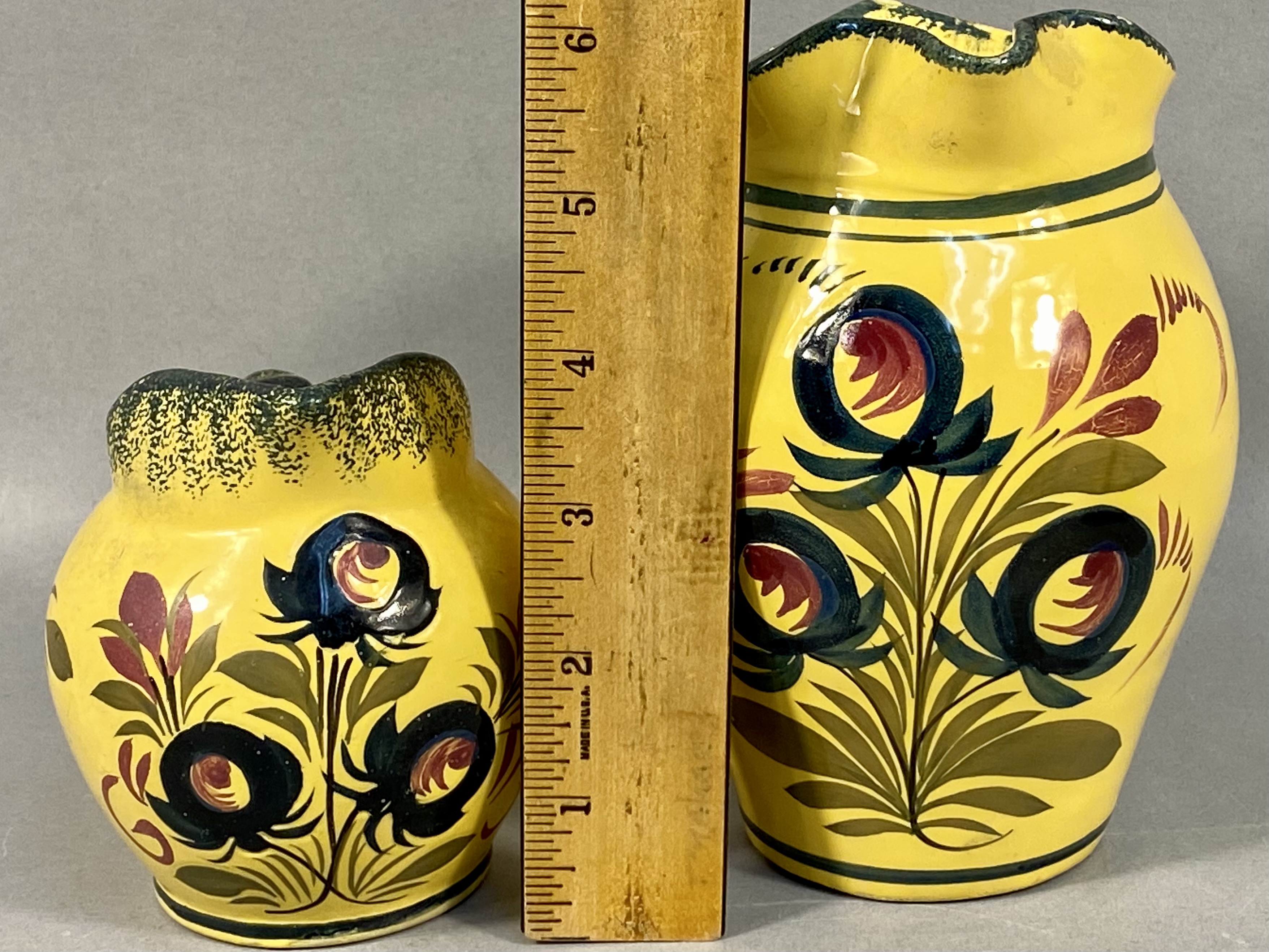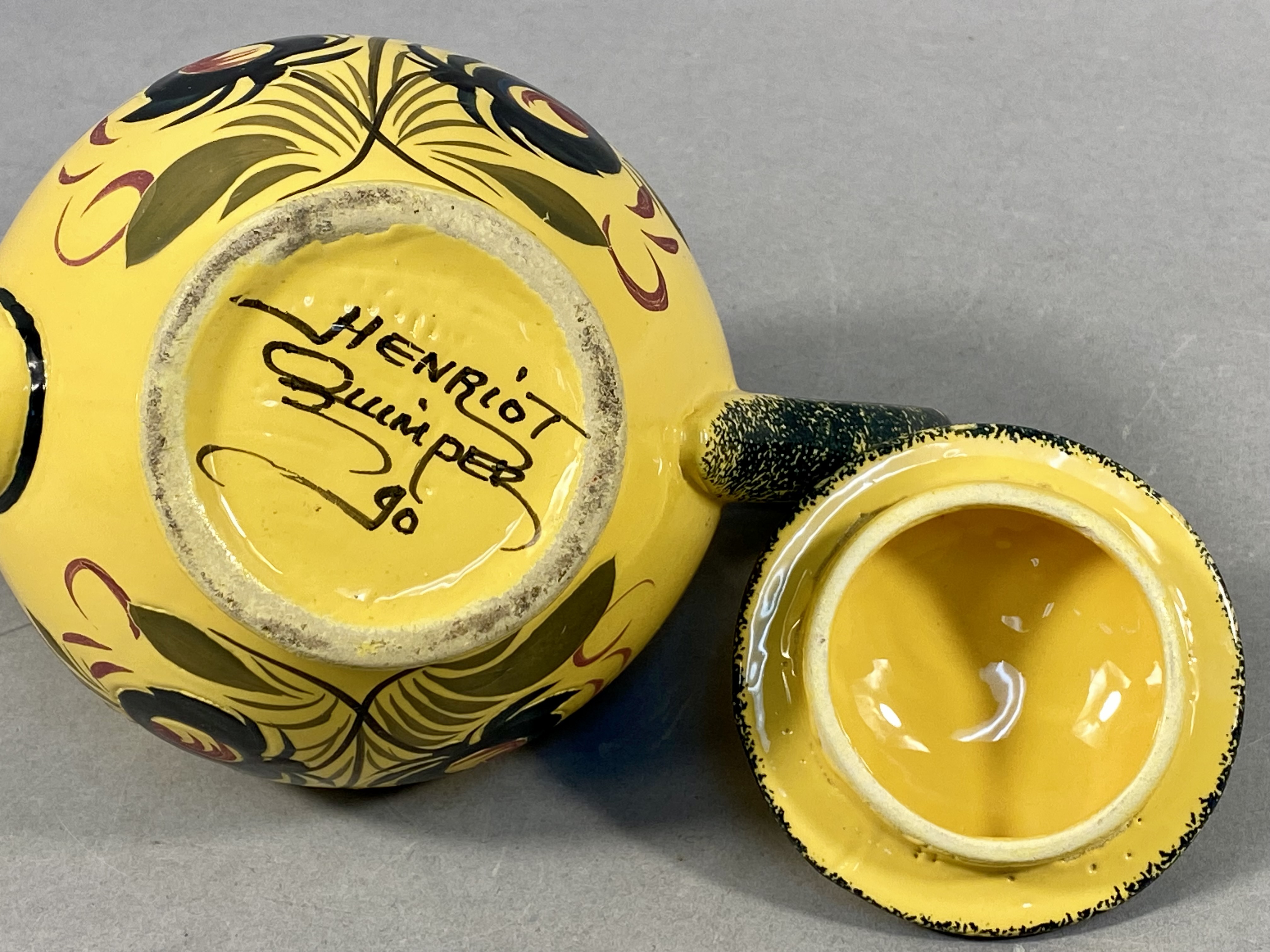 This set of glazed earthenware, or faience, is produced by Henriot Quimper in France. The collection consists of a large pitcher with a pinched spout, a small creamer pitcher, a globular teapot with a fitted lid, a small cylindrical bowl, and a circular plate. The pieces feature a traditional Breton style with a vibrant mustard-yellow ground decorated with hand-painted overglaze floral and foliate sprays in a palette of dark blue, forest green, and iron-red. The rims, handles, and lid finial are finished with a dark green sponged or stippled decorative border. Each item is hand-marked on the base in black with the Henriot Quimper signature and various numerical designations. Measurements: Large Pitcher: 6 inches (H) Small Pitcher: 3.75 inches (H) Teapot (with lid): 4.5 inches (H) Plate: 6.5 inches (Diameter). The teapot shows a small chip to the ceramic body at the tip of the spout. The plate has a visible hairline crack extending approximately 2 inches from the rim toward the center, most clearly seen on the underside. The set exhibits minor surface wear, shelf wear on the unglazed foot rings, and small glaze pinholes or pitting consistent with the manufacturing process of traditional faience. No other major chips, cracks, or professional repairs are noted.