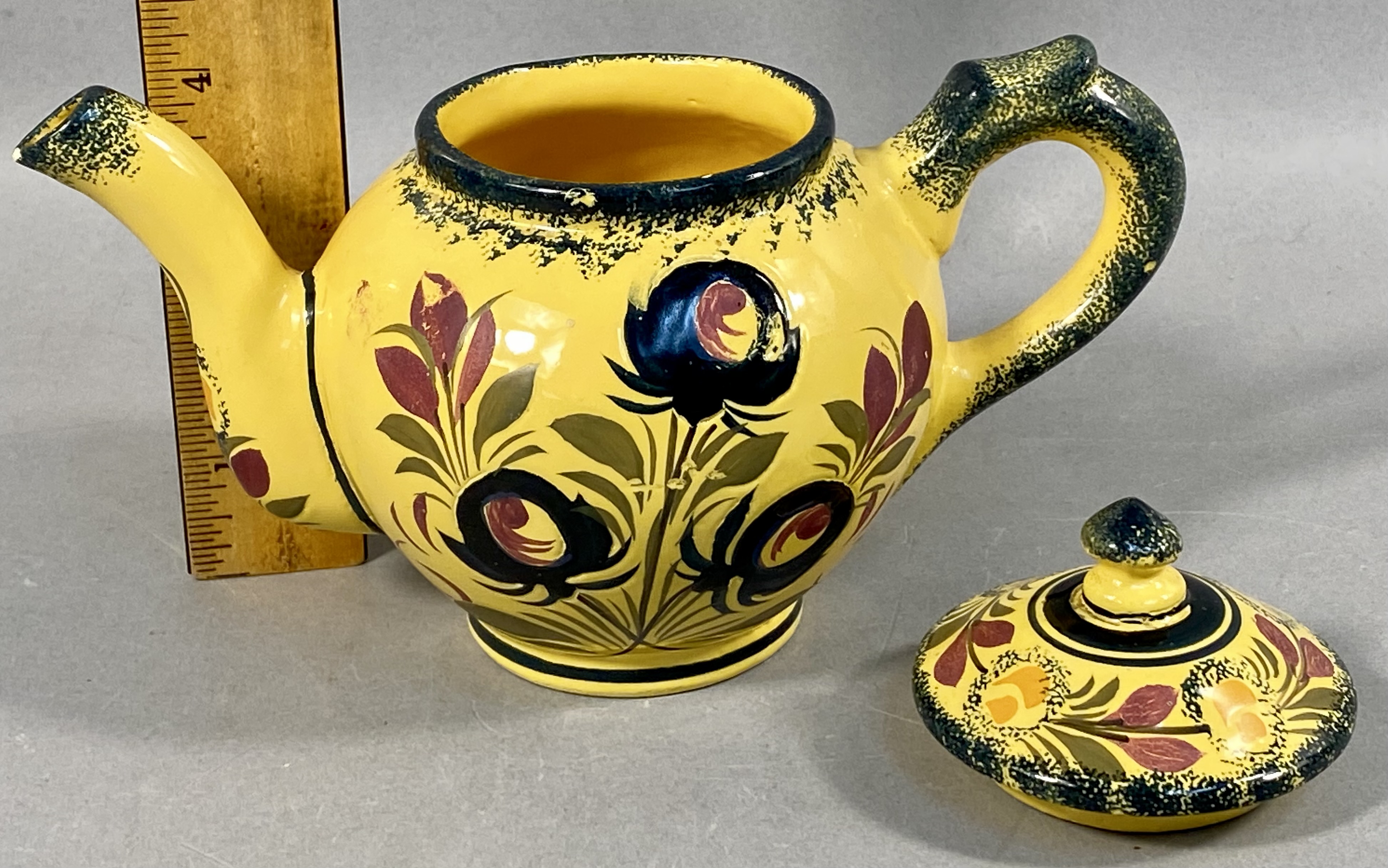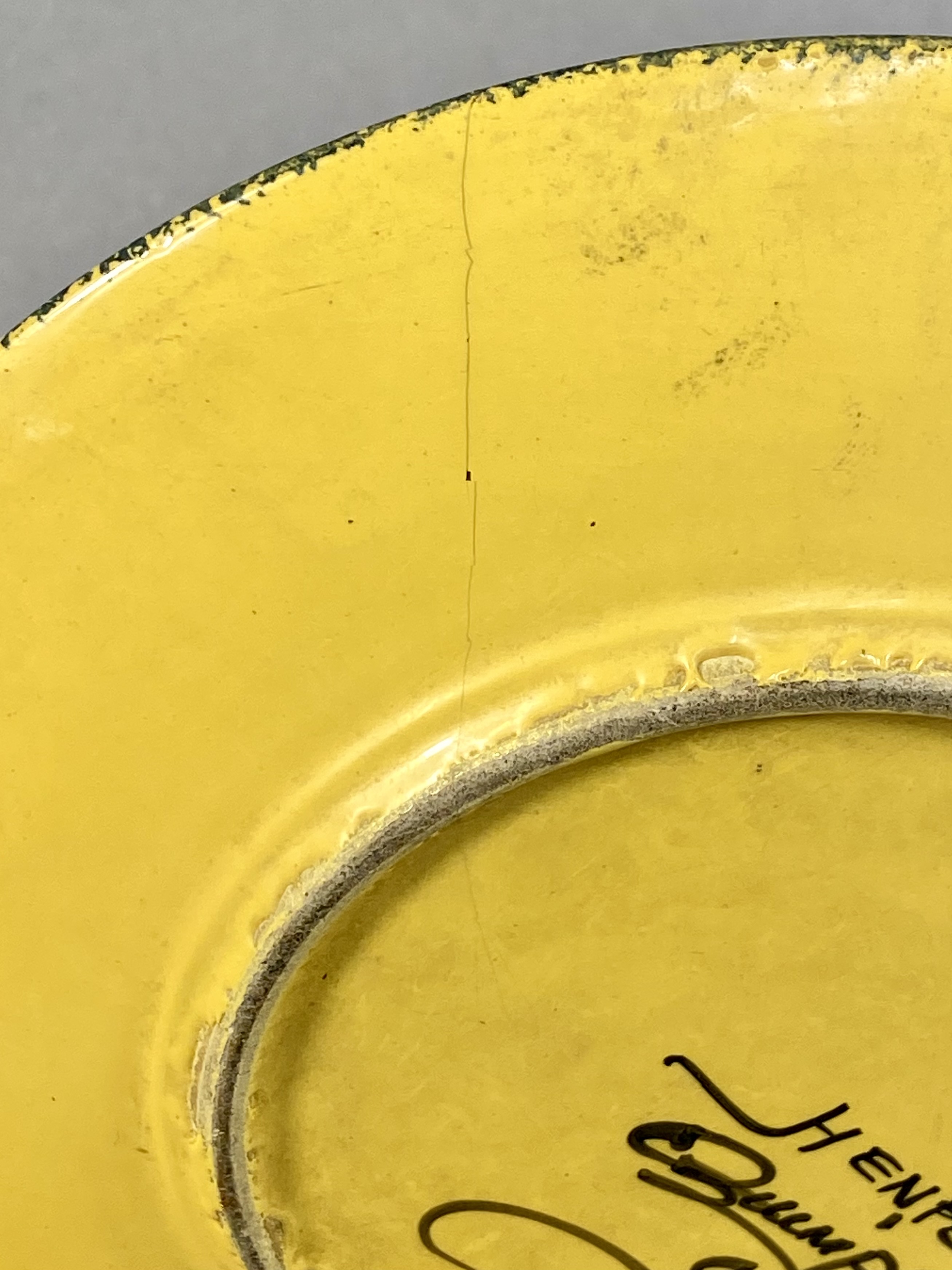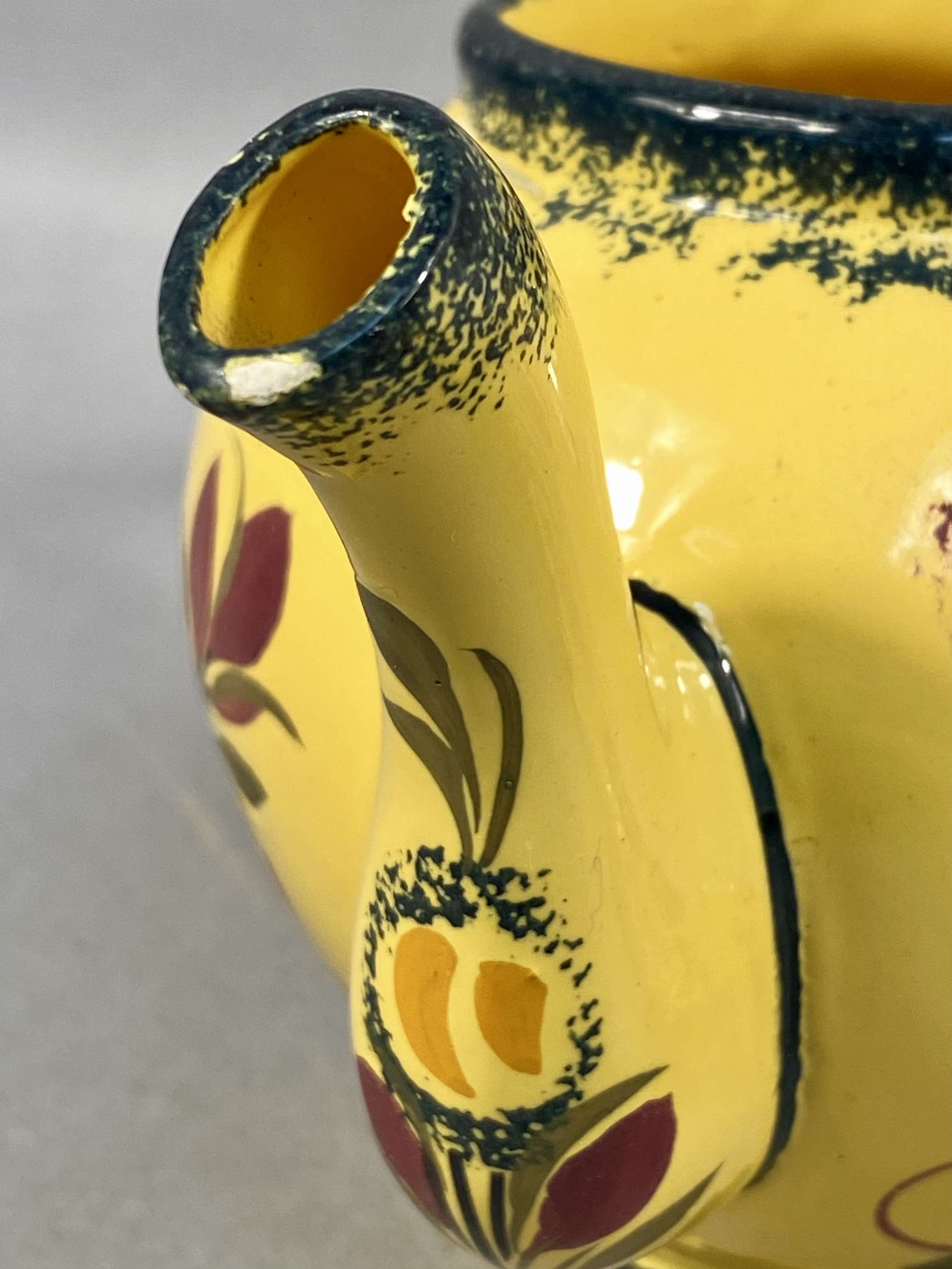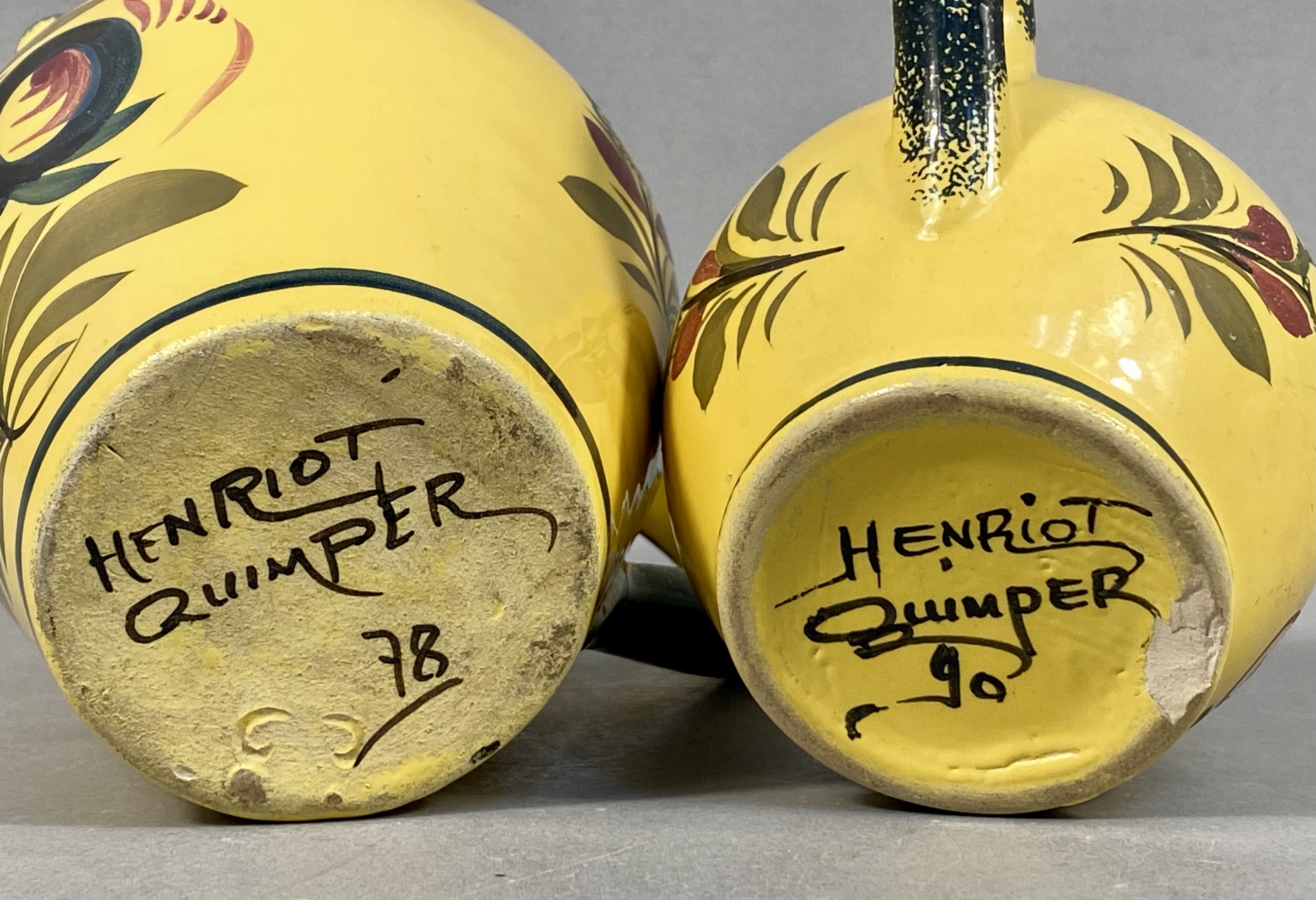 This set of glazed earthenware, or faience, is produced by Henriot Quimper in France. The collection consists of a large pitcher with a pinched spout, a small creamer pitcher, a globular teapot with a fitted lid, a small cylindrical bowl, and a circular plate. The pieces feature a traditional Breton style with a vibrant mustard-yellow ground decorated with hand-painted overglaze floral and foliate sprays in a palette of dark blue, forest green, and iron-red. The rims, handles, and lid finial are finished with a dark green sponged or stippled decorative border. Each item is hand-marked on the base in black with the Henriot Quimper signature and various numerical designations. Measurements: Large Pitcher: 6 inches (H) Small Pitcher: 3.75 inches (H) Teapot (with lid): 4.5 inches (H) Plate: 6.5 inches (Diameter). The teapot shows a small chip to the ceramic body at the tip of the spout. The plate has a visible hairline crack extending approximately 2 inches from the rim toward the center, most clearly seen on the underside. The set exhibits minor surface wear, shelf wear on the unglazed foot rings, and small glaze pinholes or pitting consistent with the manufacturing process of traditional faience. No other major chips, cracks, or professional repairs are noted.