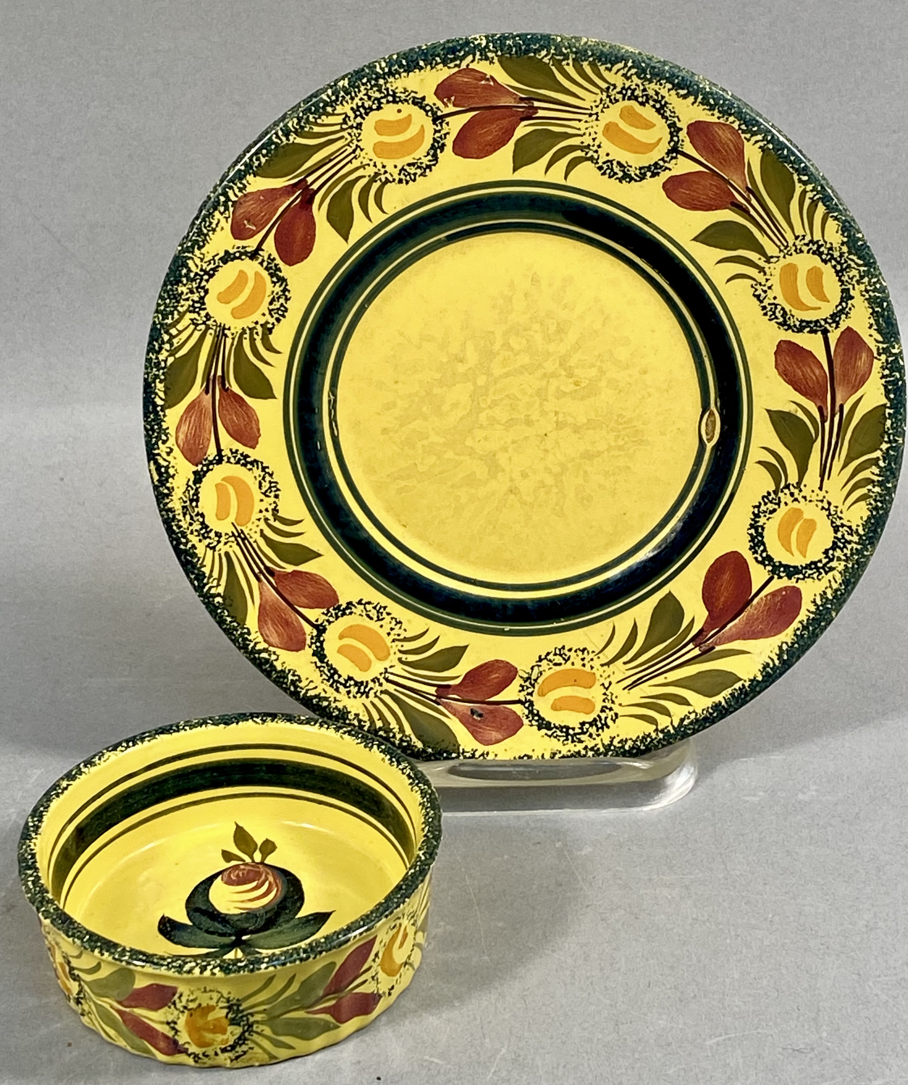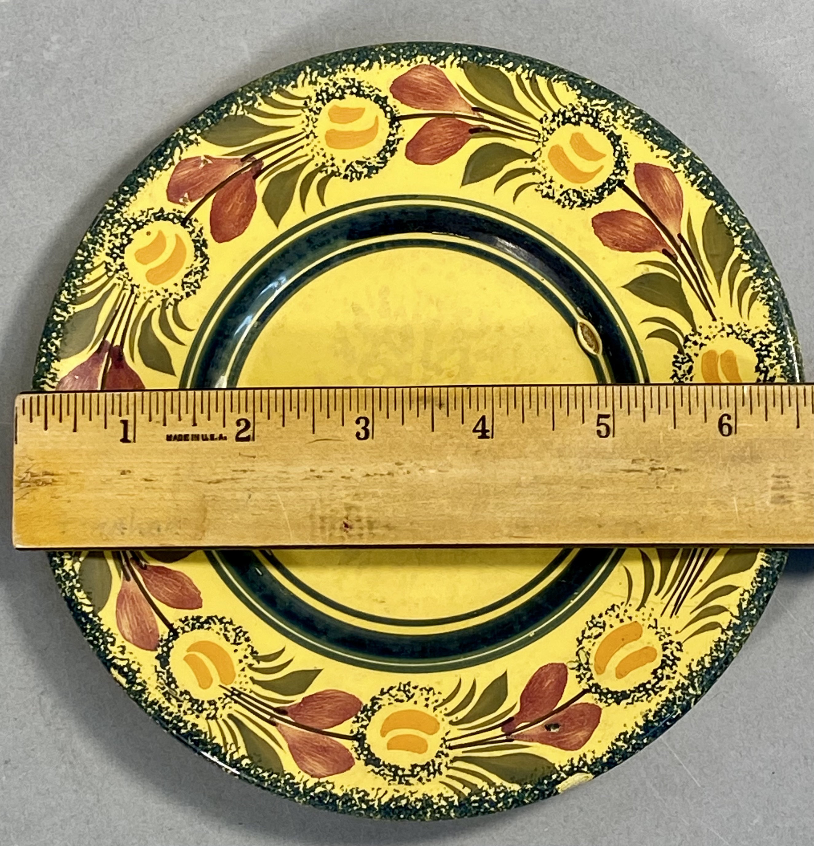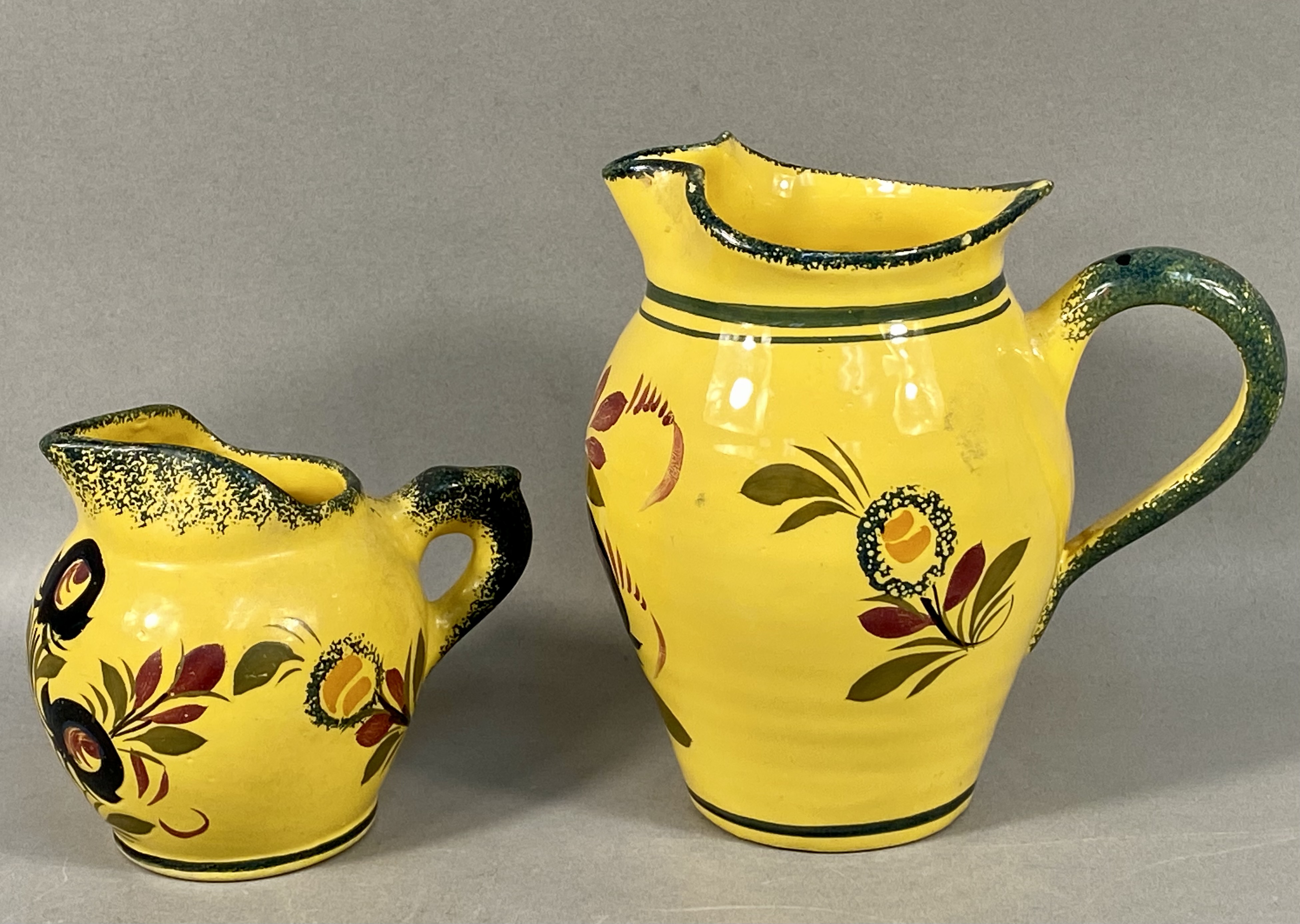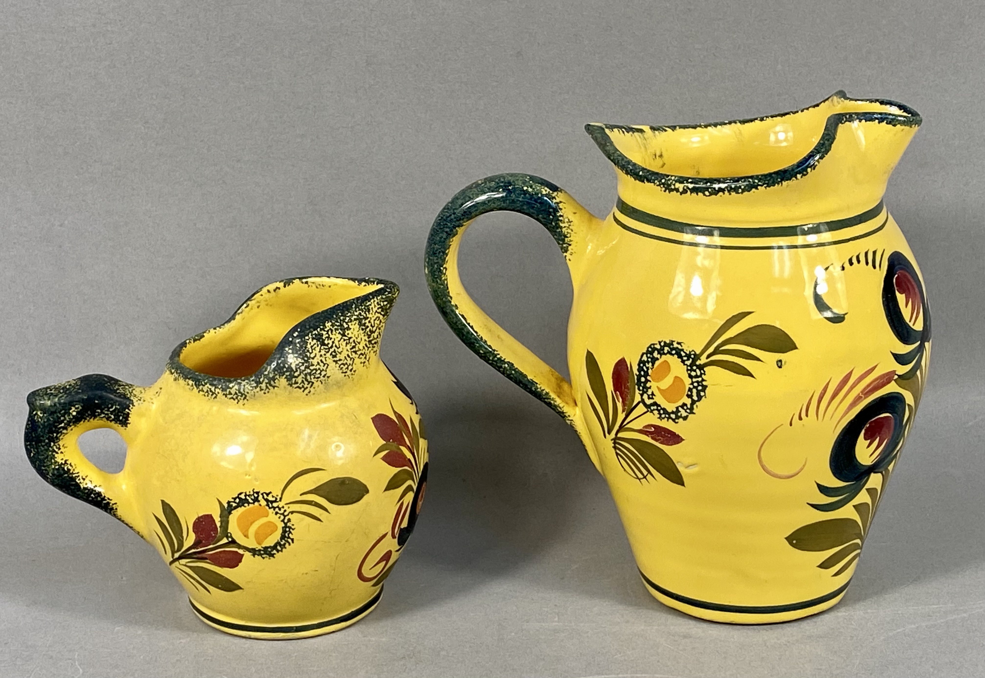 This set of glazed earthenware, or faience, is produced by Henriot Quimper in France. The collection consists of a large pitcher with a pinched spout, a small creamer pitcher, a globular teapot with a fitted lid, a small cylindrical bowl, and a circular plate. The pieces feature a traditional Breton style with a vibrant mustard-yellow ground decorated with hand-painted overglaze floral and foliate sprays in a palette of dark blue, forest green, and iron-red. The rims, handles, and lid finial are finished with a dark green sponged or stippled decorative border. Each item is hand-marked on the base in black with the Henriot Quimper signature and various numerical designations. Measurements: Large Pitcher: 6 inches (H) Small Pitcher: 3.75 inches (H) Teapot (with lid): 4.5 inches (H) Plate: 6.5 inches (Diameter). The teapot shows a small chip to the ceramic body at the tip of the spout. The plate has a visible hairline crack extending approximately 2 inches from the rim toward the center, most clearly seen on the underside. The set exhibits minor surface wear, shelf wear on the unglazed foot rings, and small glaze pinholes or pitting consistent with the manufacturing process of traditional faience. No other major chips, cracks, or professional repairs are noted.