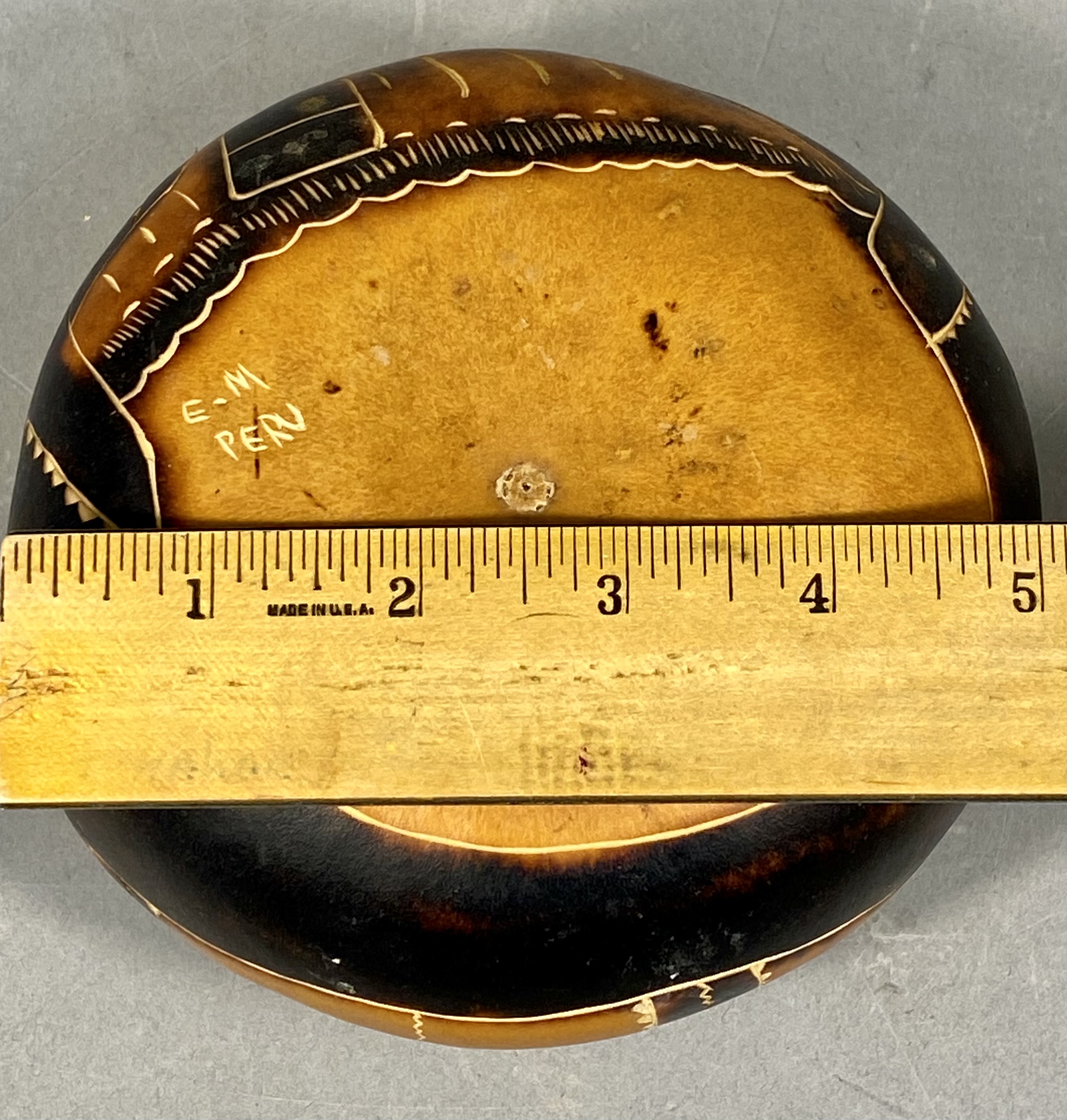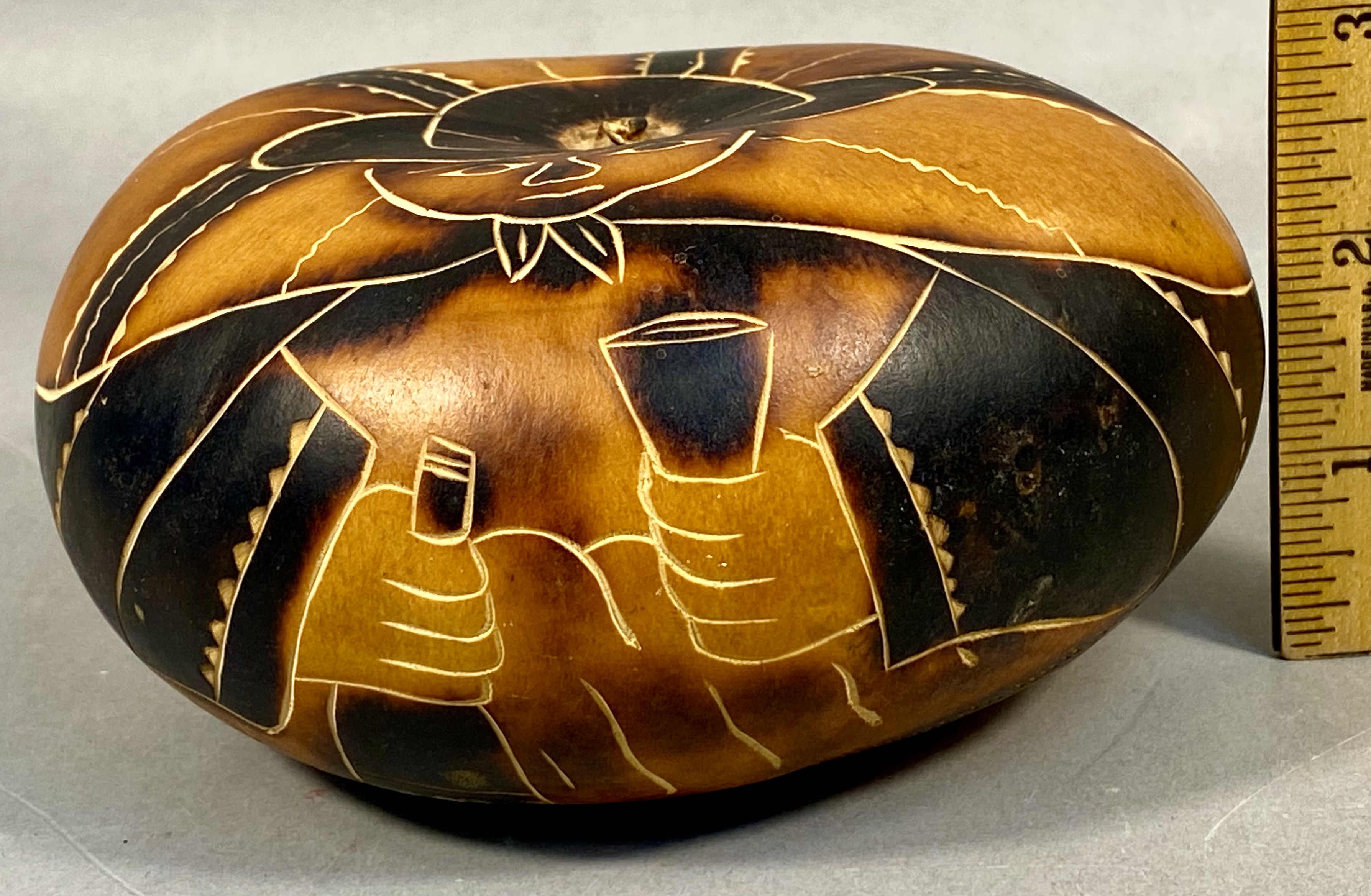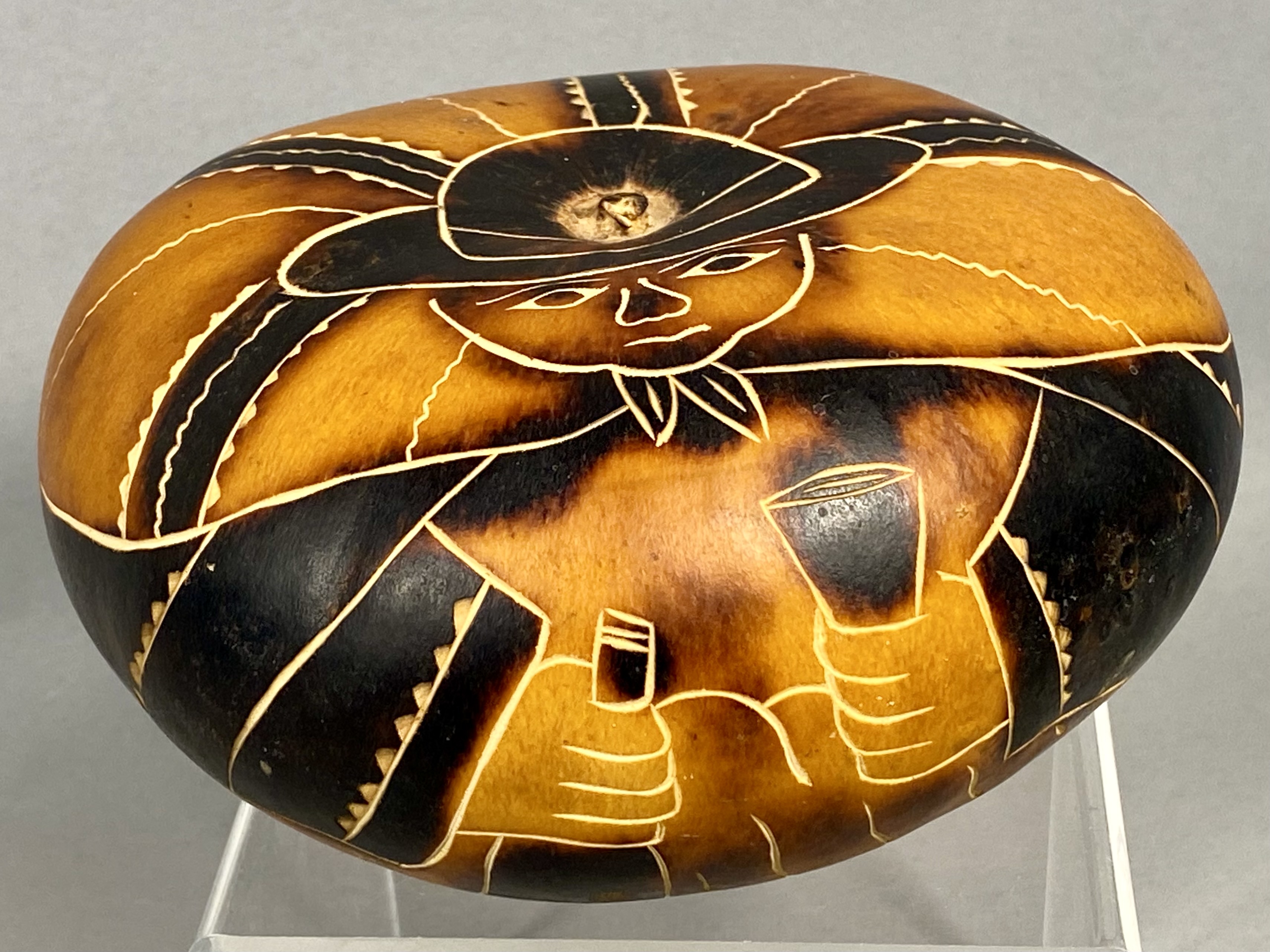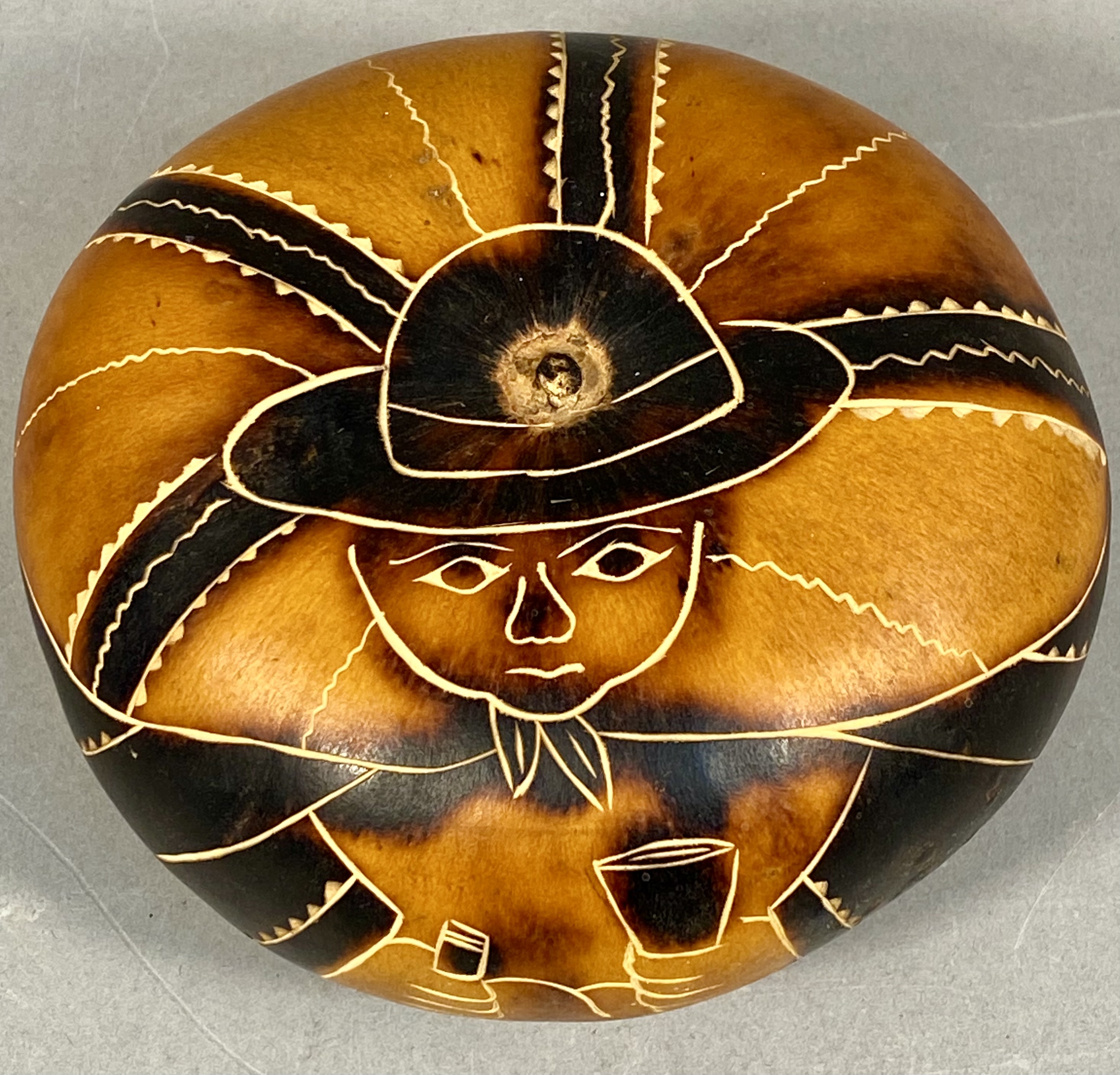 A contemporary Peruvian folk art gourd, traditionally known as a Mate Burilado, crafted from a dried Lagenaria siceraria gourd. The surface is decorated using fine-line carving and pyrography techniques to achieve varying shades of brown and tan. The primary motif features a stylized human figure in traditional Andean attire, including a broad-brimmed hat and a poncho with geometric borders. The figure is depicted holding a small bottle in one hand and a flared cup in the other, a scene associated with festive social gatherings. The composition is accented by radiating decorative bands with serrated edges creating a sunburst effect. The base is hand-inscribed with the mark E-M and PERU. Measurement: 5 inches wide X 2.5 inches tall The item is in good overall condition. The natural surface shows various shades achieved through the burning process. There are no apparent cracks or structural damage to the carved surface. Minor surface wear and natural variations in the gourd texture are present.