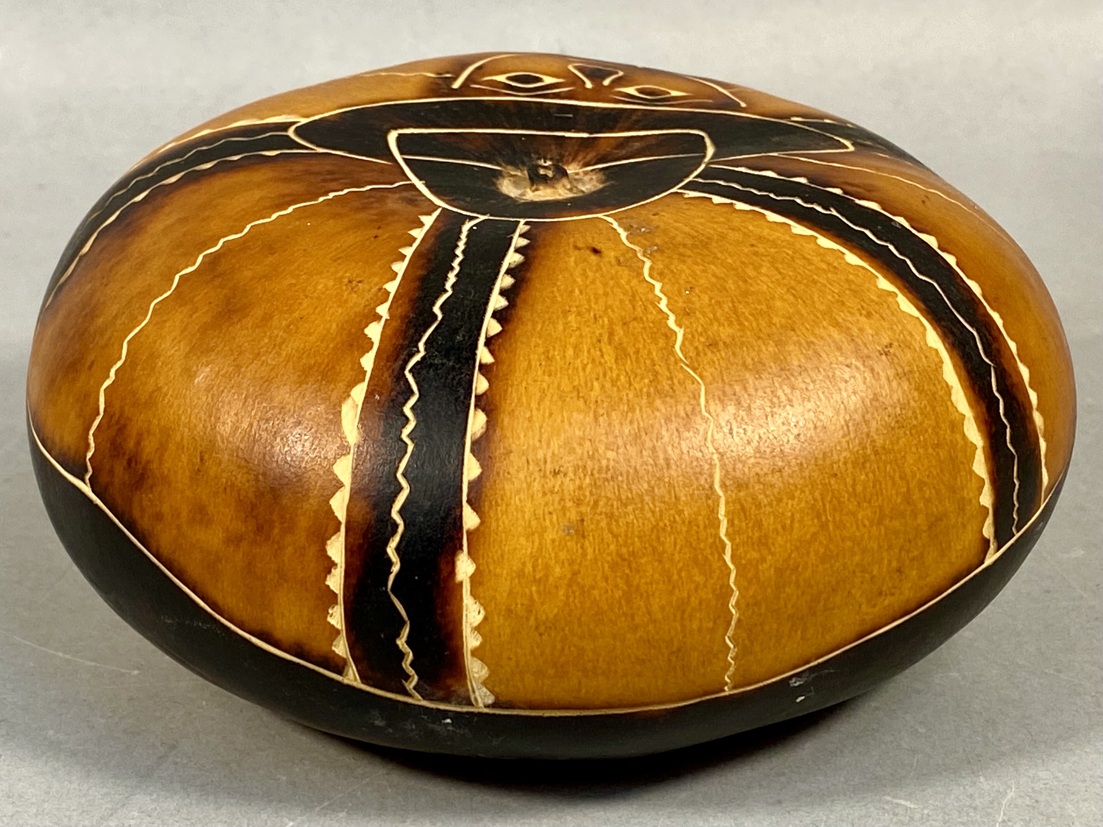 The item is in good overall condition. The natural surface shows various shades achieved through the burning process. There are no apparent cracks or structural damage to the carved surface. Minor surface wear and natural variations in the gourd texture are present.