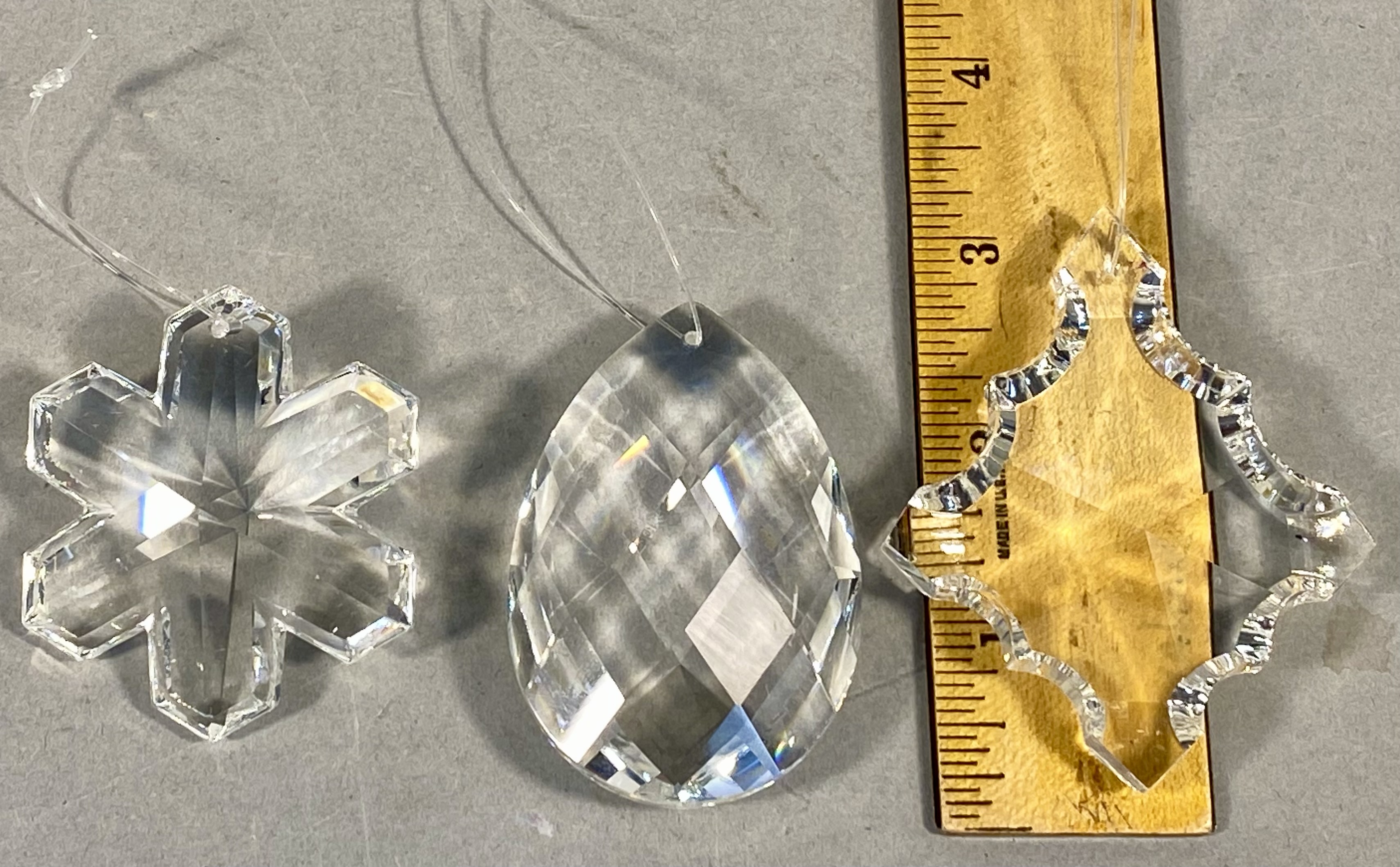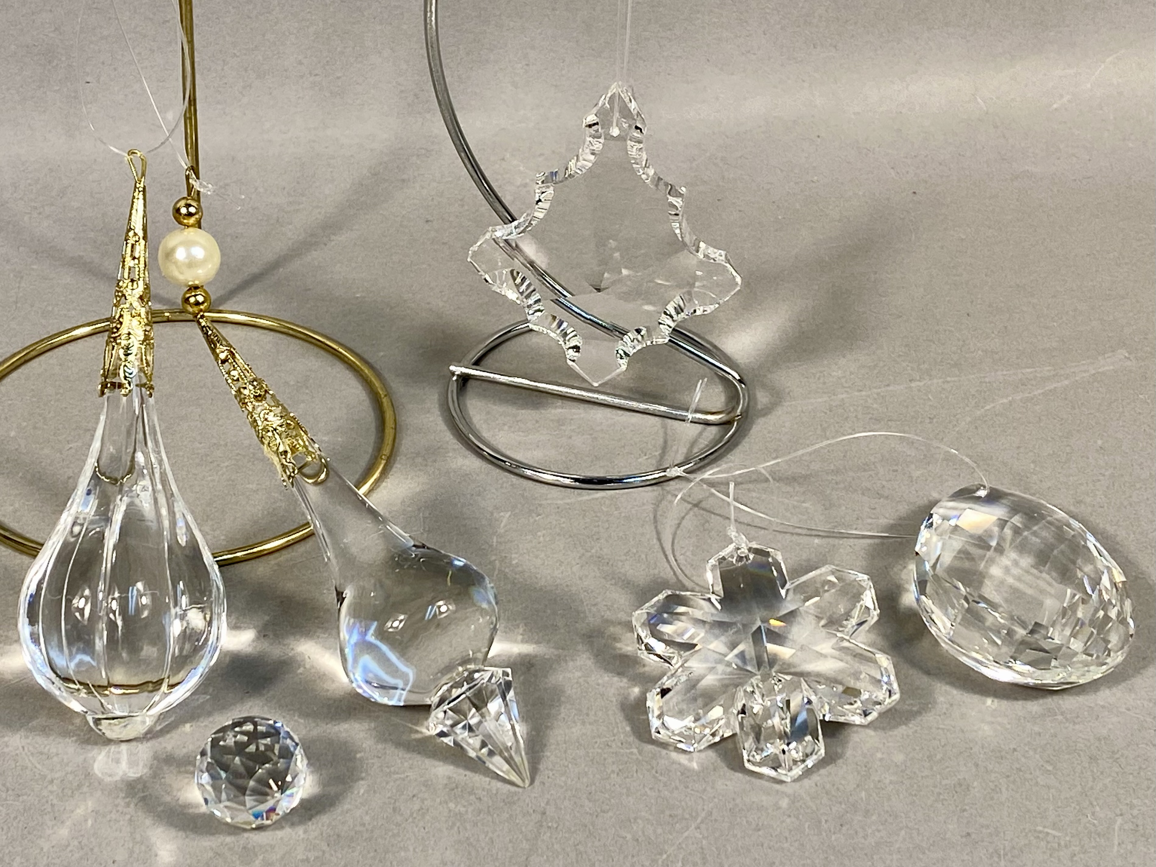 A collection of six clear decorative ornaments or suncatchers composed of faceted crystal and blown glass. The grouping includes two teardrop ornaments featuring ornate gold-toned metal filigree caps. One teardrop ornament has a ribbed, blown-glass body, while the second is smooth-bodied with a faceted pointed finial at the base and faux pearl beads on the hanging wire. The set further contains two faceted crystal ornaments, including a stylized six-point snowflake and a pear-shaped drop. Also present is a multifaceted crystal sphere with a suspension hole and an abstract glass ornament with scalloped, ice-like faceted edges. No maker marks or signatures are present on the surfaces of these items. Abstract ornament height: 3.5 inches. The ornaments are in good condition overall. There are no visible chips, cracks, or significant scratches to the glass or crystal surfaces. The gold-toned metal caps show minor surface wear and patina consistent with age and use.