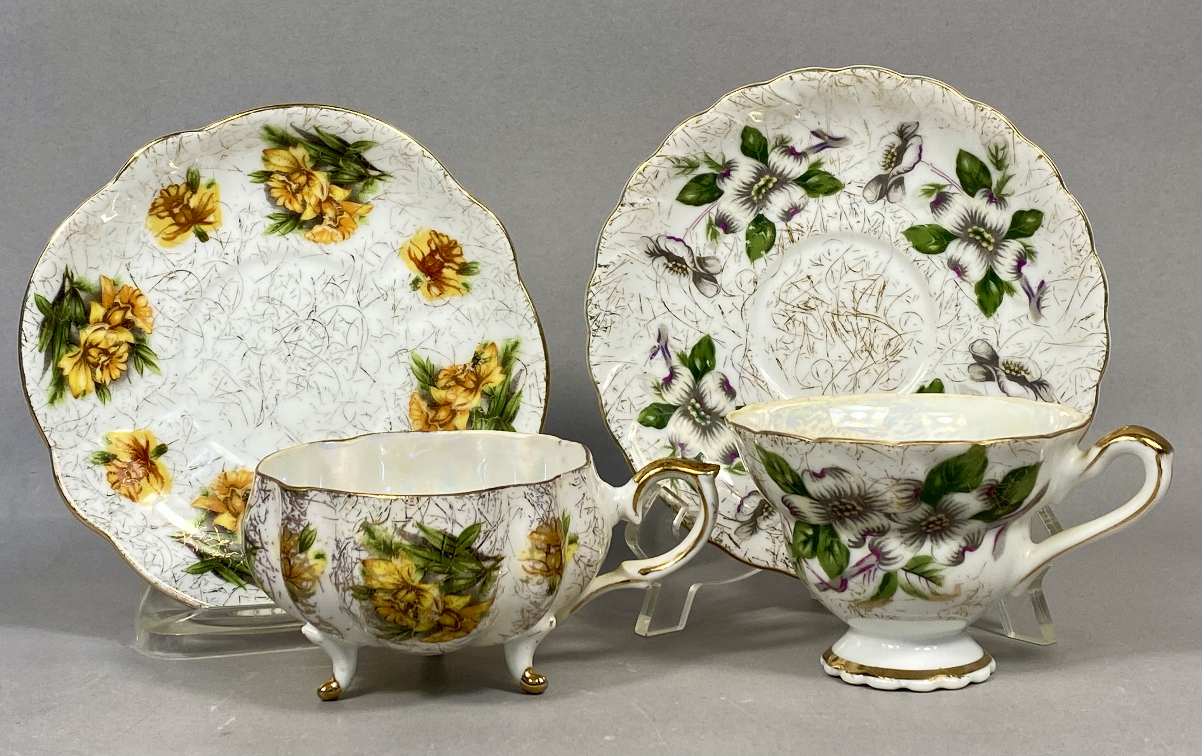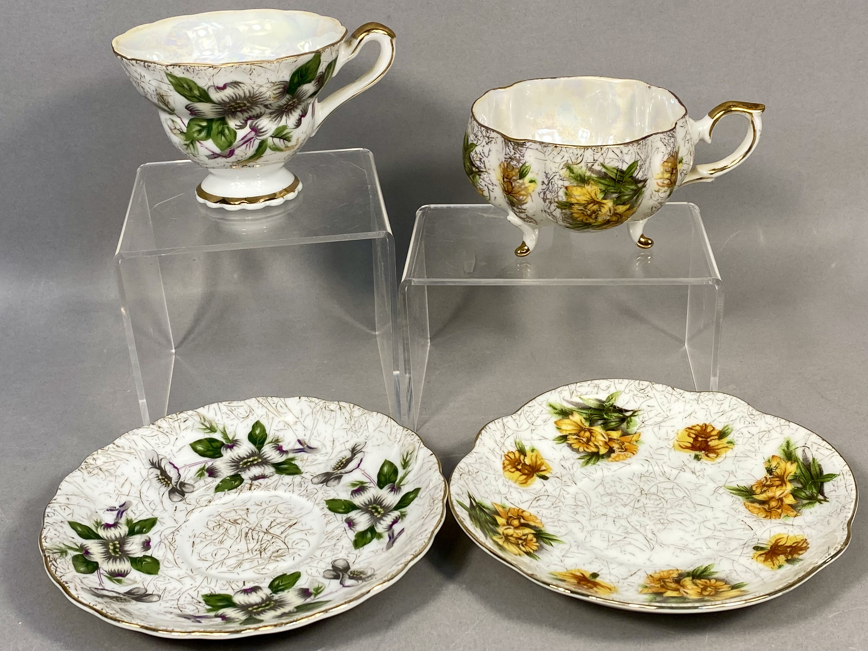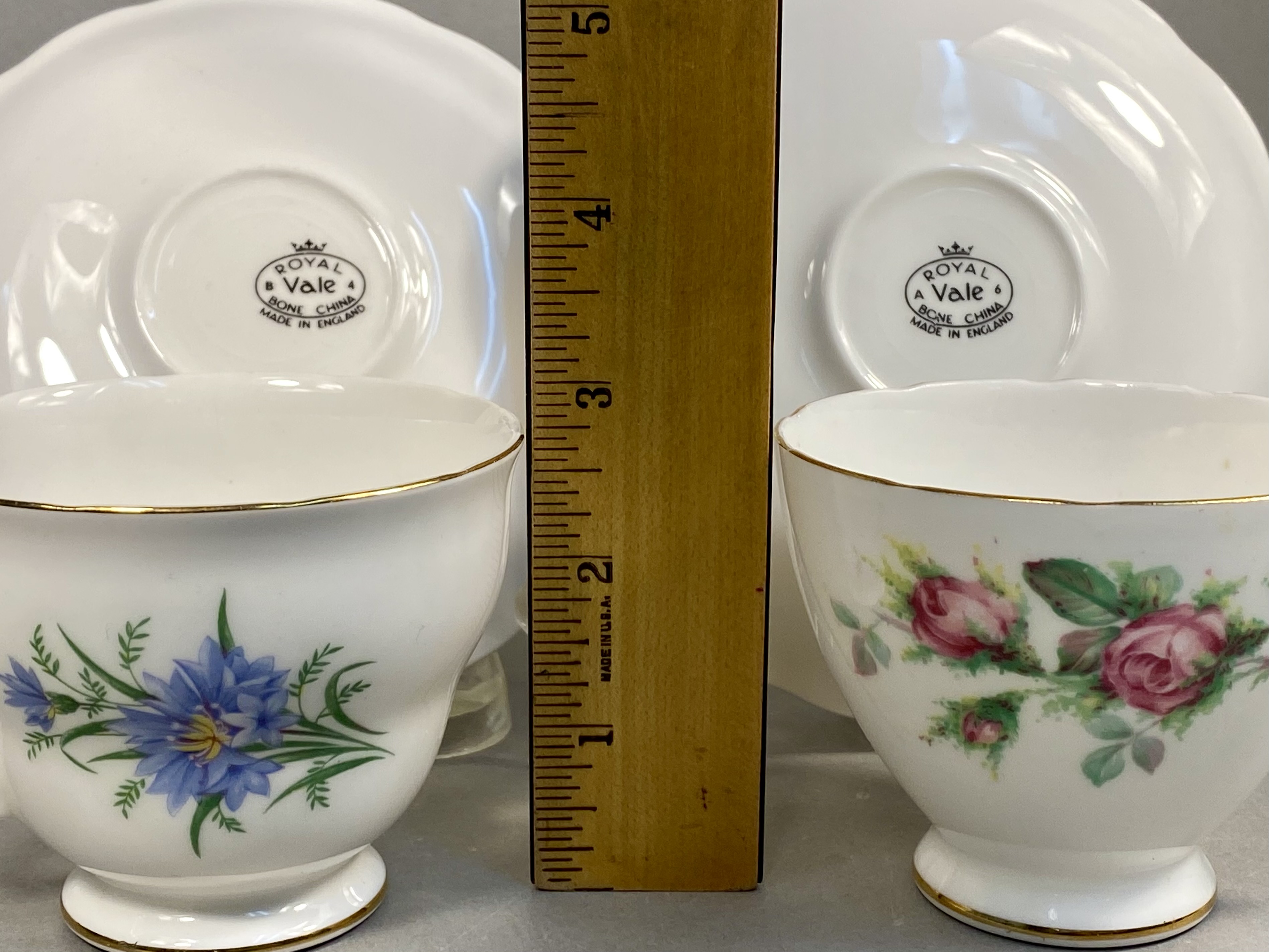 This collection includes four vintage teacup and saucer sets of English and Japanese origin. Two sets are produced by Royal Vale, a brand of Ridgway Potteries Ltd., England. These bone china sets feature transfer-printed floral designs, including one blue cornflower pattern and one pink rosebud pattern. Both English sets consist of scalloped saucers and matching footed teacups with scrolled handles and gilt rims. The bases are marked with a crown above an oval reading Royal Vale Bone China Made in England. The remaining two sets are Japanese porcelain lusterware. One set features a yellow floral pattern on a lobed cup supported by three gilt-tipped peg feet with a matching scalloped saucer. The second Japanese set features a white floral pattern on a pedestal-footed cup. Both Japanese sets are decorated with a gold-veined marbleized ground, heavy gilt handles, and iridescent luster-glazed interiors. One saucer retains a red and silver foil manufacturer sticker for Relco, Japan. Measurements: Cup Height: Approximately 2.5 to 3 inches Saucer Diameter: Approximately 5.5 inches. The saucer of the blue cornflower set has a visible hairline crack extending from the rim toward the center. The remaining pieces are in good vintage condition with no other chips, cracks, or repairs. There is light, age-appropriate wear to the gilt trim and base rims. Minor manufacturing imperfections may be present.