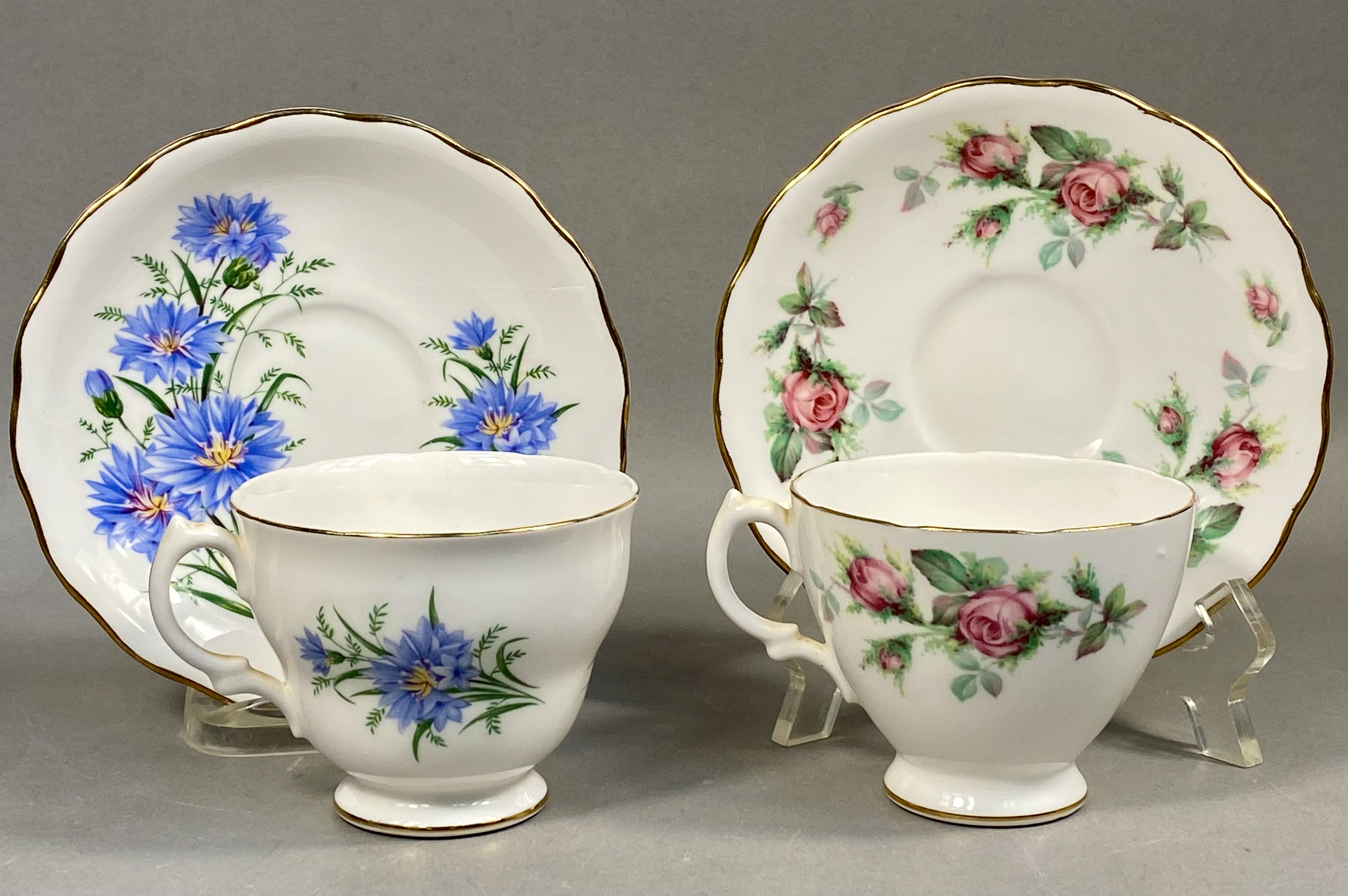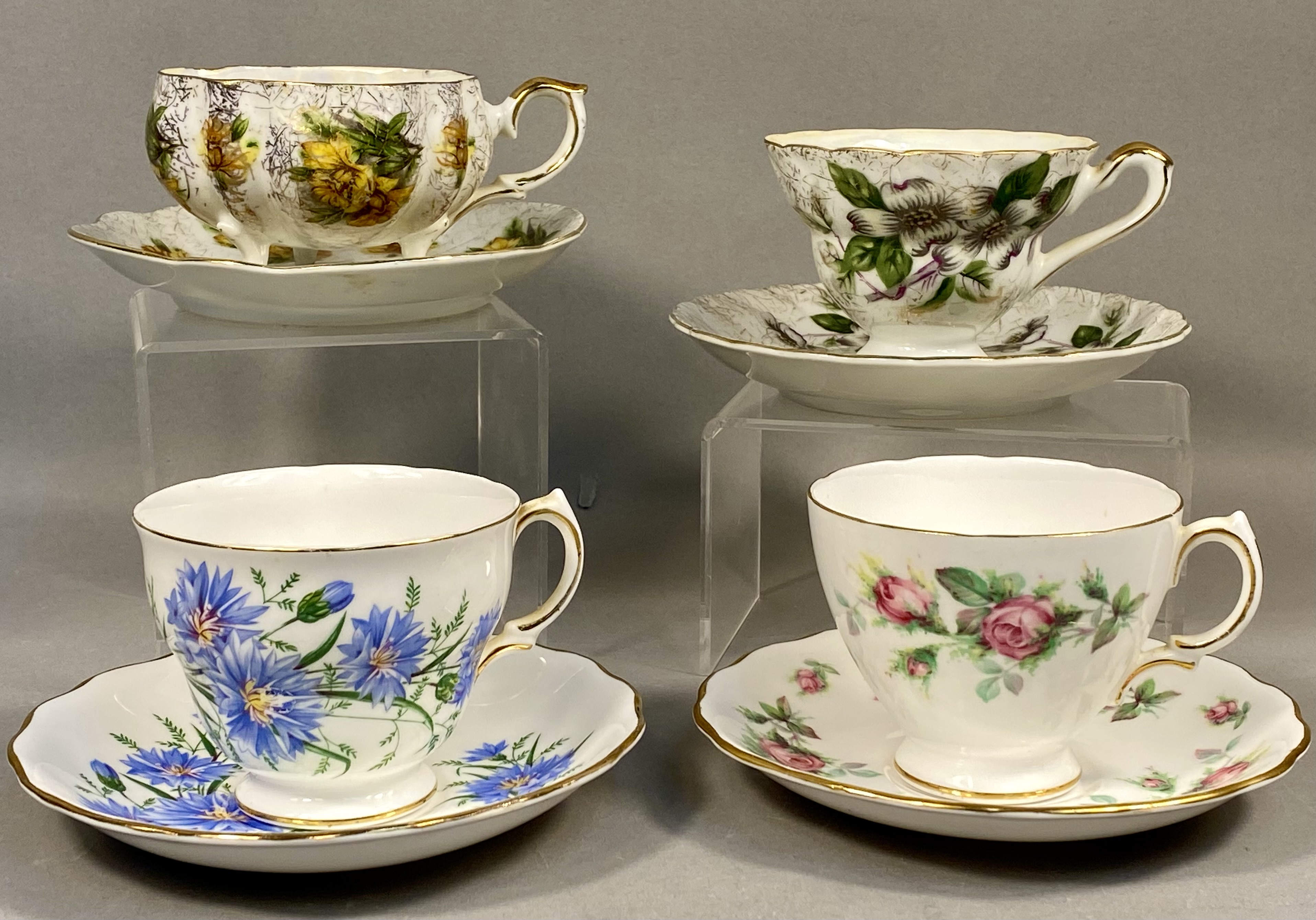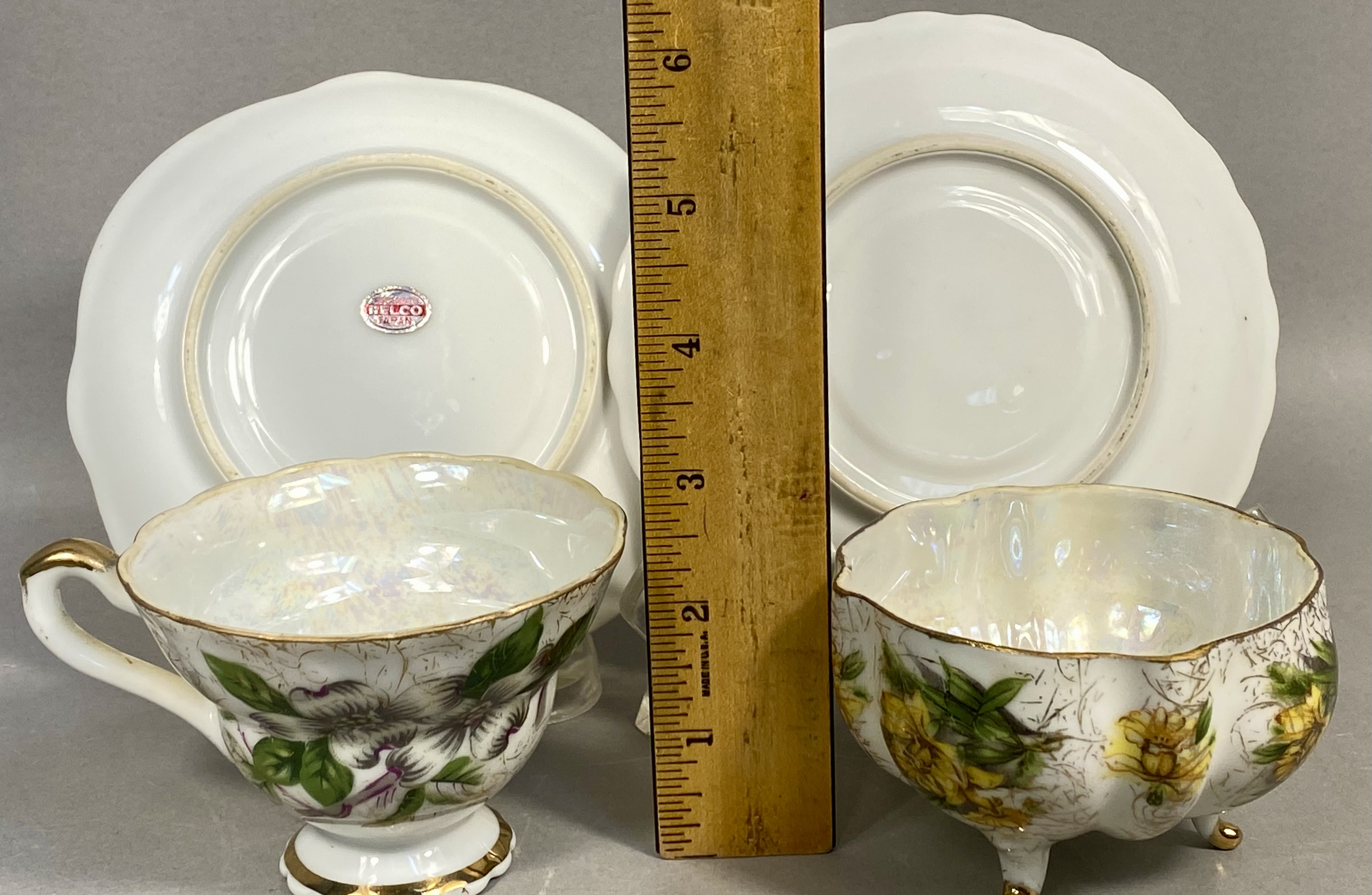 This collection includes four vintage teacup and saucer sets of English and Japanese origin. Two sets are produced by Royal Vale, a brand of Ridgway Potteries Ltd., England. These bone china sets feature transfer-printed floral designs, including one blue cornflower pattern and one pink rosebud pattern. Both English sets consist of scalloped saucers and matching footed teacups with scrolled handles and gilt rims. The bases are marked with a crown above an oval reading Royal Vale Bone China Made in England. The remaining two sets are Japanese porcelain lusterware. One set features a yellow floral pattern on a lobed cup supported by three gilt-tipped peg feet with a matching scalloped saucer. The second Japanese set features a white floral pattern on a pedestal-footed cup. Both Japanese sets are decorated with a gold-veined marbleized ground, heavy gilt handles, and iridescent luster-glazed interiors. One saucer retains a red and silver foil manufacturer sticker for Relco, Japan. Measurements: Cup Height: Approximately 2.5 to 3 inches Saucer Diameter: Approximately 5.5 inches. The saucer of the blue cornflower set has a visible hairline crack extending from the rim toward the center. The remaining pieces are in good vintage condition with no other chips, cracks, or repairs. There is light, age-appropriate wear to the gilt trim and base rims. Minor manufacturing imperfections may be present.