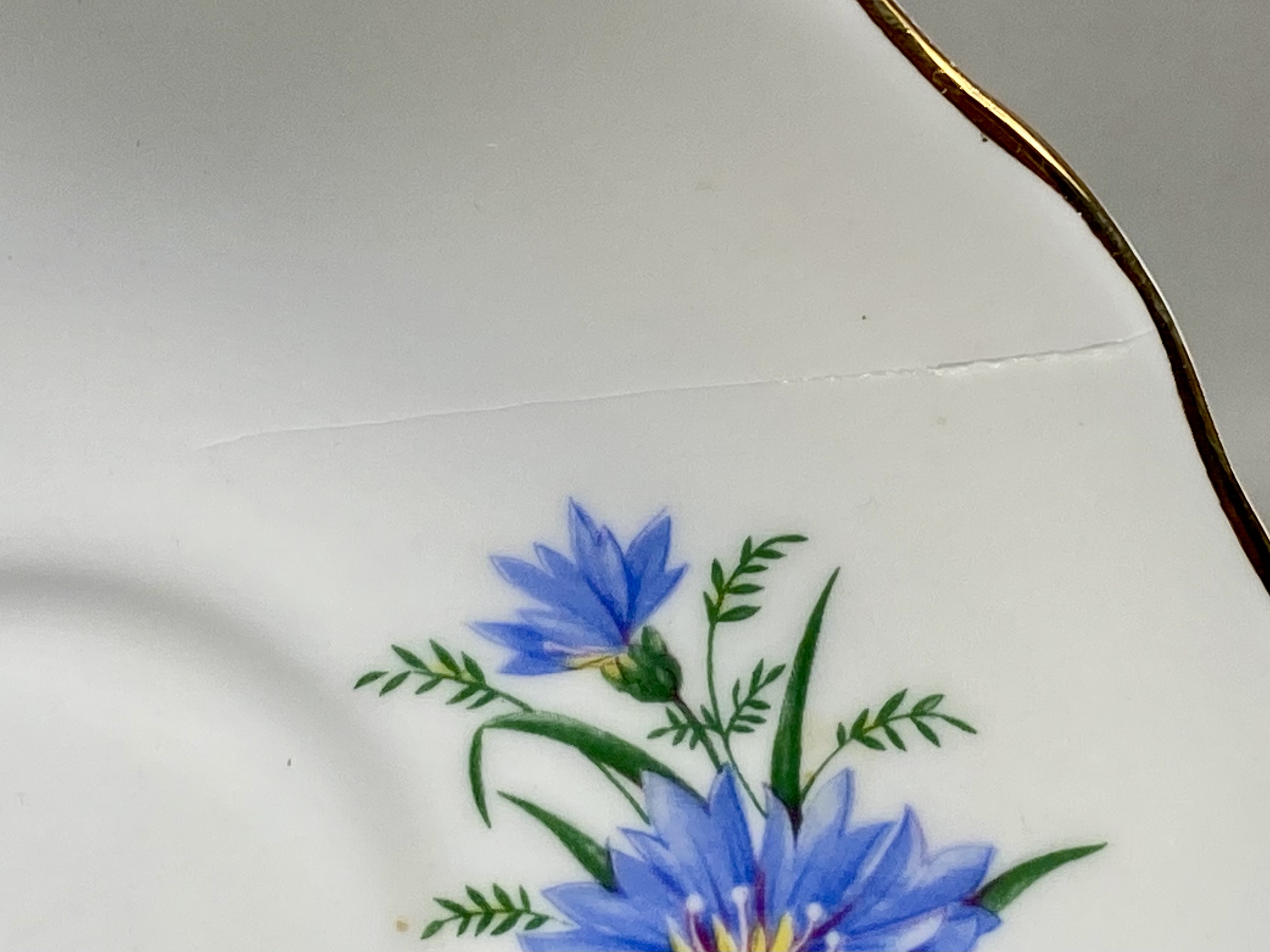 The saucer of the blue cornflower set has a visible hairline crack extending from the rim toward the center. The remaining pieces are in good vintage condition with no other chips, cracks, or repairs. There is light, age-appropriate wear to the gilt trim and base rims. Minor manufacturing imperfections may be present.