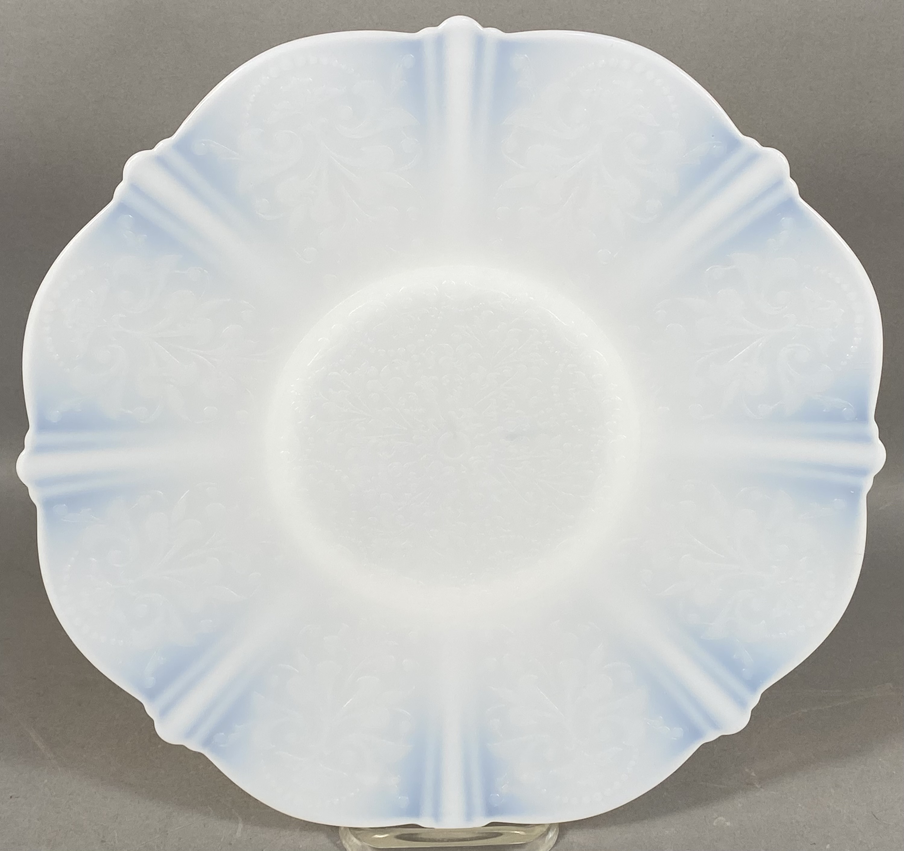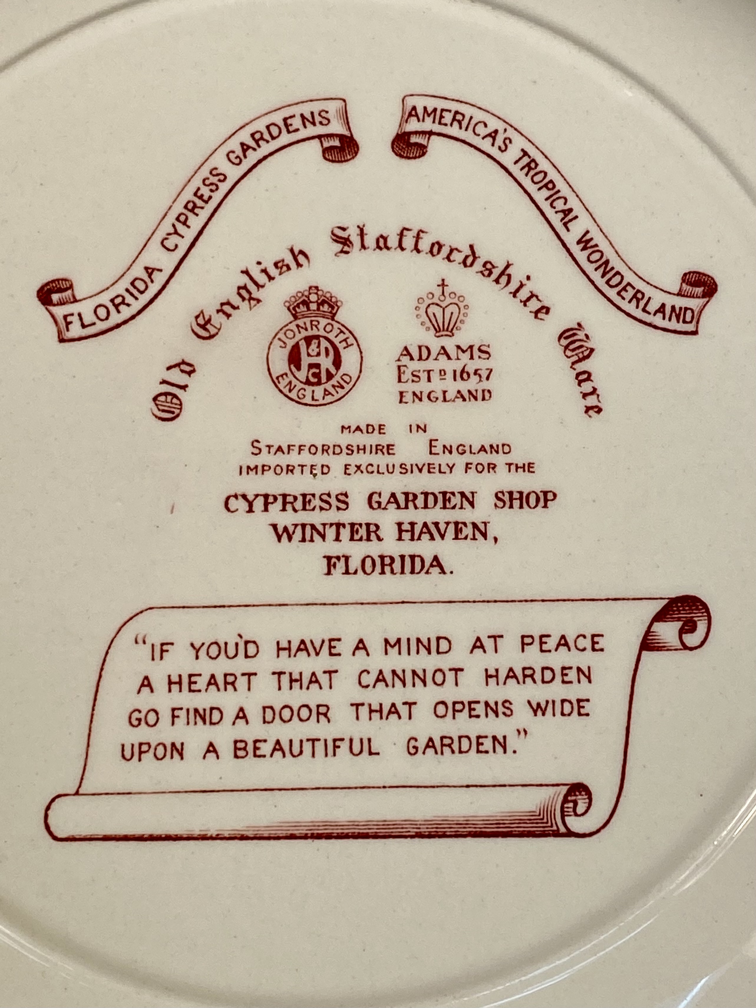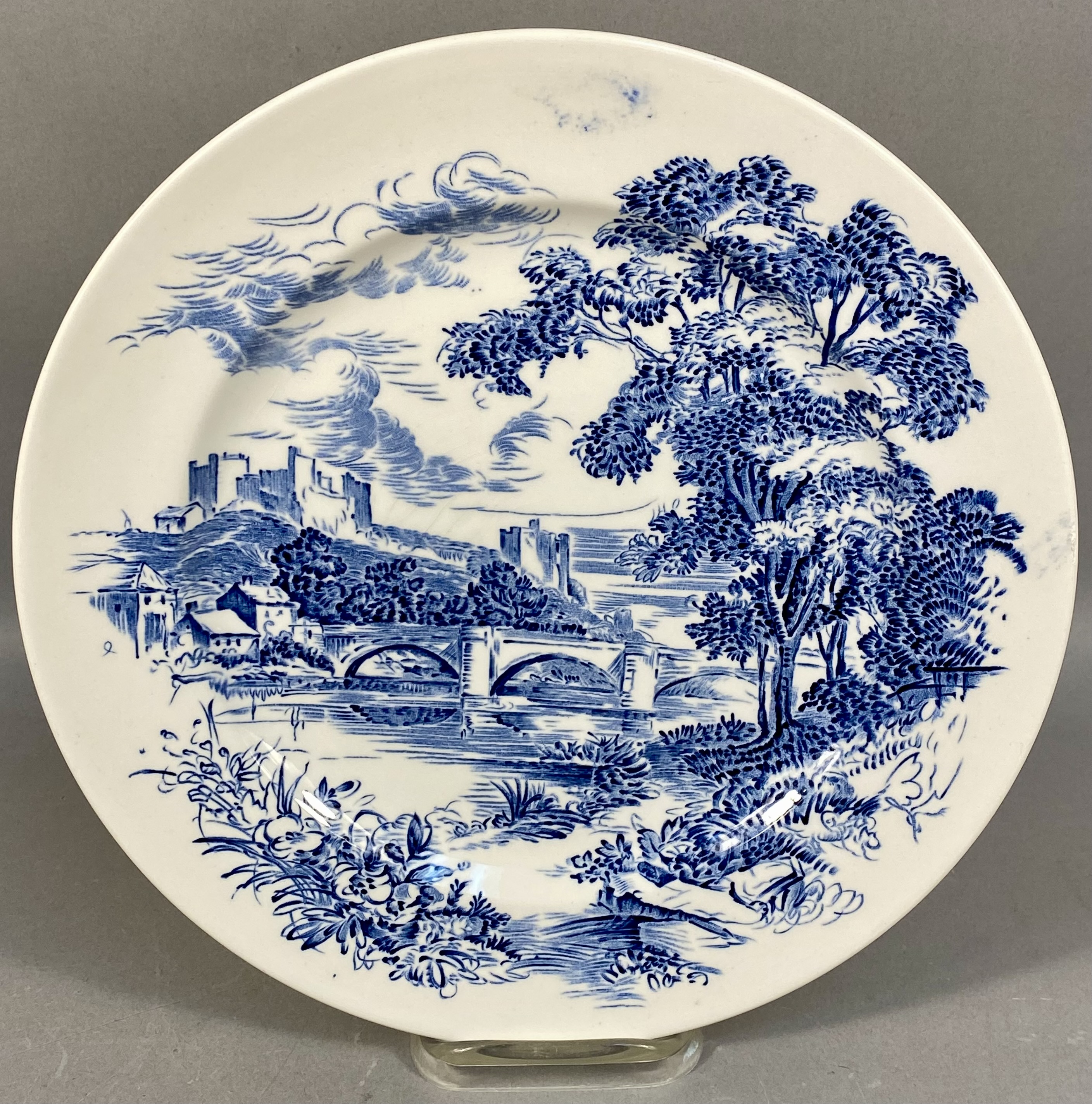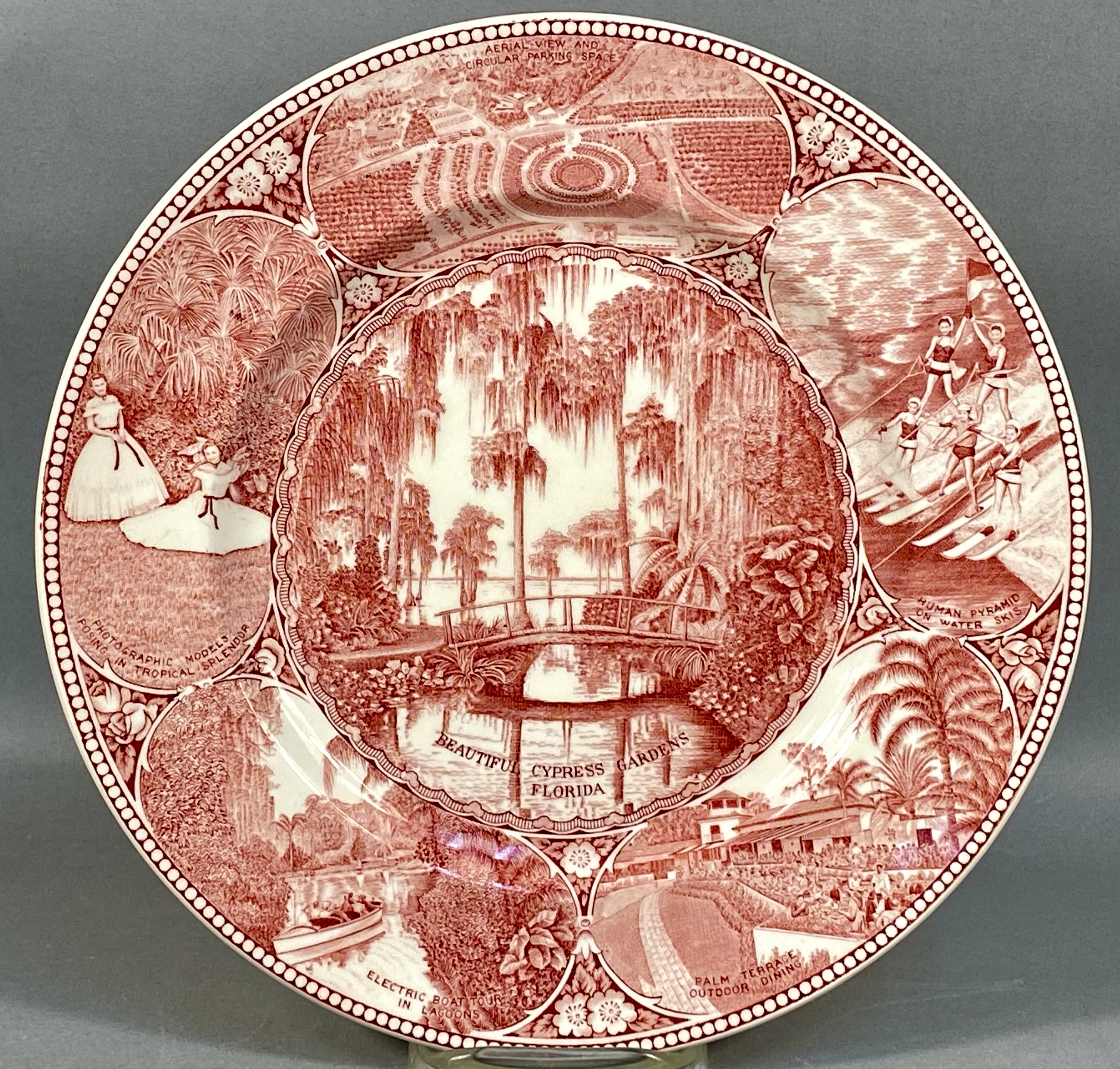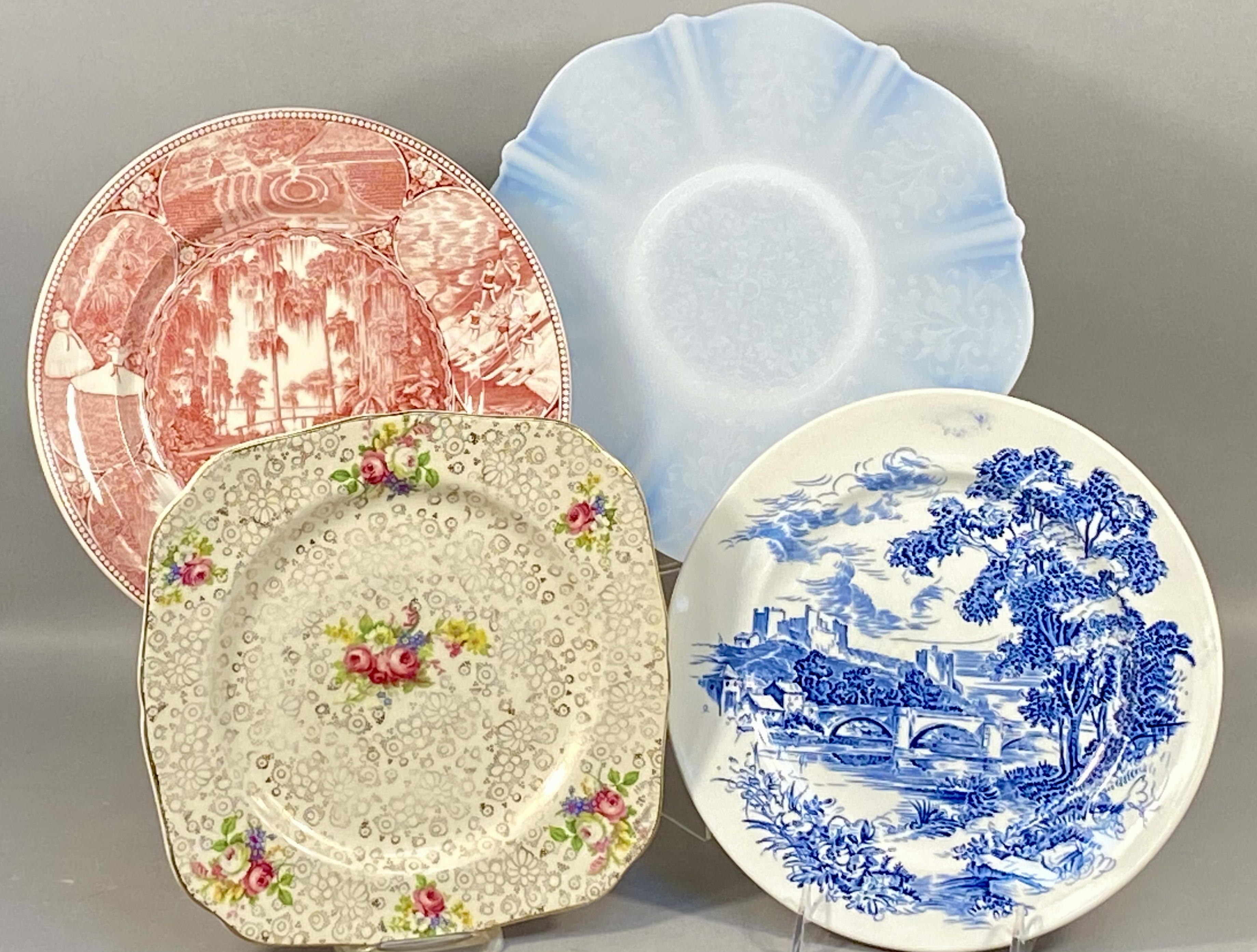This collection consists of three English earthenware transferware plates and one molded opalescent glass plate. The first item is a red transfer-printed souvenir plate for Florida Cypress Gardens, produced by Adams in Staffordshire, England, and imported by Jonroth. The decoration features several vignettes including an aerial view of the parking space, water skiers in a human pyramid, a palm terrace, and electric boat tours, with a central scene of a bridge over water. The reverse includes the maker marks for Adams and Jonroth and a printed poem. The second item is a blue and white transferware plate in the Countryside pattern by Wedgwood and Co. Ltd. (Enoch Wedgwood). The central scene depicts a river landscape with a multi-arched stone bridge and a hilltop castle. The reverse bears the Wedgwood and Co. Ltd. unicorn trademark. The third item is a square earthenware plate with rounded, scalloped corners by Hollinshead and Kirkham (H&K), Tunstall. It is decorated with polychrome floral bouquets of roses and blue flowers over a brown lace-like circular pattern with a gilded rim. The fourth item is a circular molded glass plate with a translucent white body and a light blue opalescent rim. The form features a scalloped edge and radial fluting with a central starburst medallion and scrollwork motifs. Measurements: 9-10.5 inches diameter The Florida Cypress Gardens plate is in good condition with no visible chips or cracks to the front. The Wedgwood Countryside plate has a visible chip and a possible old repair on the upper rim at the 11 o’clock position. The H&K Tunstall plate shows extensive crazing across the glaze on both the front and back. The opalescent glass plate exhibits surface scratches and utensil marks in the center but is free of major chips or cracks.