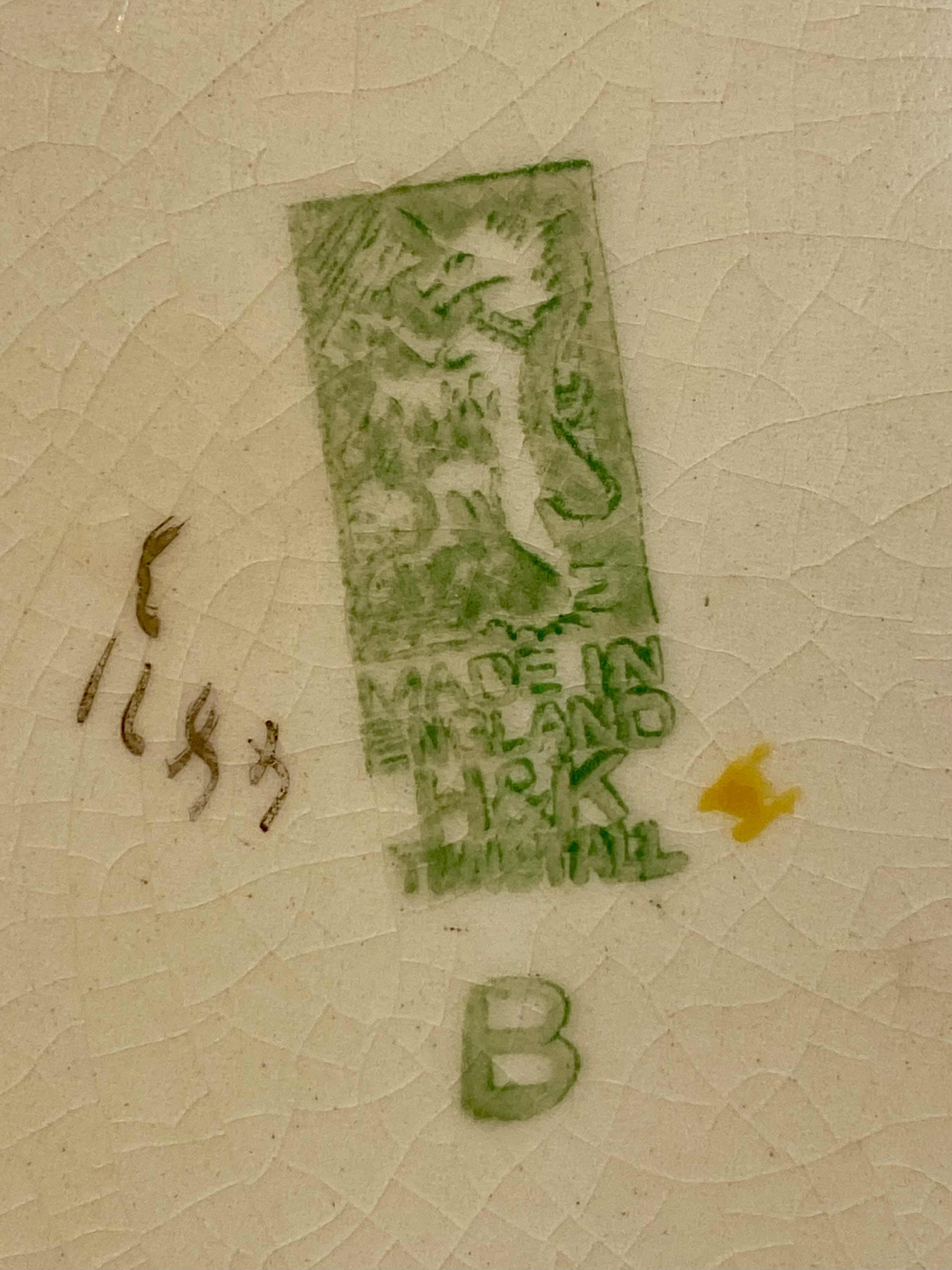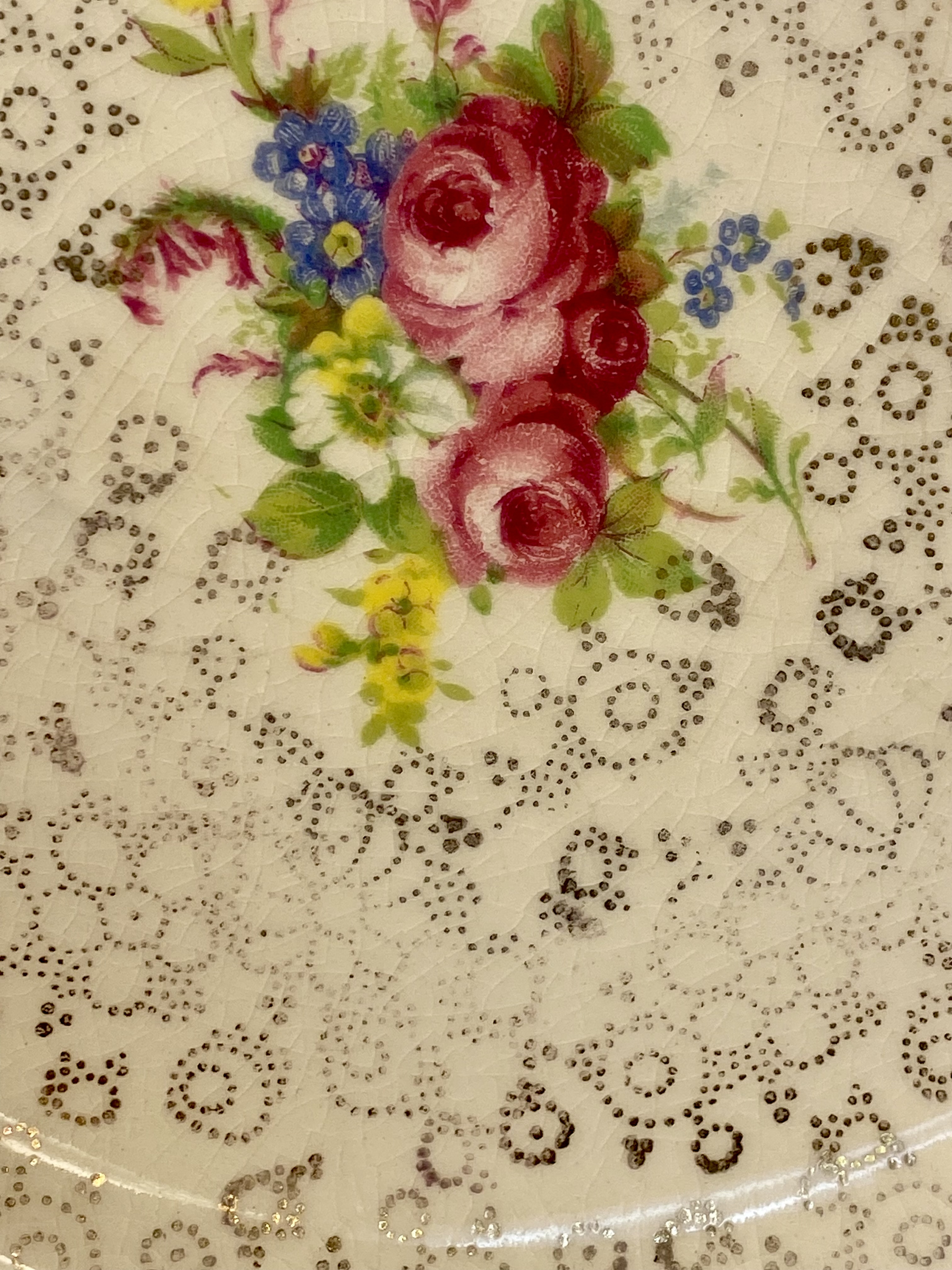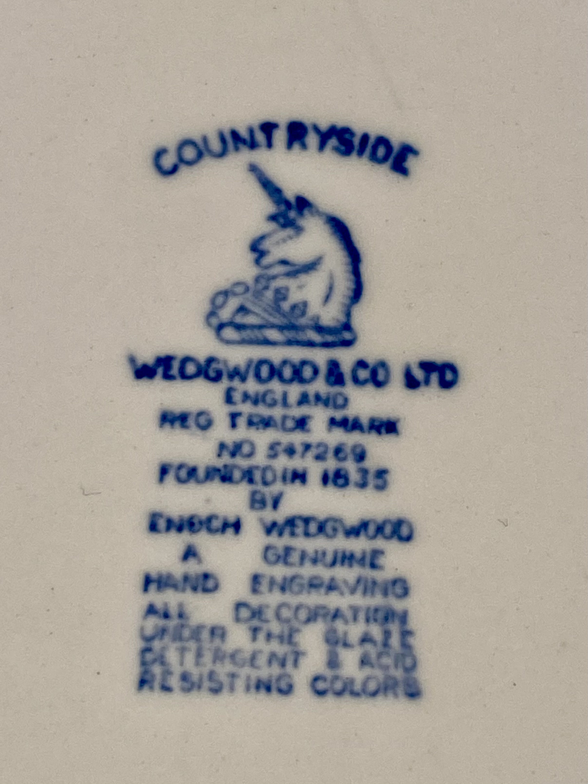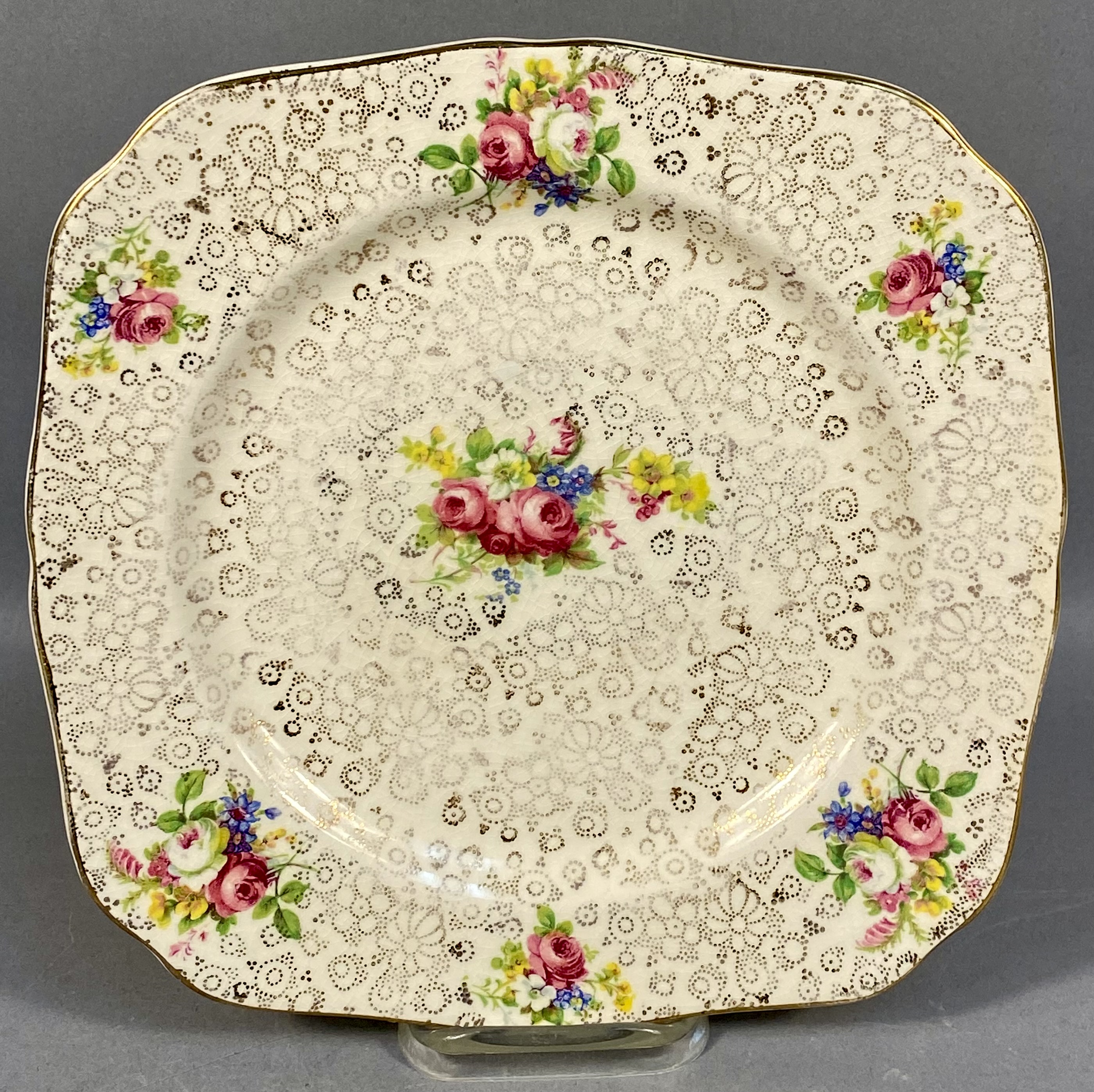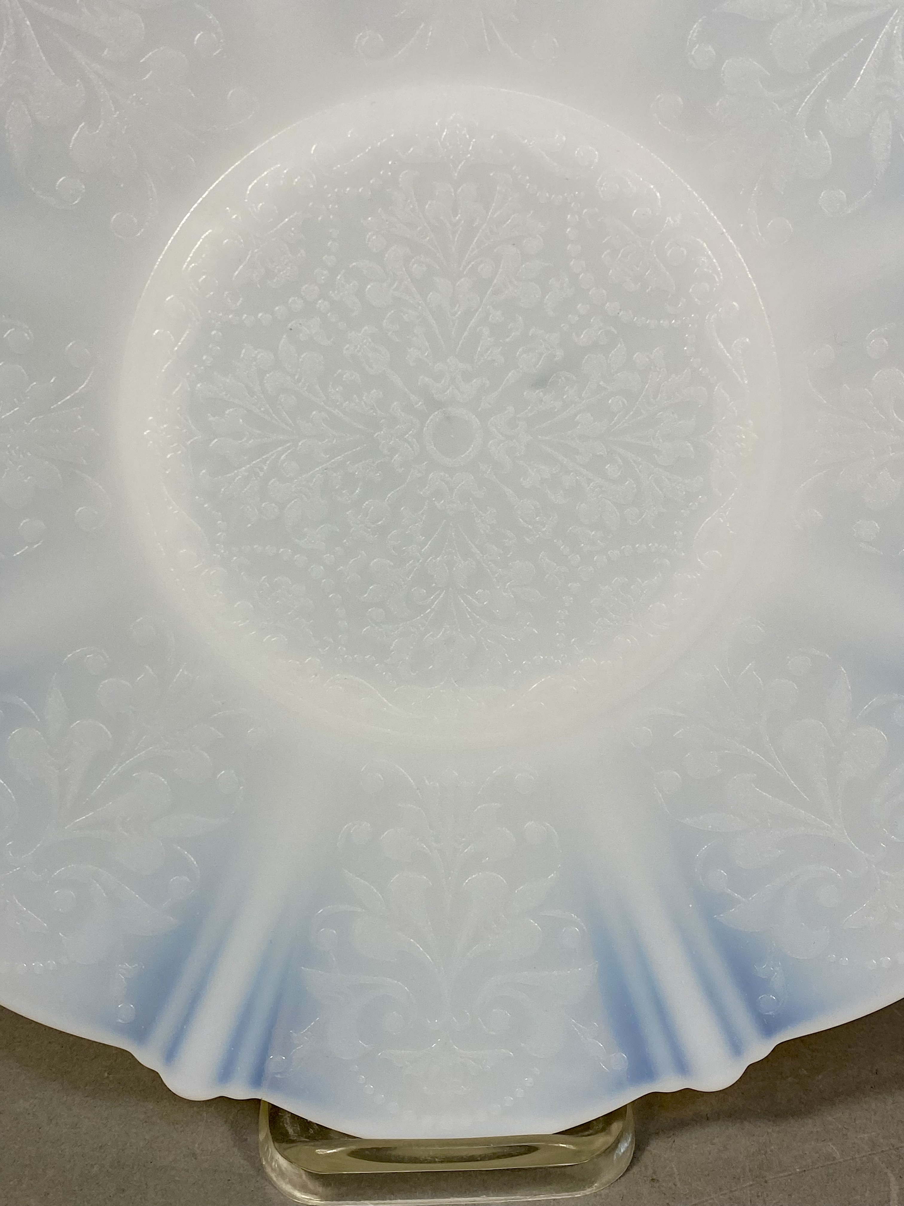 This collection consists of three English earthenware transferware plates and one molded opalescent glass plate. The first item is a red transfer-printed souvenir plate for Florida Cypress Gardens, produced by Adams in Staffordshire, England, and imported by Jonroth. The decoration features several vignettes including an aerial view of the parking space, water skiers in a human pyramid, a palm terrace, and electric boat tours, with a central scene of a bridge over water. The reverse includes the maker marks for Adams and Jonroth and a printed poem. The second item is a blue and white transferware plate in the Countryside pattern by Wedgwood and Co. Ltd. (Enoch Wedgwood). The central scene depicts a river landscape with a multi-arched stone bridge and a hilltop castle. The reverse bears the Wedgwood and Co. Ltd. unicorn trademark. The third item is a square earthenware plate with rounded, scalloped corners by Hollinshead and Kirkham (H&K), Tunstall. It is decorated with polychrome floral bouquets of roses and blue flowers over a brown lace-like circular pattern with a gilded rim. The fourth item is a circular molded glass plate with a translucent white body and a light blue opalescent rim. The form features a scalloped edge and radial fluting with a central starburst medallion and scrollwork motifs. Measurements: 9-10.5 inches diameter The Florida Cypress Gardens plate is in good condition with no visible chips or cracks to the front. The Wedgwood Countryside plate has a visible chip and a possible old repair on the upper rim at the 11 o’clock position. The H&K Tunstall plate shows extensive crazing across the glaze on both the front and back. The opalescent glass plate exhibits surface scratches and utensil marks in the center but is free of major chips or cracks.