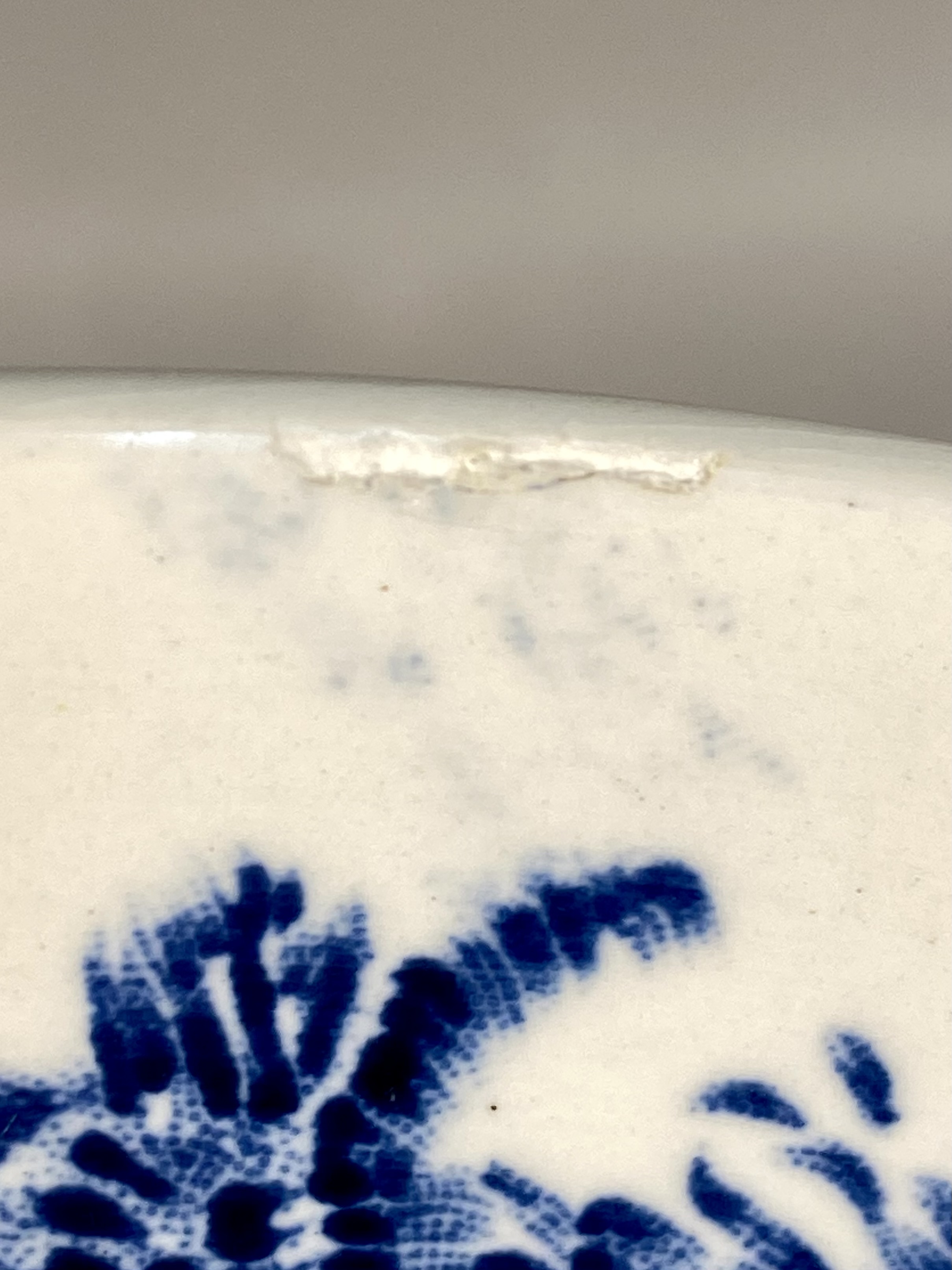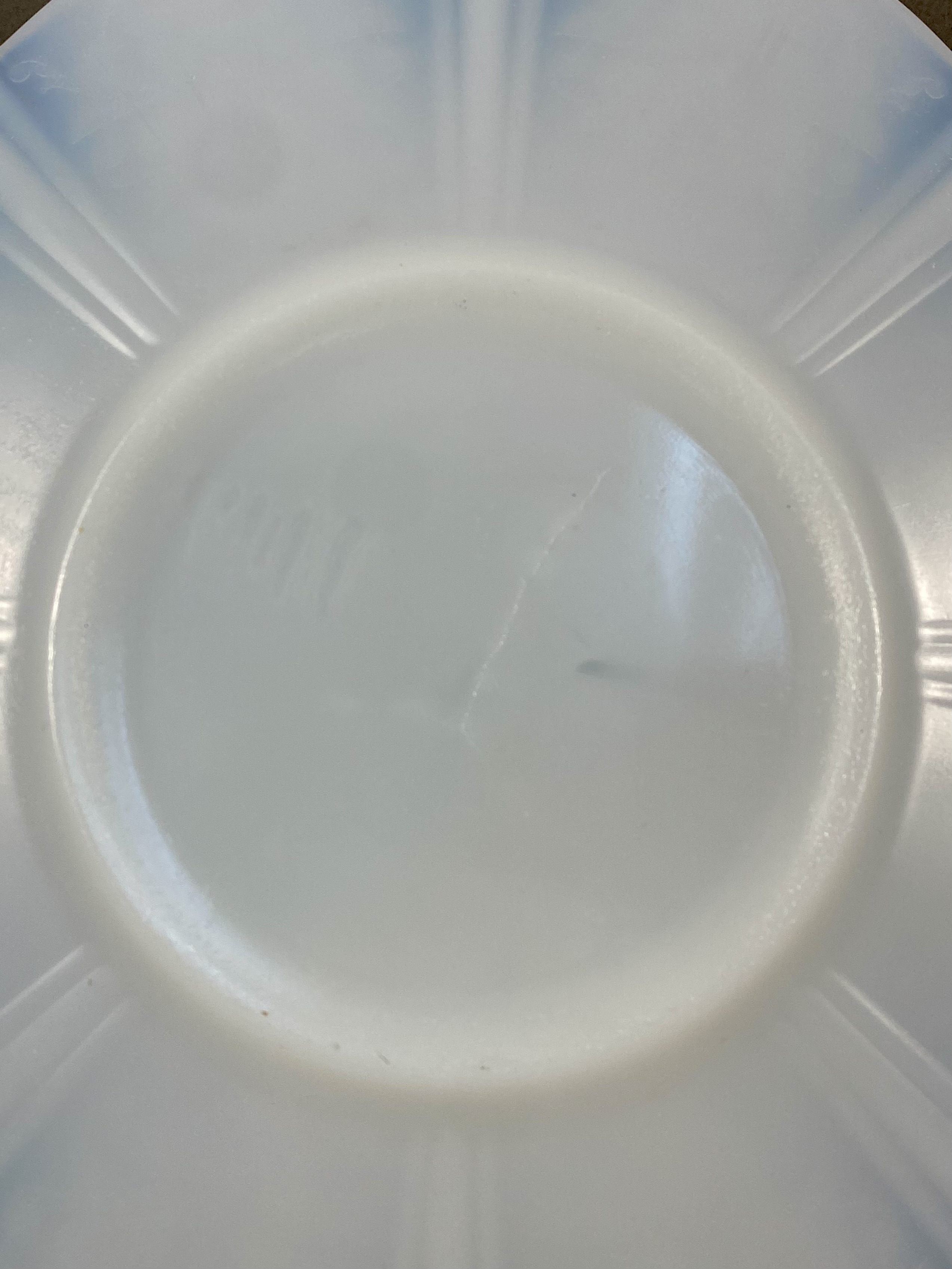 The Florida Cypress Gardens plate is in good condition with no visible chips or cracks to the front. The Wedgwood Countryside plate has a visible chip and a possible old repair on the upper rim at the 11 o\'clock position. The H&K Tunstall plate shows extensive crazing across the glaze on both the front and back. The opalescent glass plate is in excellent condition.