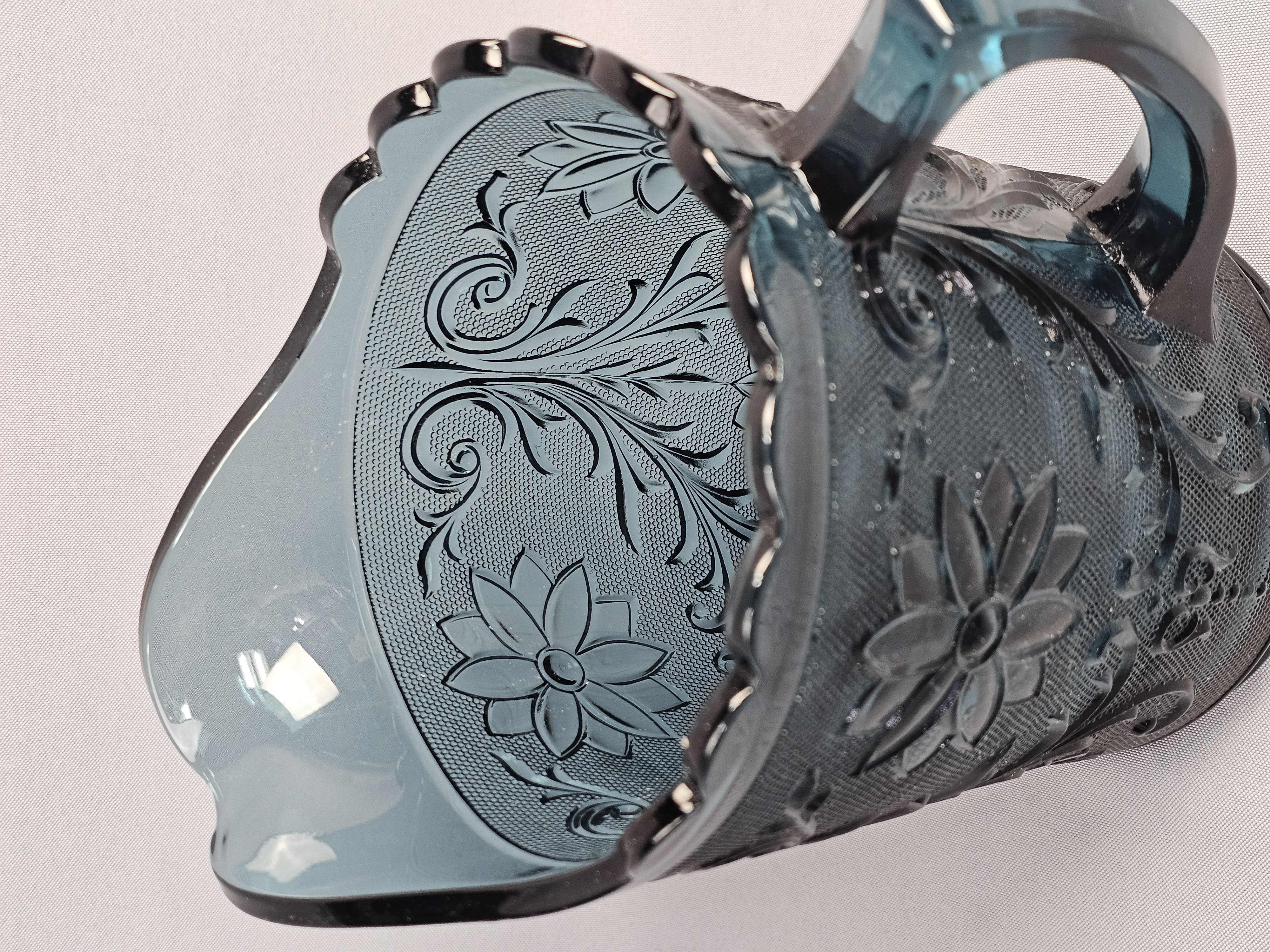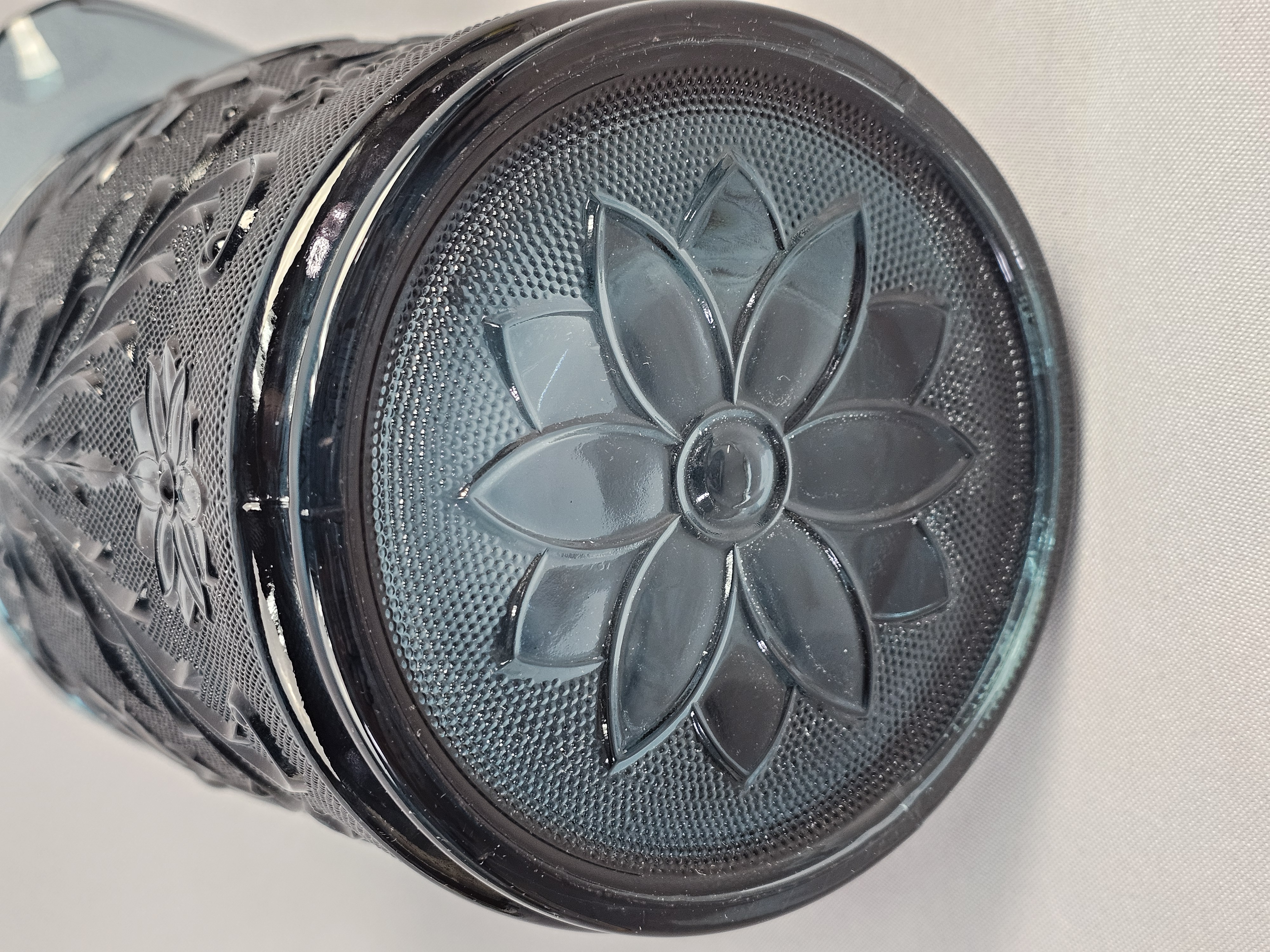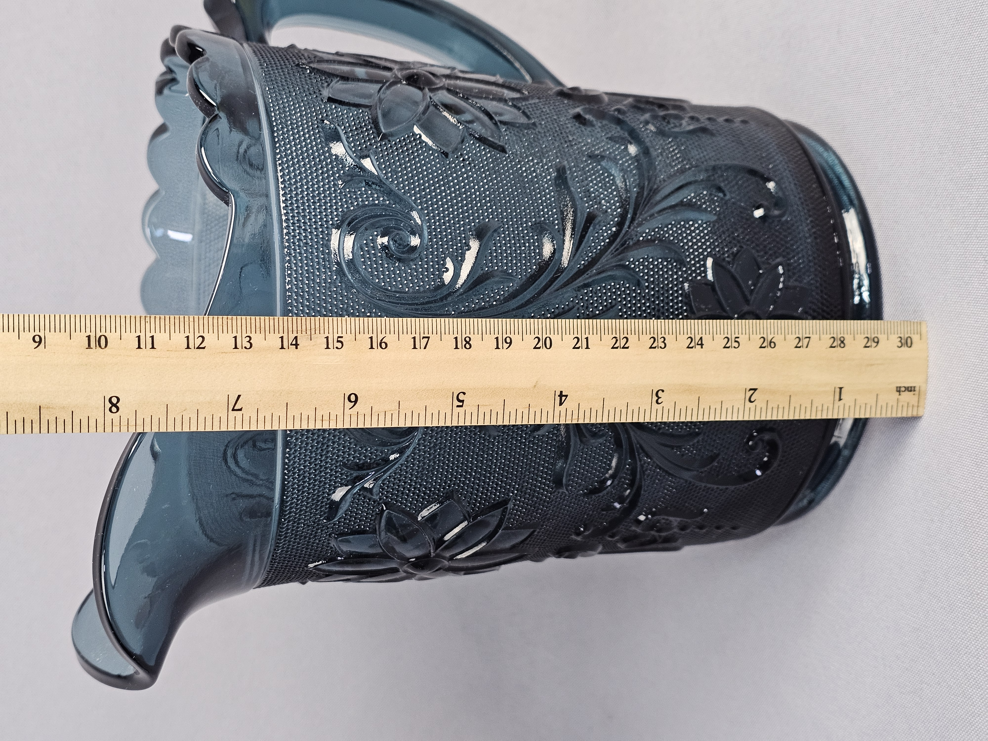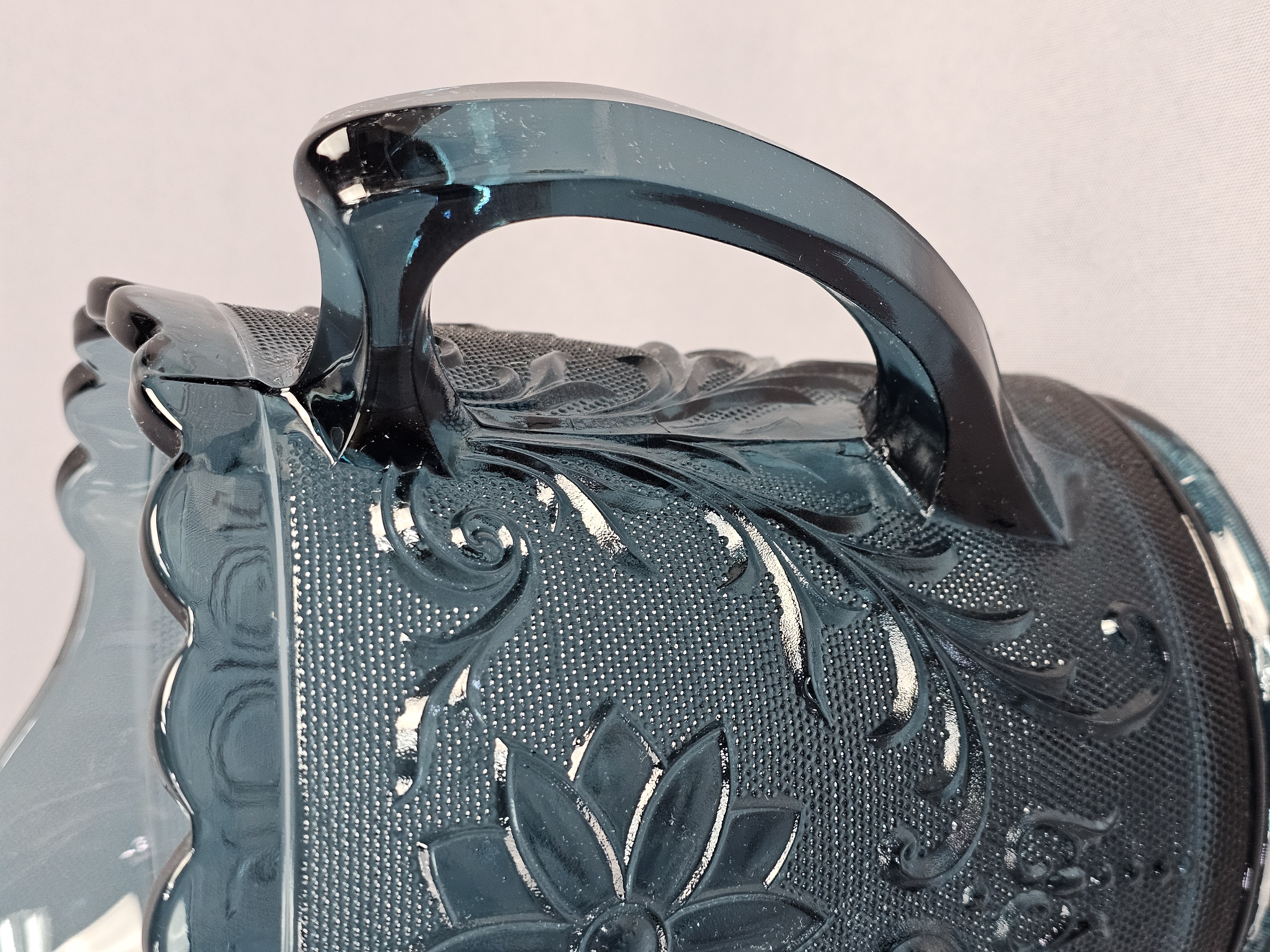 A pressed glass pitcher in the Sandwich pattern, attributed to Indiana Glass for Tiara Exclusives. The vessel is constructed of dark teal blue glass, a color commercially known as Colonial Blue. No maker marks, signatures, or labels are present on the item. Height: approximately 8 inches. The piece shows general surface wear and light residue consistent with age. Has a small chip on the exterior surface, photographed.