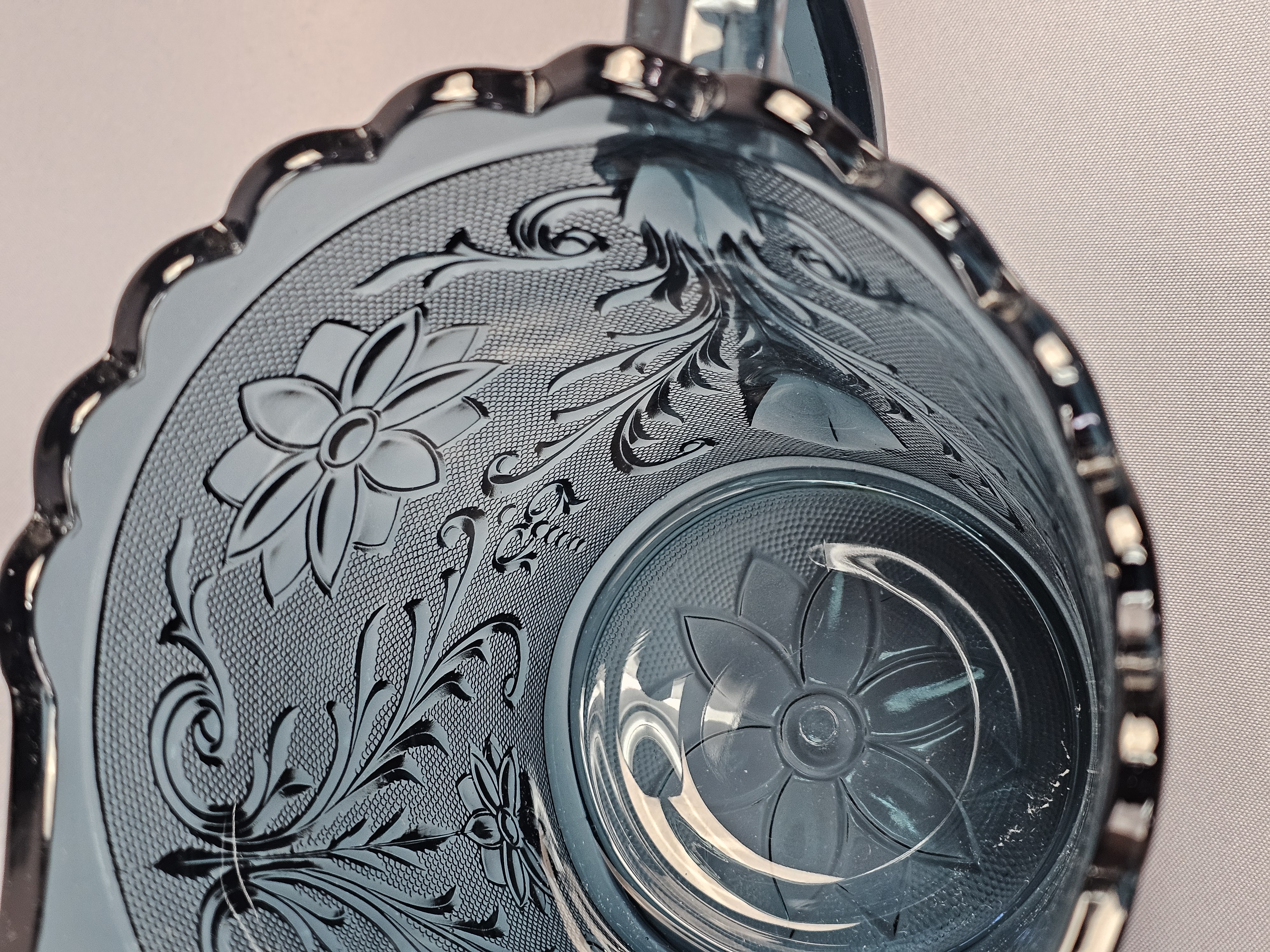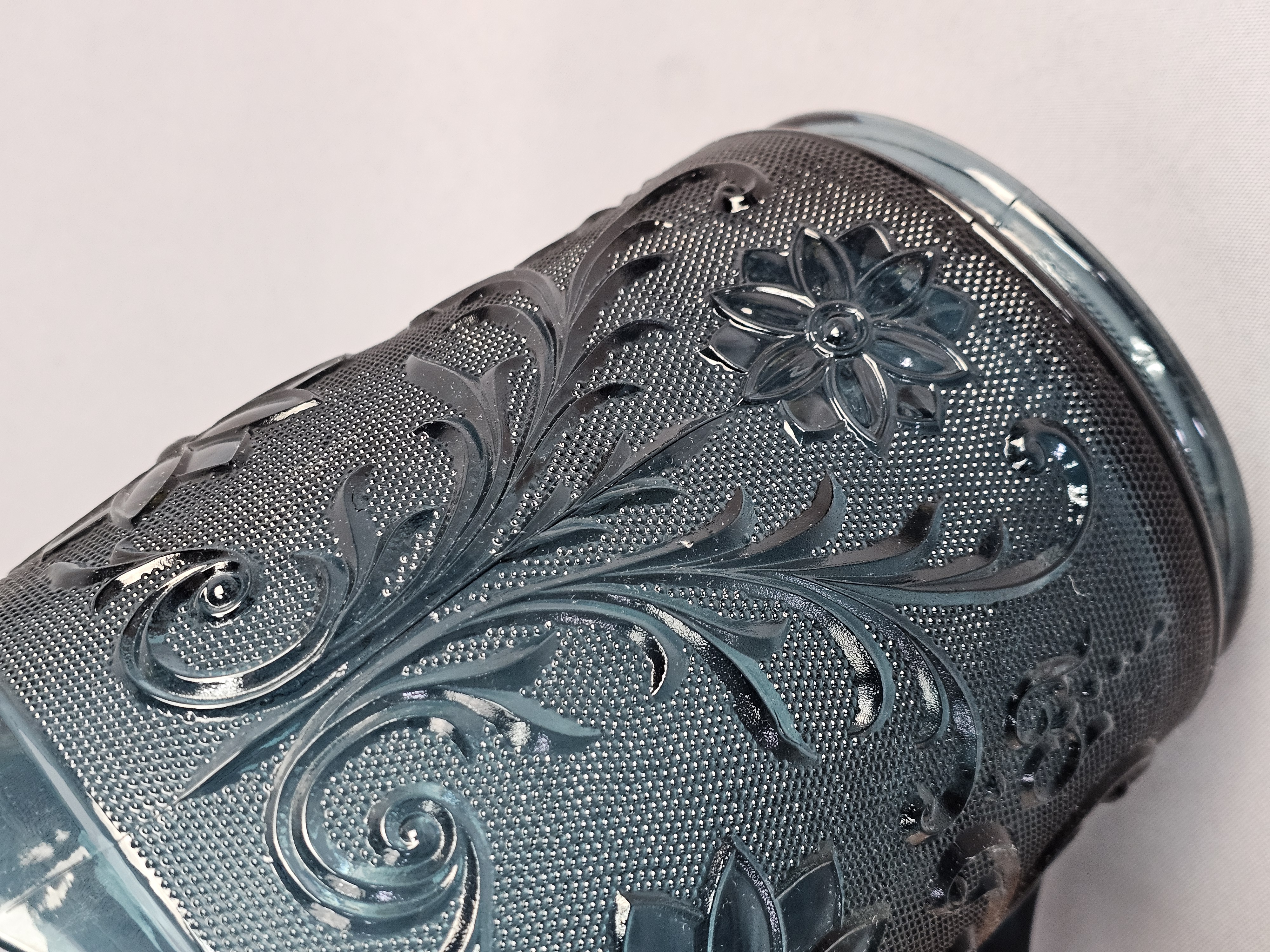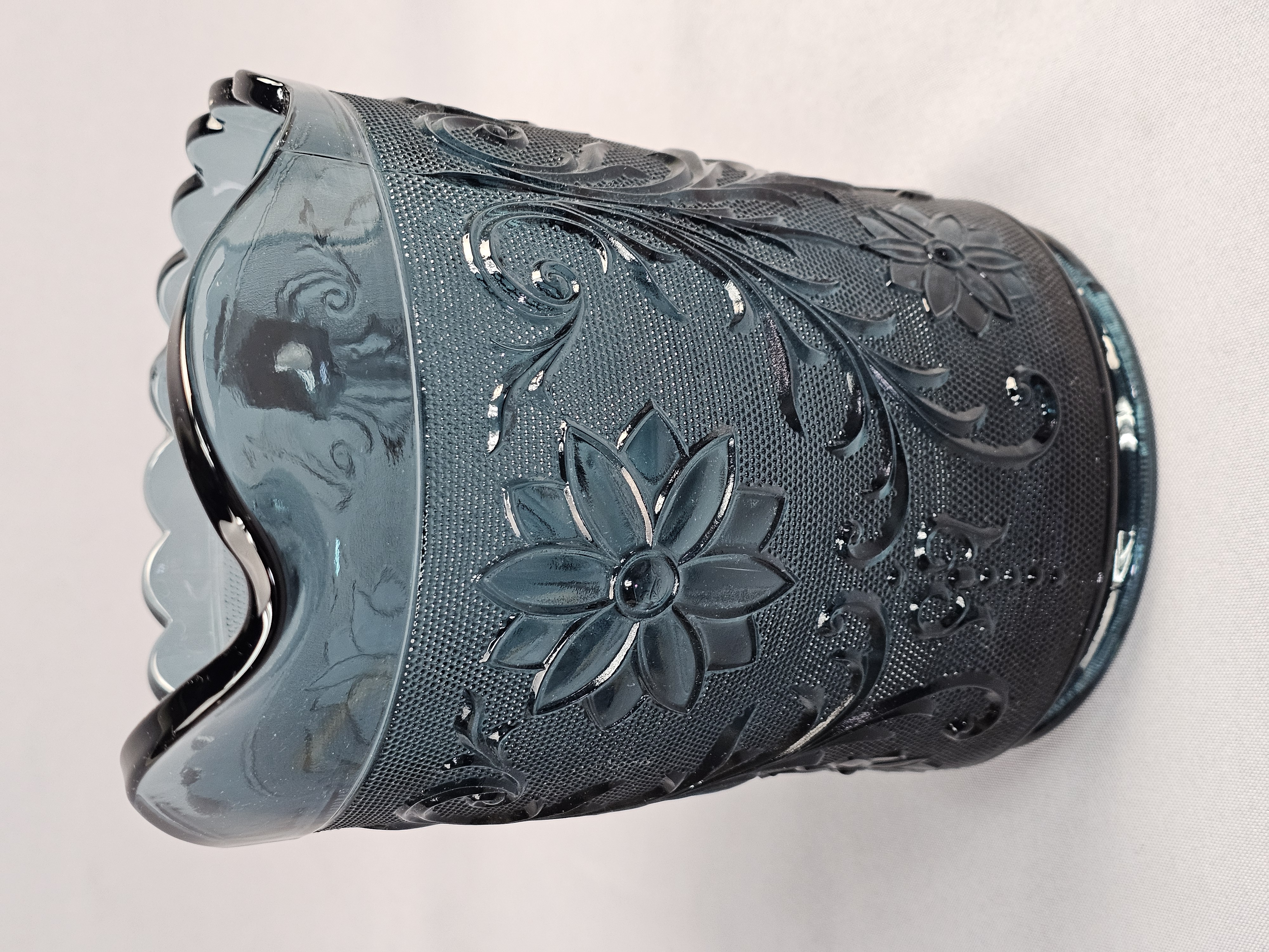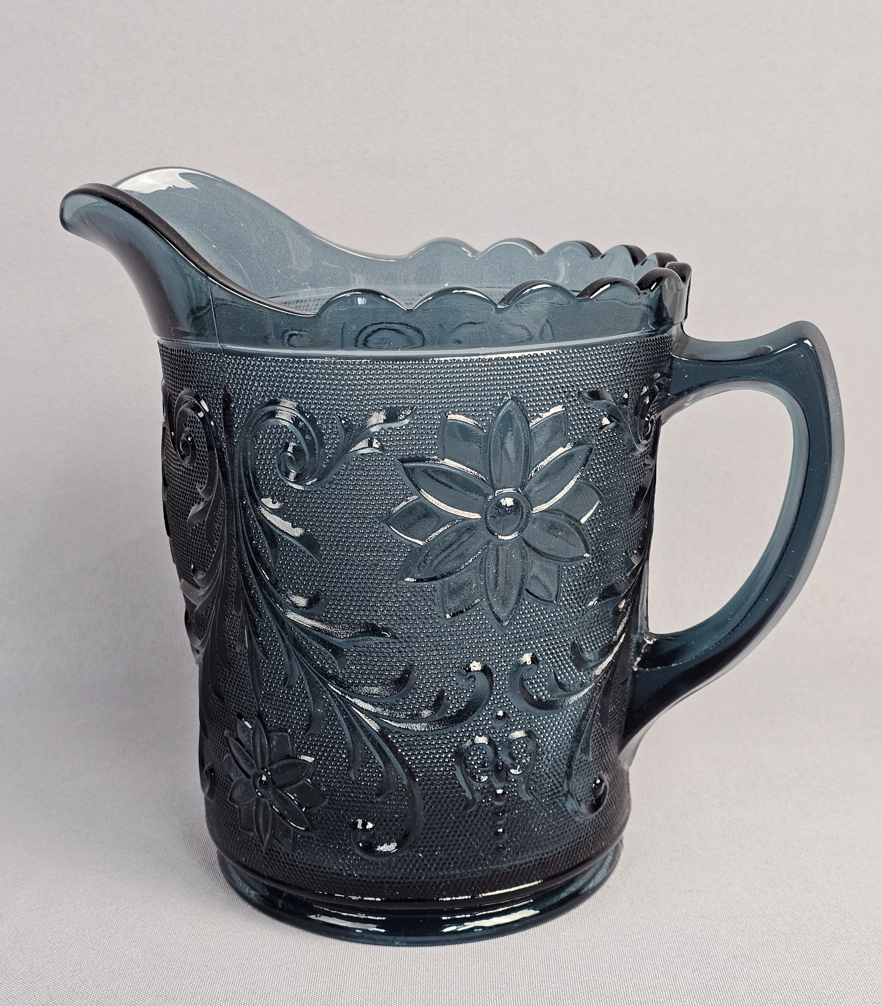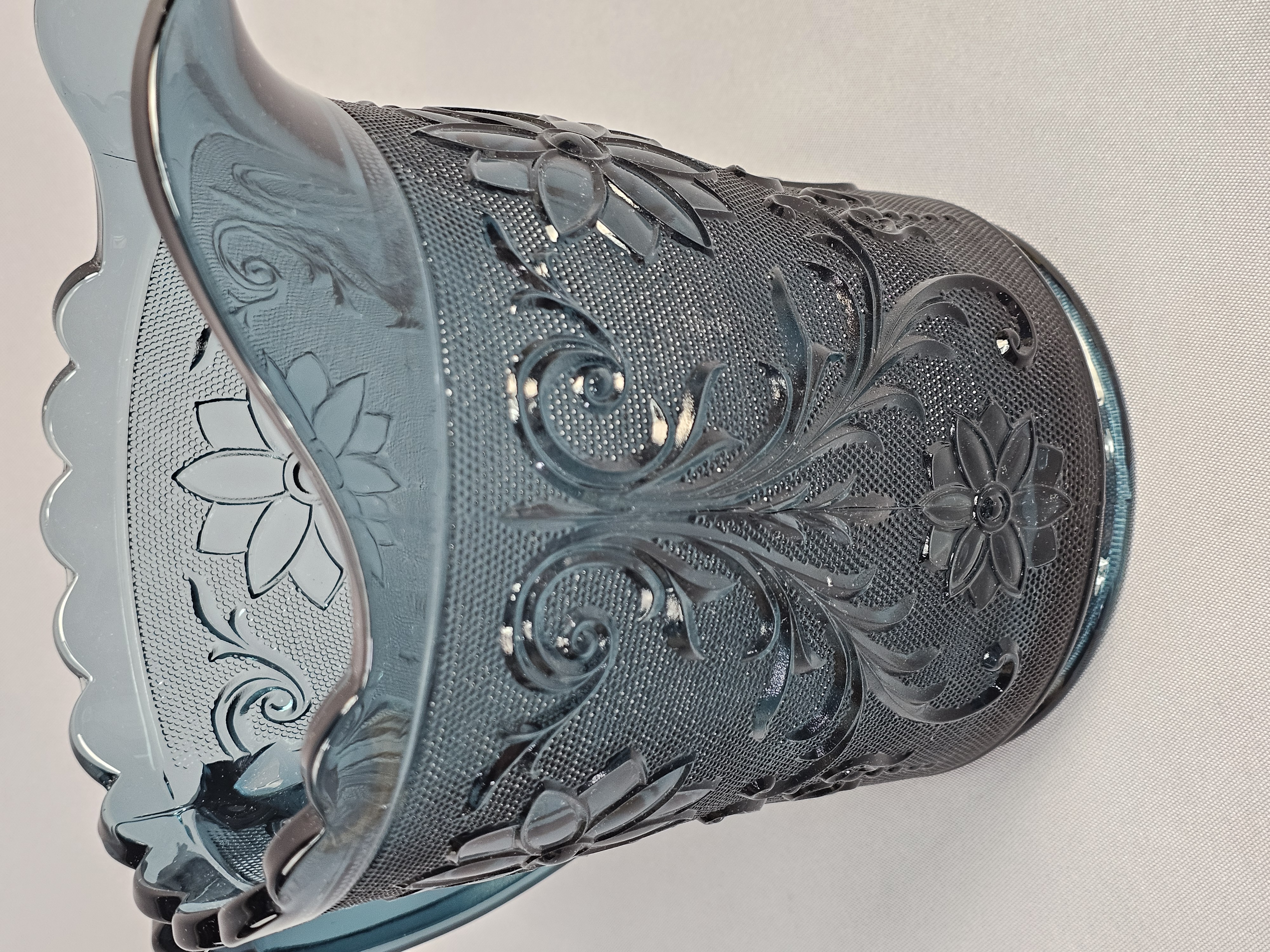 A pressed glass pitcher in the Sandwich pattern, attributed to Indiana Glass for Tiara Exclusives. The vessel is constructed of dark teal blue glass, a color commercially known as Colonial Blue. No maker marks, signatures, or labels are present on the item. Height: approximately 8 inches. The piece shows general surface wear and light residue consistent with age. Has a small chip on the exterior surface, photographed.