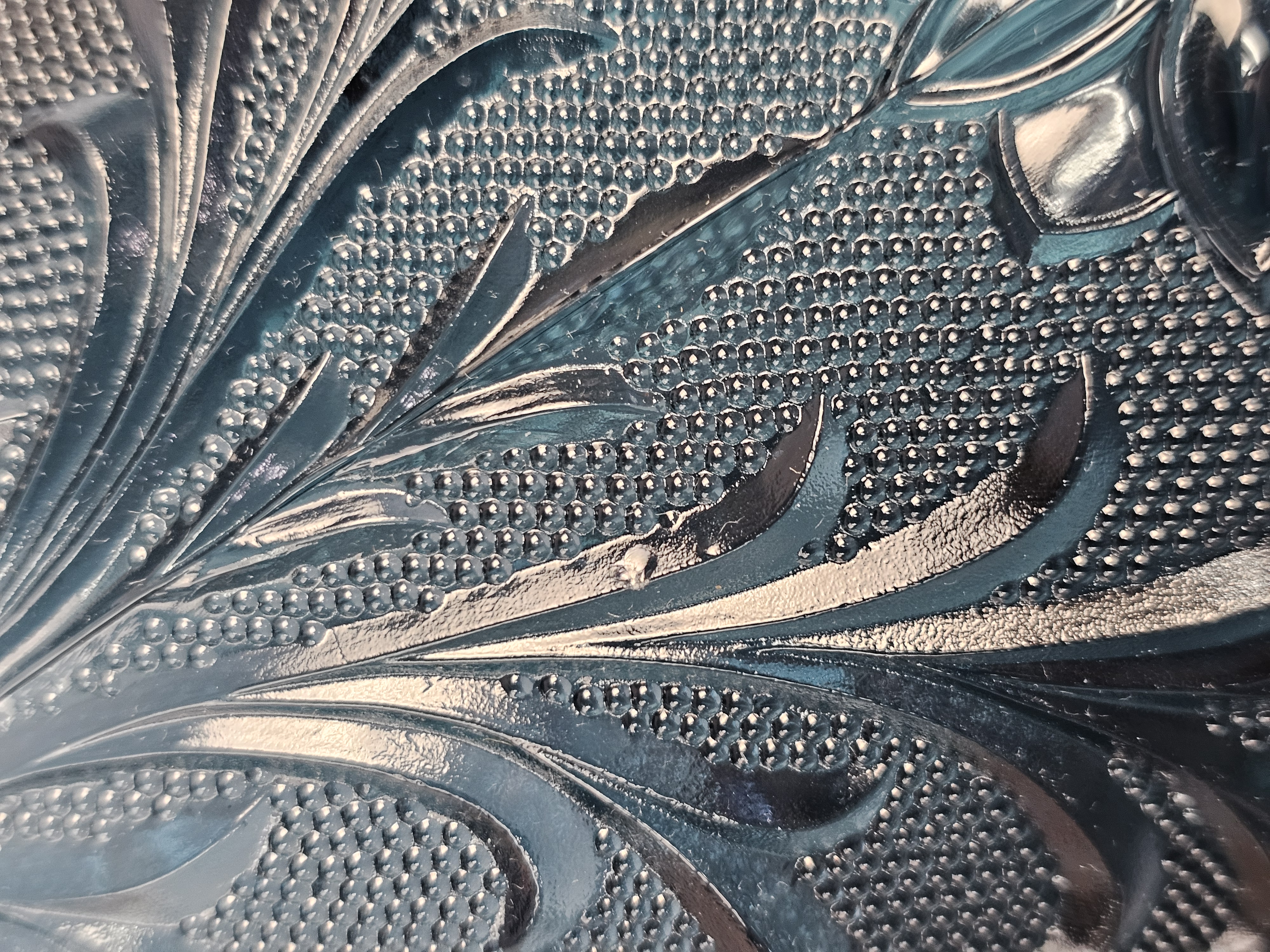 The piece shows general surface wear and light residue consistent with age. Has a small chip on the exterior surface, photographed.