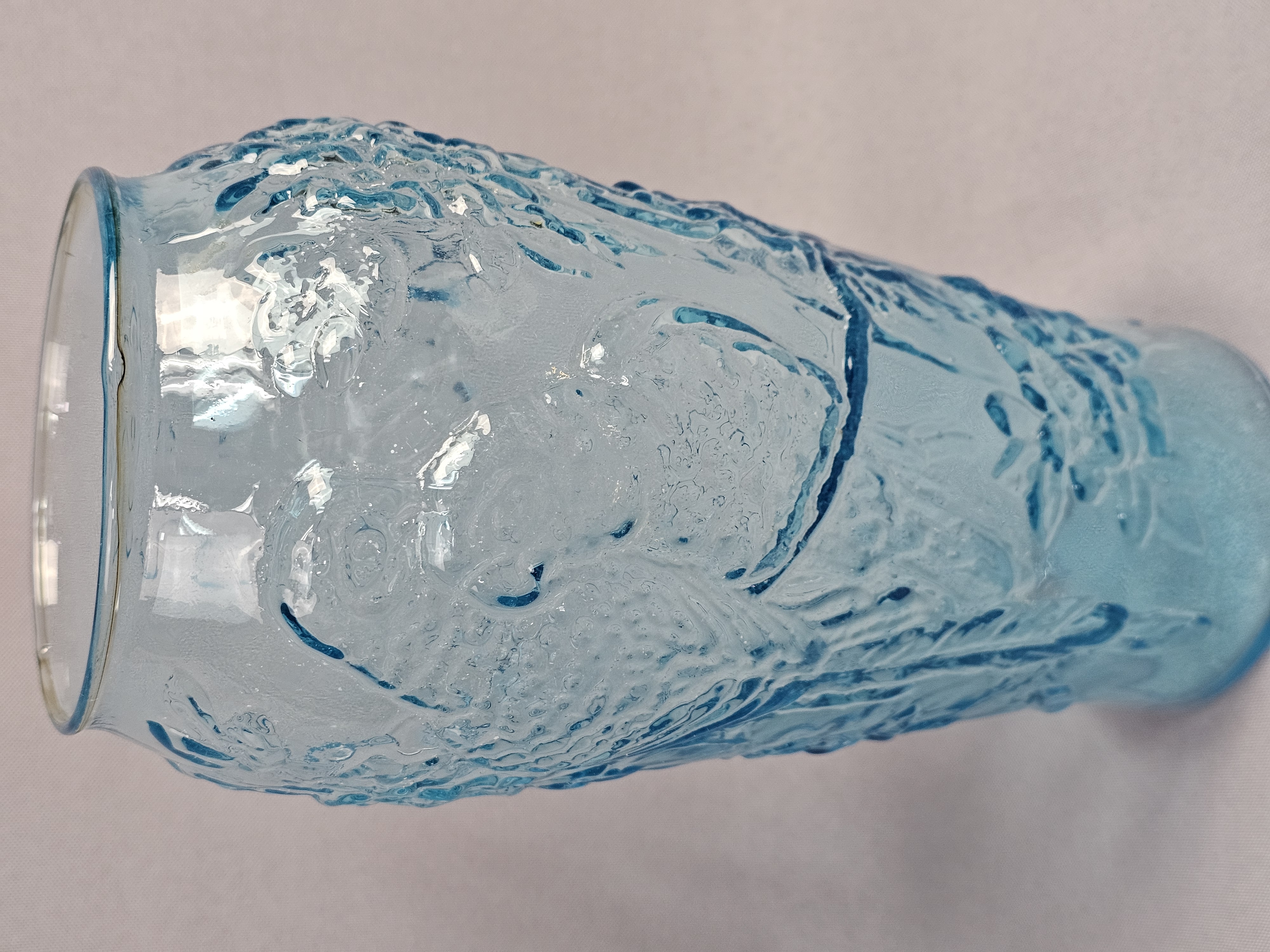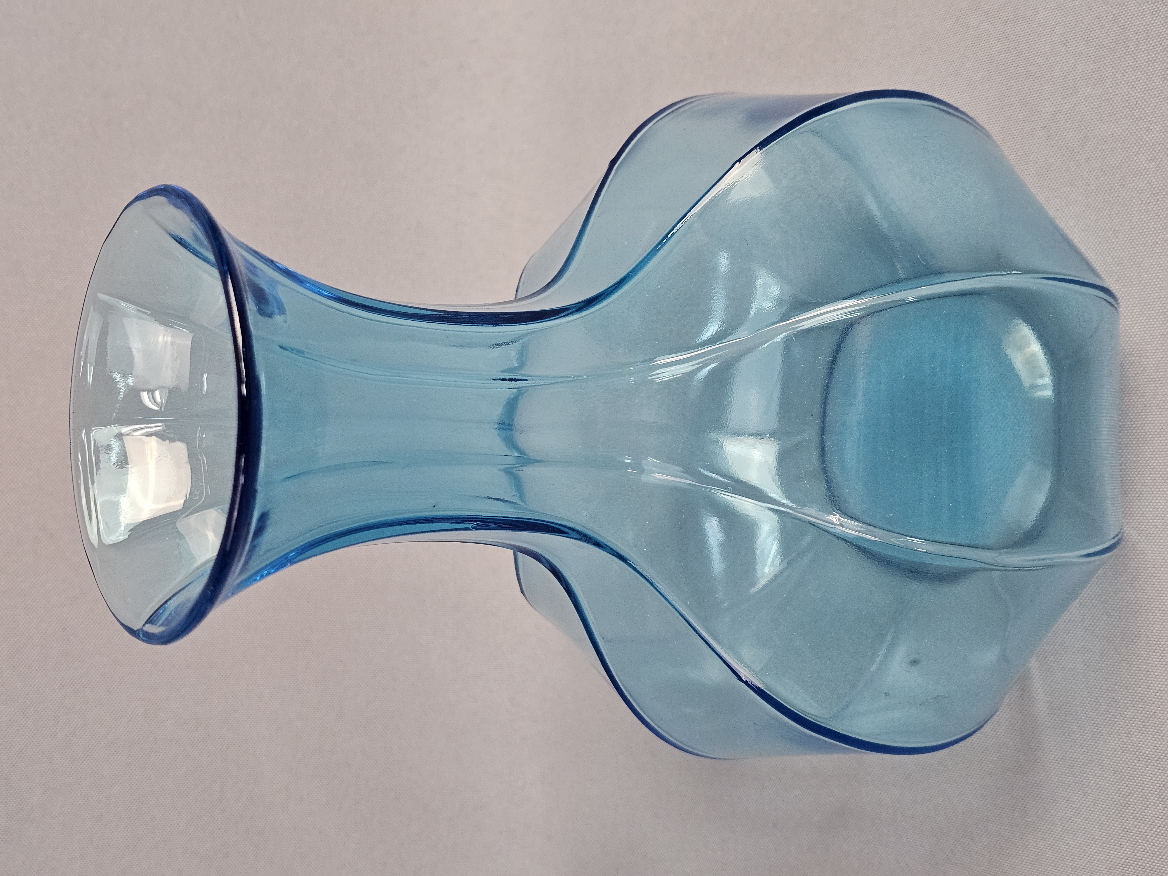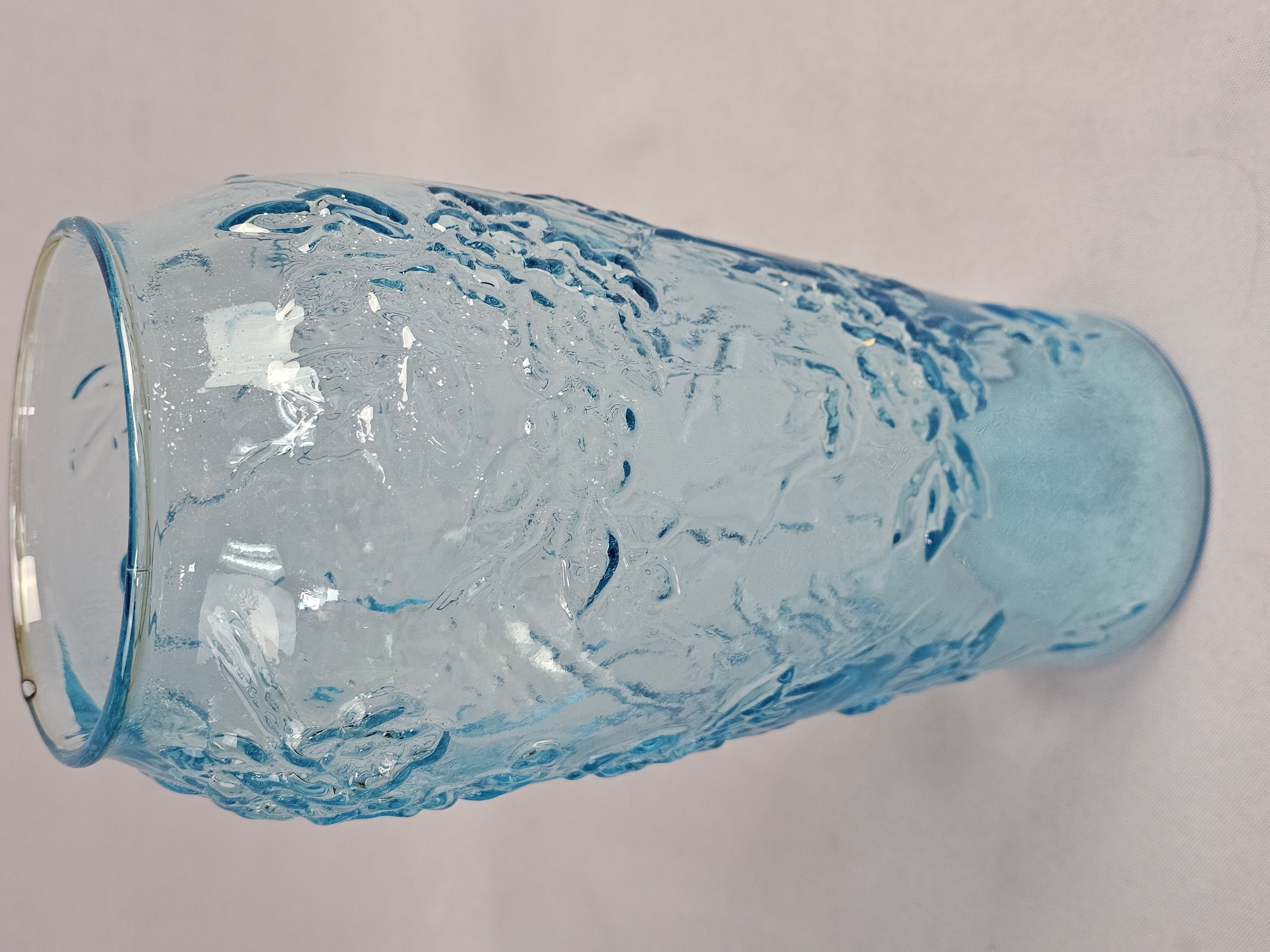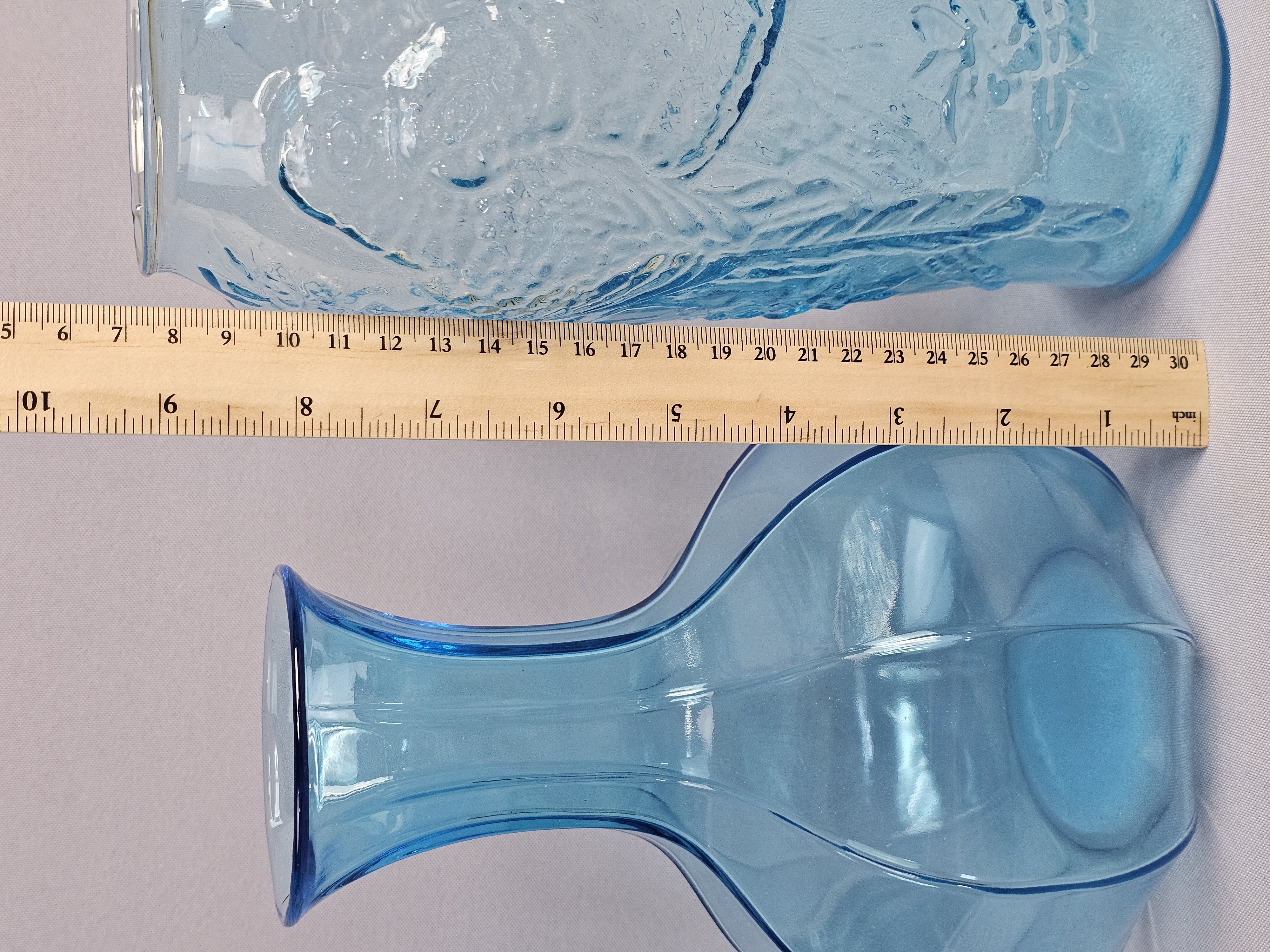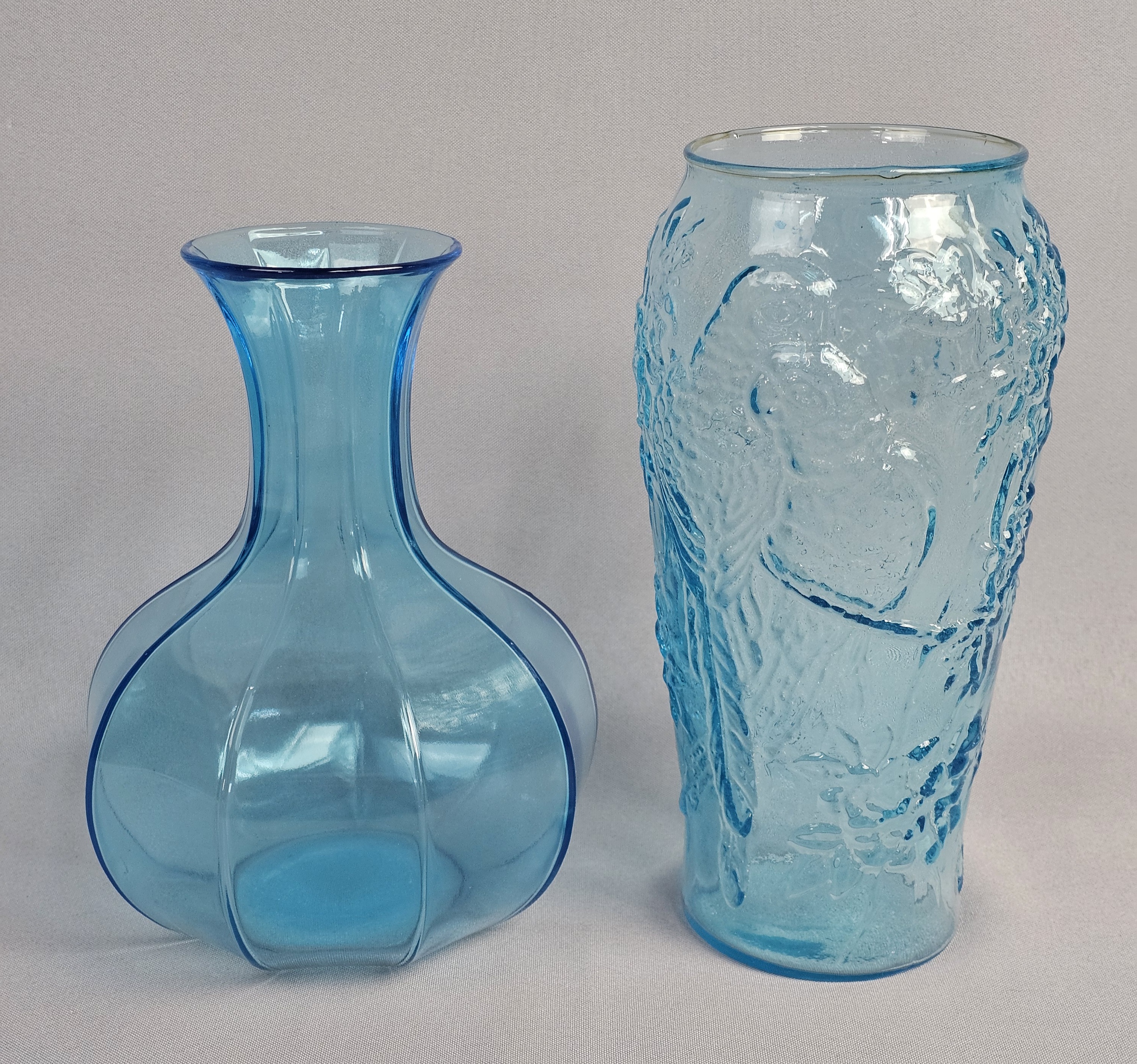 This lot comprises two decorative glass vases in varying shades of aqua blue. Vases measure 8 and 9 inches tall. Both vases are in good condition with no visible chips, cracks, or repairs. Minor shelf wear and light surface scratches are present on the bases, consistent with age and typical use.