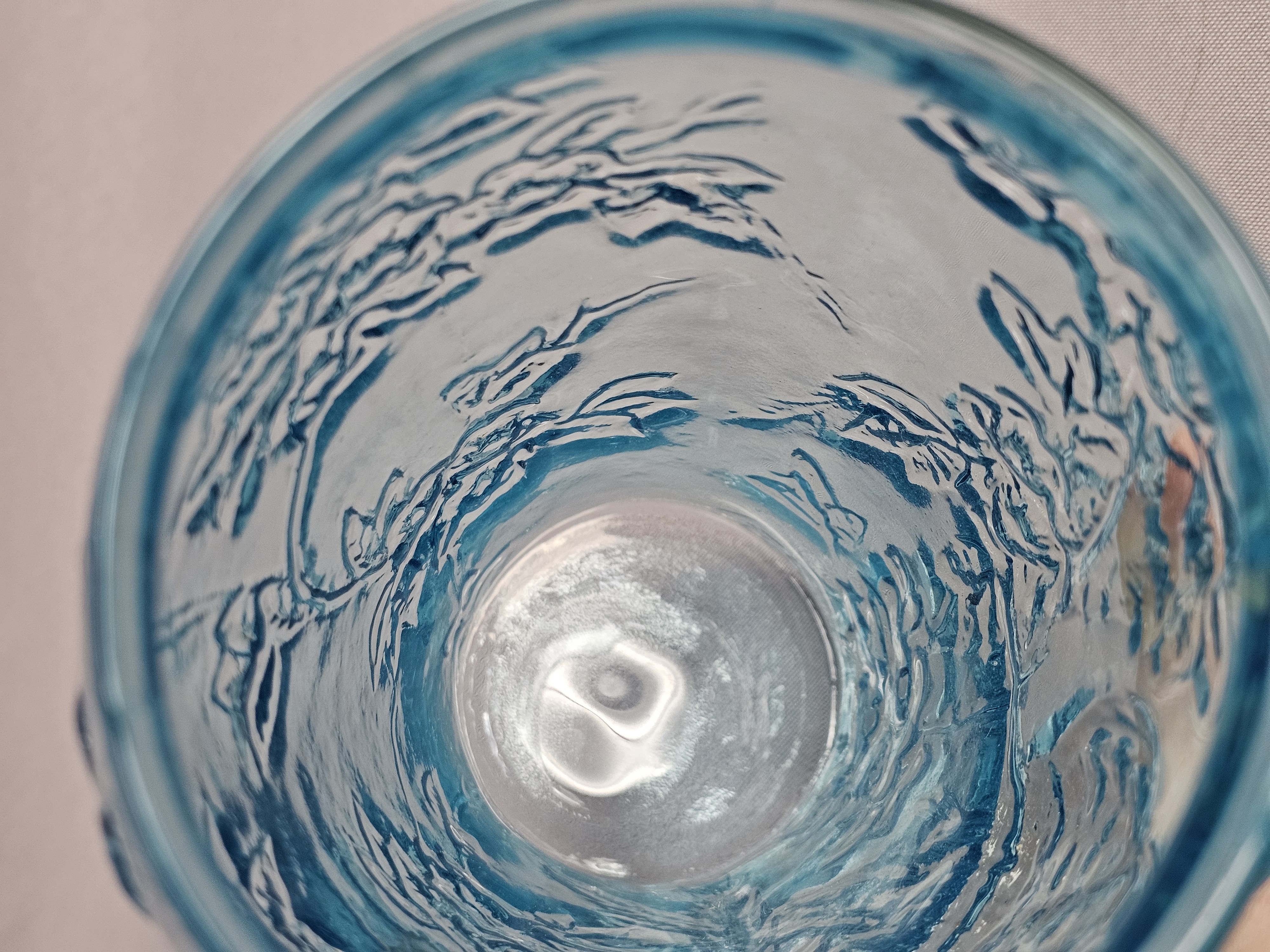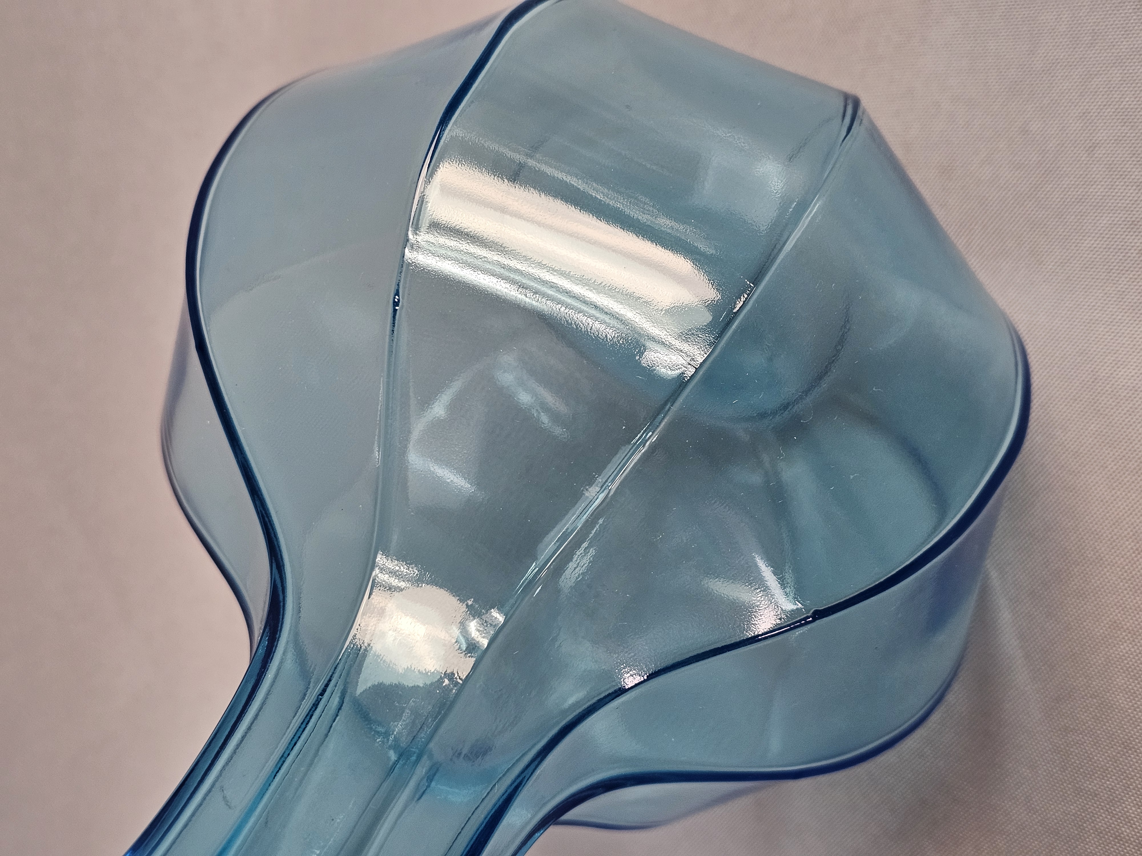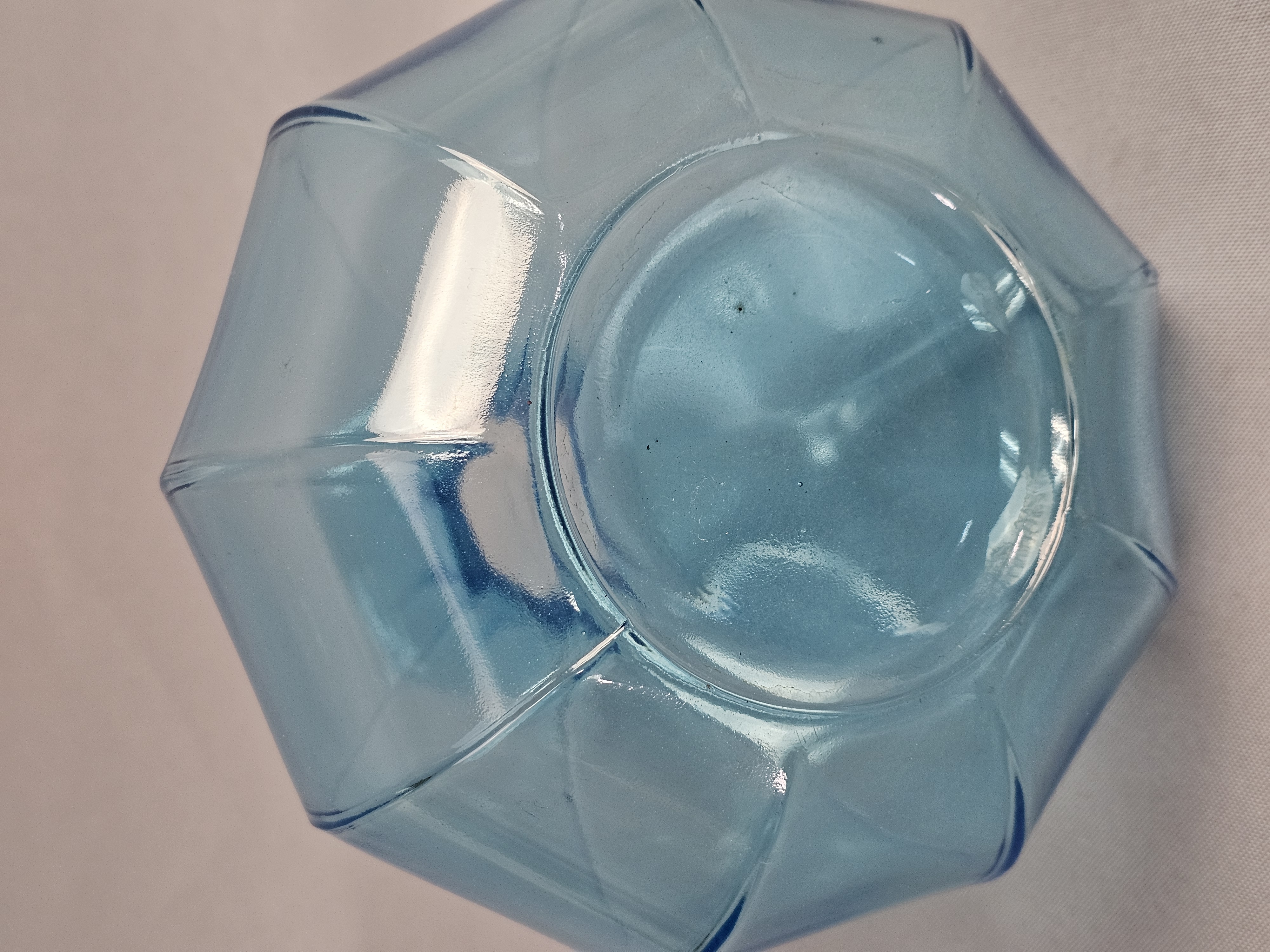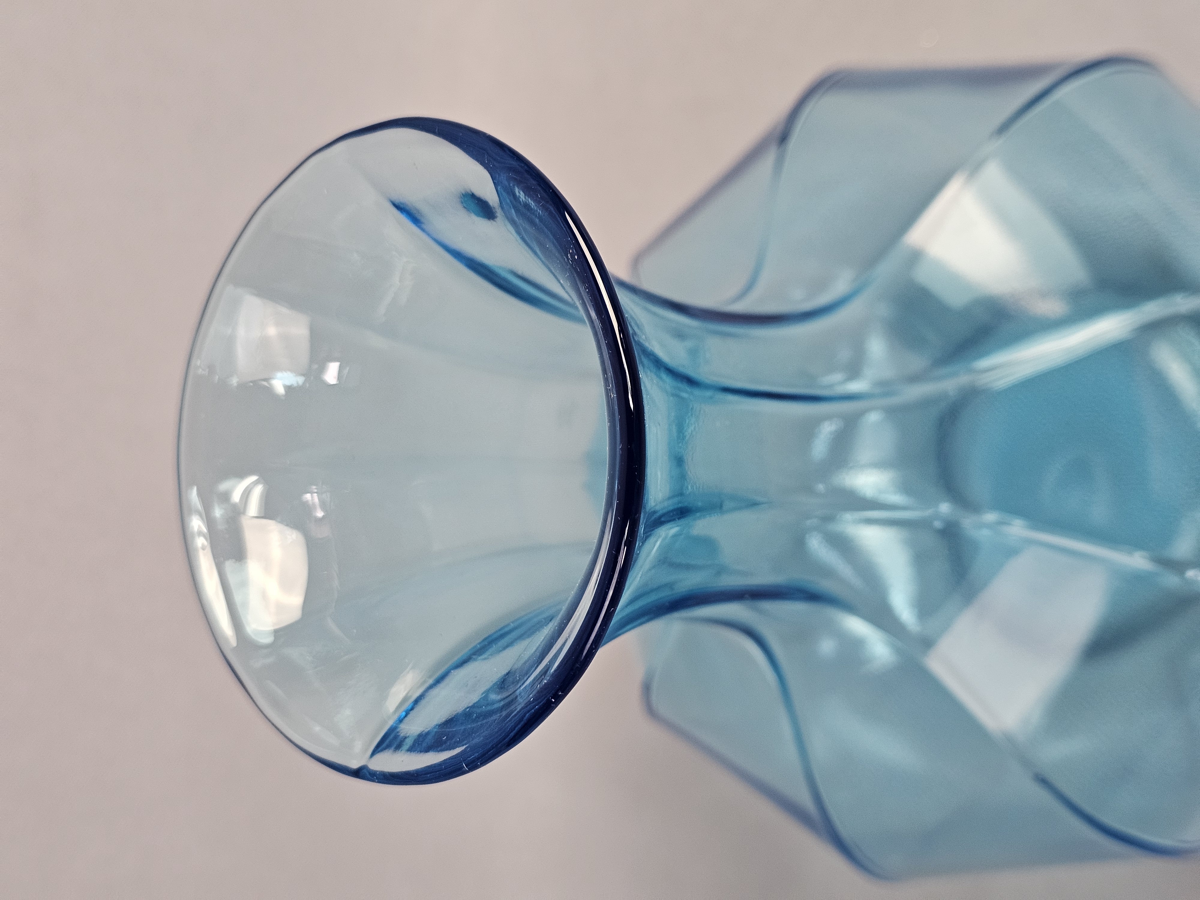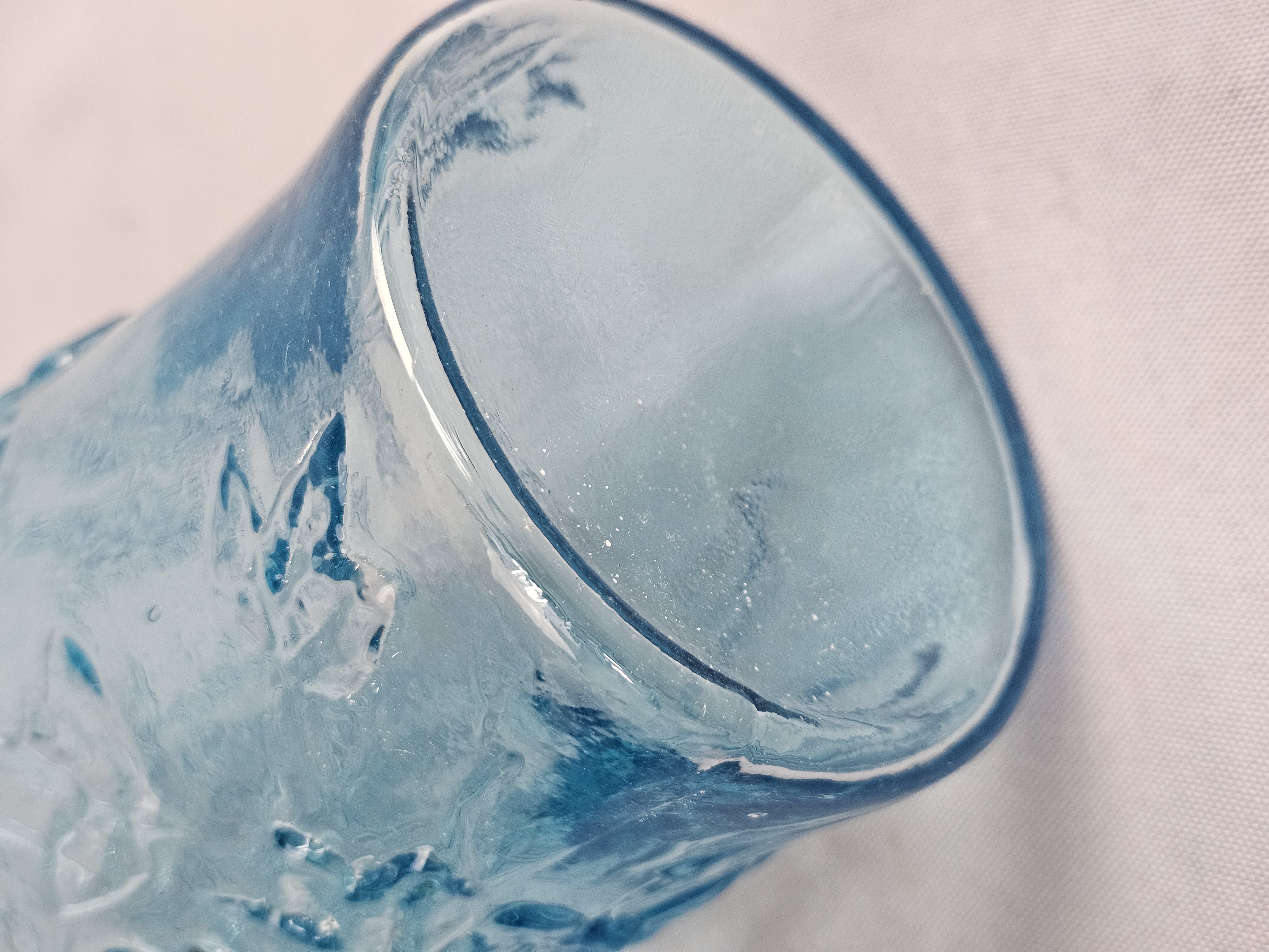 This lot comprises two decorative glass vases in varying shades of aqua blue. Vases measure 8 and 9 inches tall. Both vases are in good condition with no visible chips, cracks, or repairs. Minor shelf wear and light surface scratches are present on the bases, consistent with age and typical use.