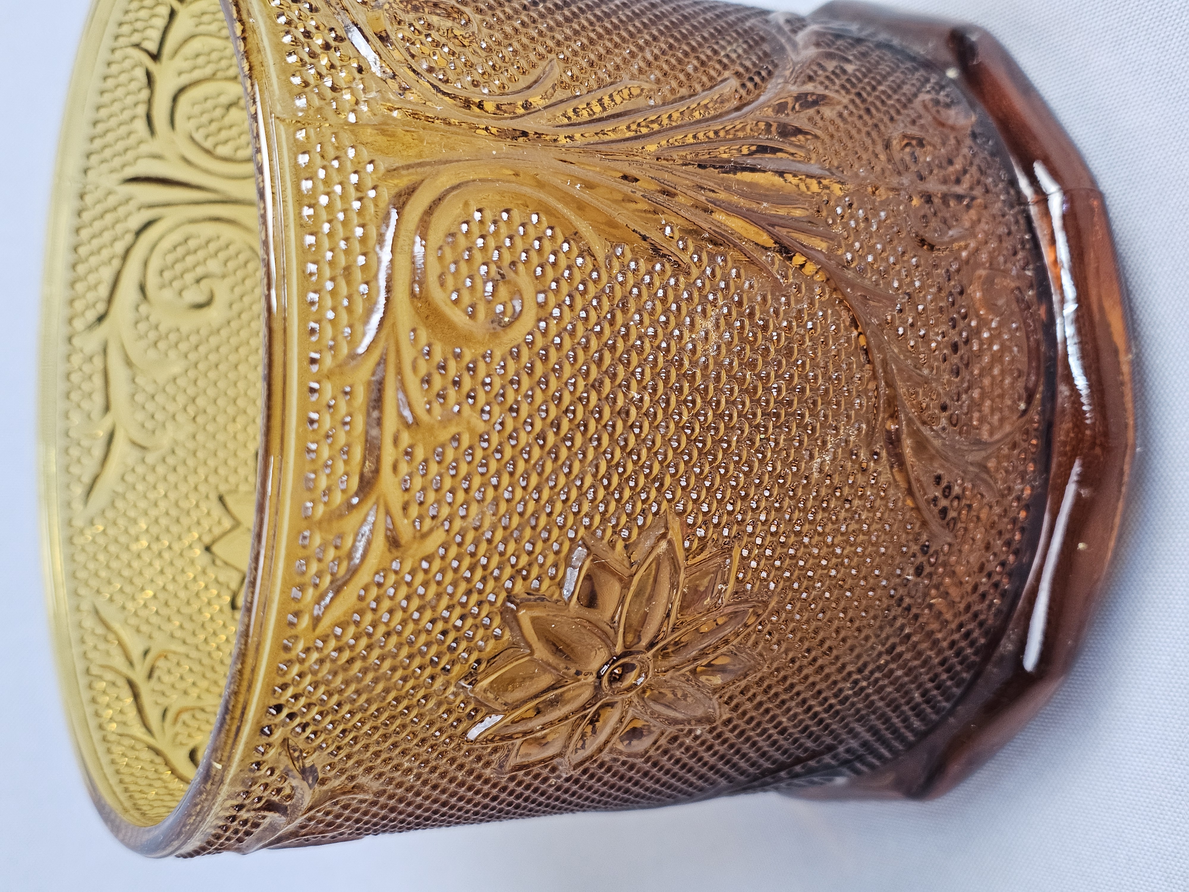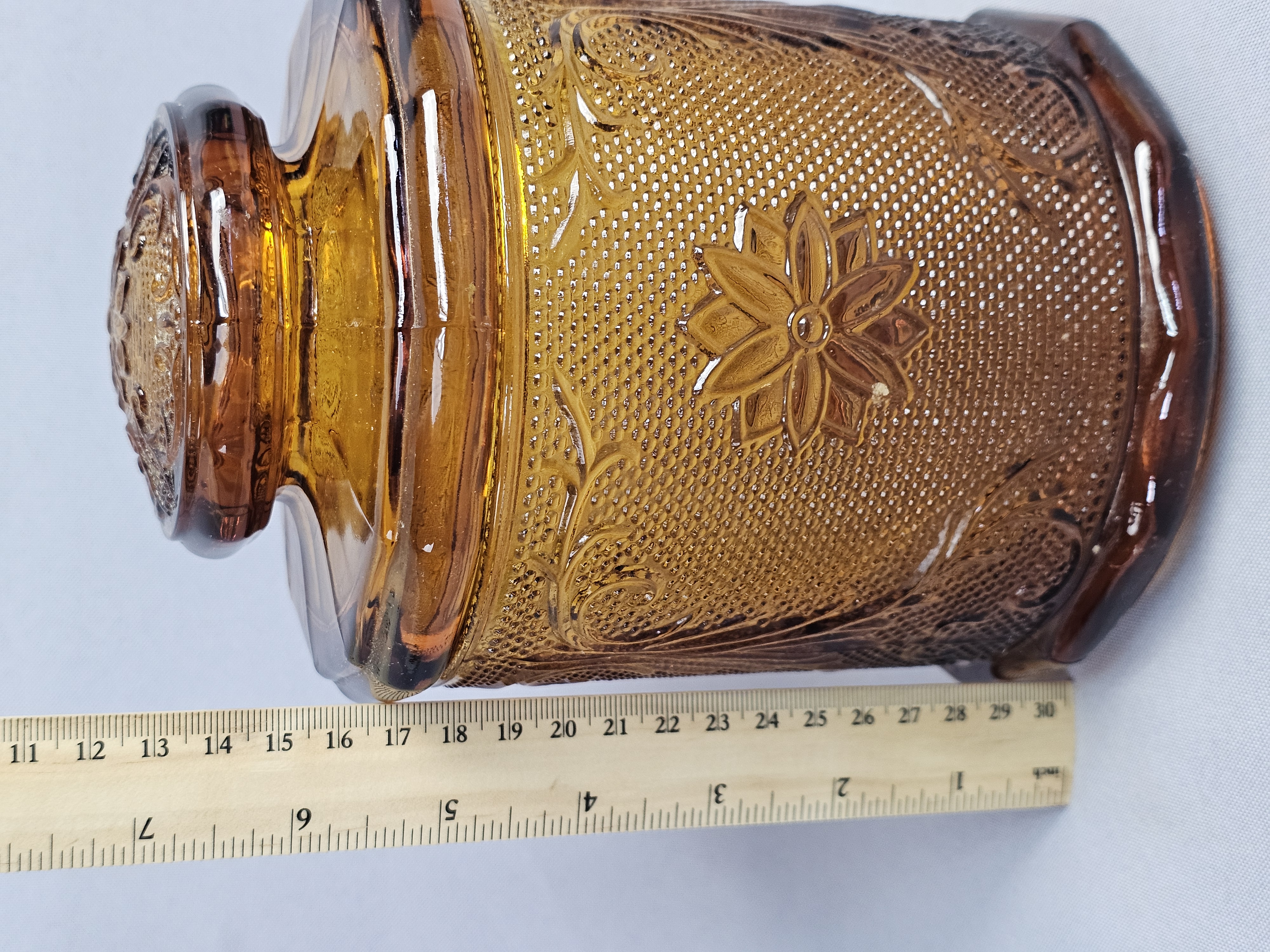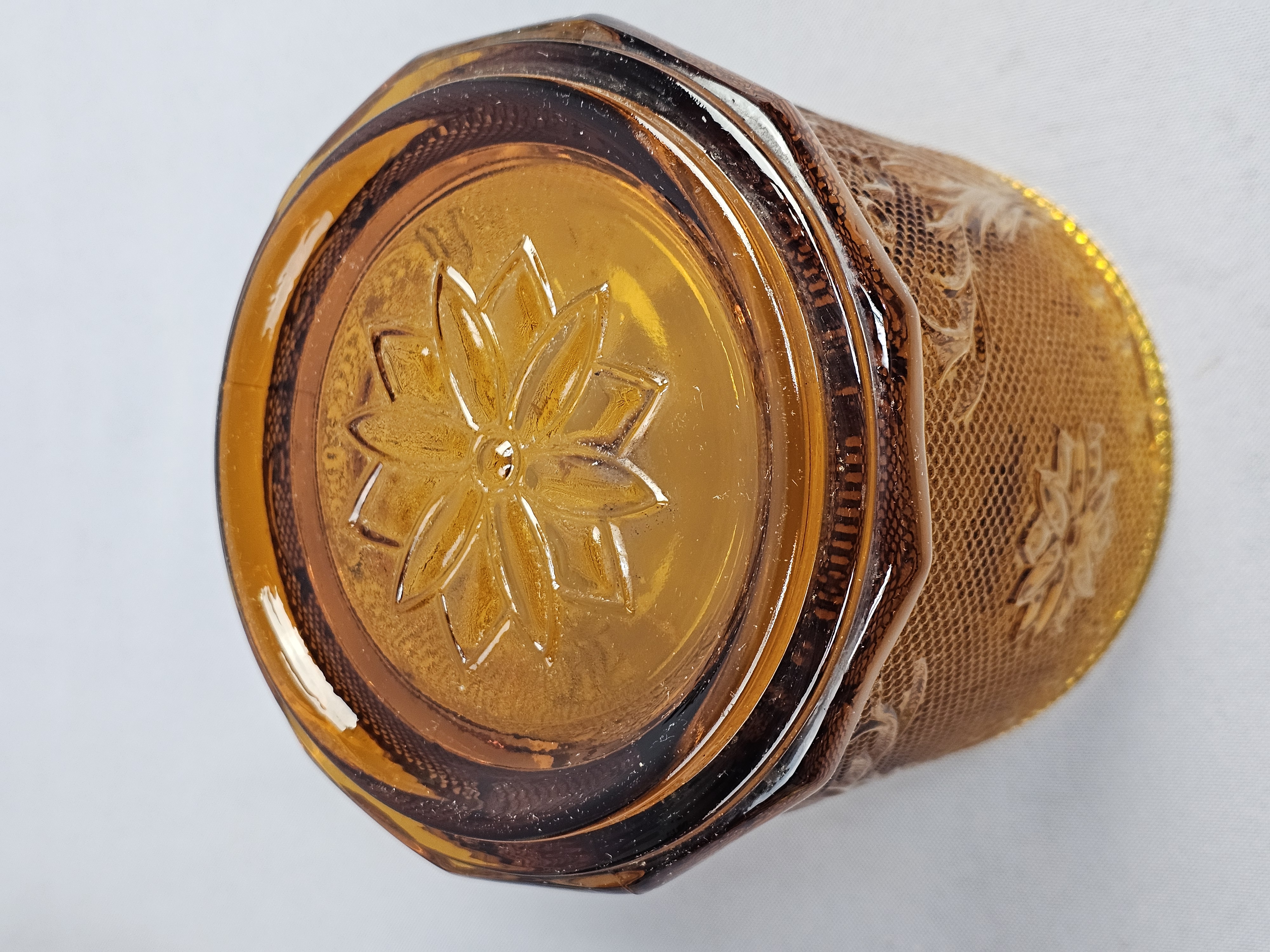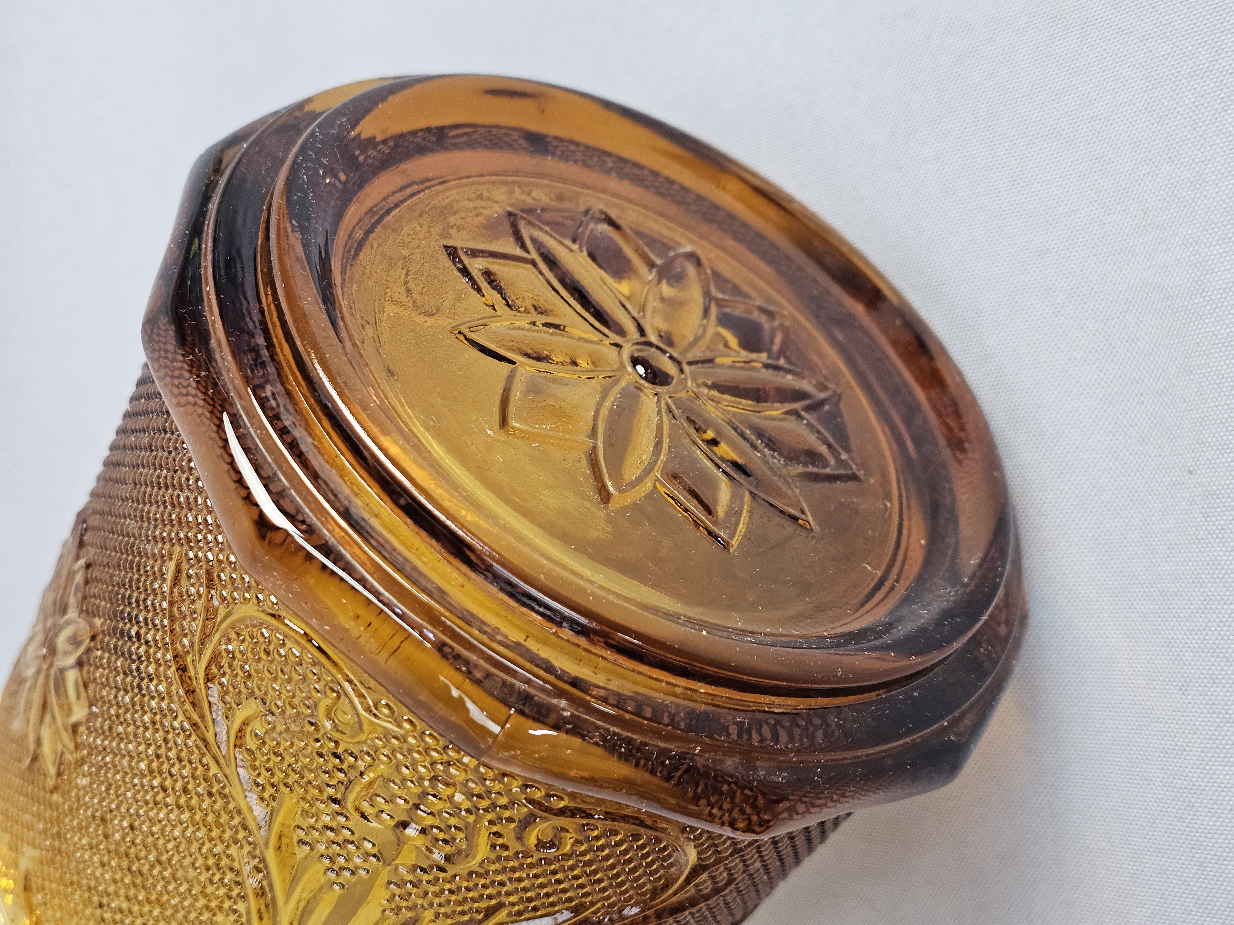 This is a vintage pressed glass covered canister in an amber color. The piece features the Sandwich pattern, characterized by embossed floral starbursts and scrolling vine motifs set against a stippled, textured ground. Height: 7 inches The item is in very good vintage condition. No chips, cracks, or significant abrasions are visible on the body, rim, or lid. The glass retains uniform color and clarity.