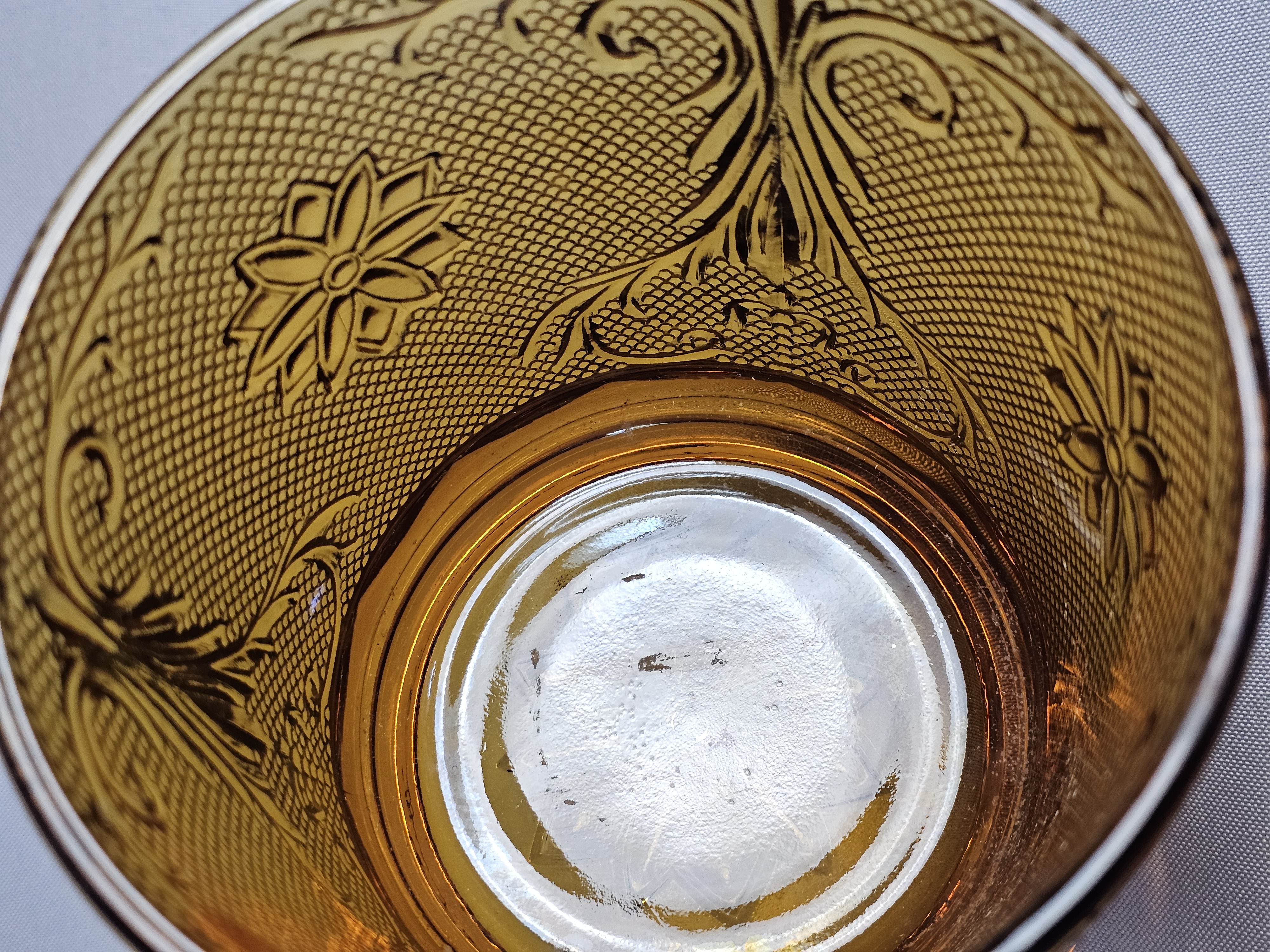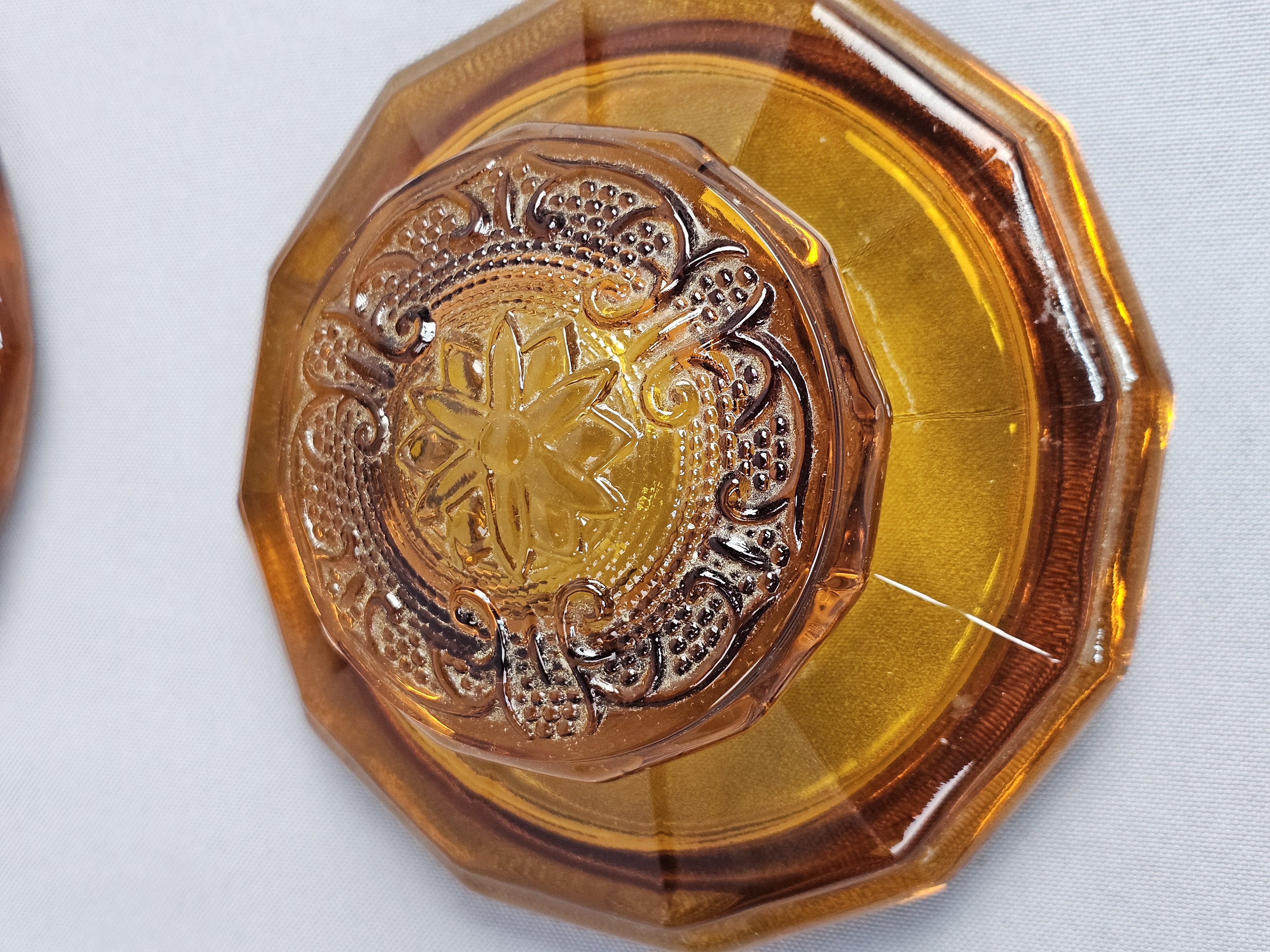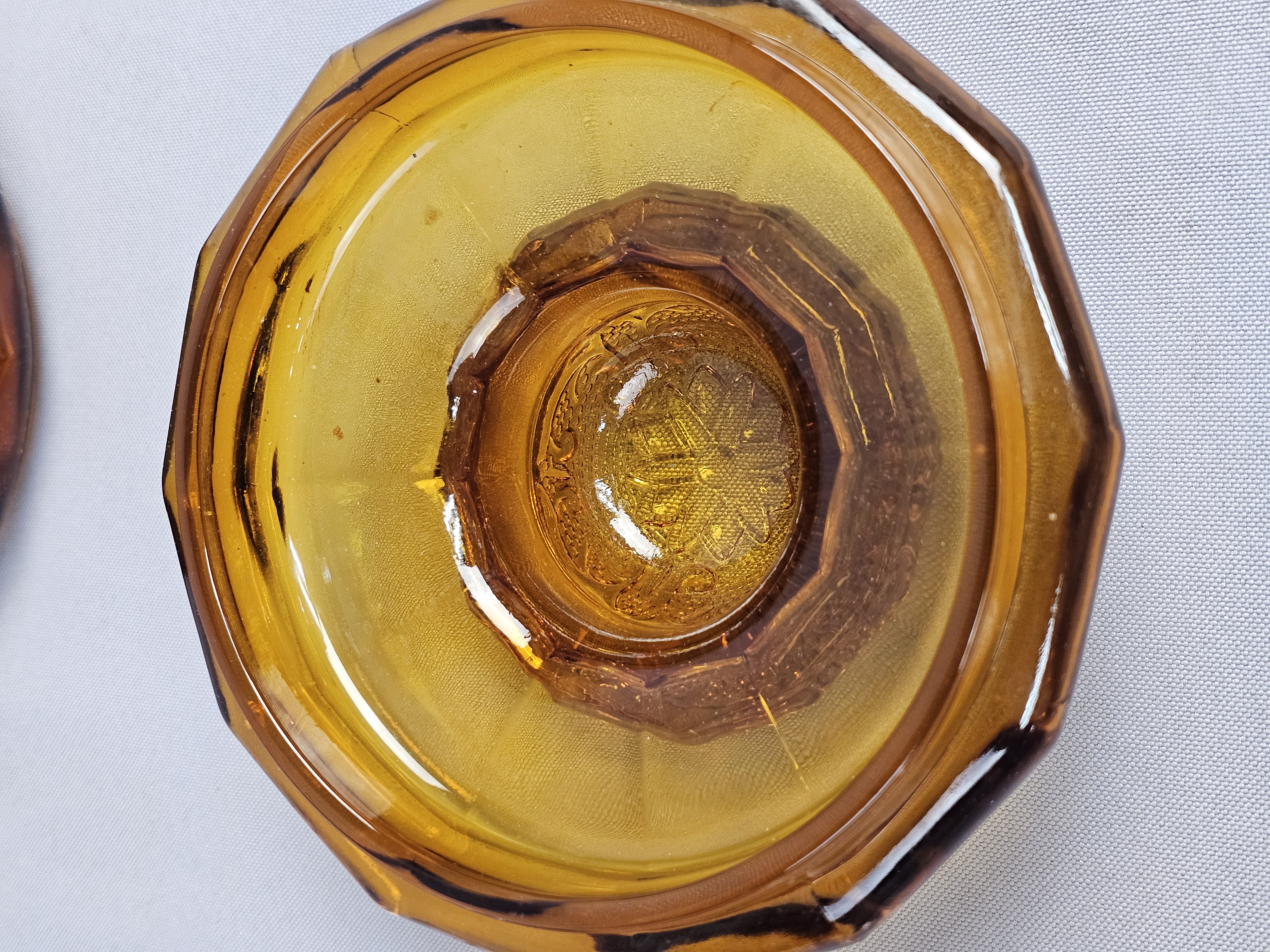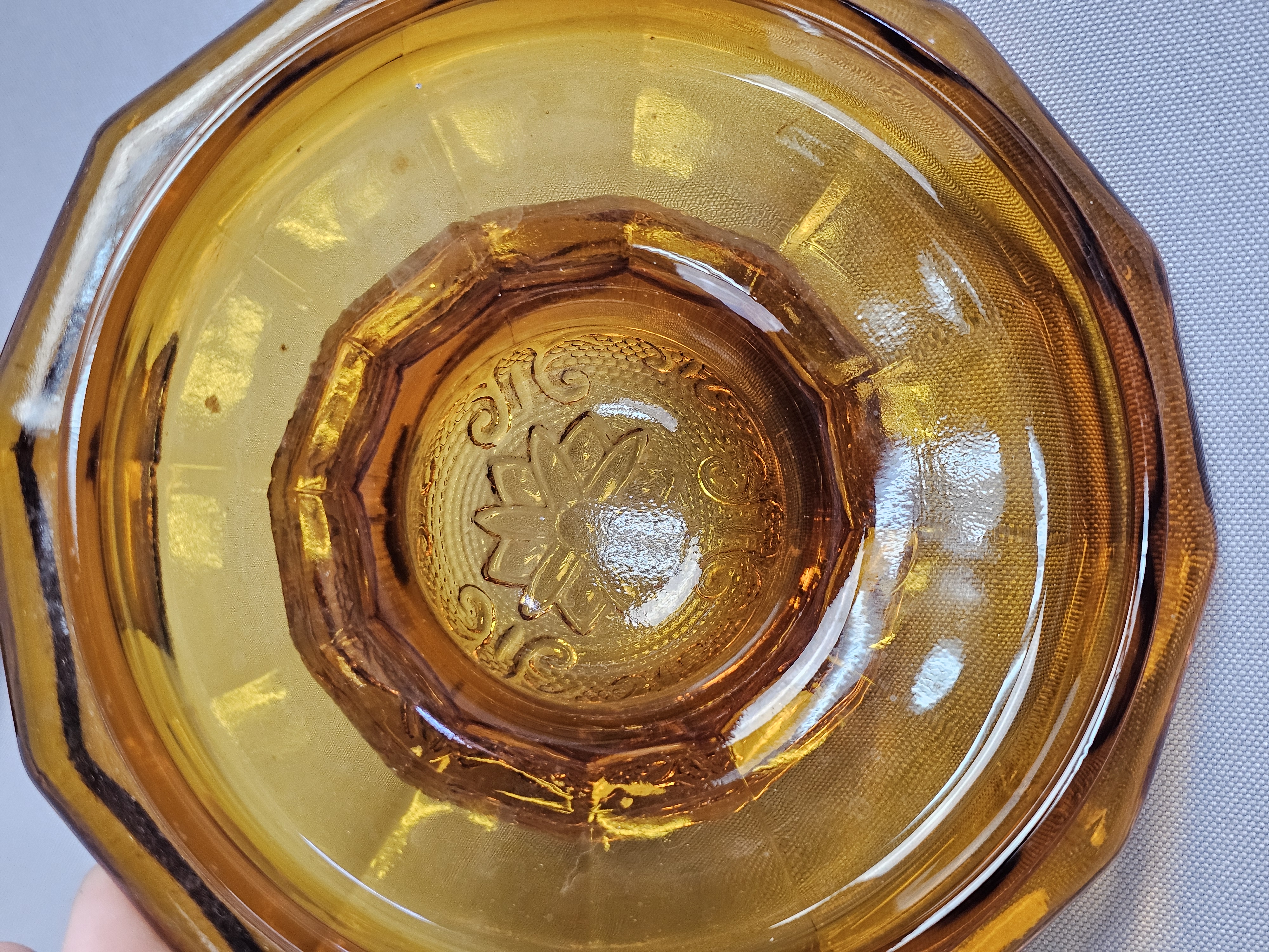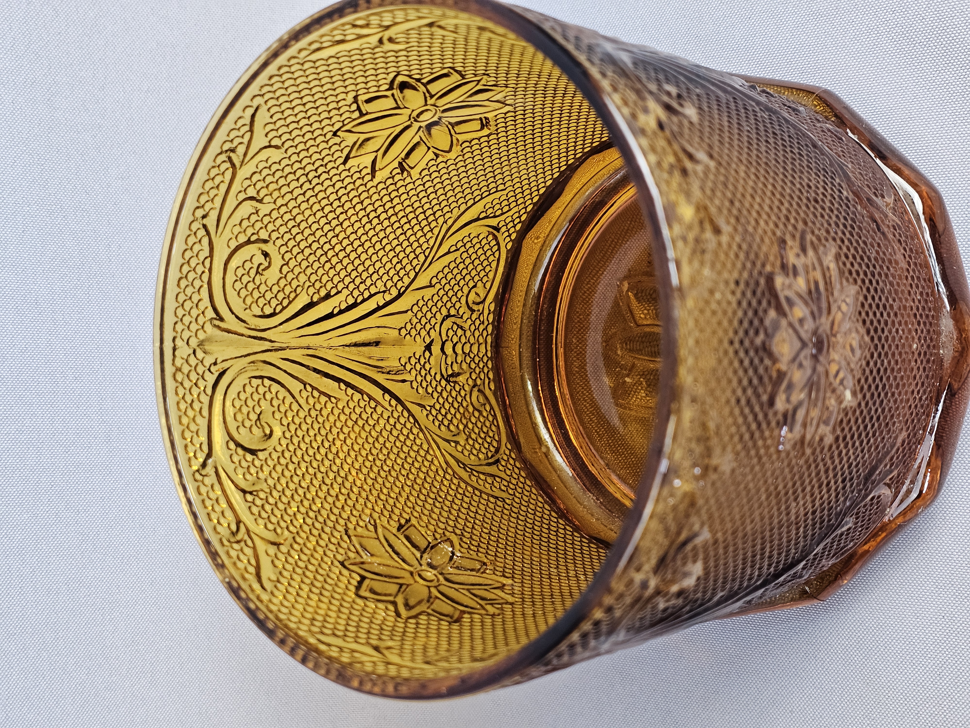 This is a vintage pressed glass covered canister in an amber color. The piece features the Sandwich pattern, characterized by embossed floral starbursts and scrolling vine motifs set against a stippled, textured ground. Height: 7 inches The item is in very good vintage condition. No chips, cracks, or significant abrasions are visible on the body, rim, or lid. The glass retains uniform color and clarity.